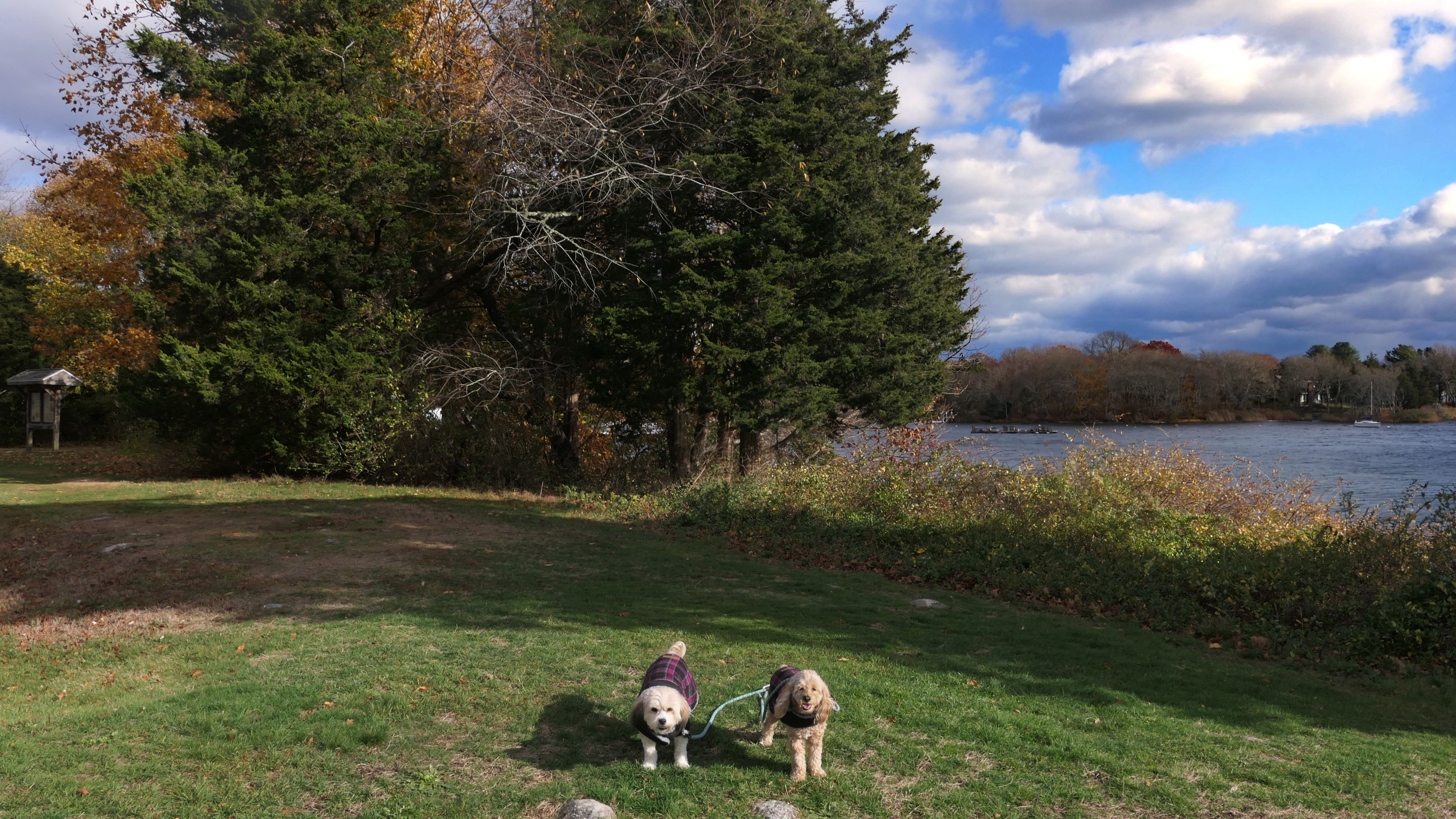 Initially, the GPS took me to the campground, and I don't think I can just park there, so I re-routed to the "picnic area". It's a nice spot, right on Watchaug Pond. (We visited the other side of the pond a couple of years ago). I didn't see any trails or anything at the picnic area, and dogs are not allowed in the "beach" area, so we headed down the dirt road near the parking area where we came across a trail that led to the pond west of the main beach. There's a vary narrow strip of beach between the heavy woods and the pond here, but we couldn't really walk any of it, because a family was all setup there and it was too difficult to get by. There must be a better section of the park to visit, but instead of looking for it while we were losing daylight, since it was a gorgeous evening I decided to just take the dogs to a real beach instead.