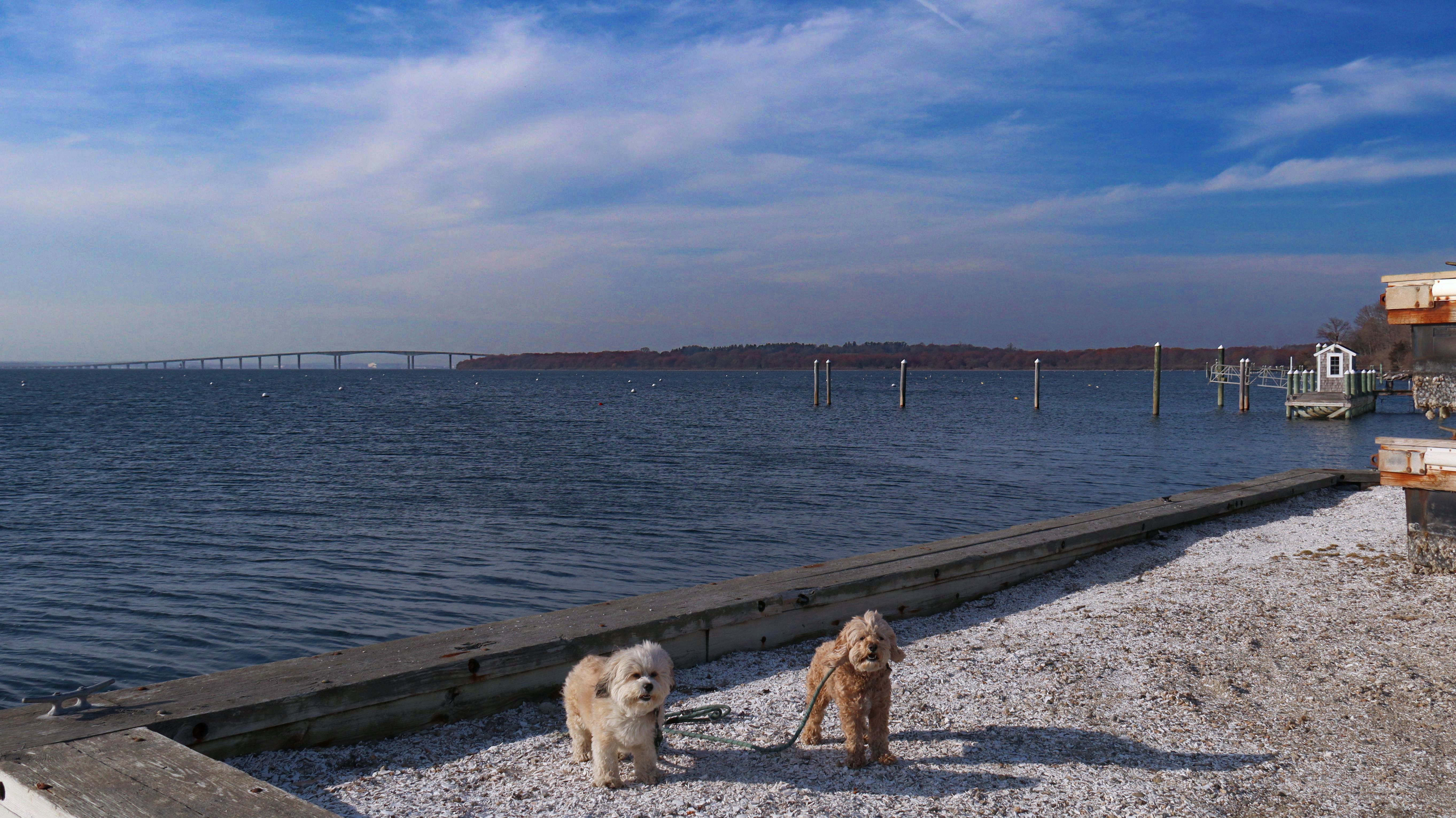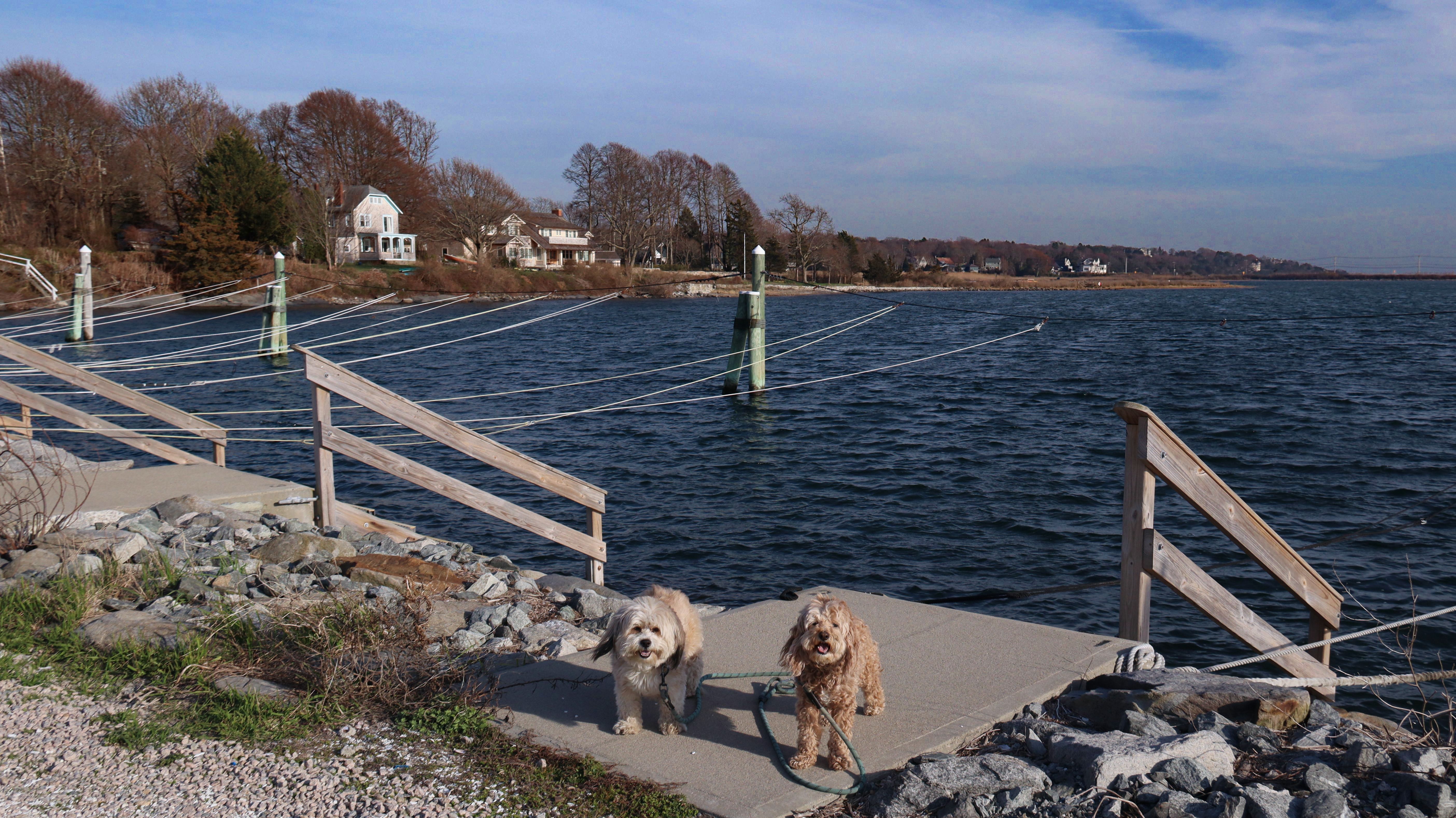 This is a small beach area near the Newport bridge toll plaza. There's a small lot off Freebody Drive with a stair case that leads down to the beach. Jamestown has complicated rules for when dogs are allowed at town parks and beaches. They are allowed here off-leash from October 1st thru May 15th. They are also allowed to be off leash here from May 16th through September 30th, but only between the hours of 6am to 10am and 5:30pm to sunset. They are not allowed at all at other times (which I guess is 10:01am through 5:29pm during the summer months). It's not a great beach, but the dogs don't mind! Actually, despite the nice weather, there was only one other dog here arriving as we were leaving. The beach is small, it took only about 15 minutes to walk the entire length and back. The area connects with Taylor Point Lookout, a place we had visited previously.