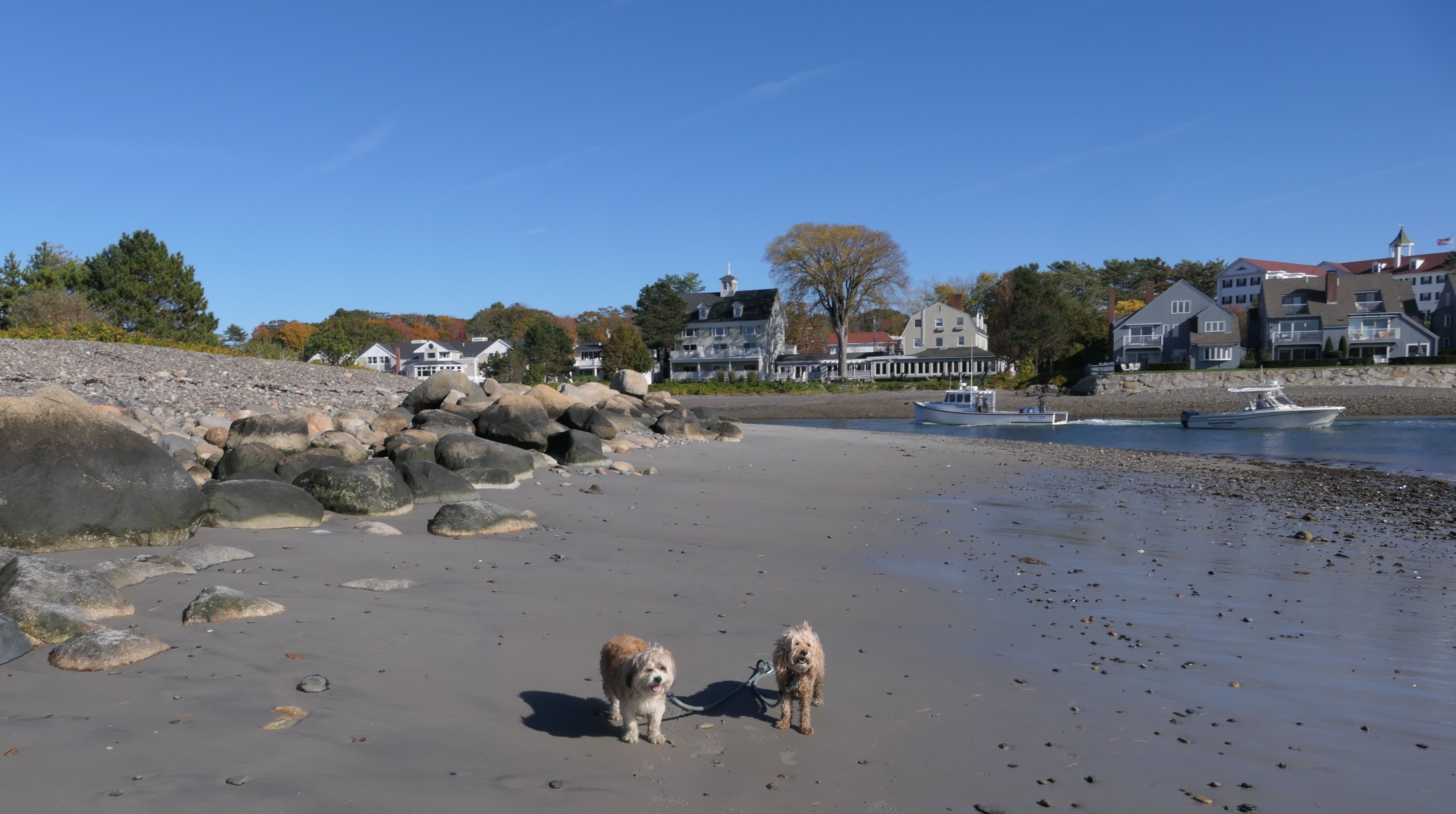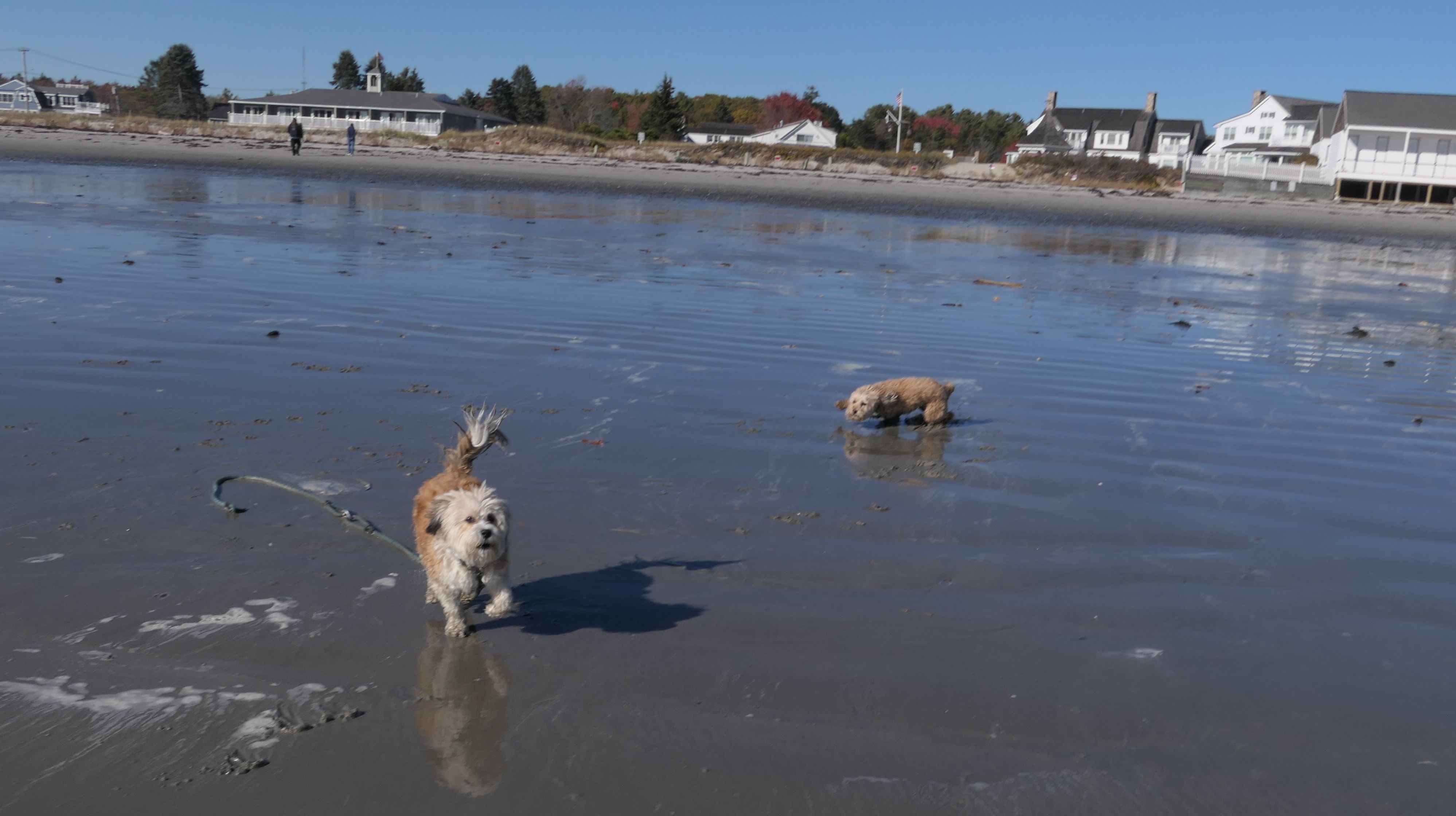 This is a pretty decent beach, located in Kennebunk Maine. Dogs are allowed before 9AM and after 5PM from June 15th to Labor Day, and allowed any time outside of those dates. They also only need to be under voice control, and don't need to be on a leash. We started by the rocky area on the west end of the beach, and made our way to the Kennebunk River breachway on the east end. The whole thing is about a mile long. On our way back, the dogs played a bit off-leash. Lexi always loves running on the beach! It was low tide, but there were still some pretty nice waves. There was a number of surfers taking advantage of them. This beach kind of reminds me of Easton's Beach in Newport. It's sort of the same shape, tucked in a cove but with nice waves. This was a pleasant beach walk on a sunny autumn afternoon.