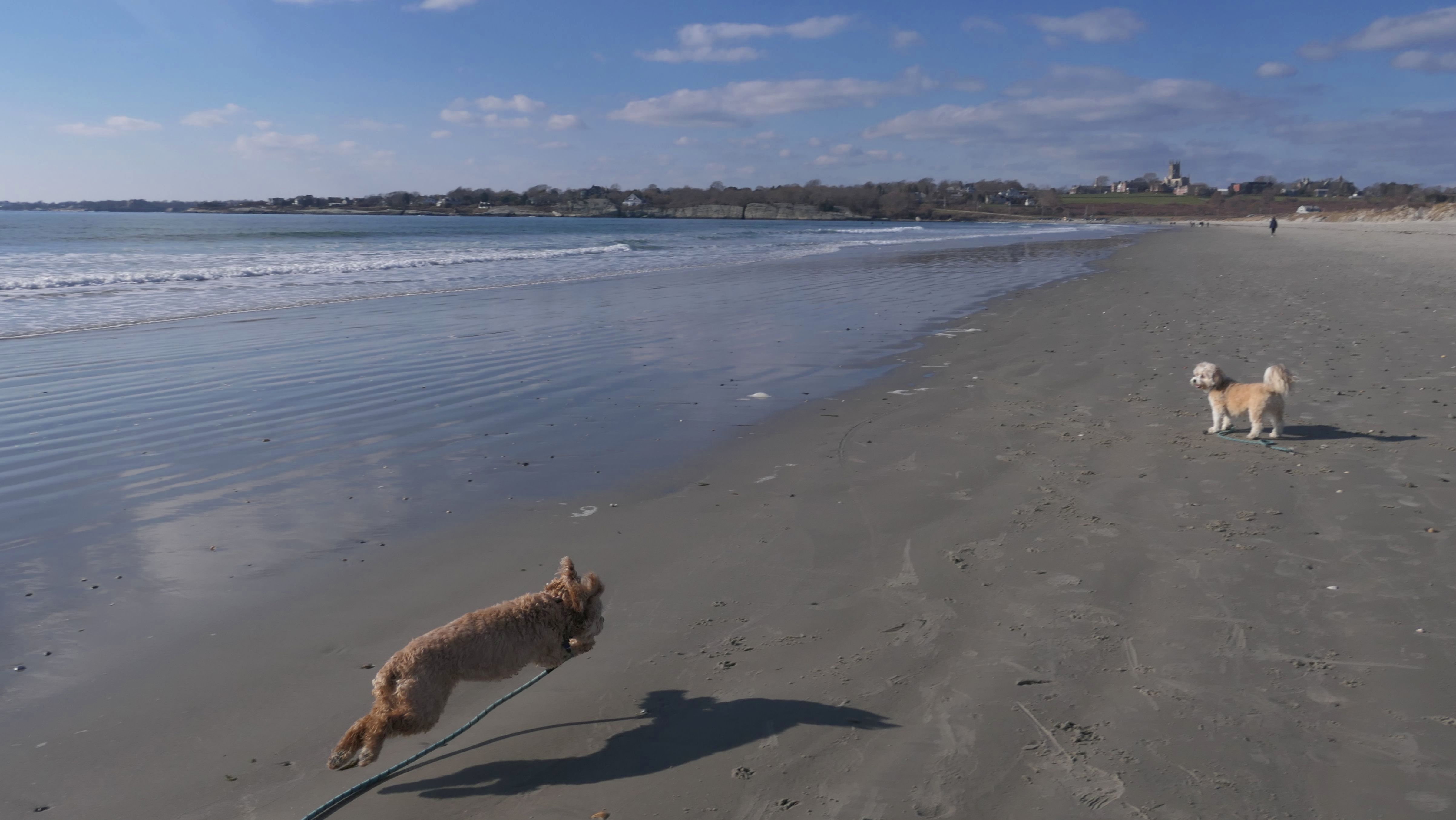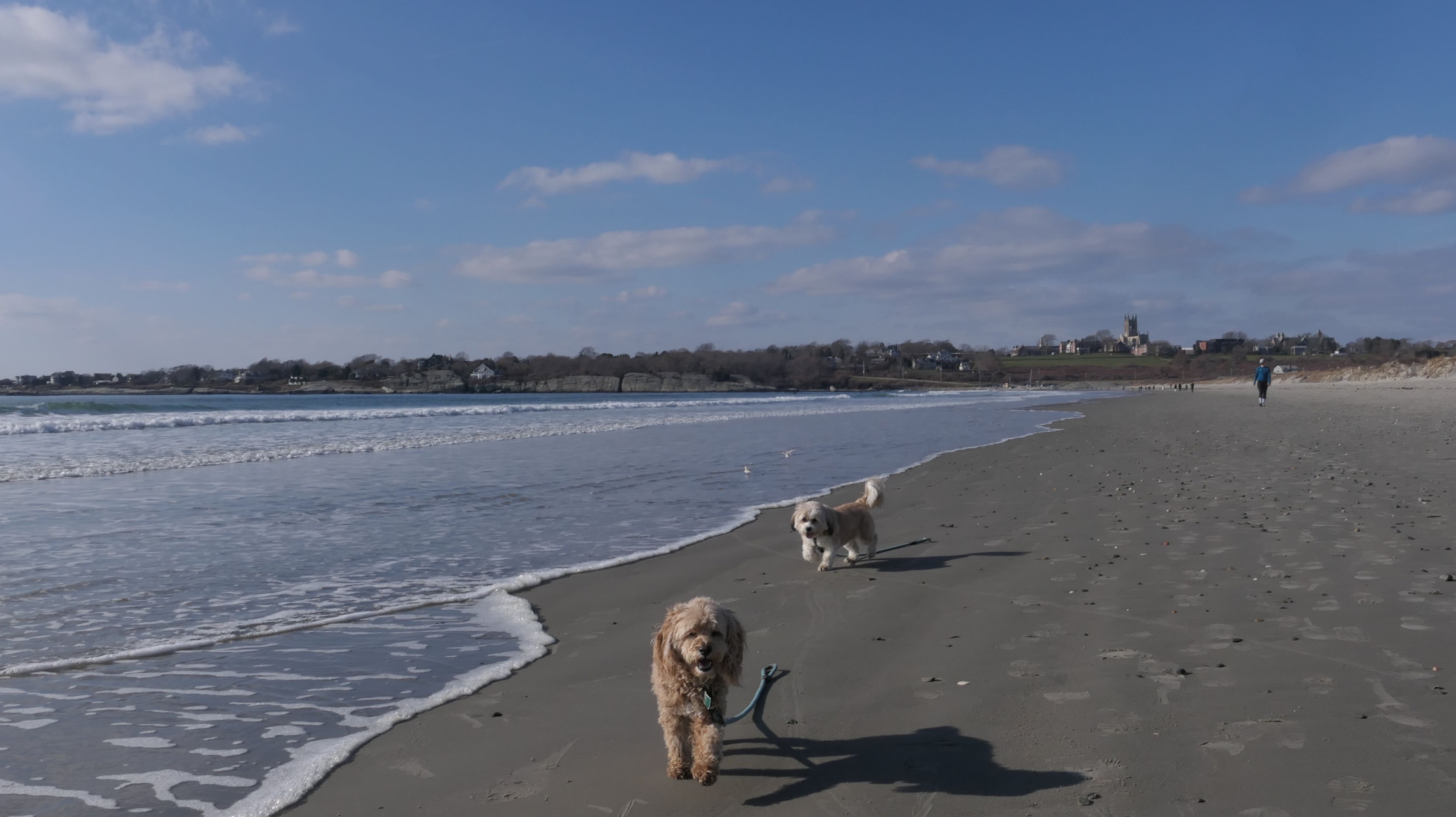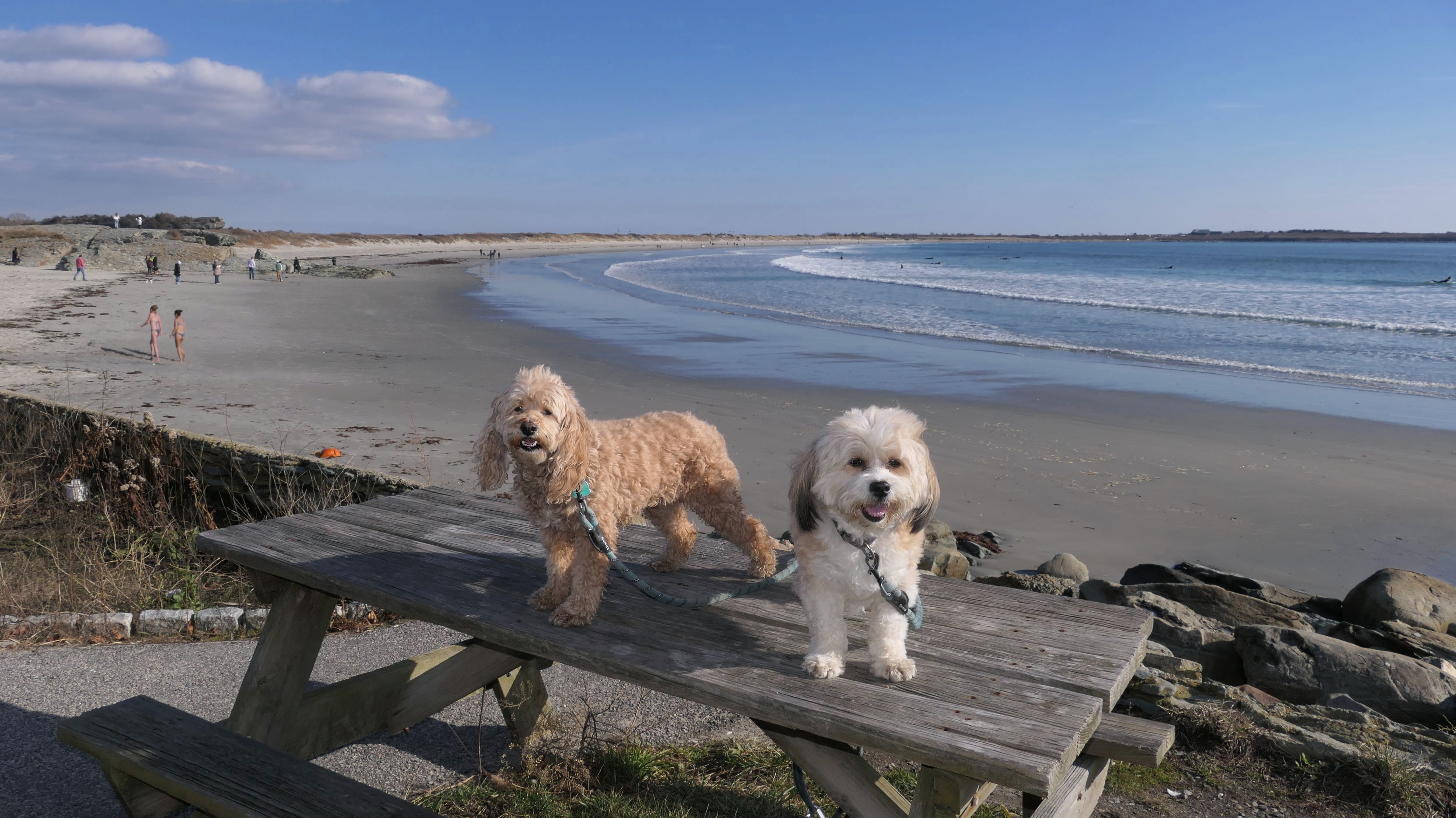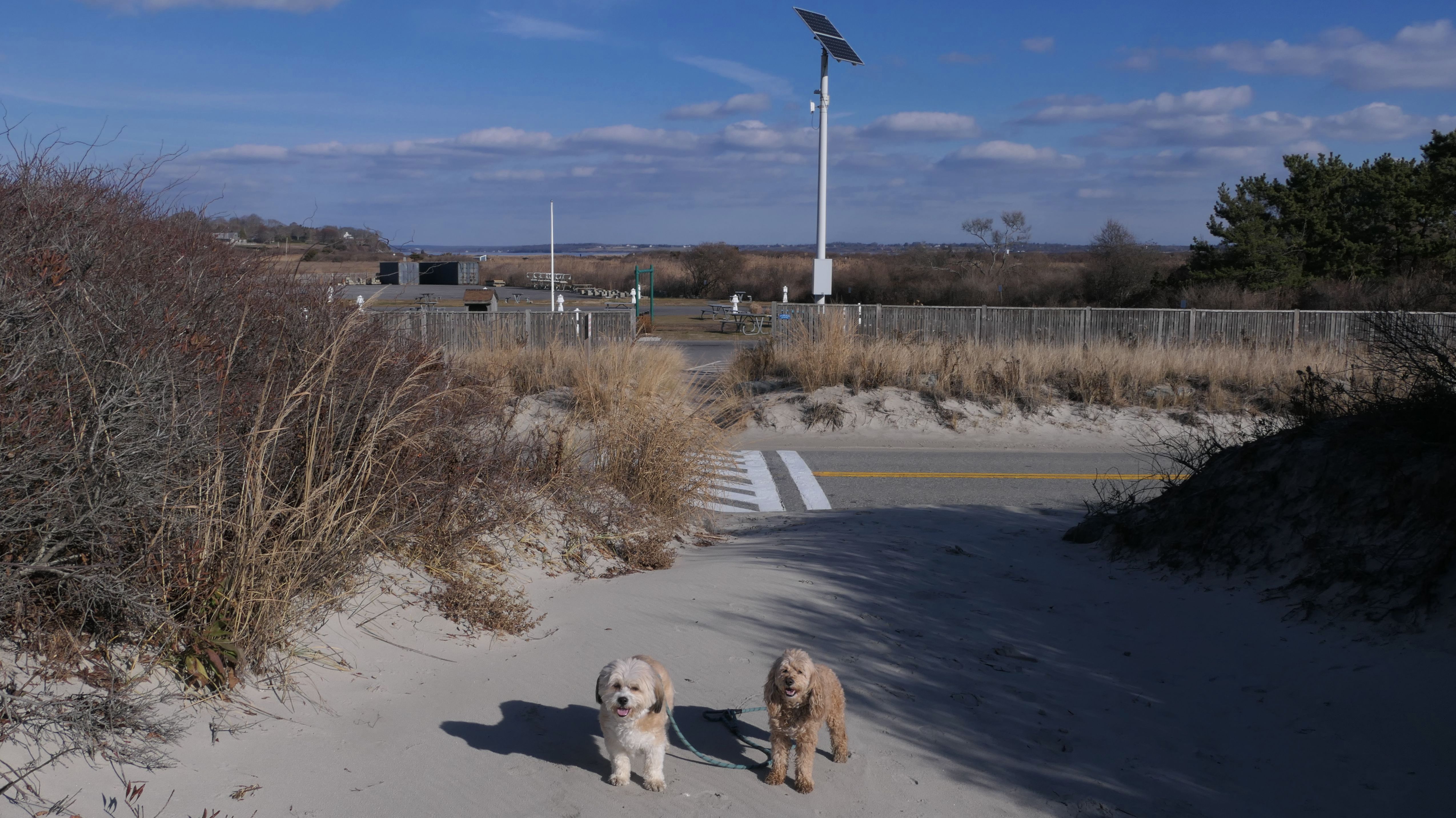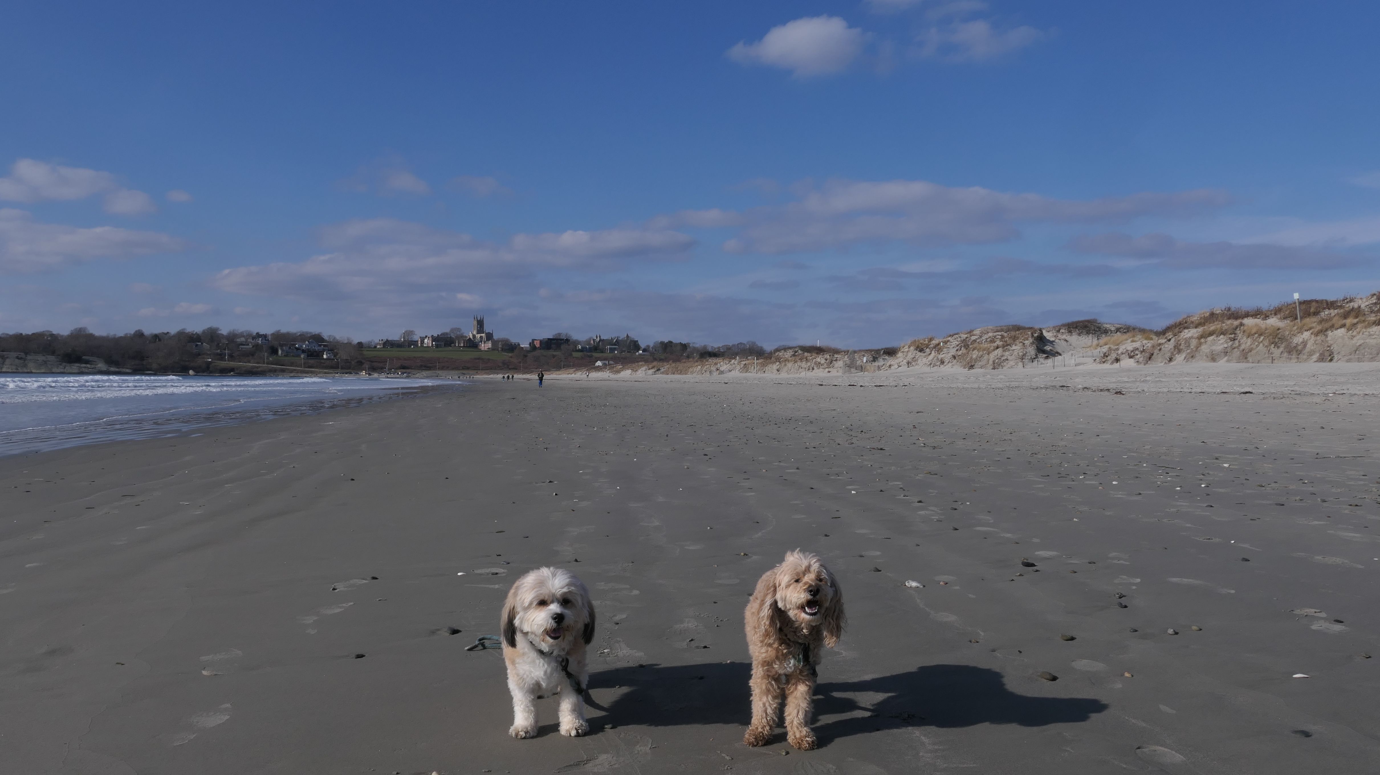 We seem to find ourselves at this beach every fall. Technically, it was still fall for this visit, but lately it has felt much more like winter. Every year they put up a decorated Christmas tree on the sand, and this time we came prepared with our Santa hats. Nothing says “Christmas in Rhode Island” quite like a tree on the beach with surfers in the background. Despite the season, it was a pleasant morning, with temperatures in the mid-40s. The bright sun and lack of wind made it feel warmer than it was. Apparently warm enough for some people to be in bathing suits—thanks to the “Small Wave Sauna” set up on the beach. A group of what looked like college-age kids rotated between the sauna and quick plunges in the ocean. We walked the length of the beach and back, and even though there were plenty of other dog walkers around, we were able to find a vacant spot on the beach where Mandy and Lexi even got a few minutes off-leash to run and play. We followed the path over to the Second Beach Campground and also walked up the road toward St. George's School. All in all, it turned out to be a really nice December adventure.