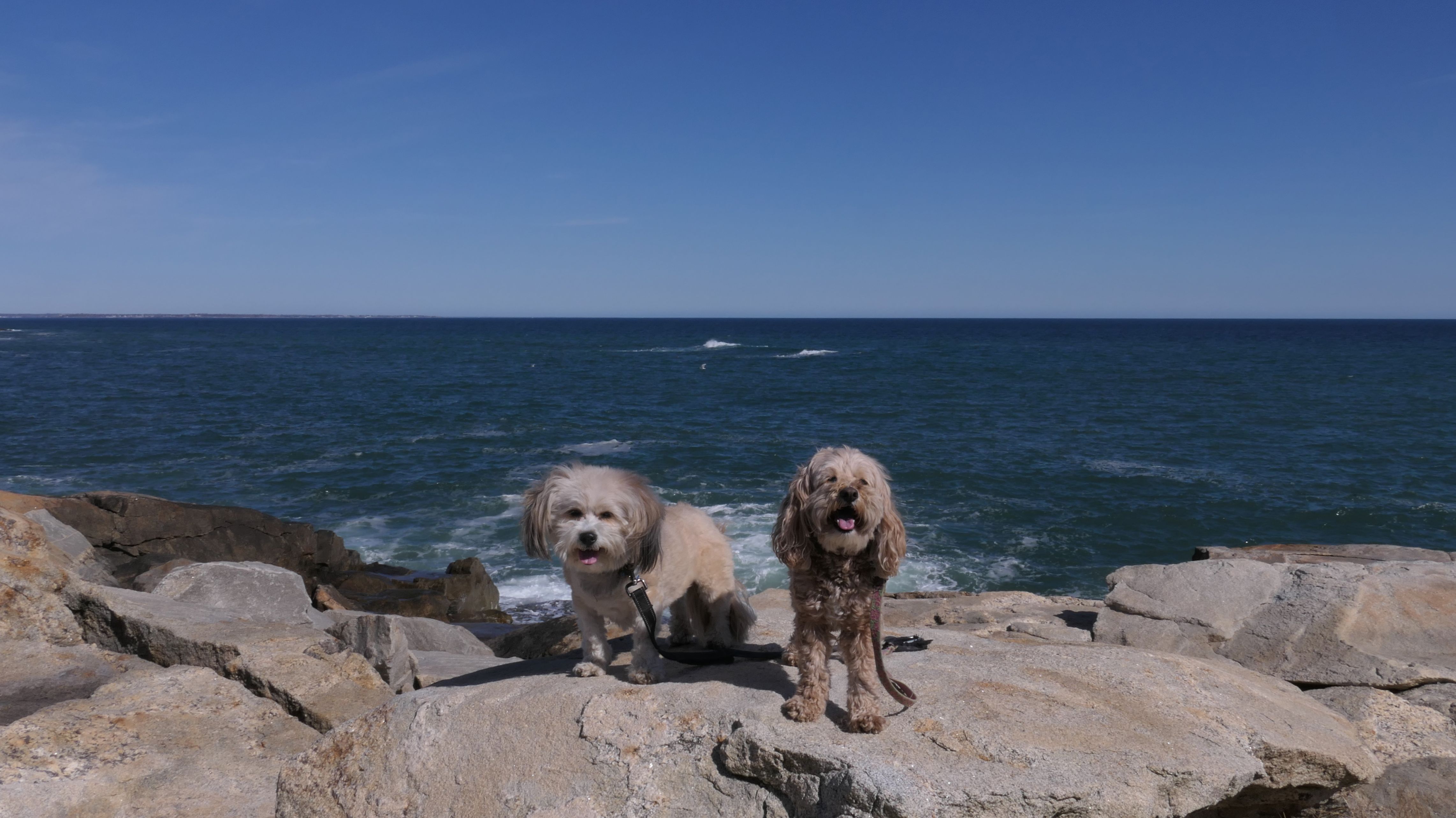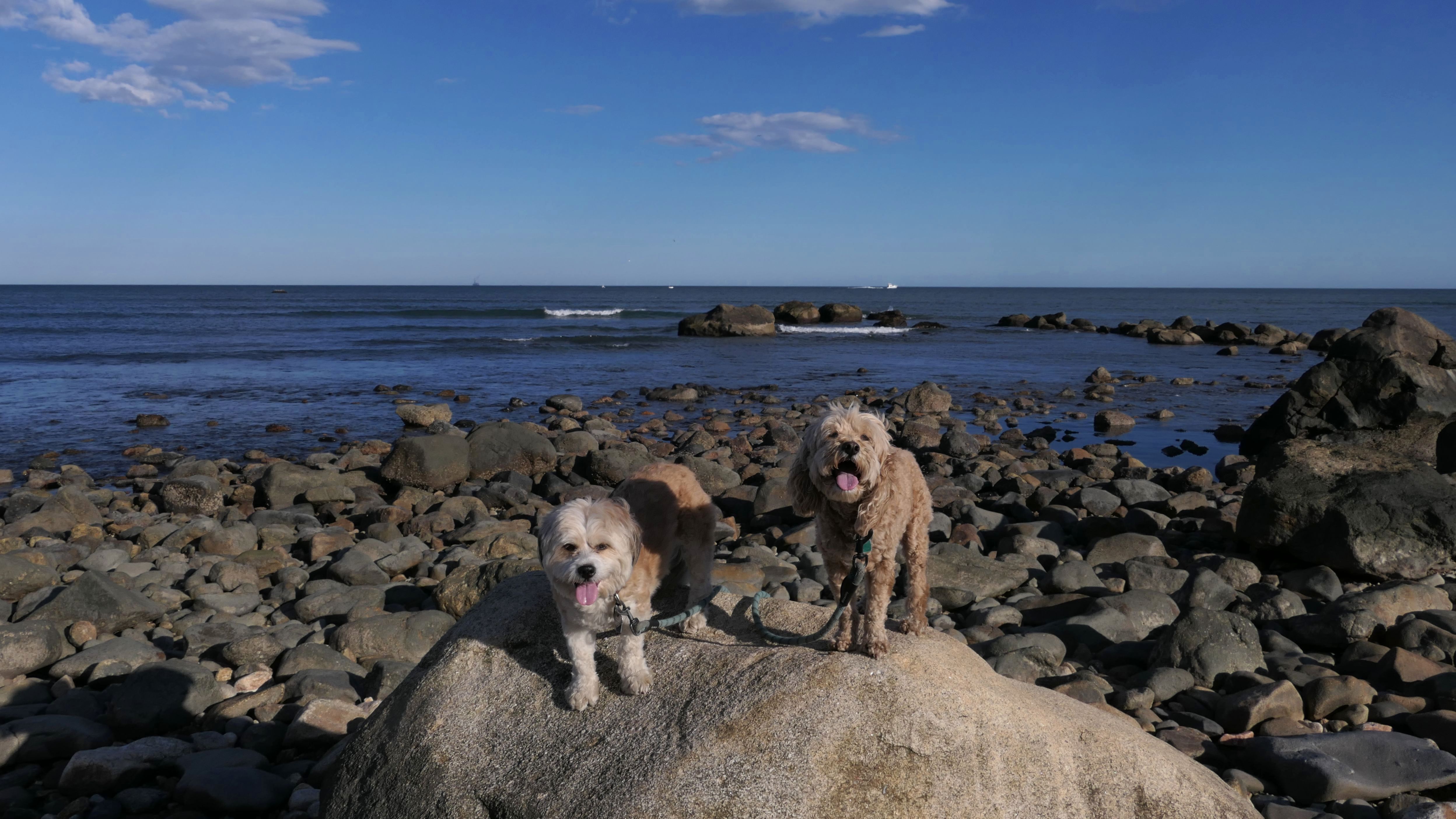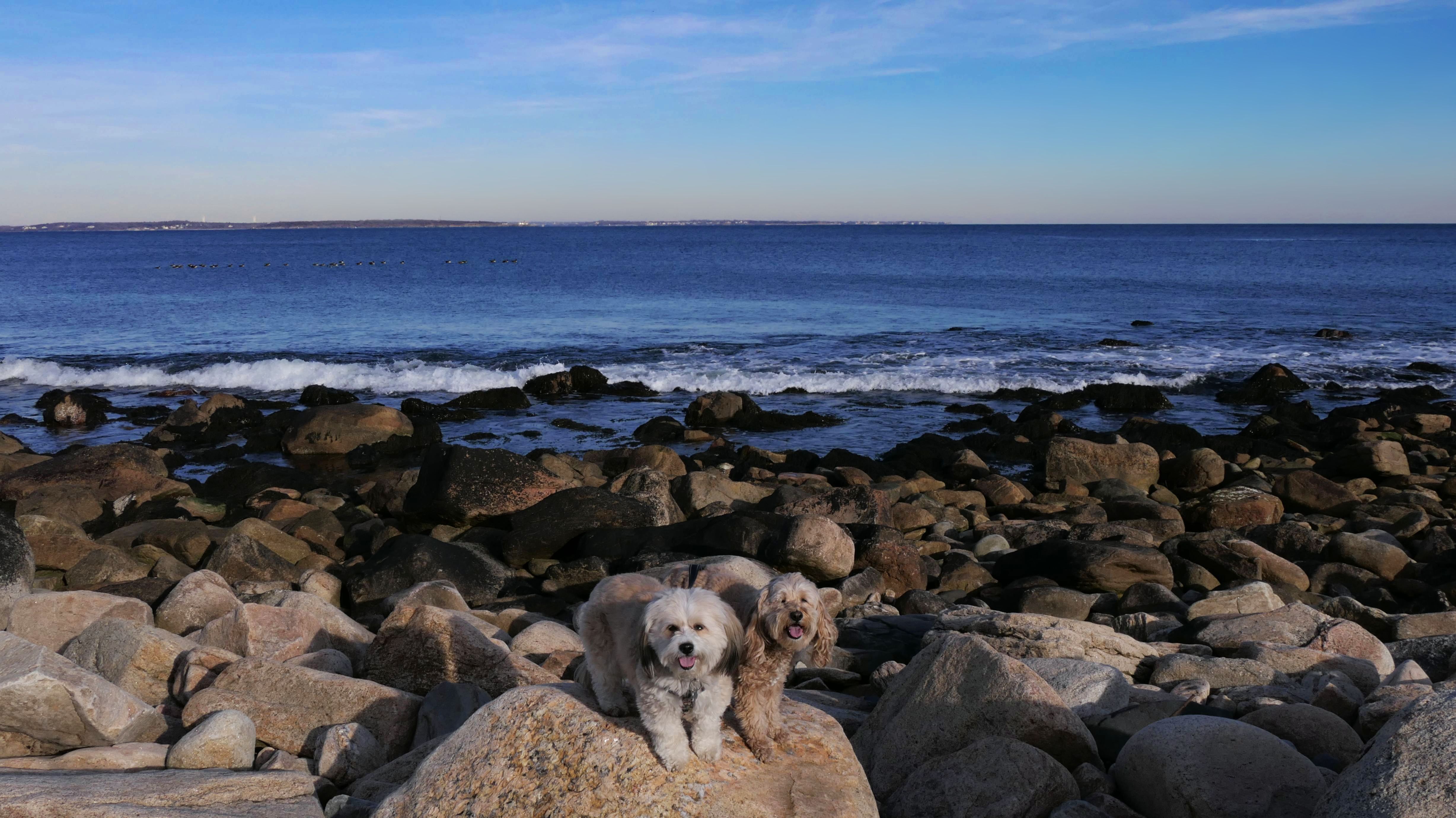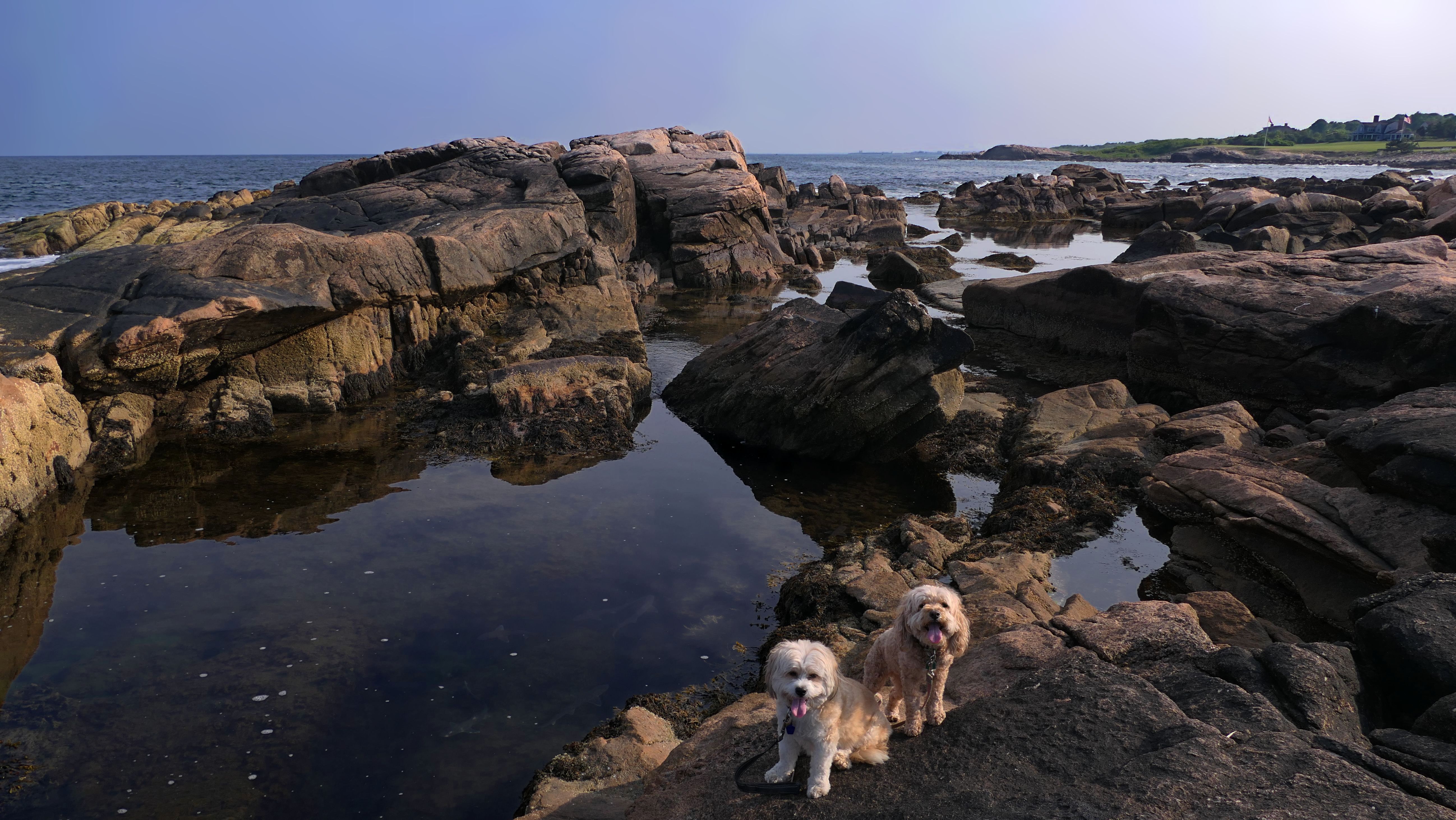 This is one of three rocky shoreline access points at the end of side streets off Ocean Road. We visited all three on the same day in 2023. We revisited the other two earlier this year, and finally revisited this one as well. We were able to explore a bit more than last time. The rocks here can be tricky to navigate. Heading north along the rocks, we turned around at the chasm separating this place from the Ocean Road Access Point we visited last December. Heading south along the rocks, we didn't make it much further than last time. The terrain is too tricky to make it all the way to the Newton Avenue Access Point. We actually covered about 1.3 miles here total, almost all of it climbing on rocks. Mandy and Lexi look pretty messy in some of the photos. They actually went into a mucky lake at our previous stop. We found a tidal pool here where they were able to clean off and cool off. This is a fun place to explore if you're up for climbing over rocks!