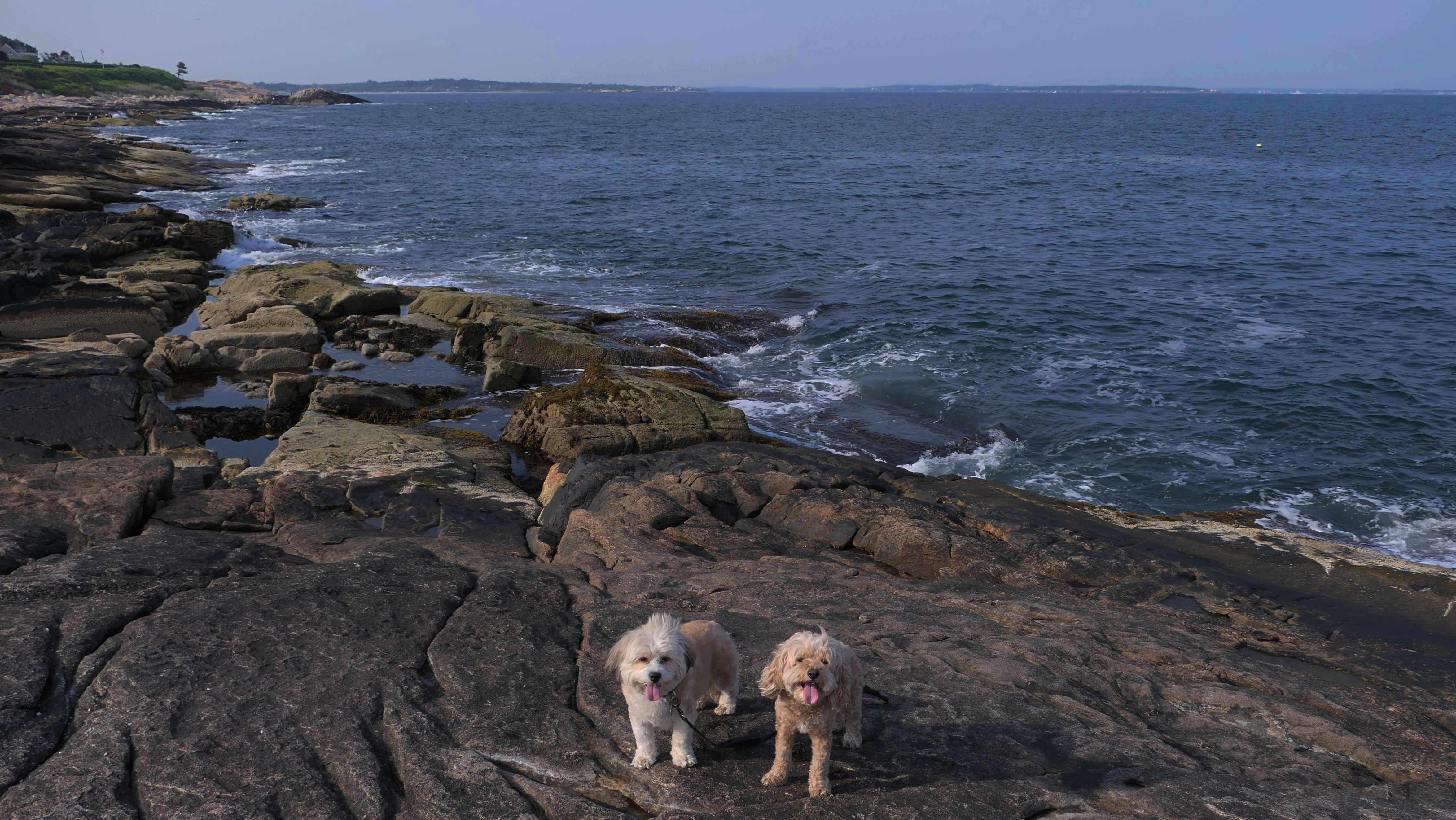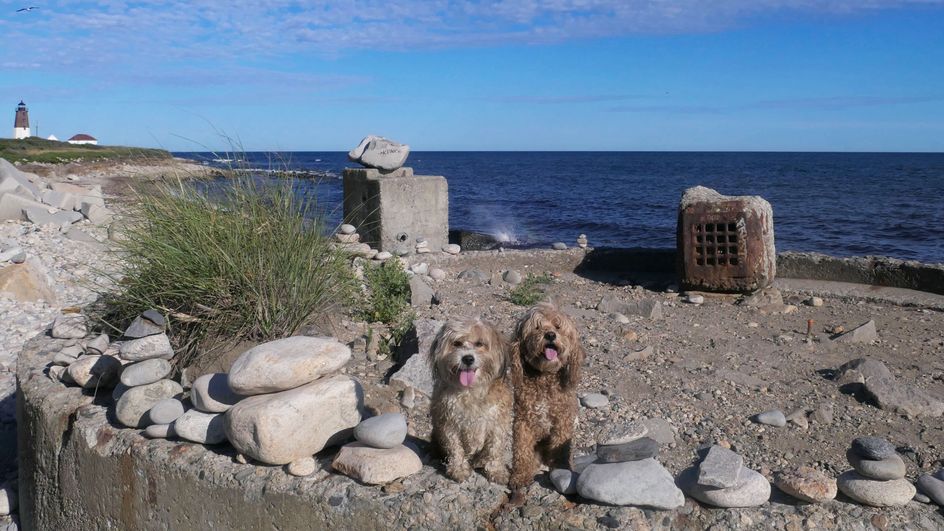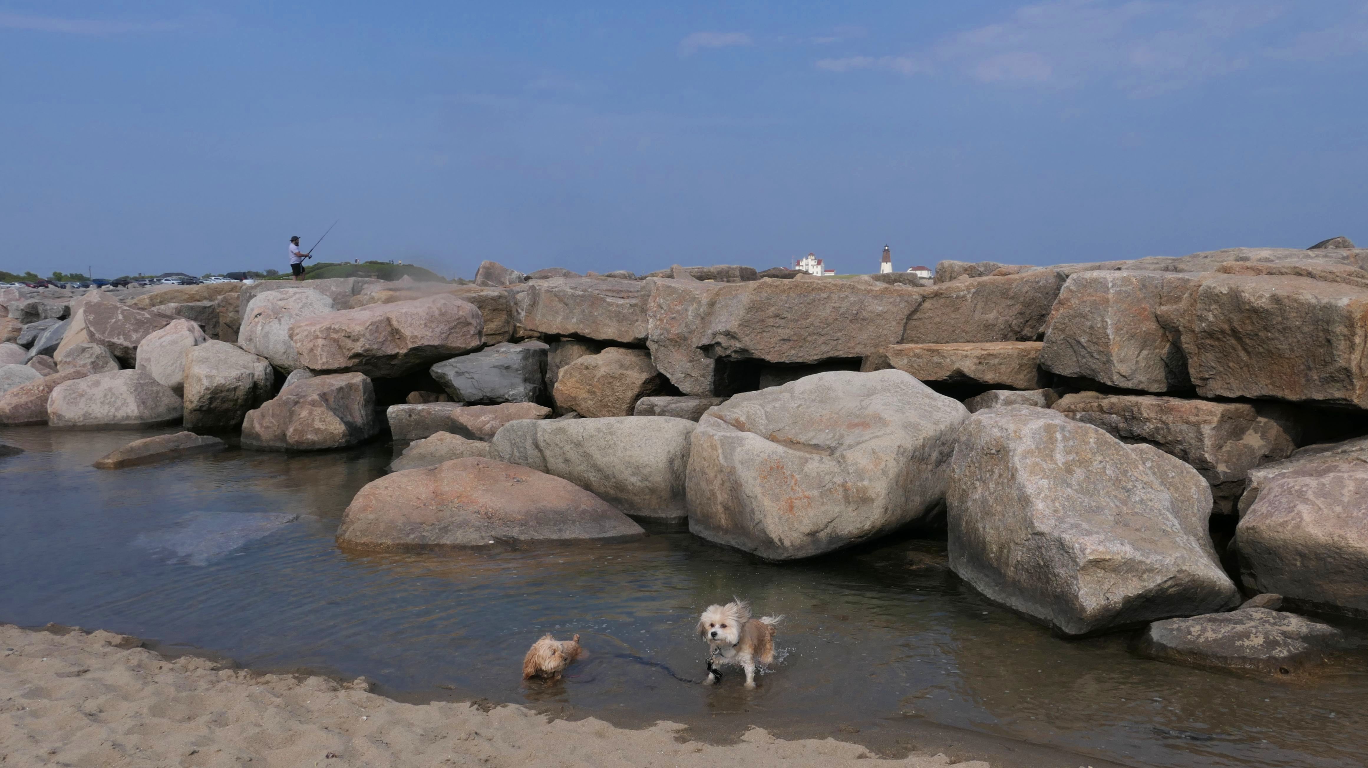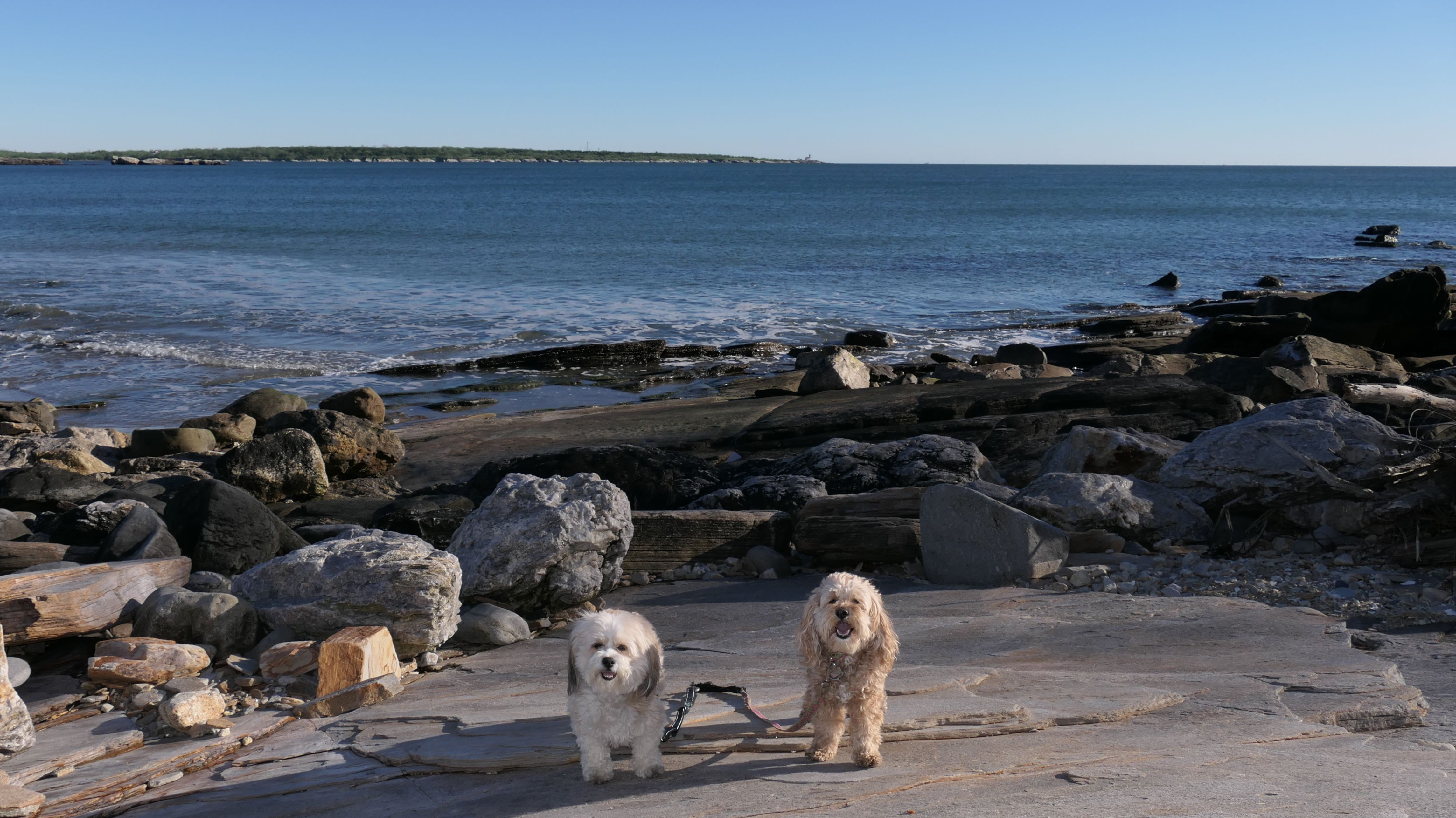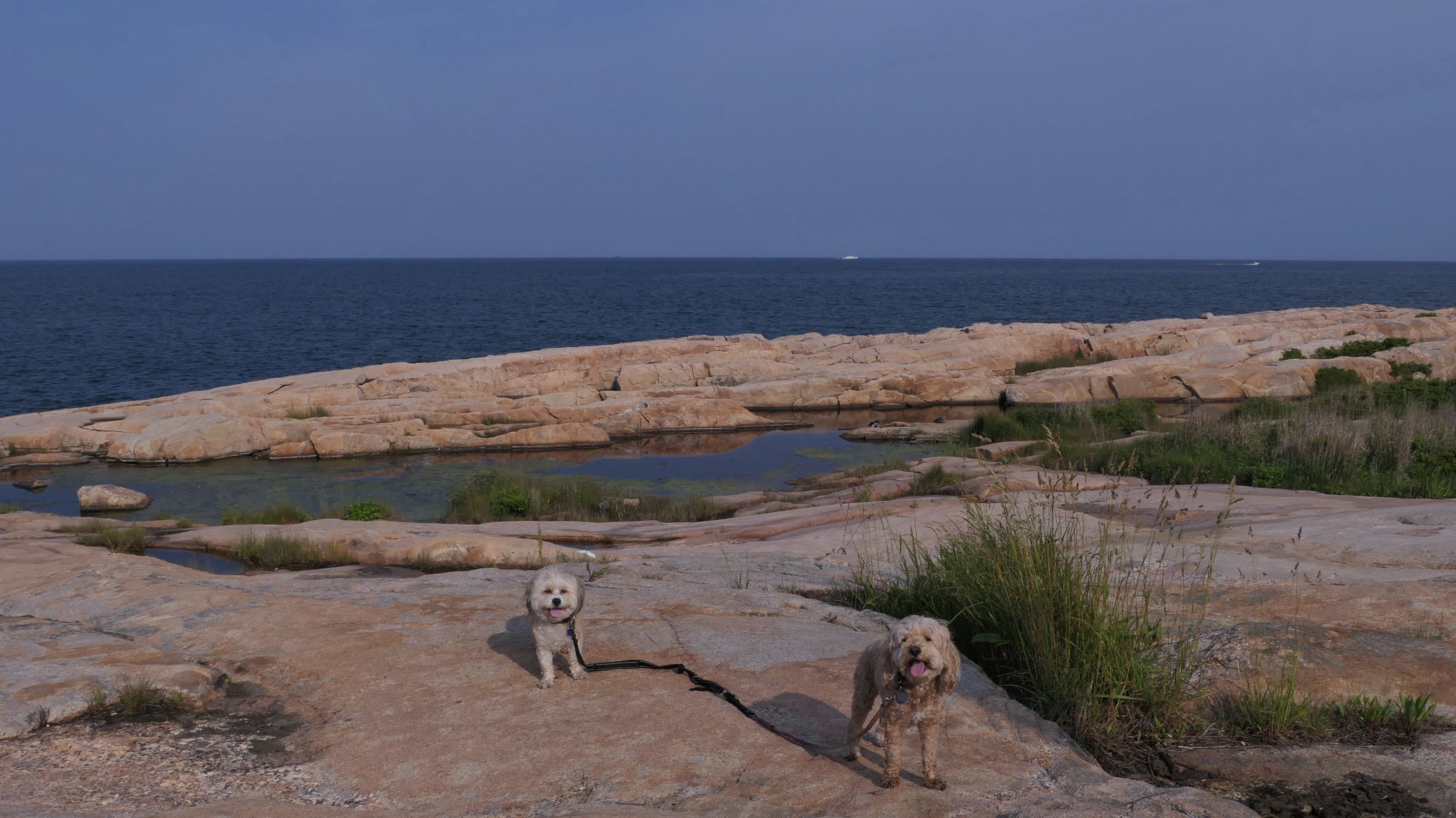 This is the second of the three public waterfront access areas that we visited on this day. Like Bass Rock, it also features a steep trail that leads down to the rocks on the shoreline. The rocks are easier to access here. In addtion to the people fishing, there were also groups of people sun-bathing here, and even another dog! I learned the hard way that despite the rocks looking easier to traverse, they can be slippery. Mandy wanted to go down to the water, and kind of pulled me along and I slipped and landed on my rear! Ultimately I was okay, and we made our way to Hazard Rock later in the day.