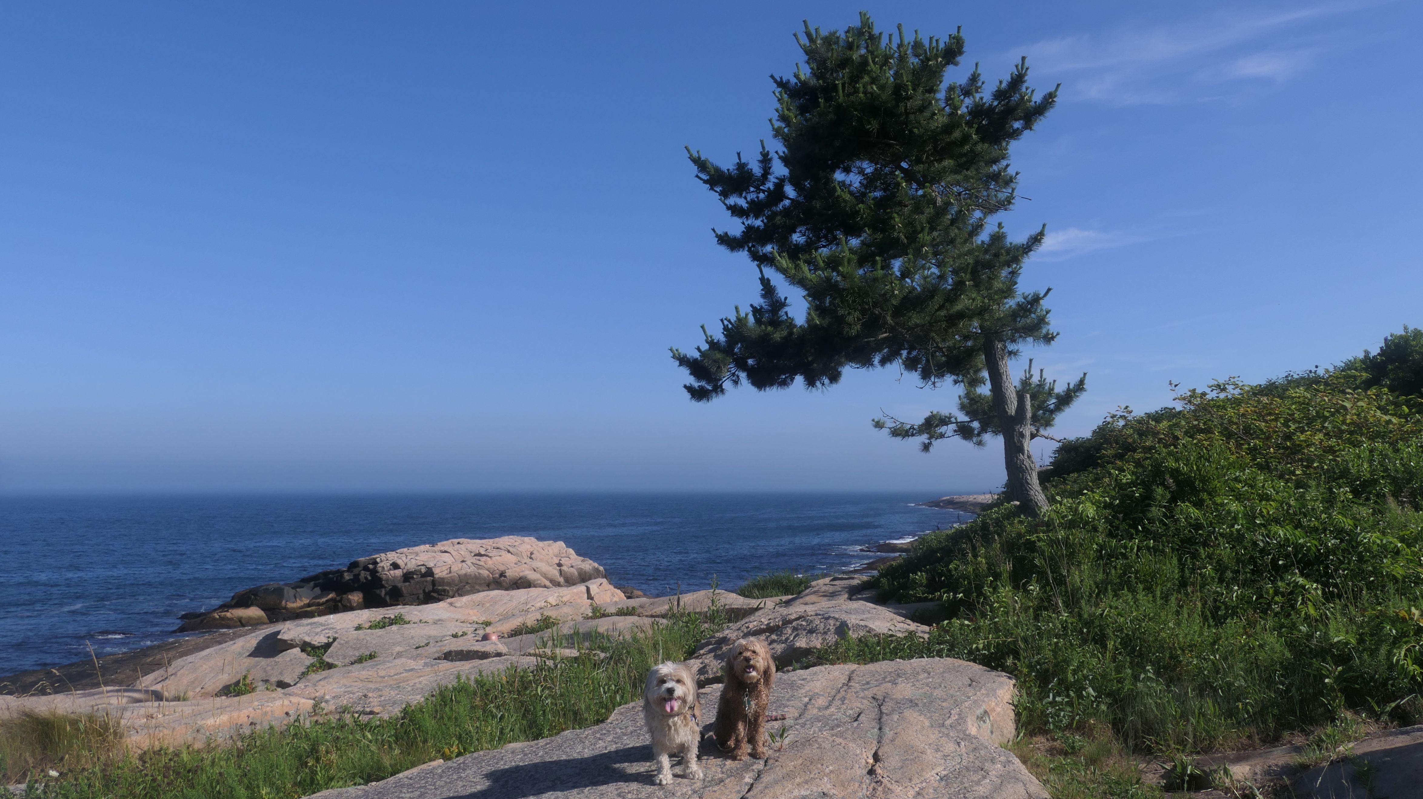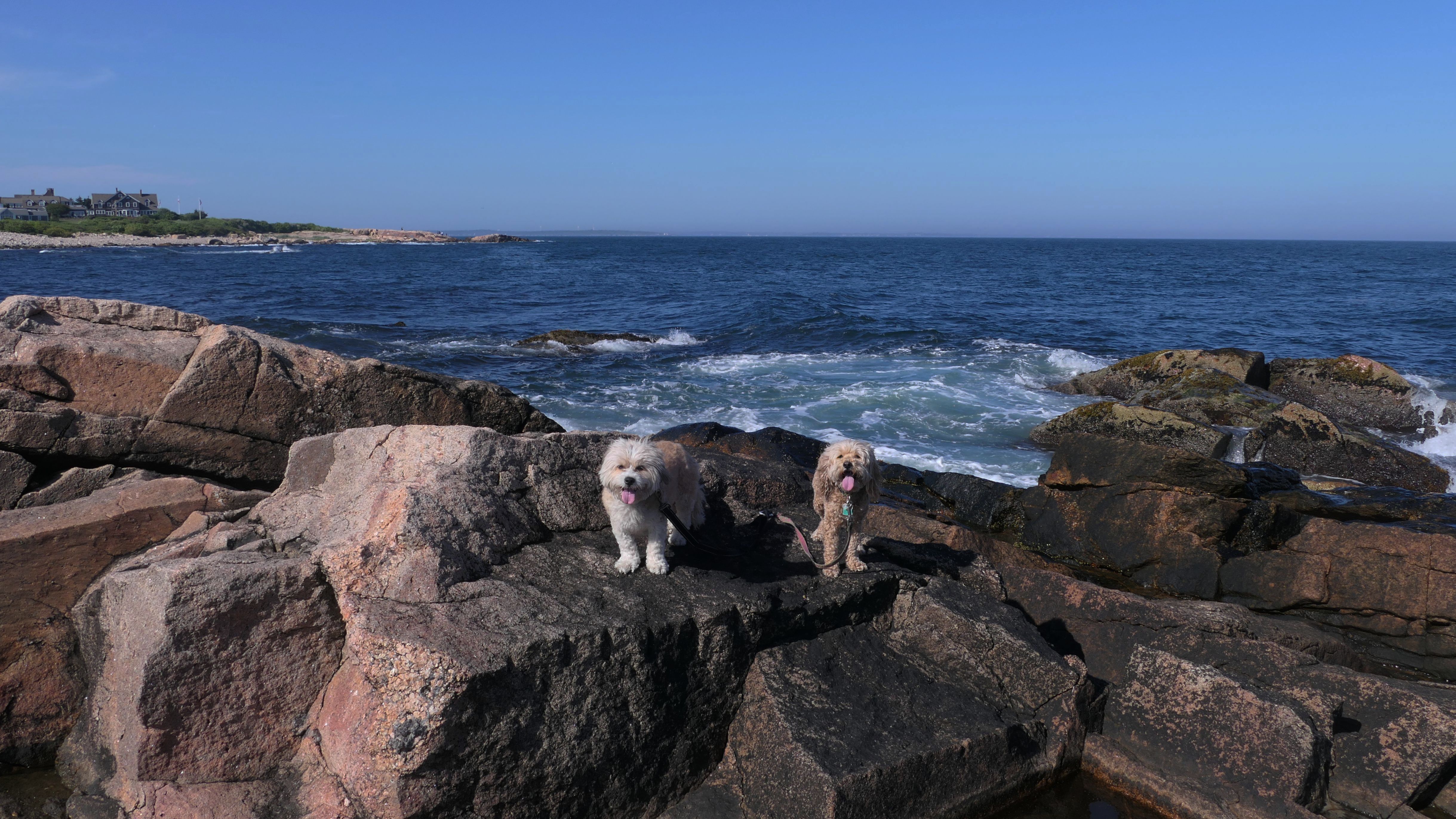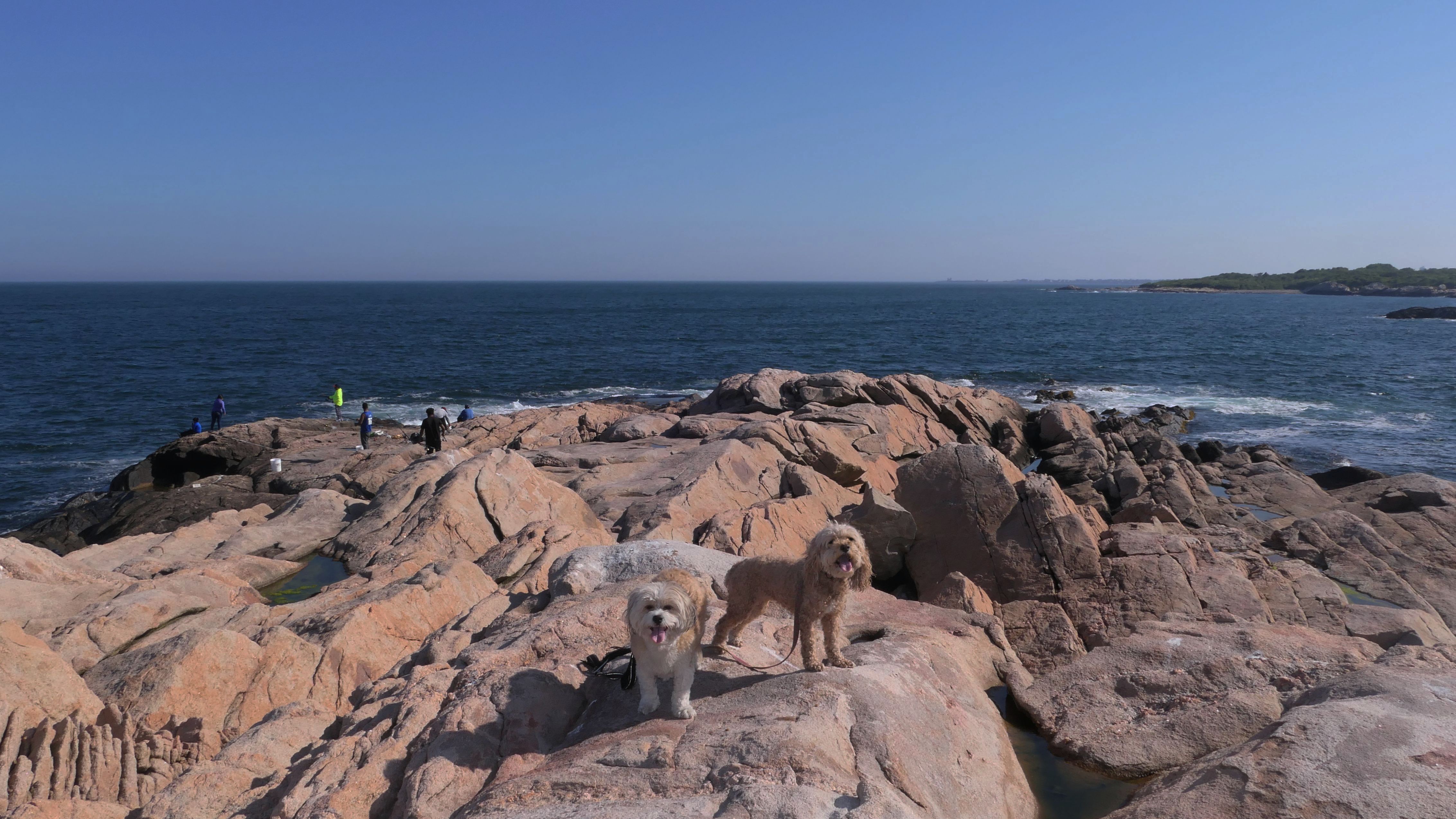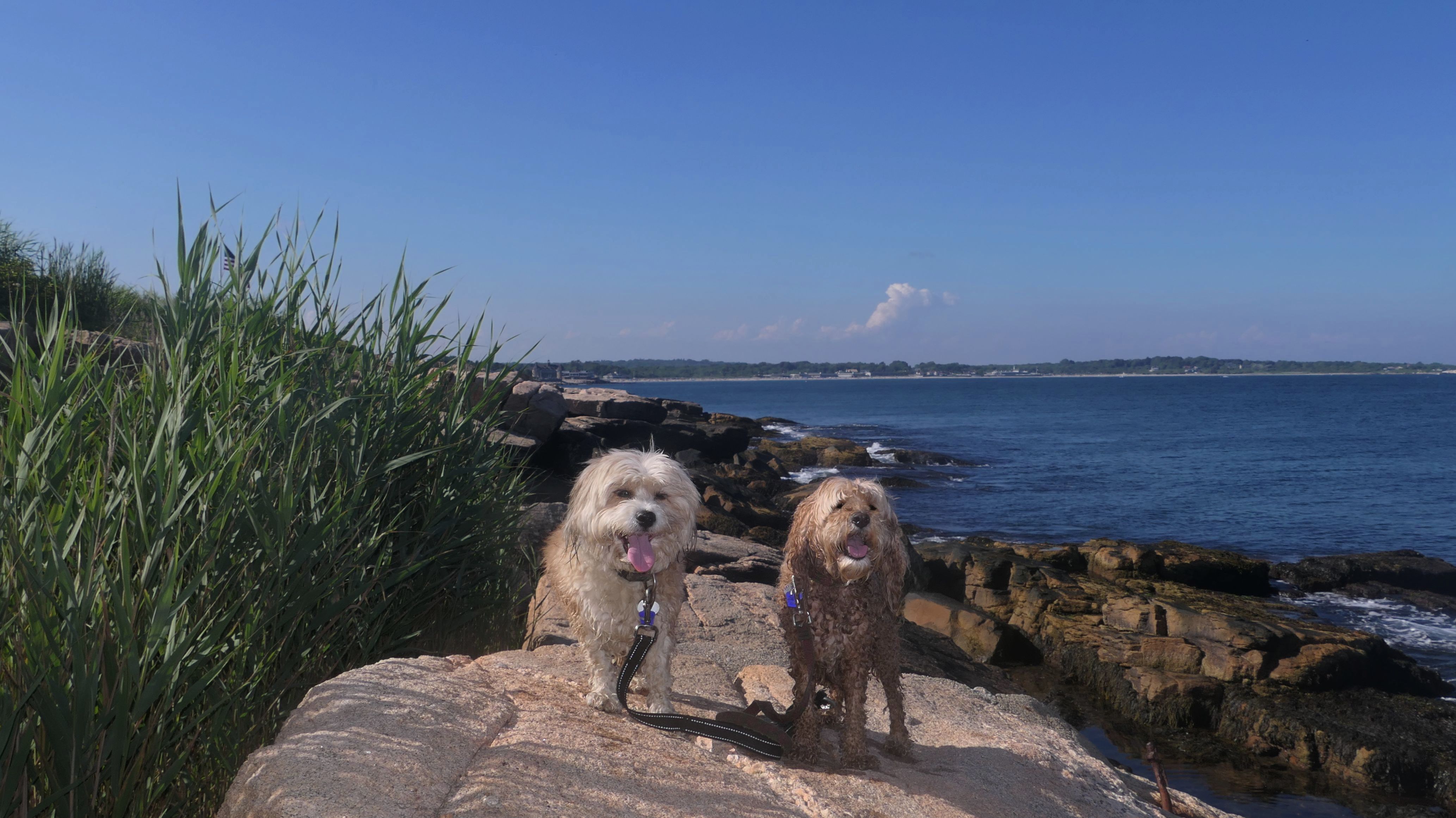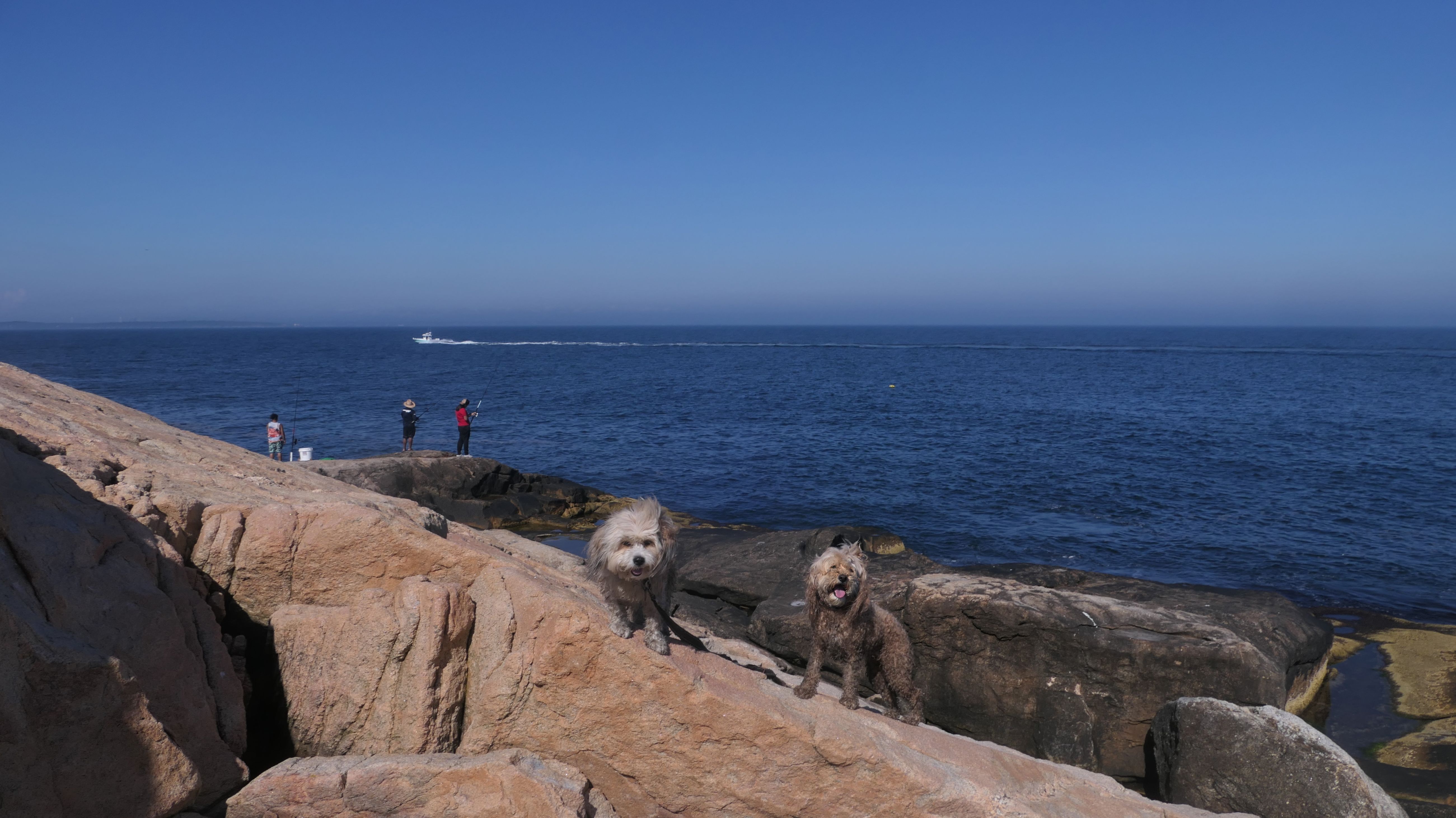 This is the second of the three public waterfront access areas that we visited on this day. Like Bass Rock, it also features a steep trail that leads down to the rocks on the shoreline. The rocks are easier to access here. In addtion to the people fishing, there were also groups of people sun-bathing here, and even another dog! I learned the hard way that despite the rocks looking easier to traverse, they can be slippery. Mandy wanted to go down to the water, and kind of pulled me along and I slipped and landed on my rear! Ultimately I was okay, and we made our way to Hazard Rock later in the day.