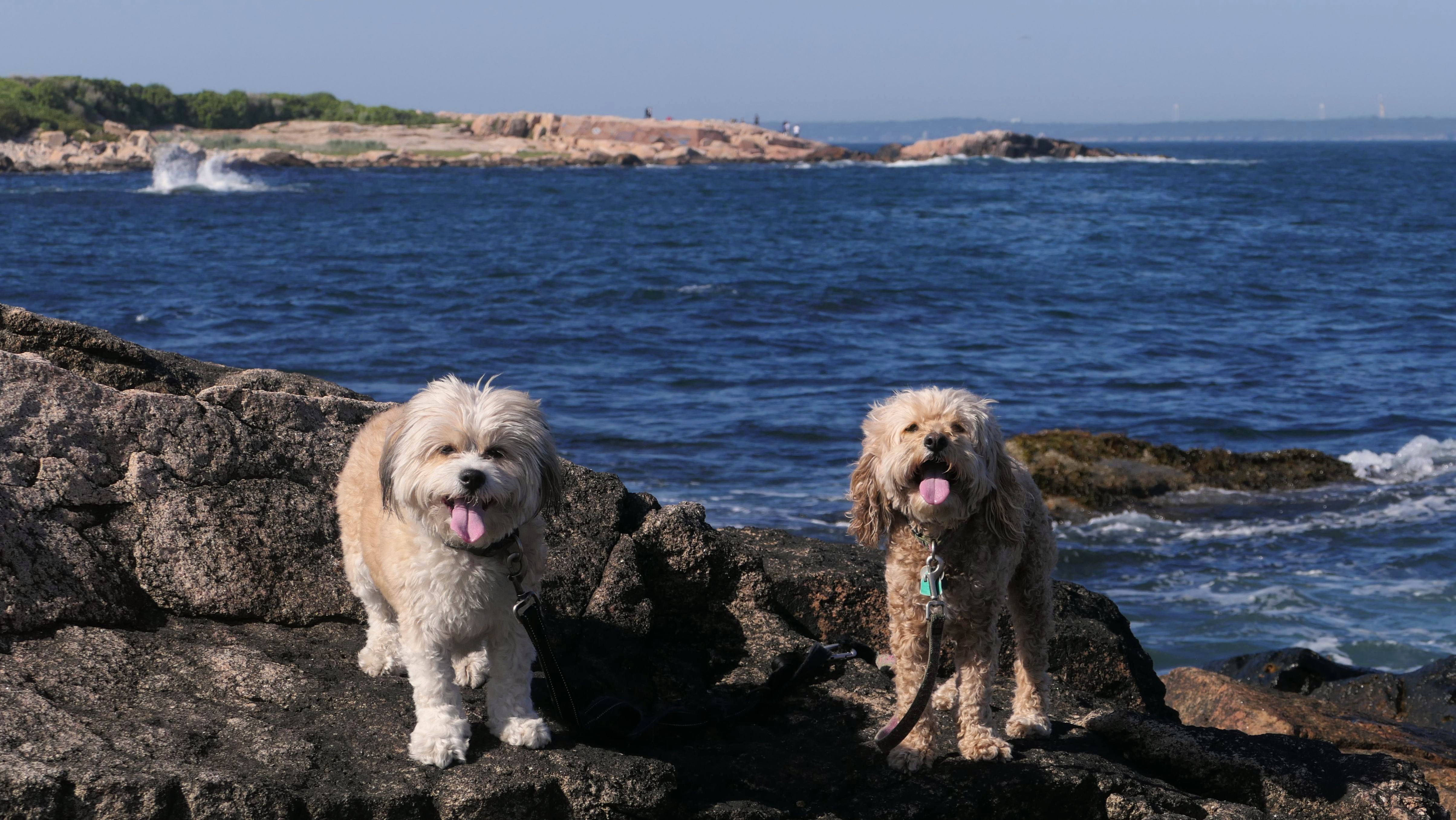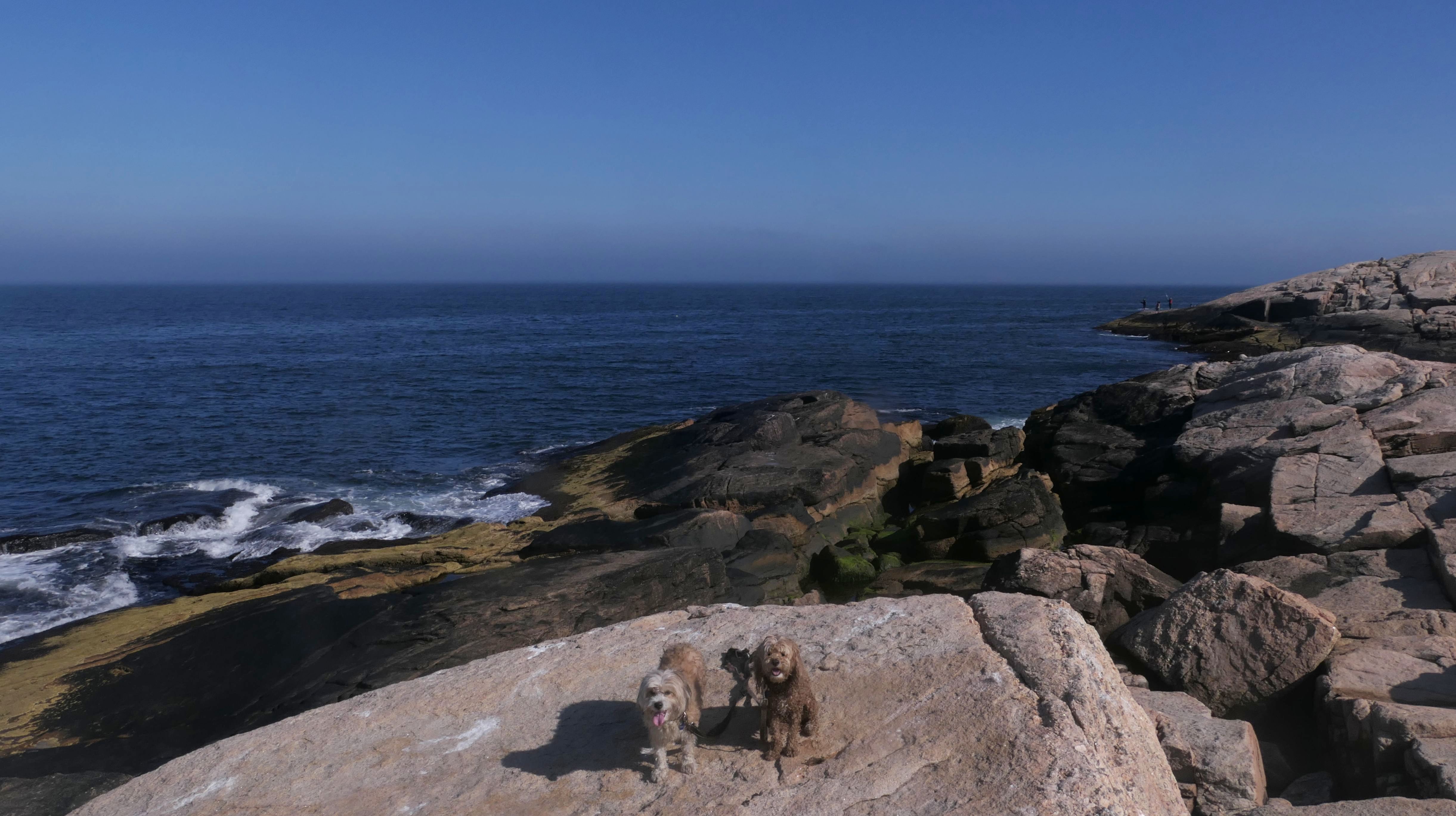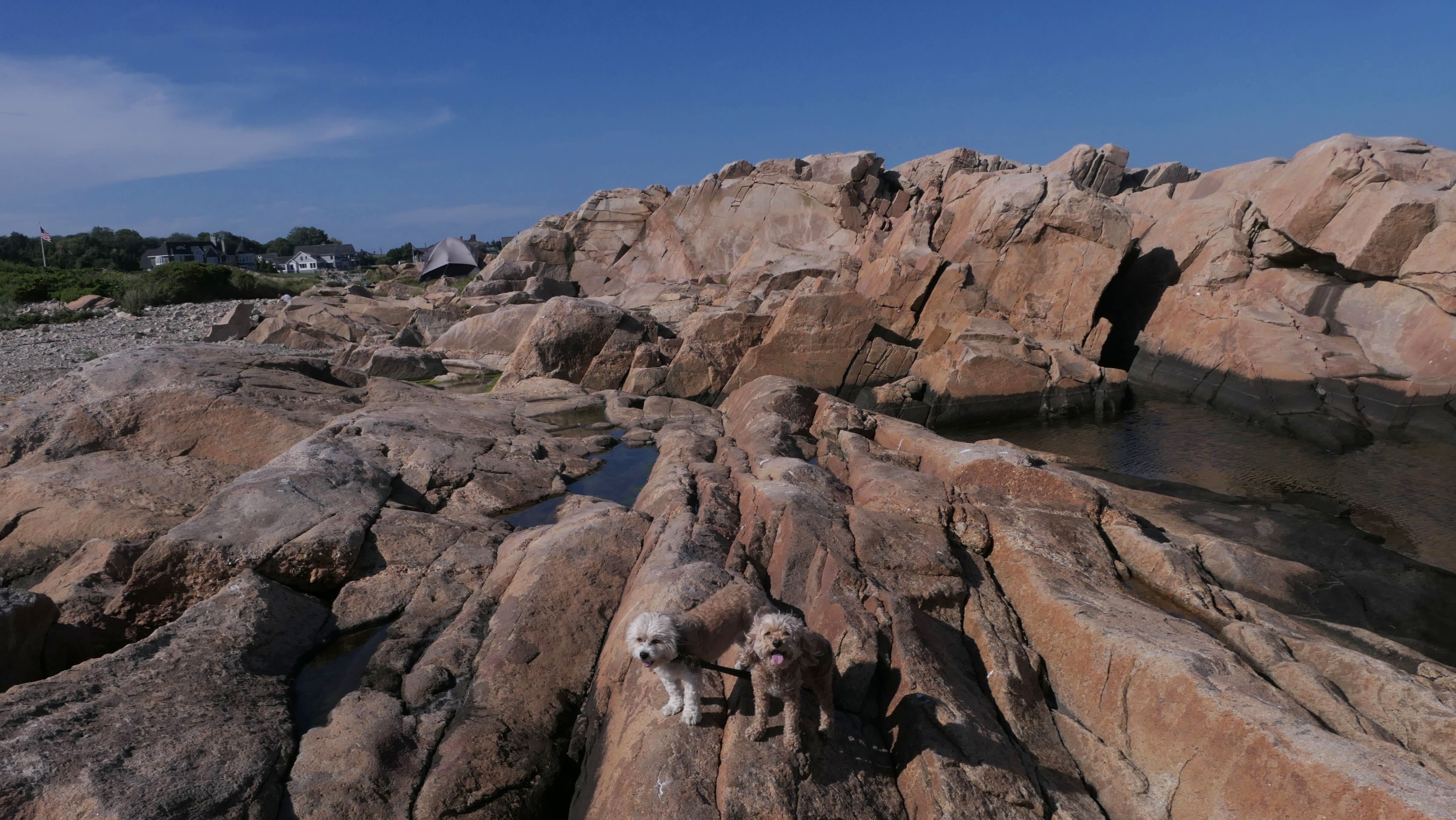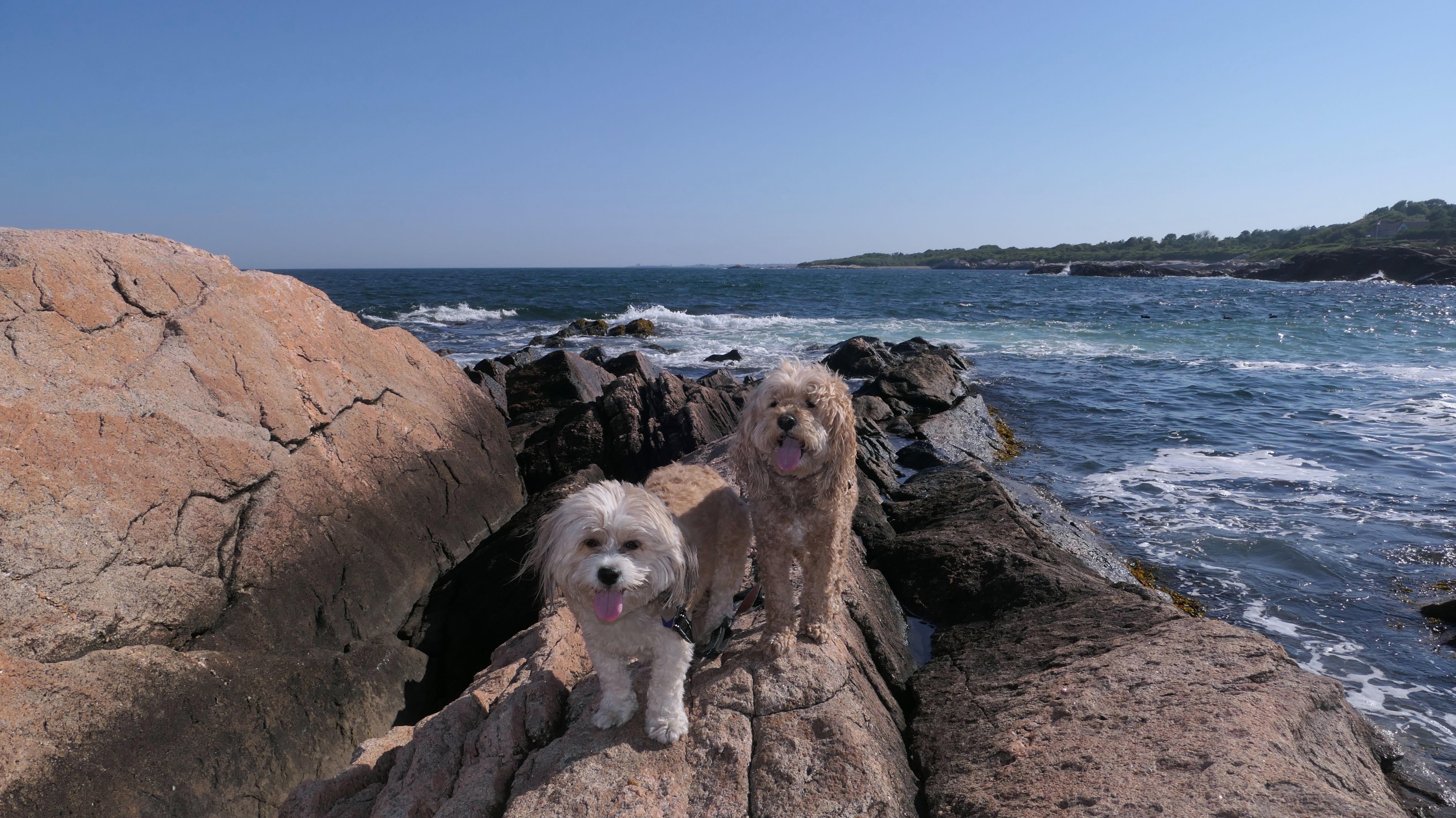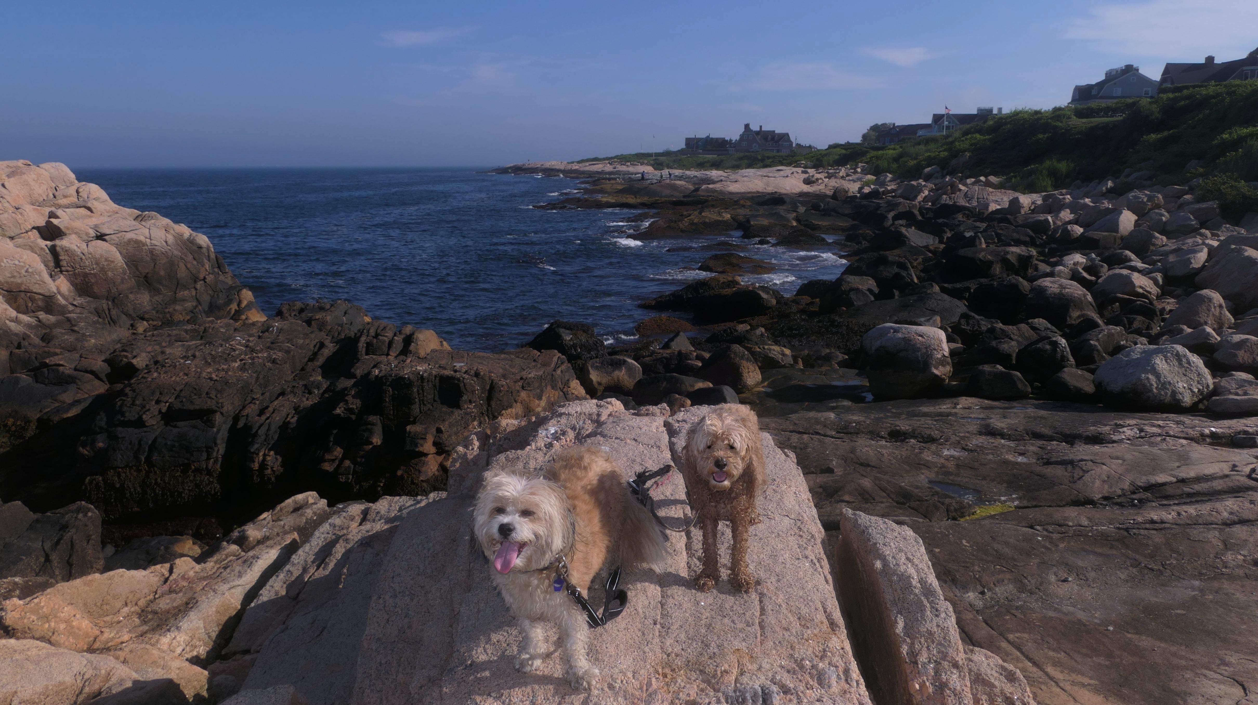 This is the second of the three public waterfront access areas that we visited on this day. Like Bass Rock, it also features a steep trail that leads down to the rocks on the shoreline. The rocks are easier to access here. In addtion to the people fishing, there were also groups of people sun-bathing here, and even another dog! I learned the hard way that despite the rocks looking easier to traverse, they can be slippery. Mandy wanted to go down to the water, and kind of pulled me along and I slipped and landed on my rear! Ultimately I was okay, and we made our way to Hazard Rock later in the day.