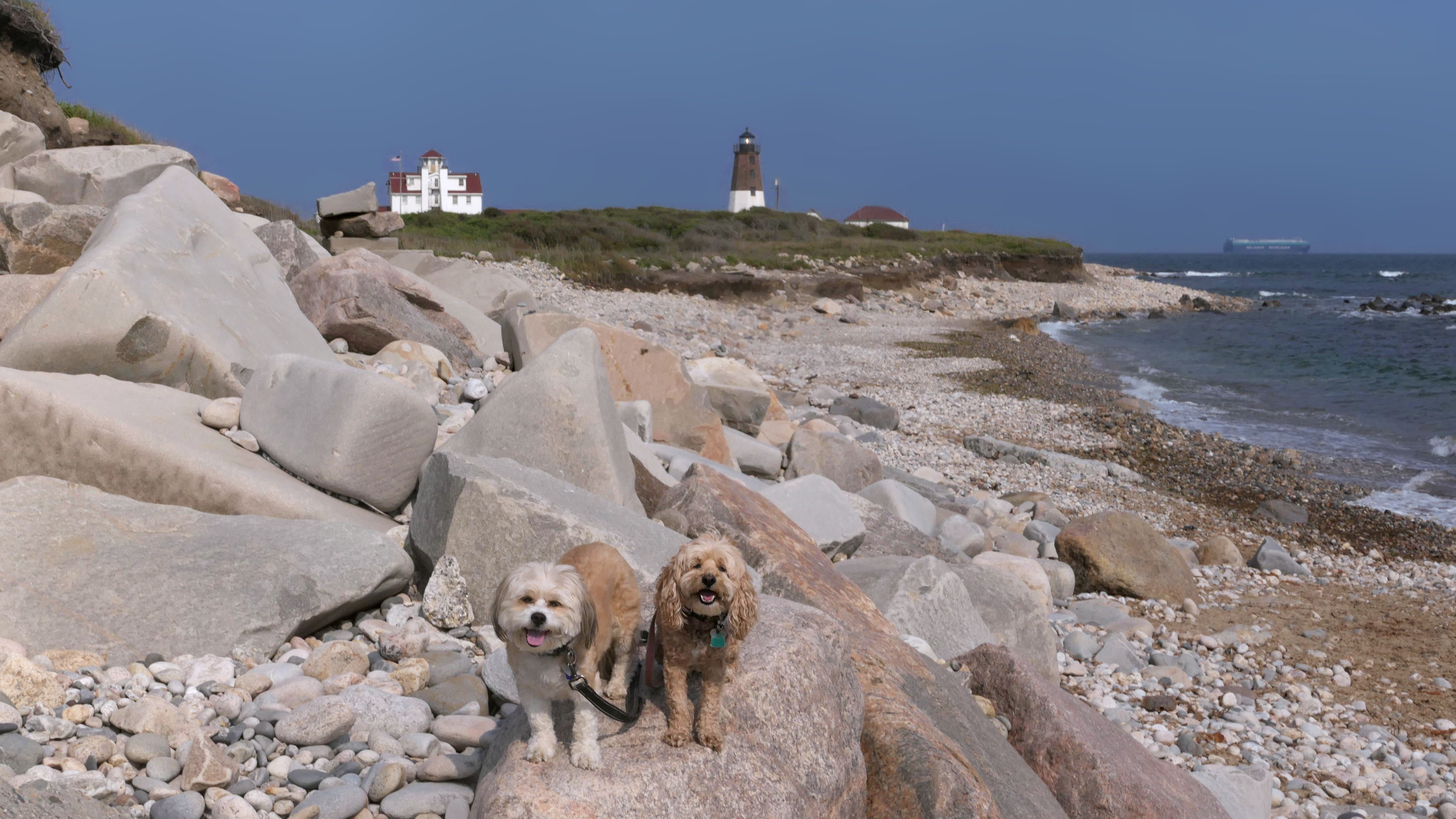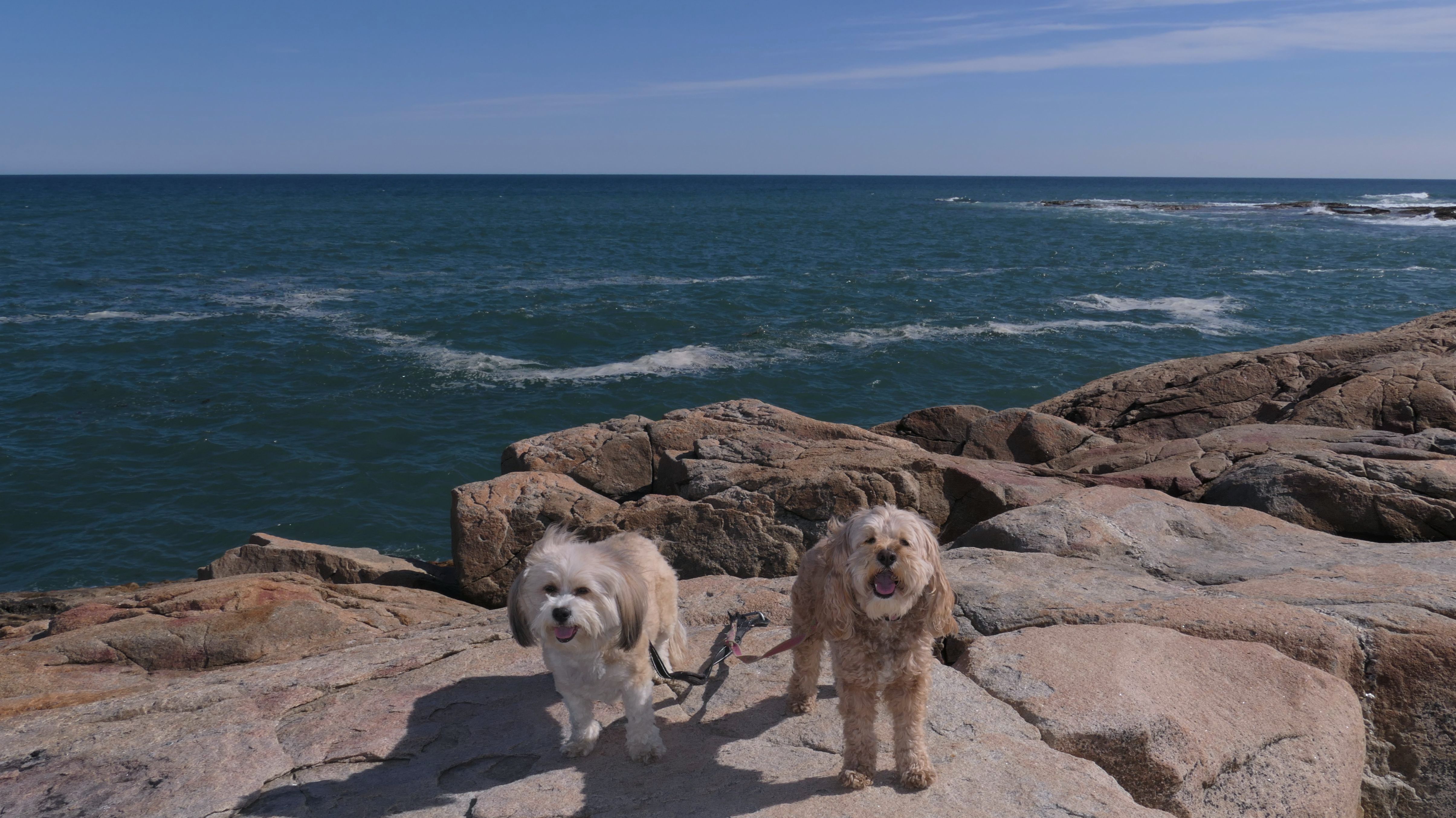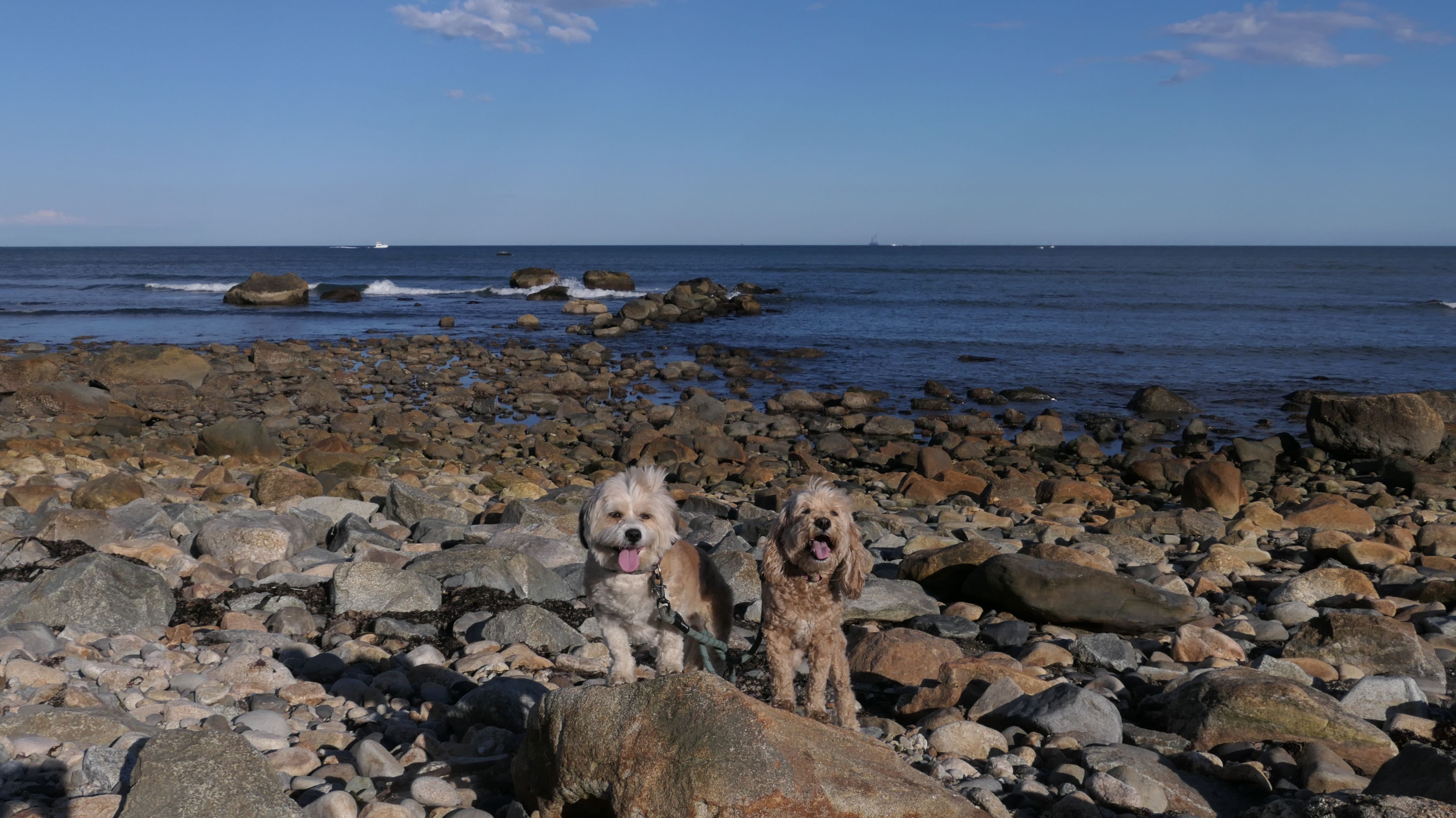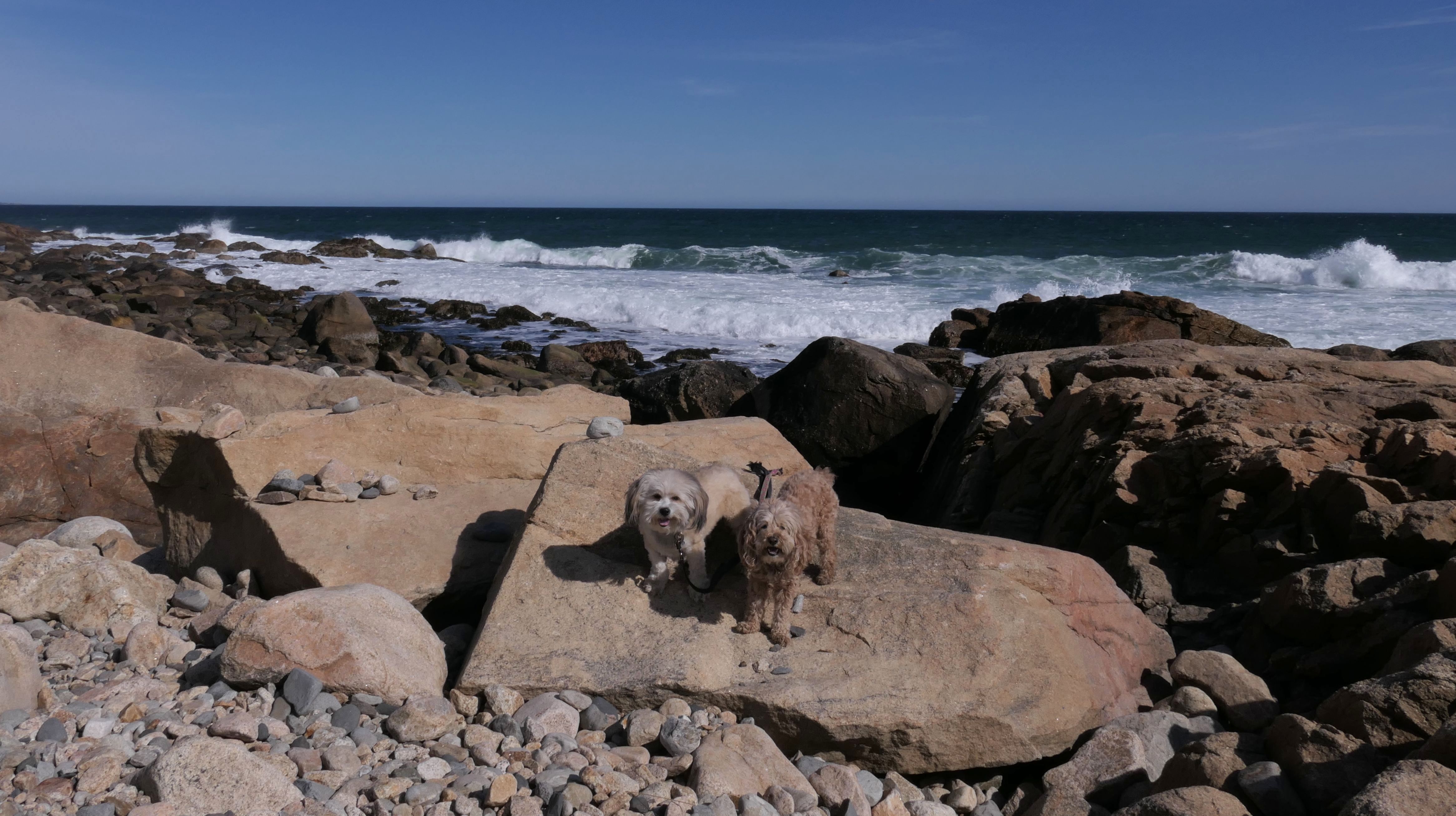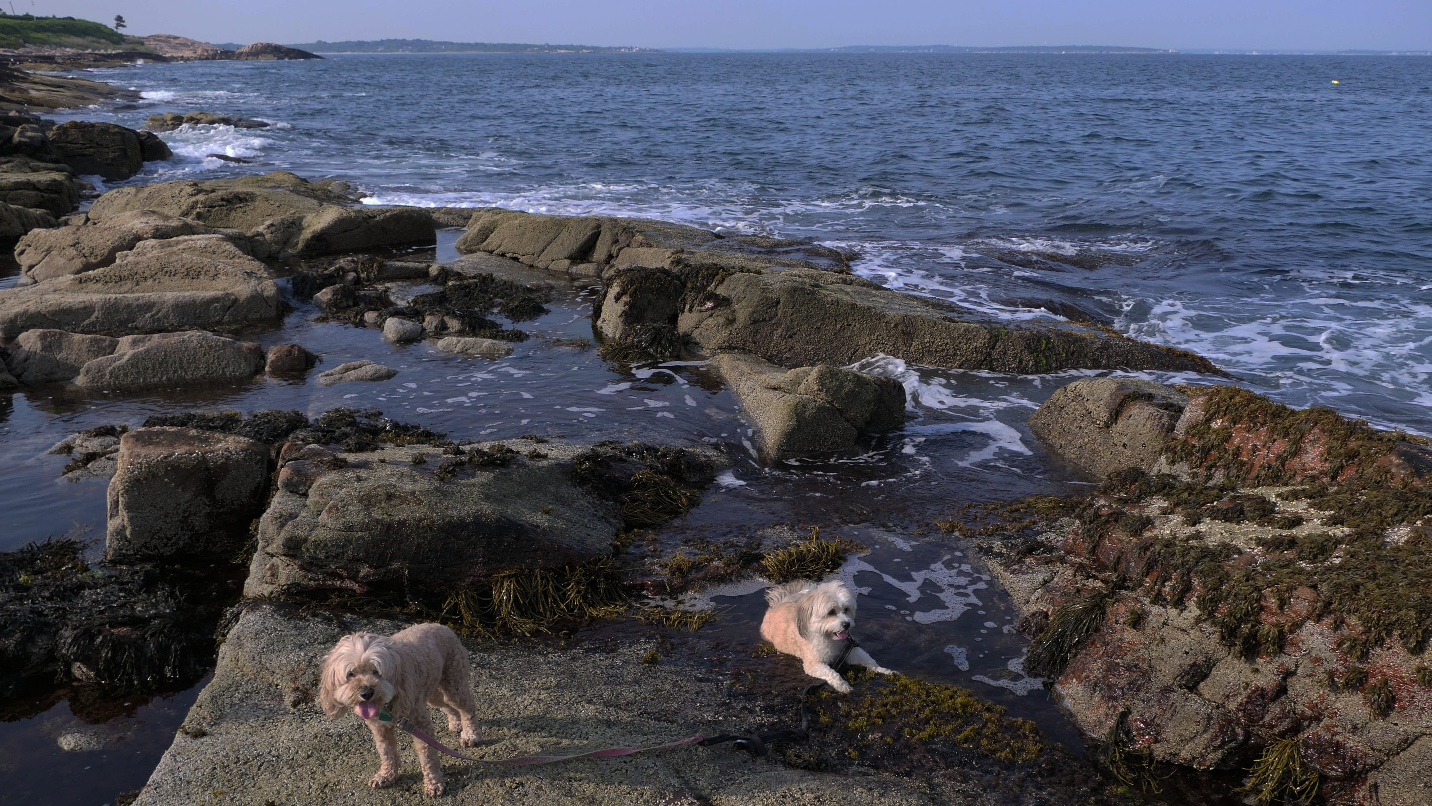 This is the second of the three public waterfront access areas that we visited on this day. Like Bass Rock, it also features a steep trail that leads down to the rocks on the shoreline. The rocks are easier to access here. In addtion to the people fishing, there were also groups of people sun-bathing here, and even another dog! I learned the hard way that despite the rocks looking easier to traverse, they can be slippery. Mandy wanted to go down to the water, and kind of pulled me along and I slipped and landed on my rear! Ultimately I was okay, and we made our way to Hazard Rock later in the day.