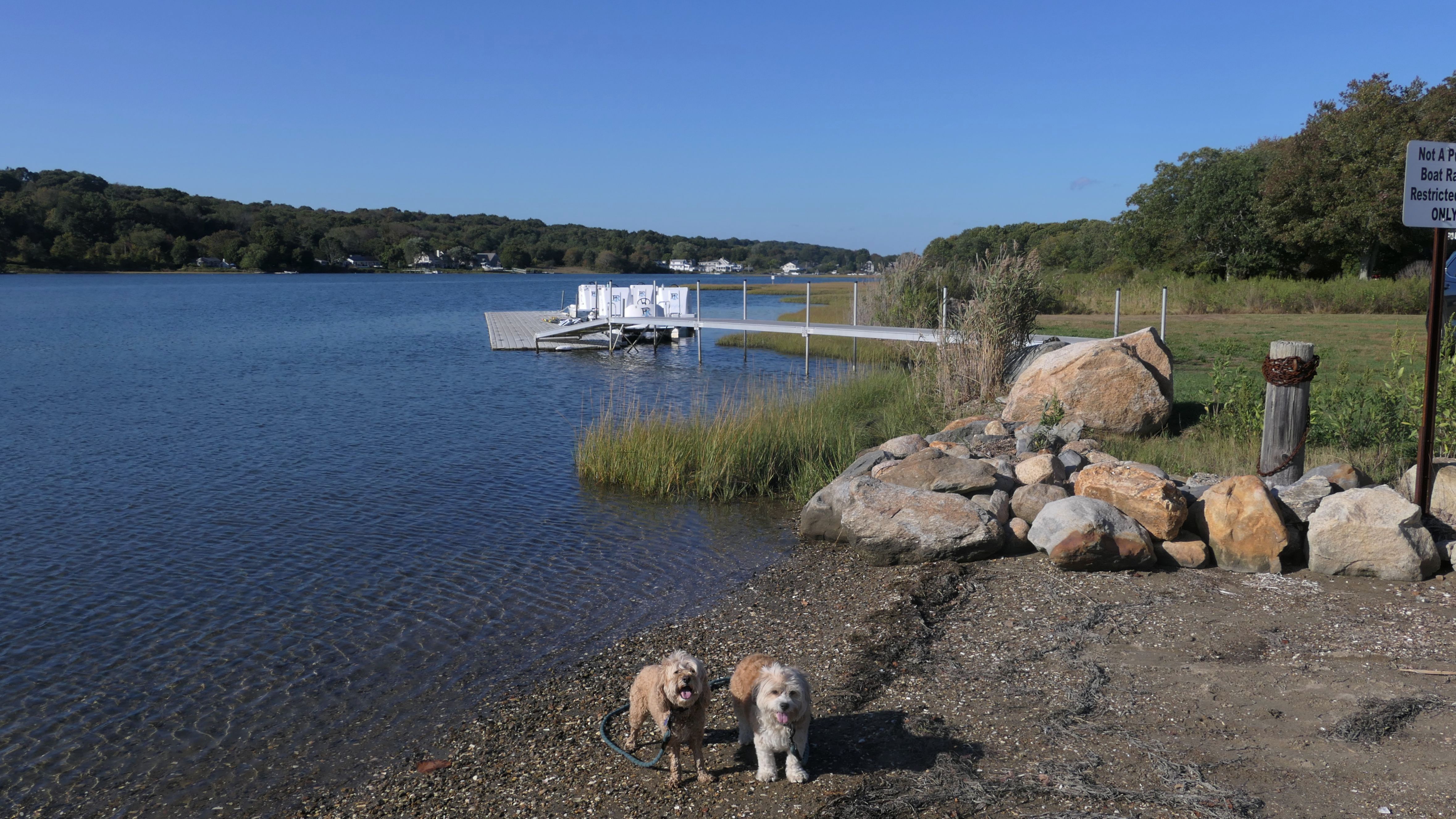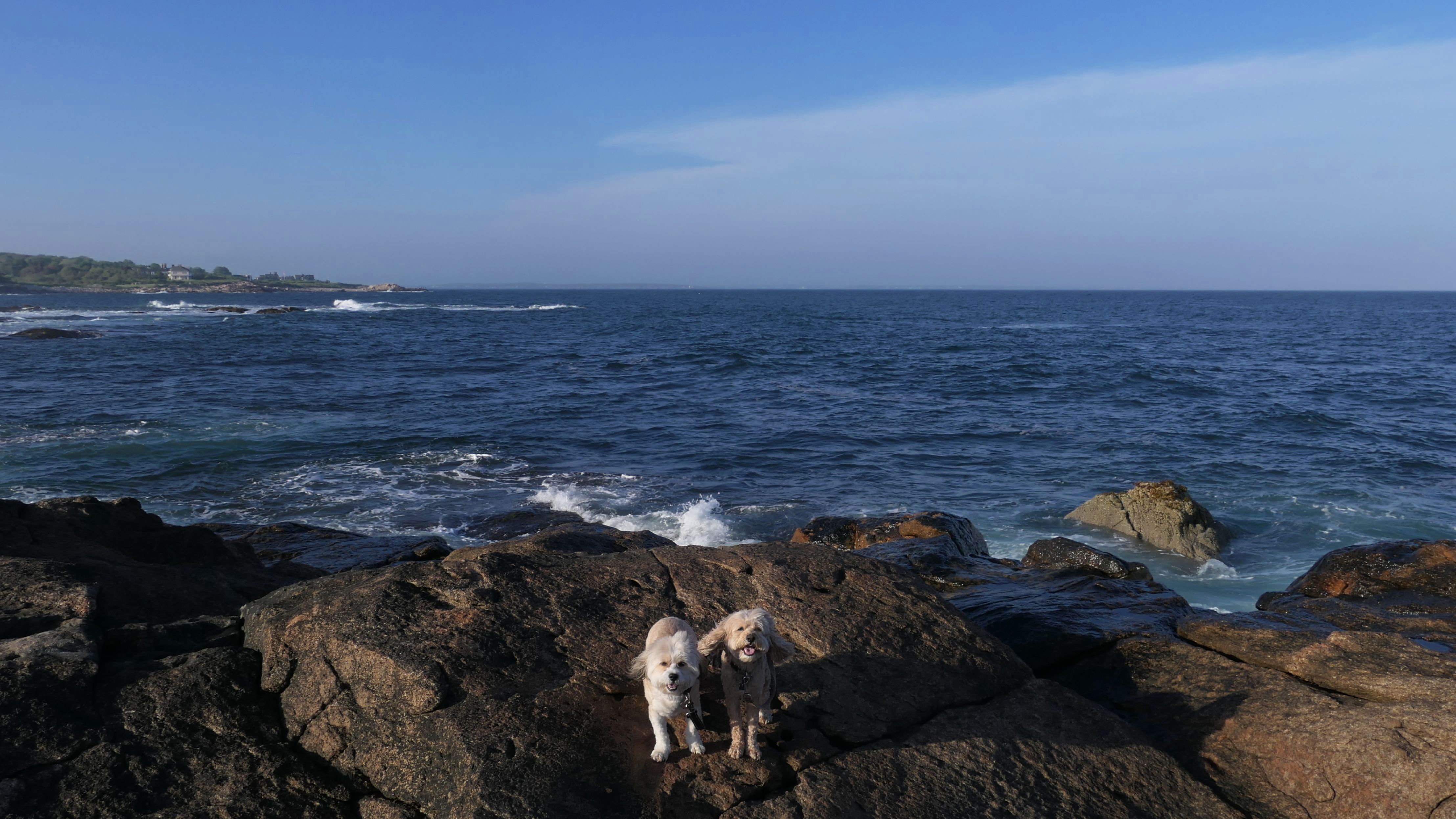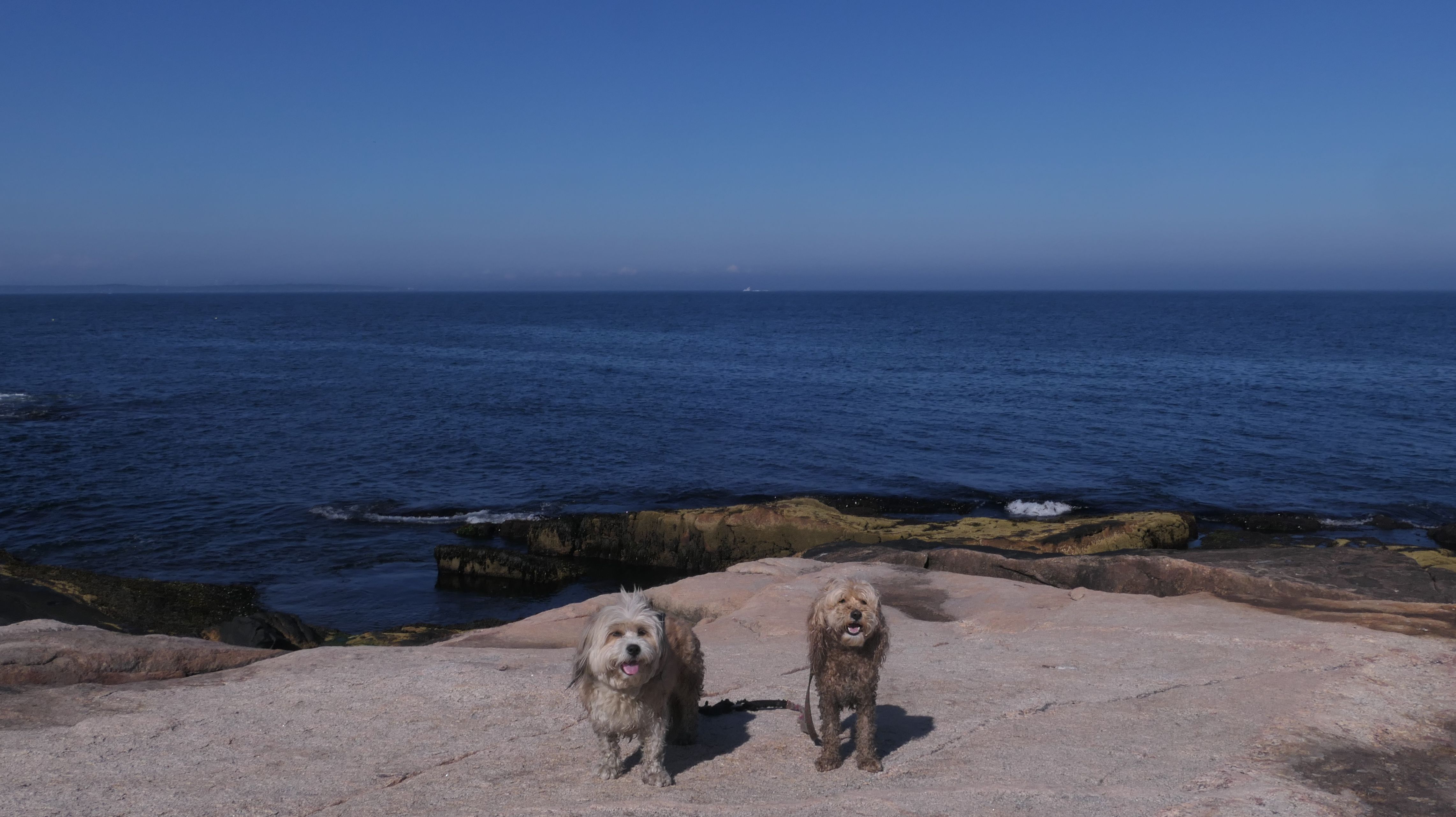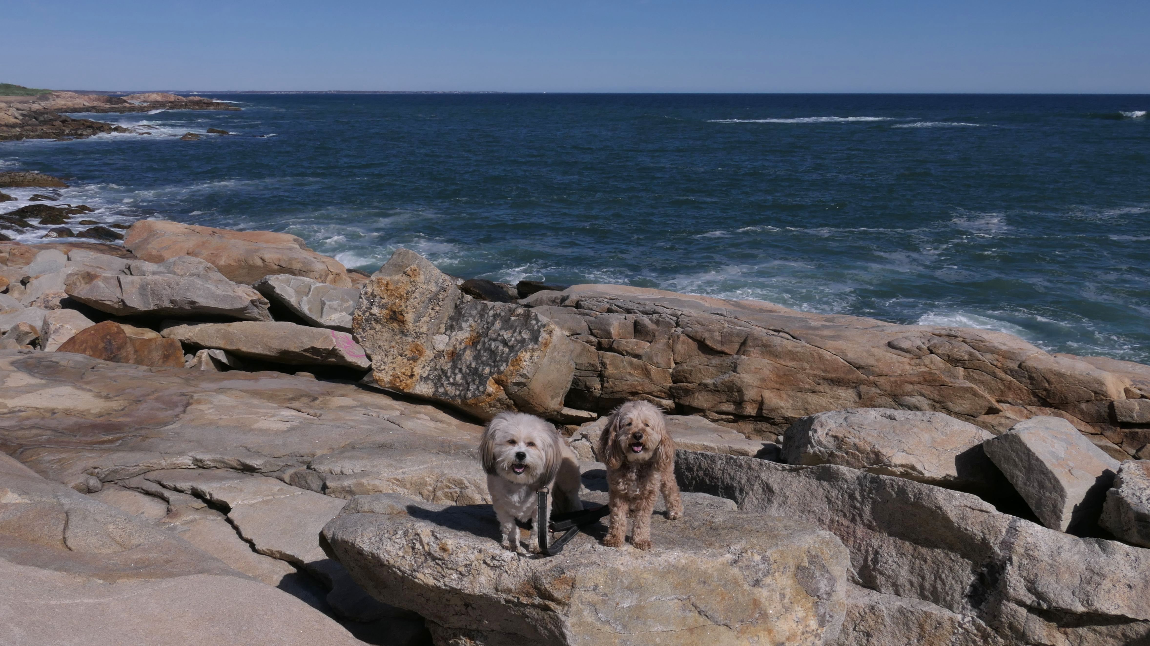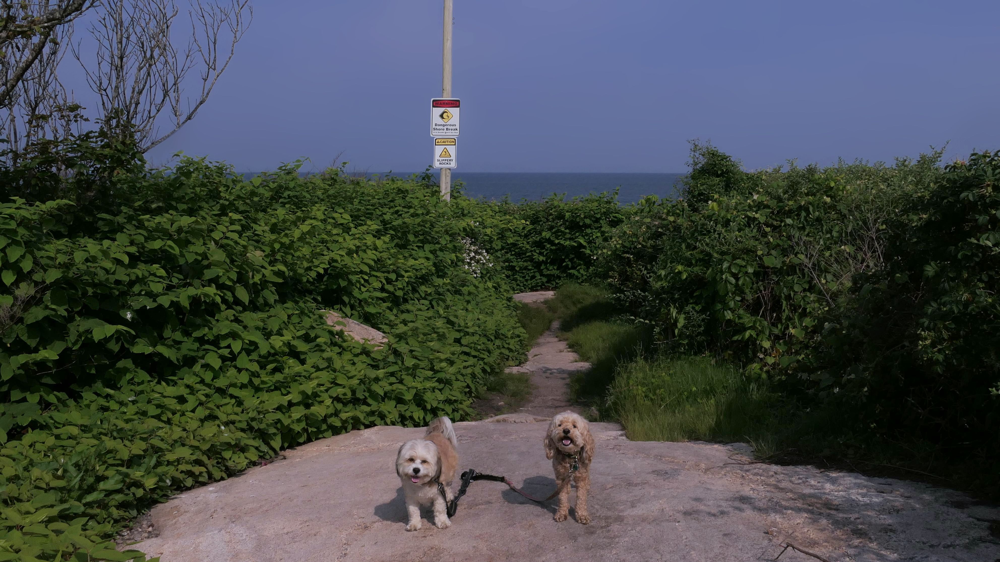 This is the second of the three public waterfront access areas that we visited on this day. Like Bass Rock, it also features a steep trail that leads down to the rocks on the shoreline. The rocks are easier to access here. In addtion to the people fishing, there were also groups of people sun-bathing here, and even another dog! I learned the hard way that despite the rocks looking easier to traverse, they can be slippery. Mandy wanted to go down to the water, and kind of pulled me along and I slipped and landed on my rear! Ultimately I was okay, and we made our way to Hazard Rock later in the day.