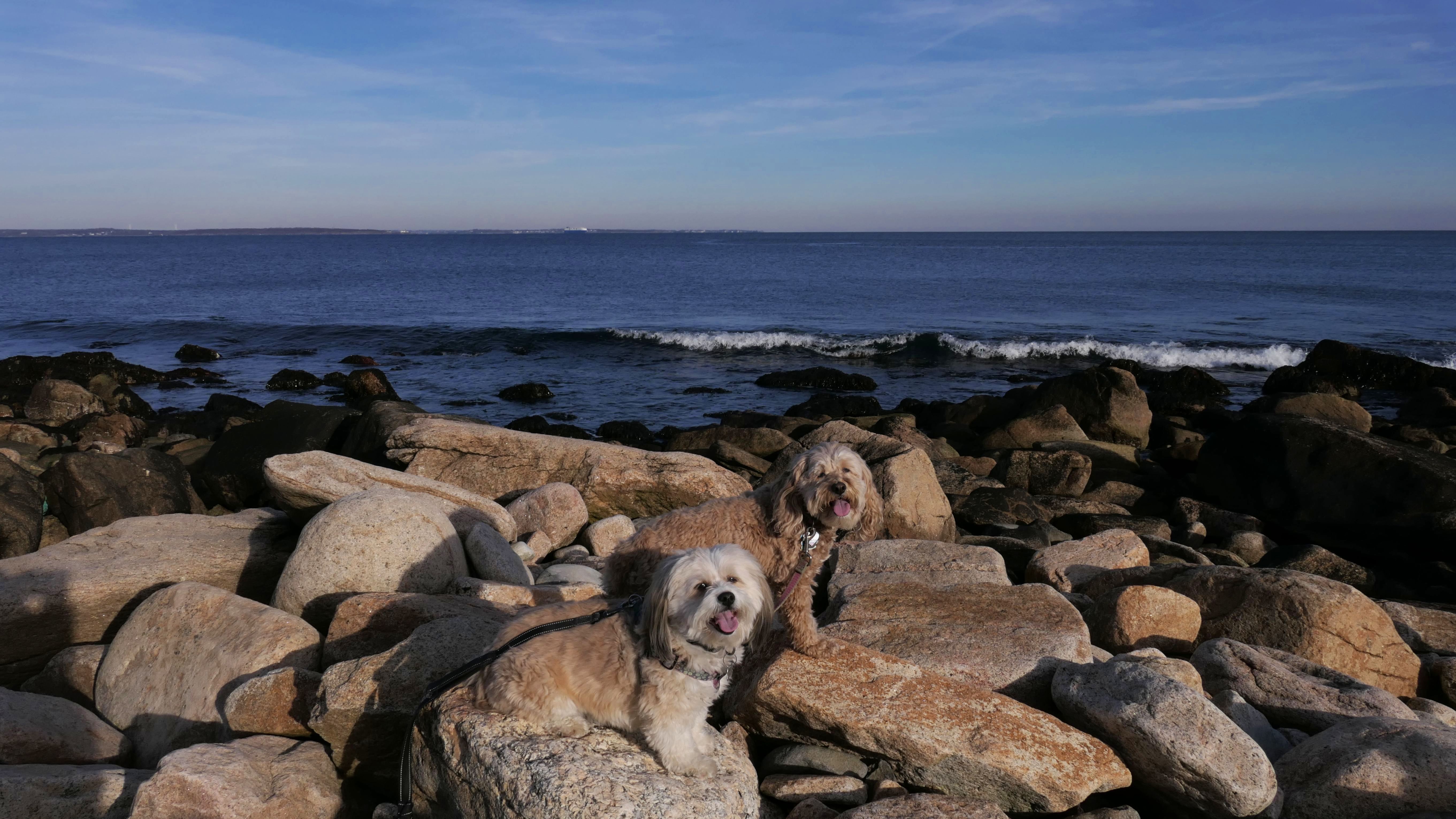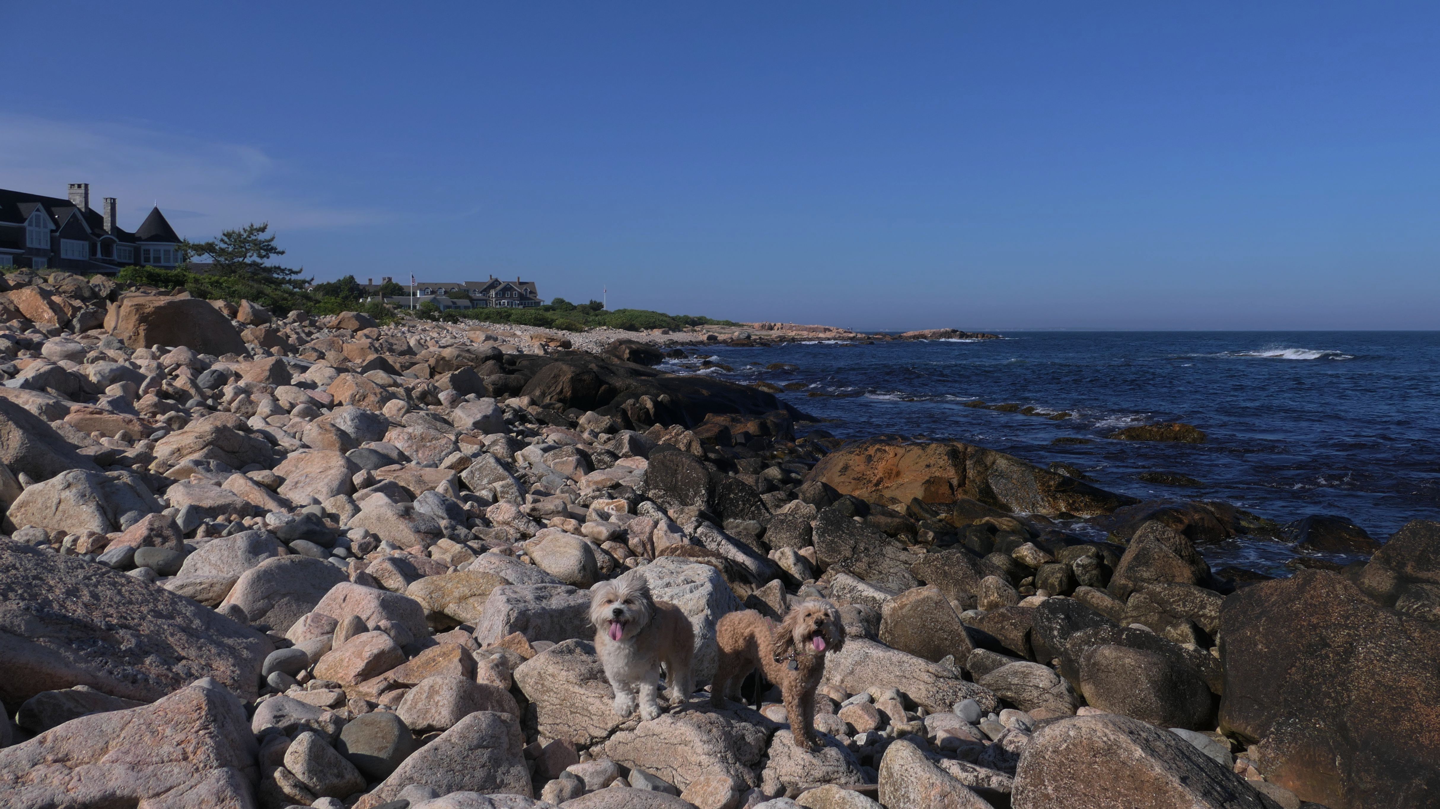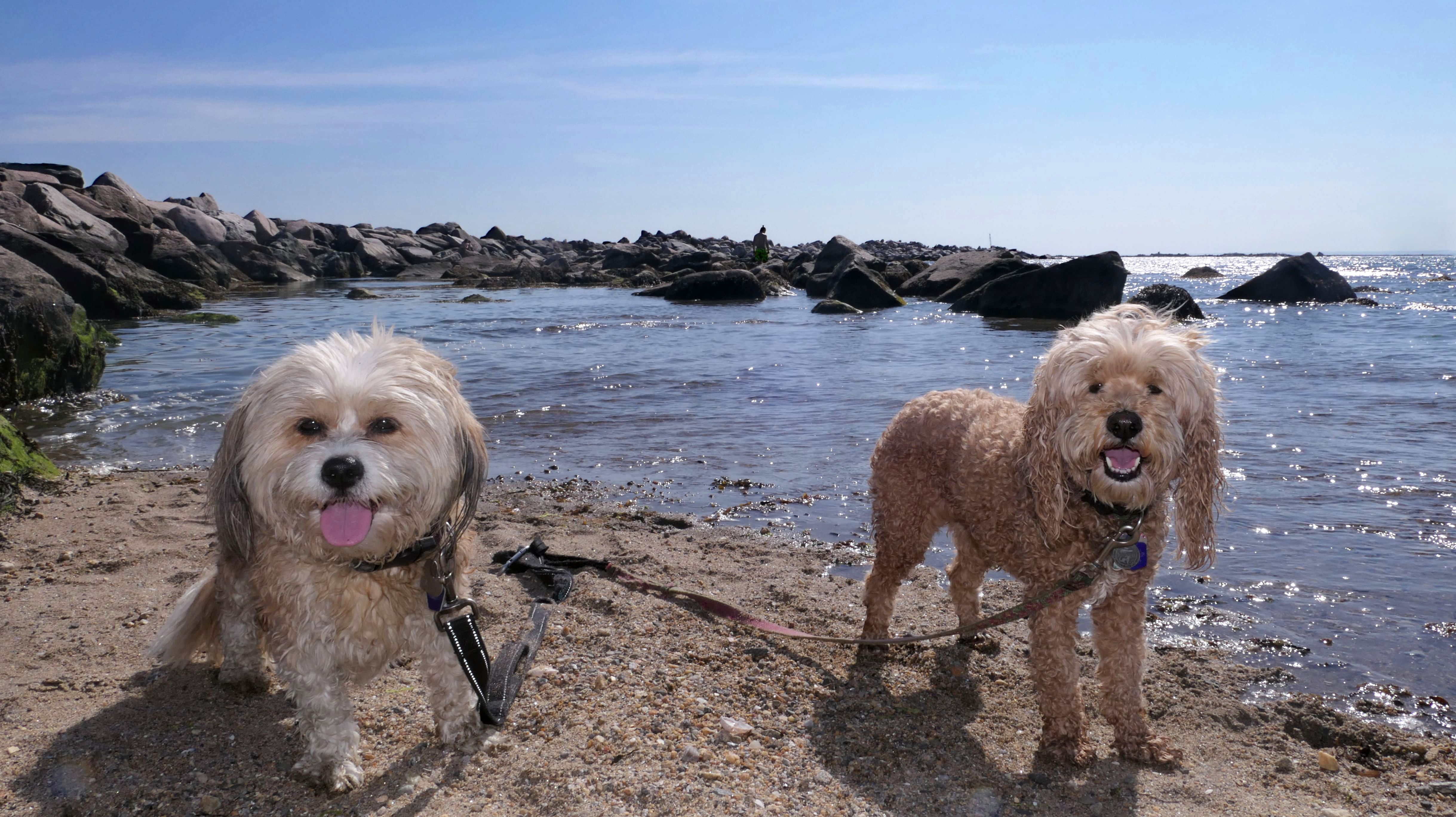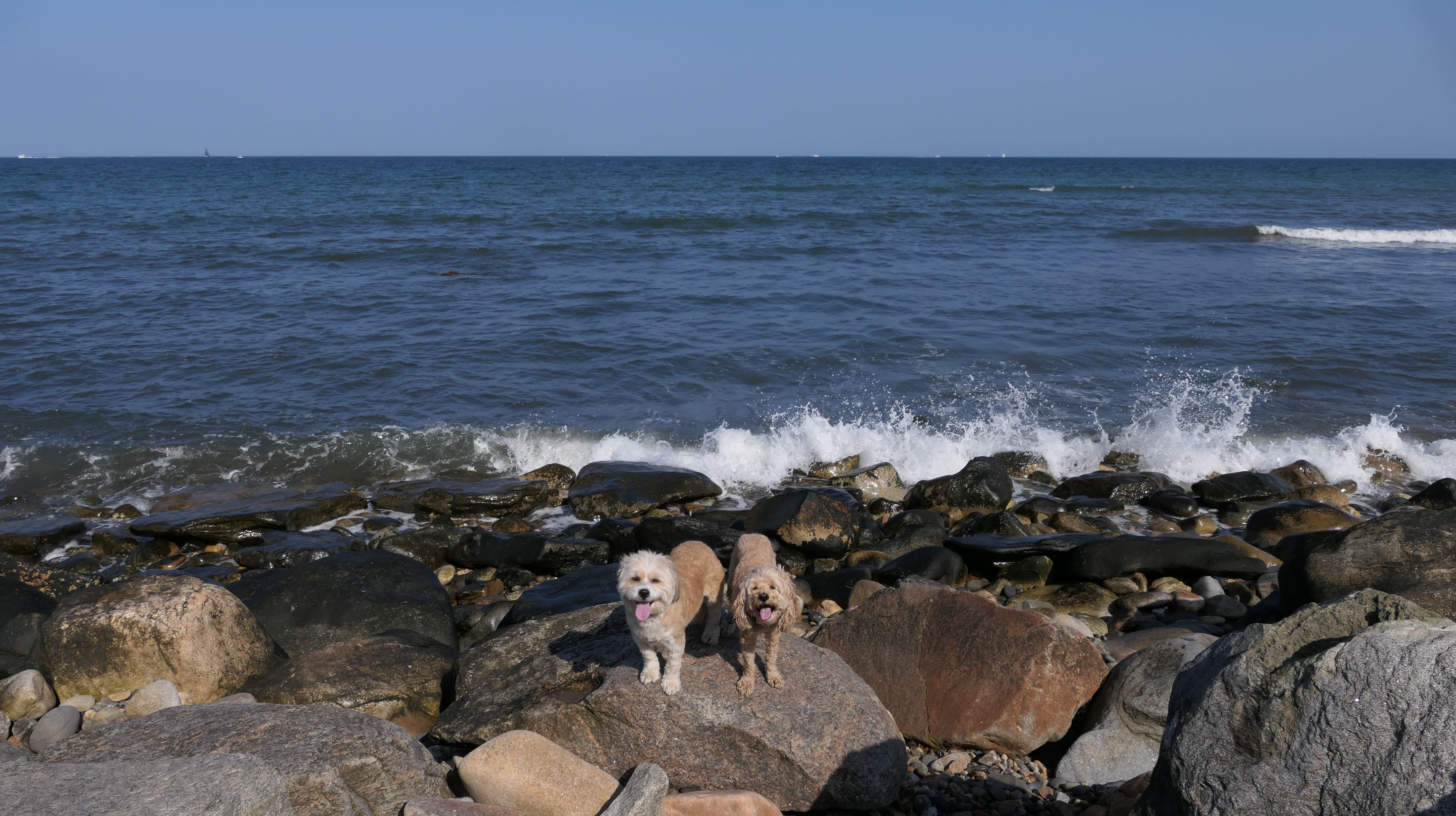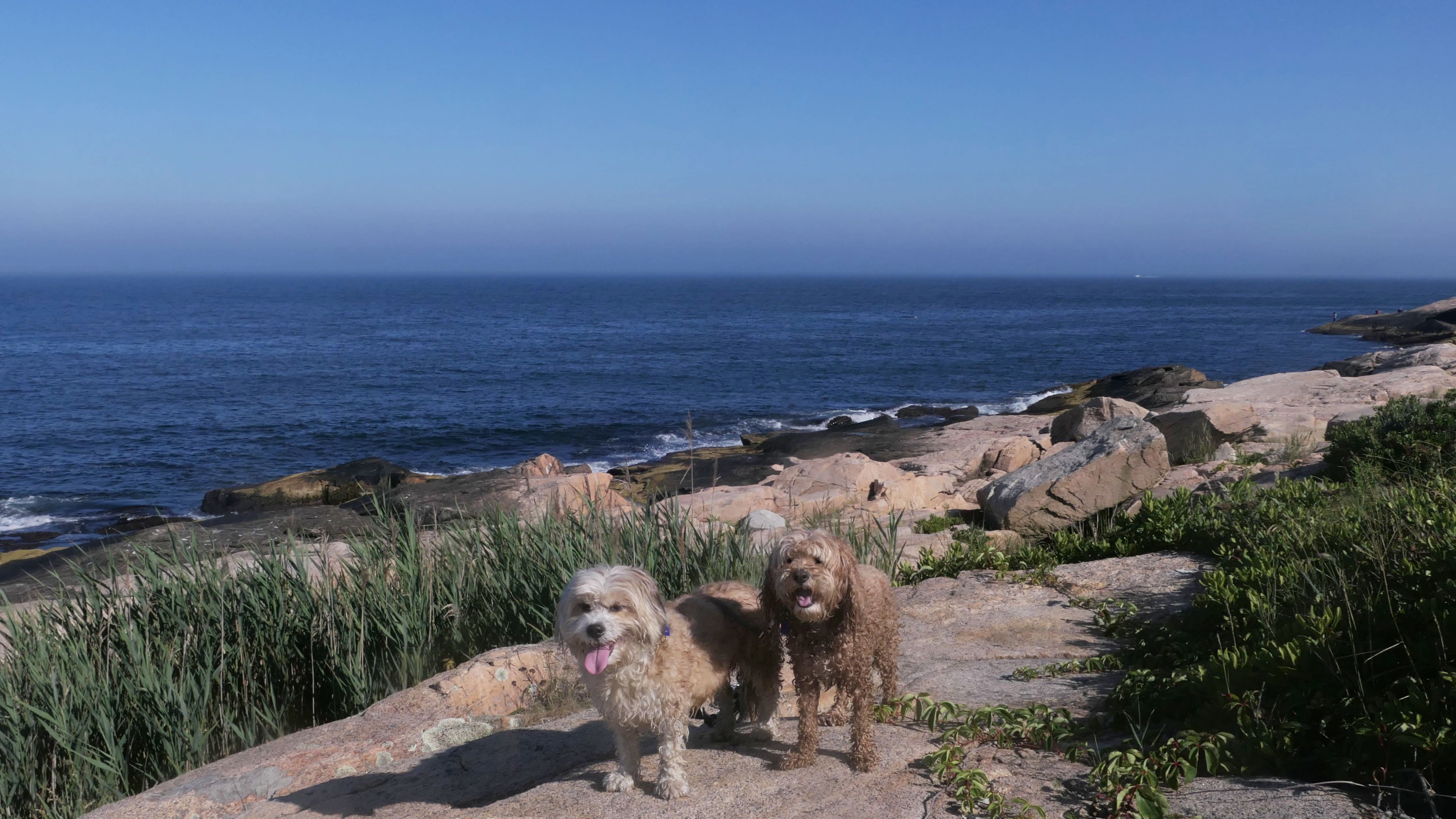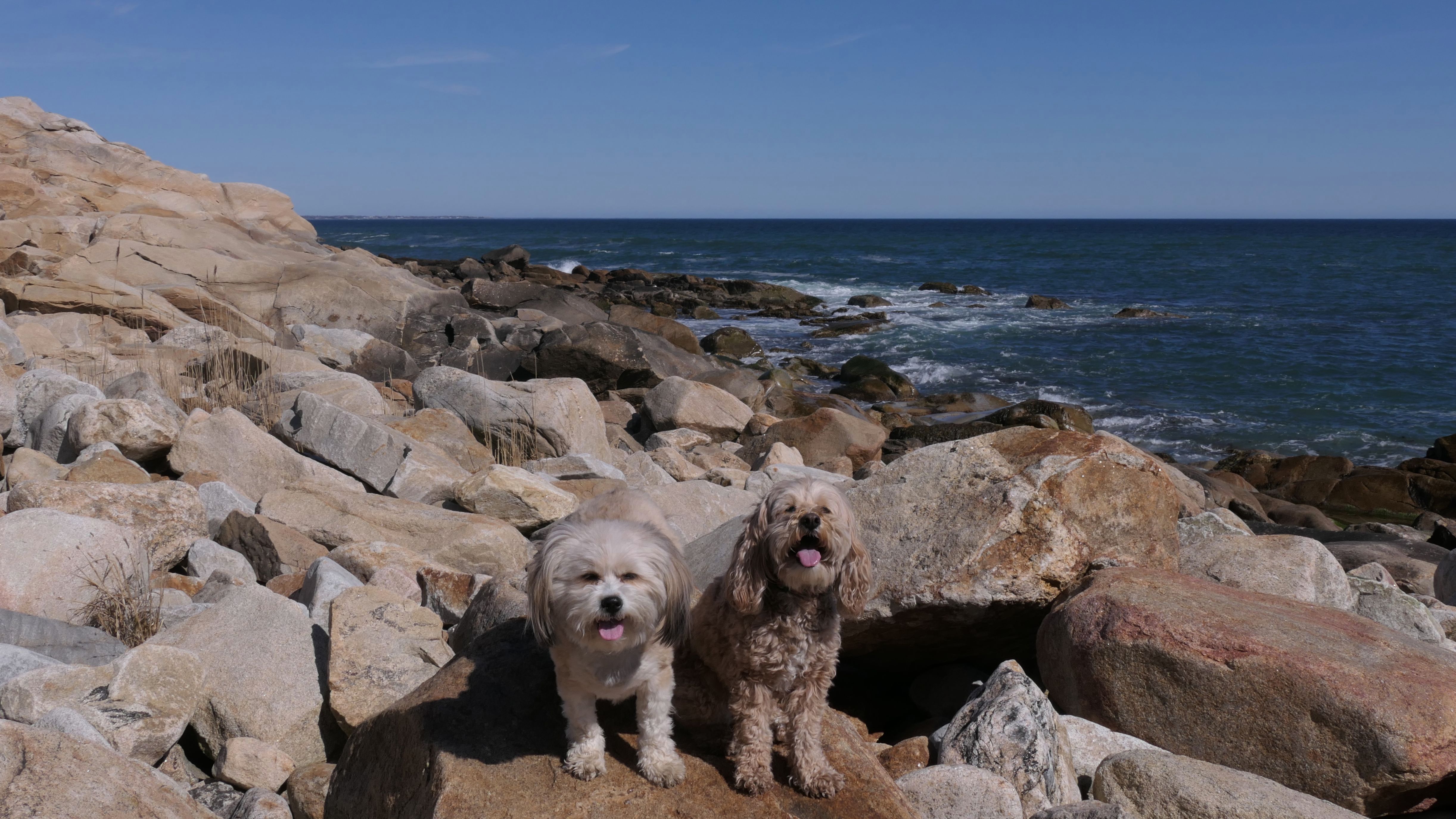 This is the second of the three public waterfront access areas that we visited on this day. Like Bass Rock, it also features a steep trail that leads down to the rocks on the shoreline. The rocks are easier to access here. In addtion to the people fishing, there were also groups of people sun-bathing here, and even another dog! I learned the hard way that despite the rocks looking easier to traverse, they can be slippery. Mandy wanted to go down to the water, and kind of pulled me along and I slipped and landed on my rear! Ultimately I was okay, and we made our way to Hazard Rock later in the day.