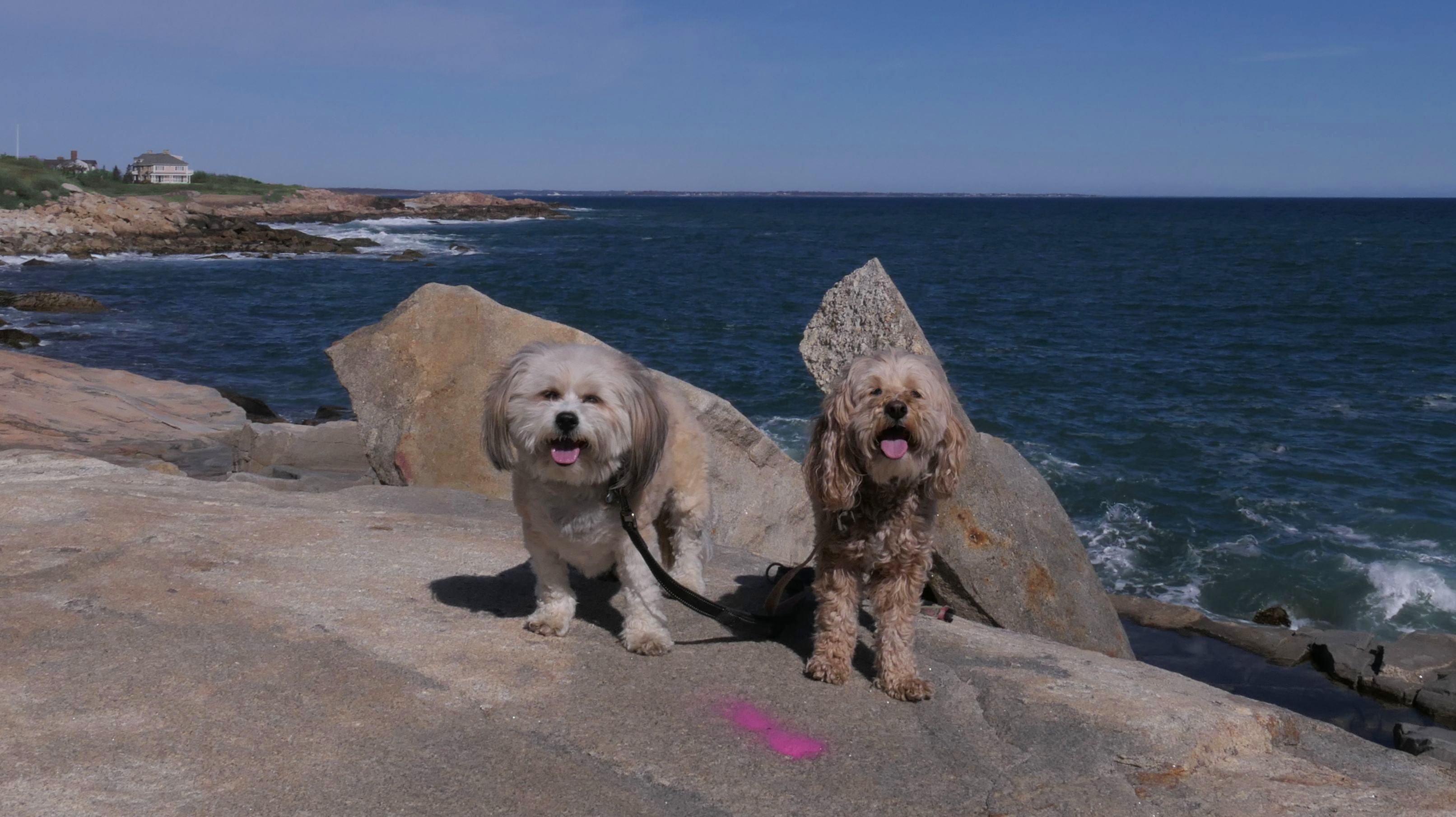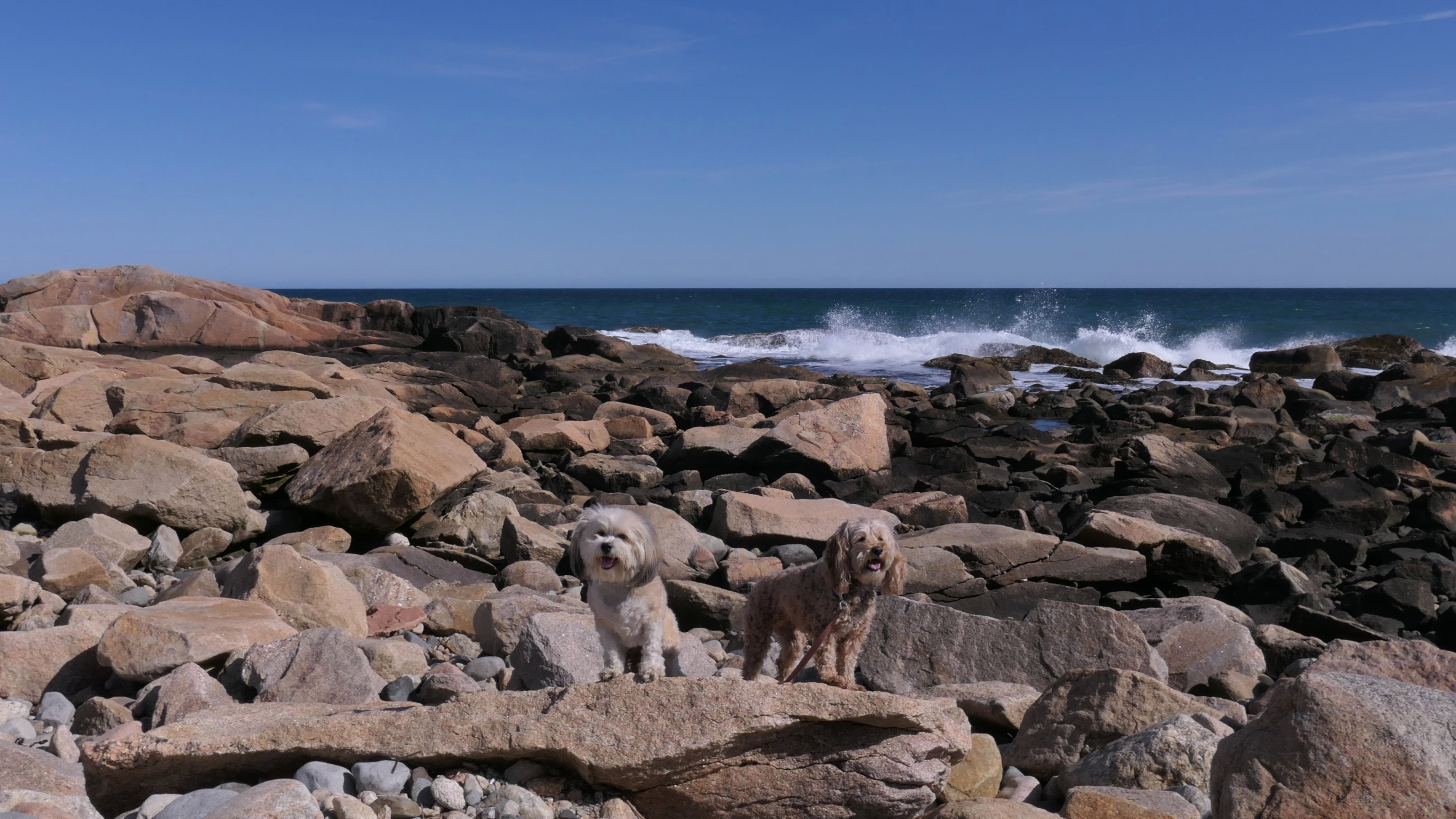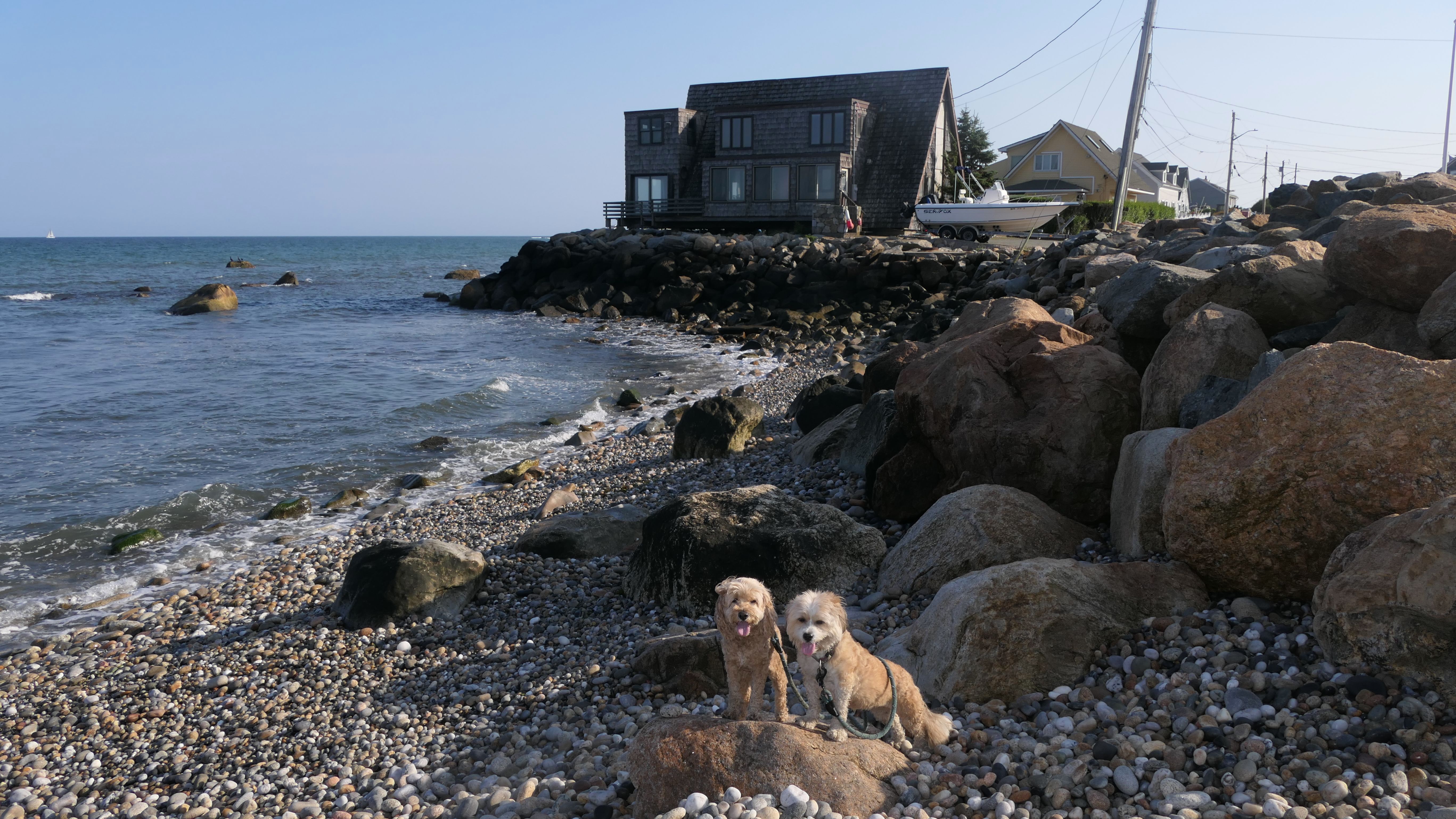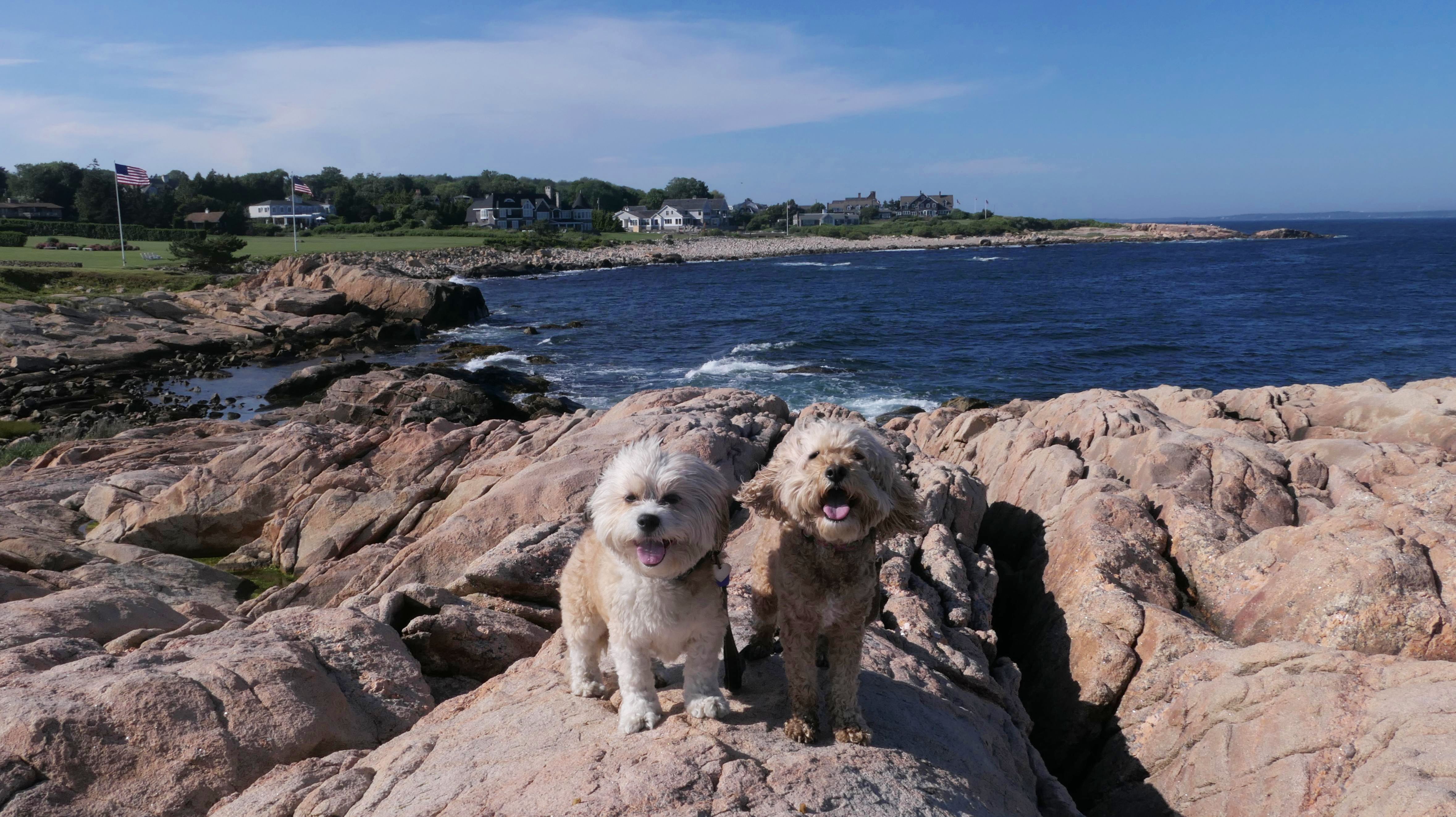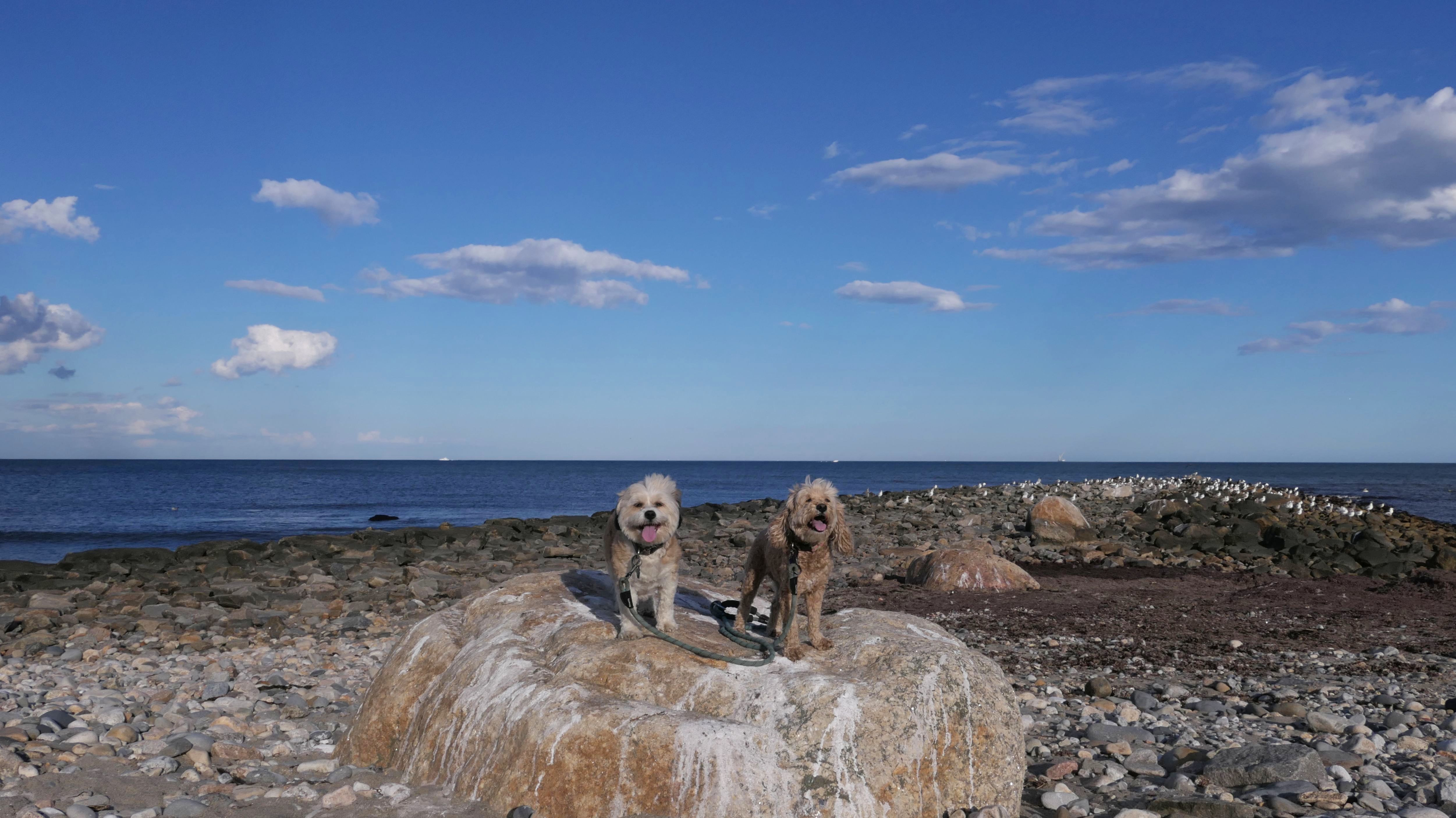This is the second of the three public waterfront access areas that we visited on this day. Like Bass Rock, it also features a steep trail that leads down to the rocks on the shoreline. The rocks are easier to access here. In addtion to the people fishing, there were also groups of people sun-bathing here, and even another dog! I learned the hard way that despite the rocks looking easier to traverse, they can be slippery. Mandy wanted to go down to the water, and kind of pulled me along and I slipped and landed on my rear! Ultimately I was okay, and we made our way to Hazard Rock later in the day.