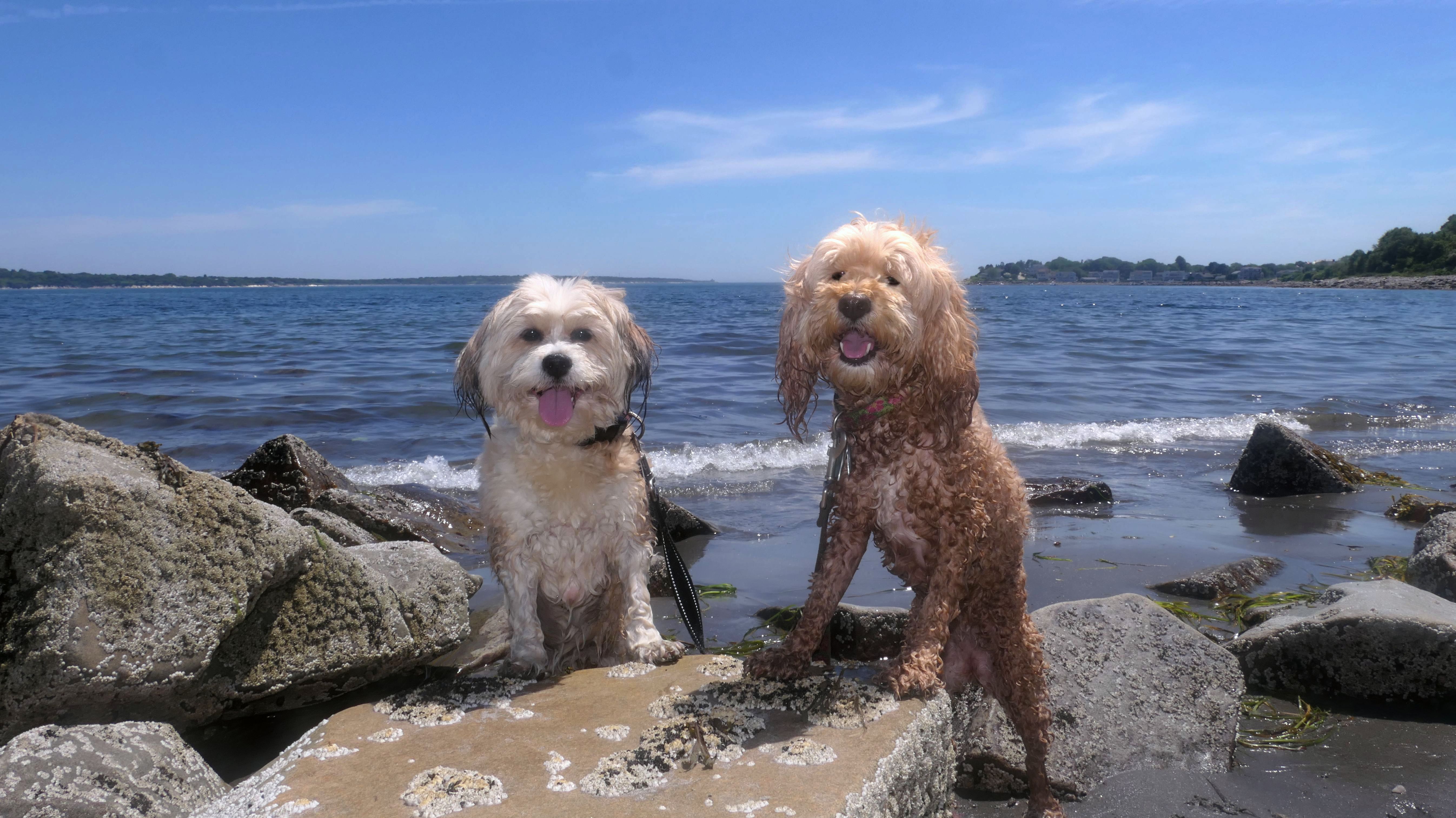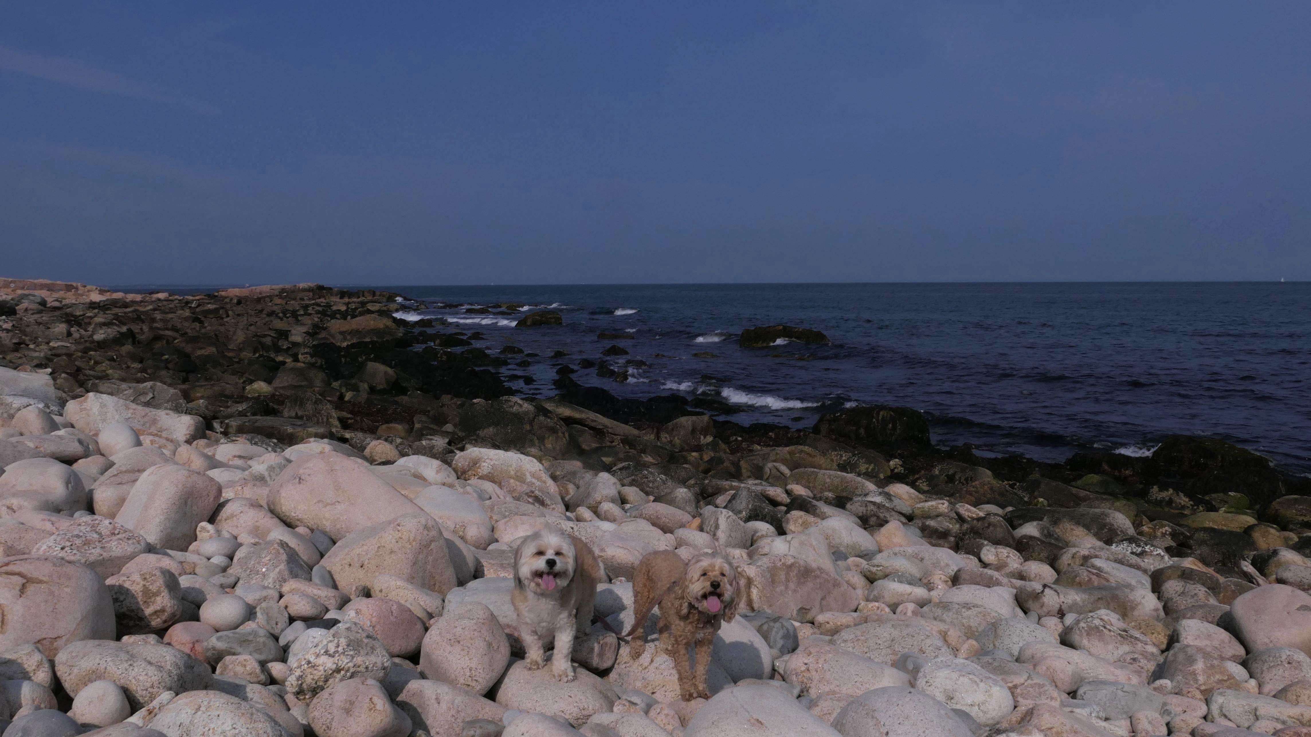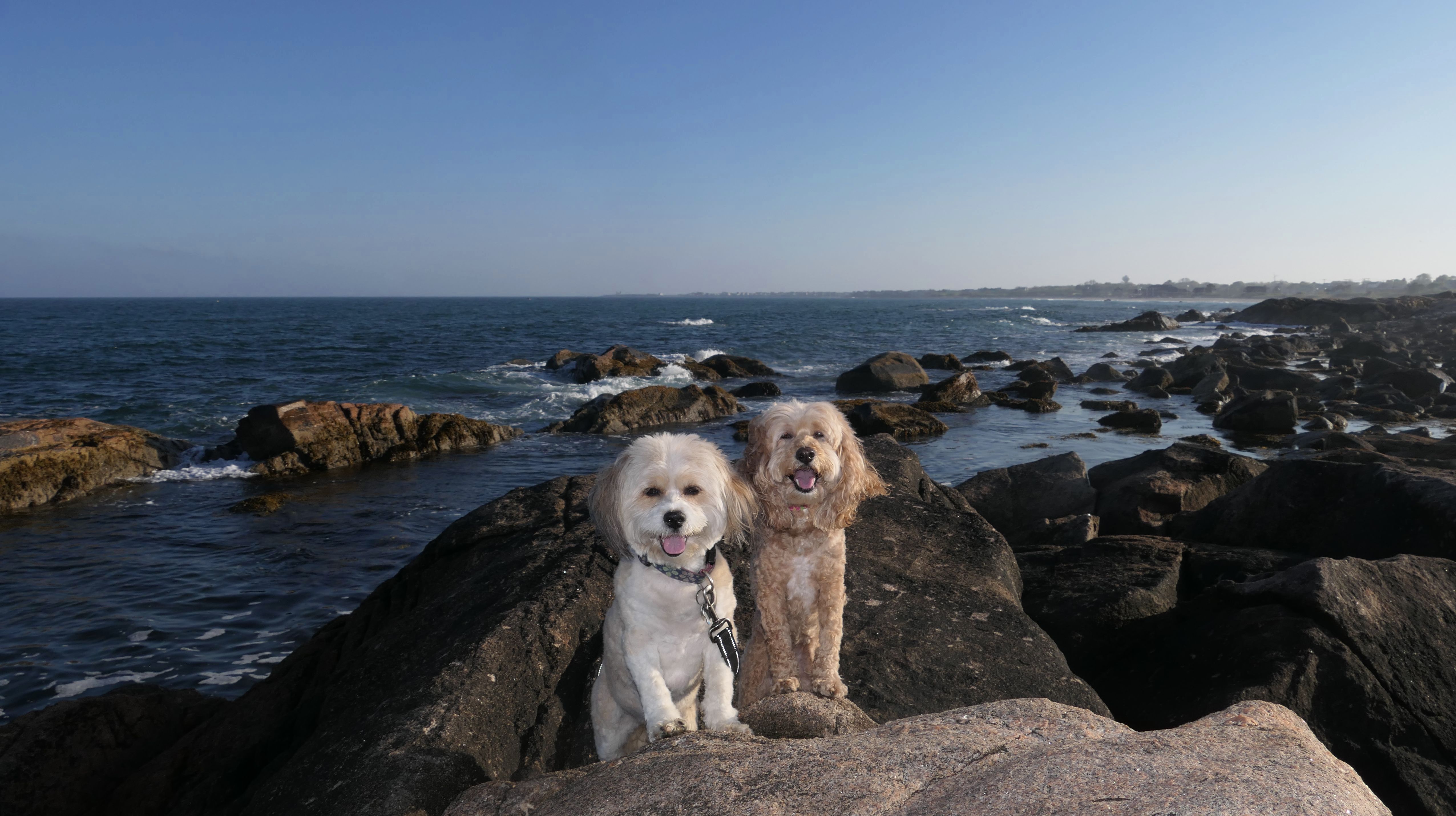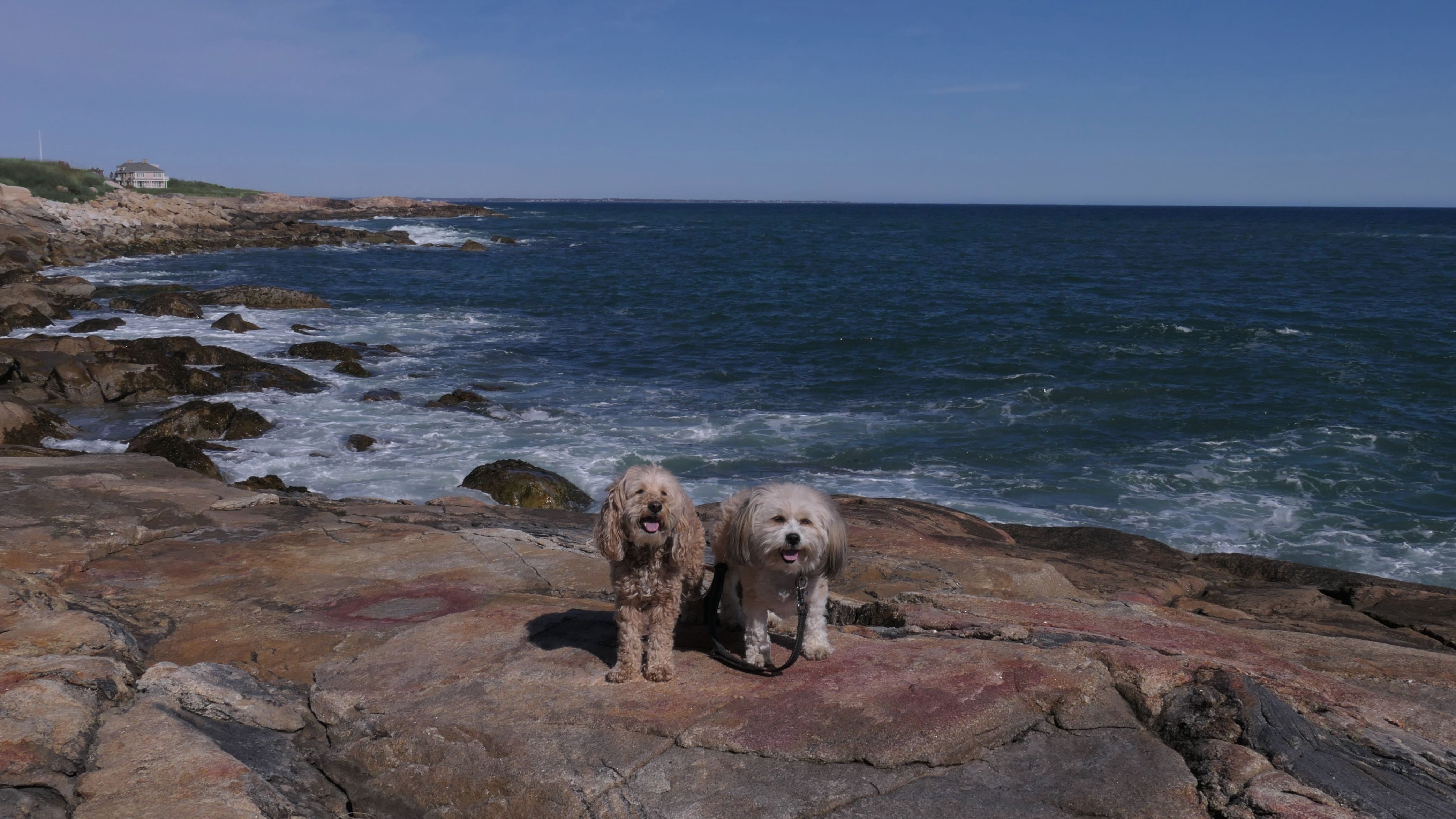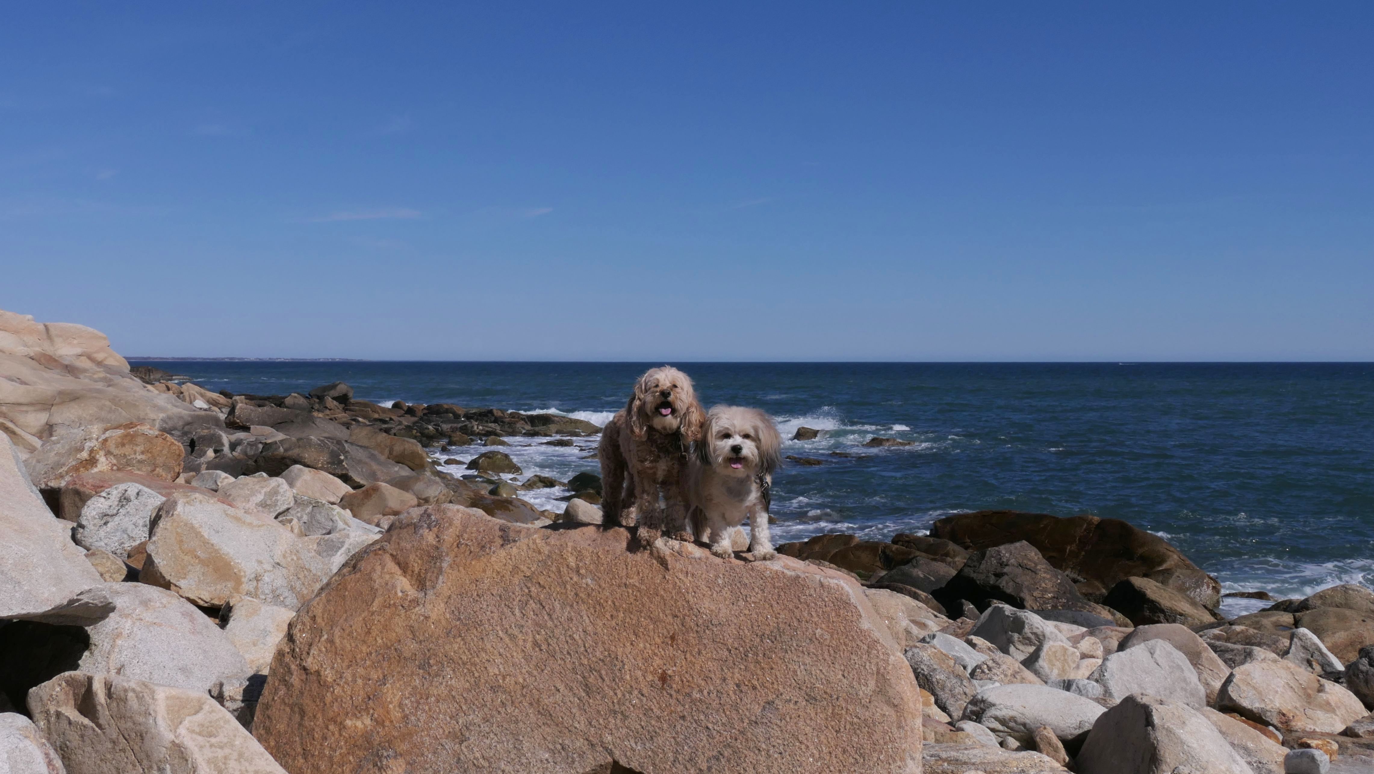 This is the second of the three public waterfront access areas that we visited on this day. Like Bass Rock, it also features a steep trail that leads down to the rocks on the shoreline. The rocks are easier to access here. In addtion to the people fishing, there were also groups of people sun-bathing here, and even another dog! I learned the hard way that despite the rocks looking easier to traverse, they can be slippery. Mandy wanted to go down to the water, and kind of pulled me along and I slipped and landed on my rear! Ultimately I was okay, and we made our way to Hazard Rock later in the day.