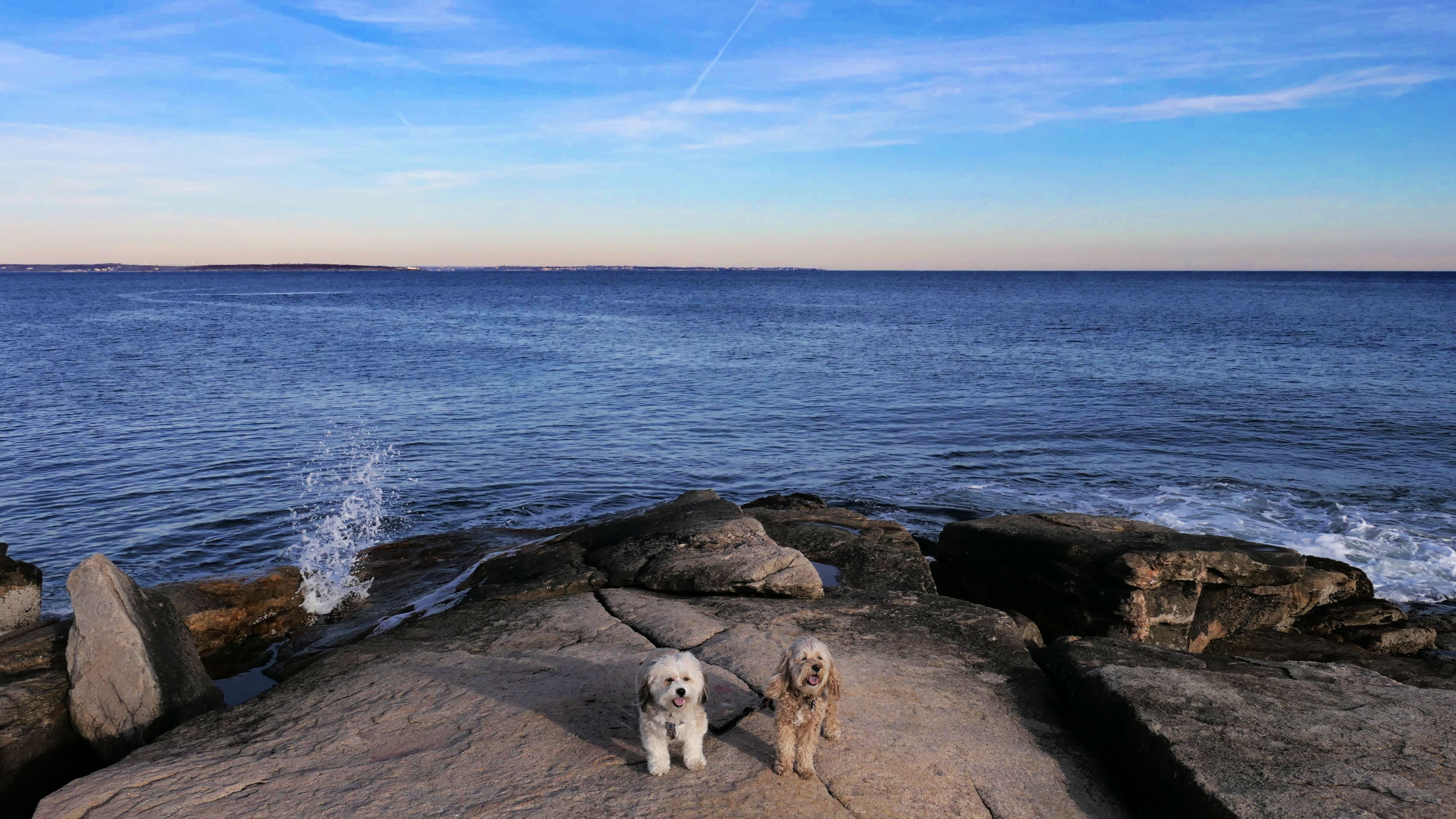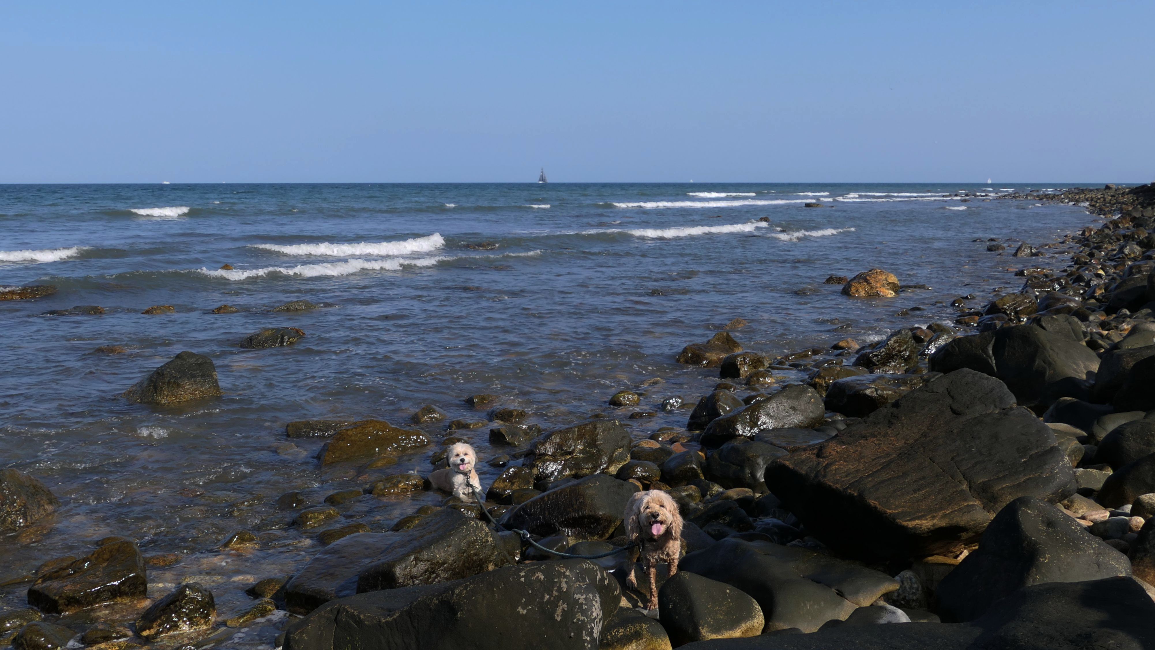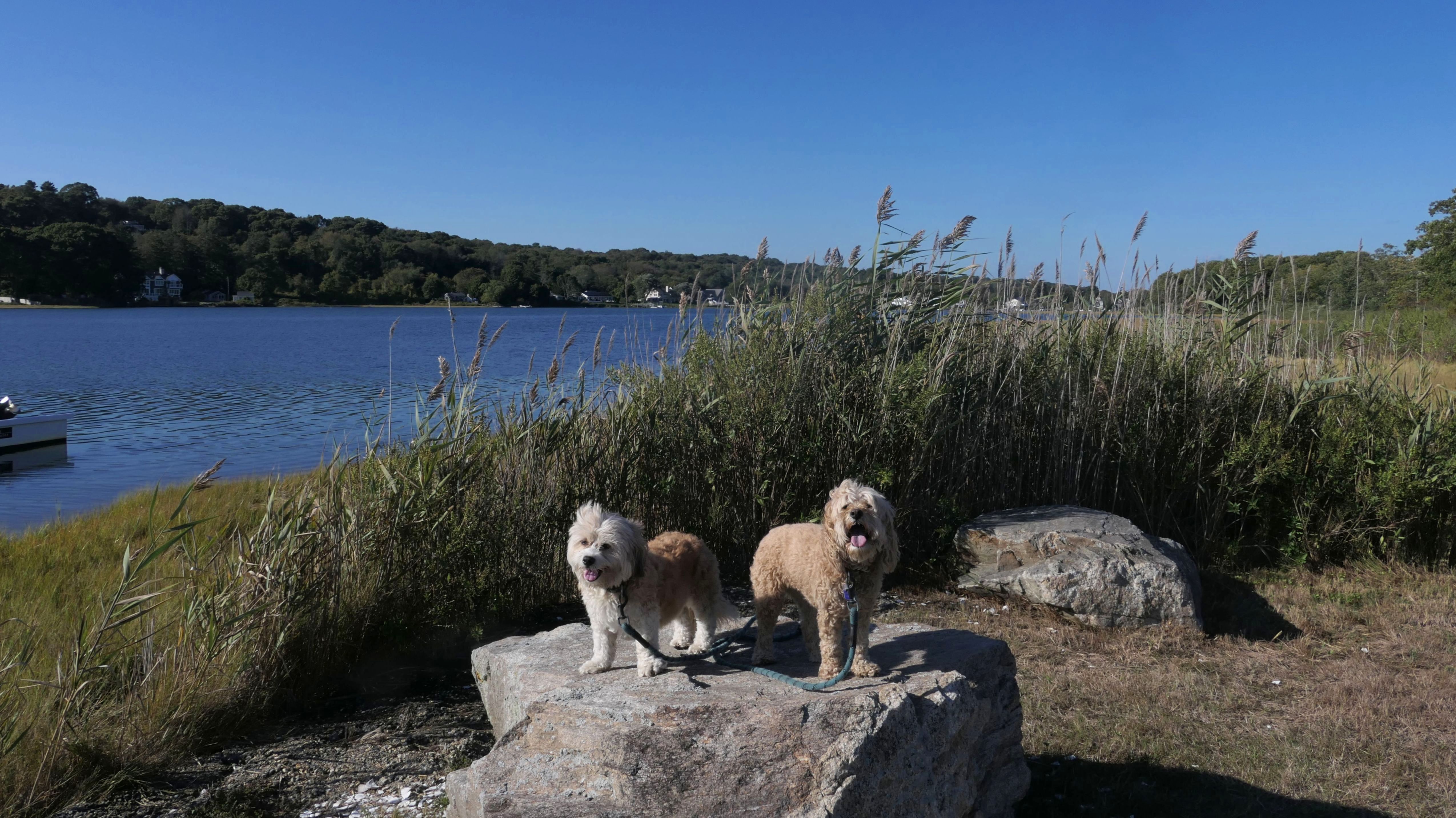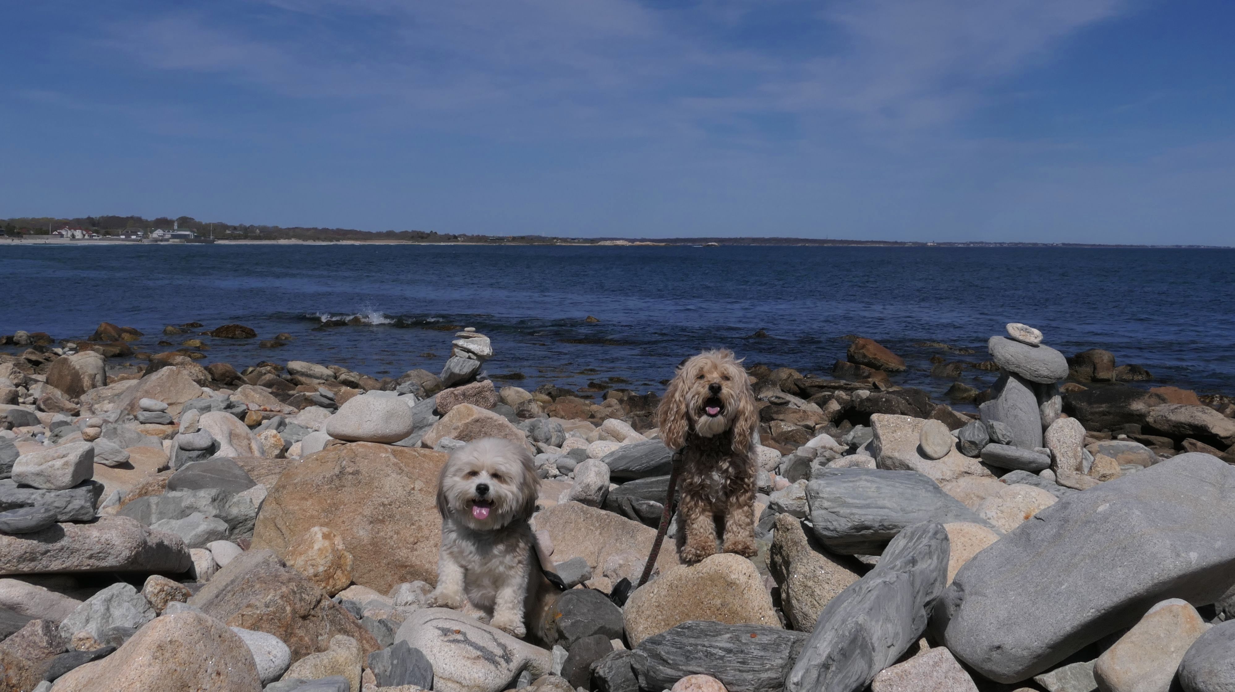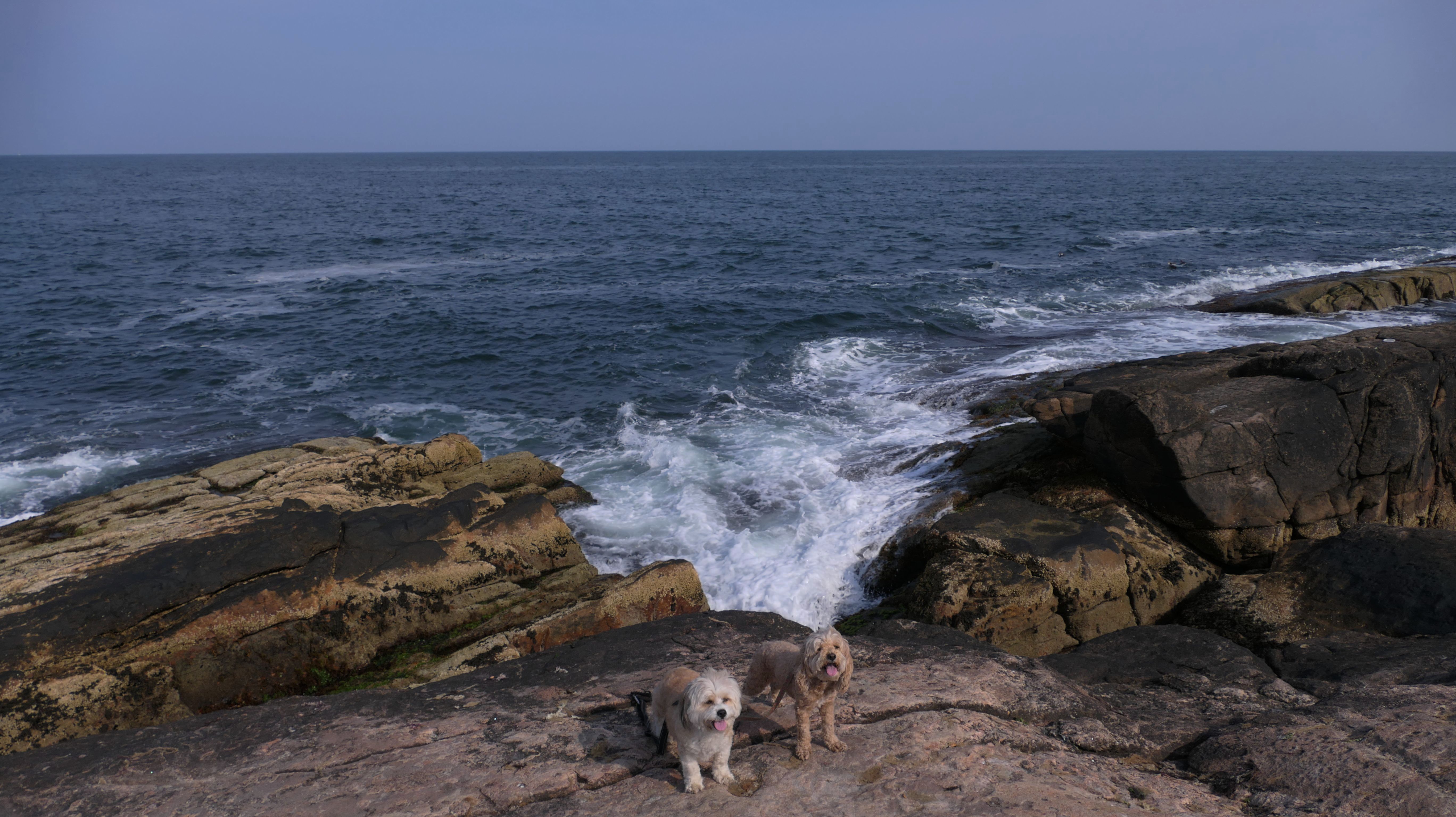 This is the second of the three public waterfront access areas that we visited on this day. Like Bass Rock, it also features a steep trail that leads down to the rocks on the shoreline. The rocks are easier to access here. In addtion to the people fishing, there were also groups of people sun-bathing here, and even another dog! I learned the hard way that despite the rocks looking easier to traverse, they can be slippery. Mandy wanted to go down to the water, and kind of pulled me along and I slipped and landed on my rear! Ultimately I was okay, and we made our way to Hazard Rock later in the day.