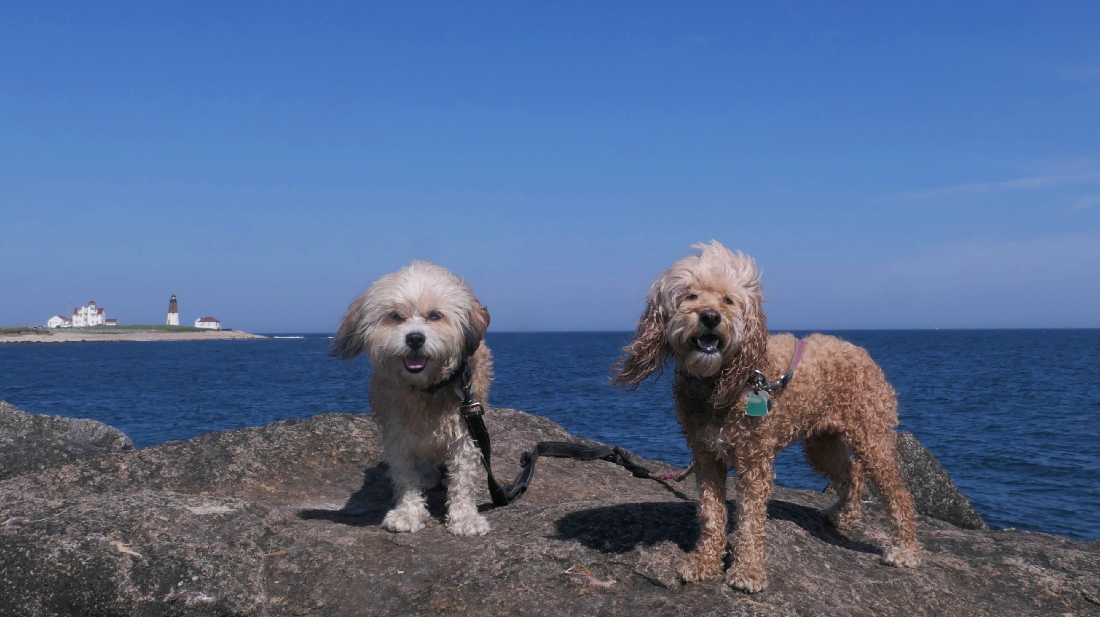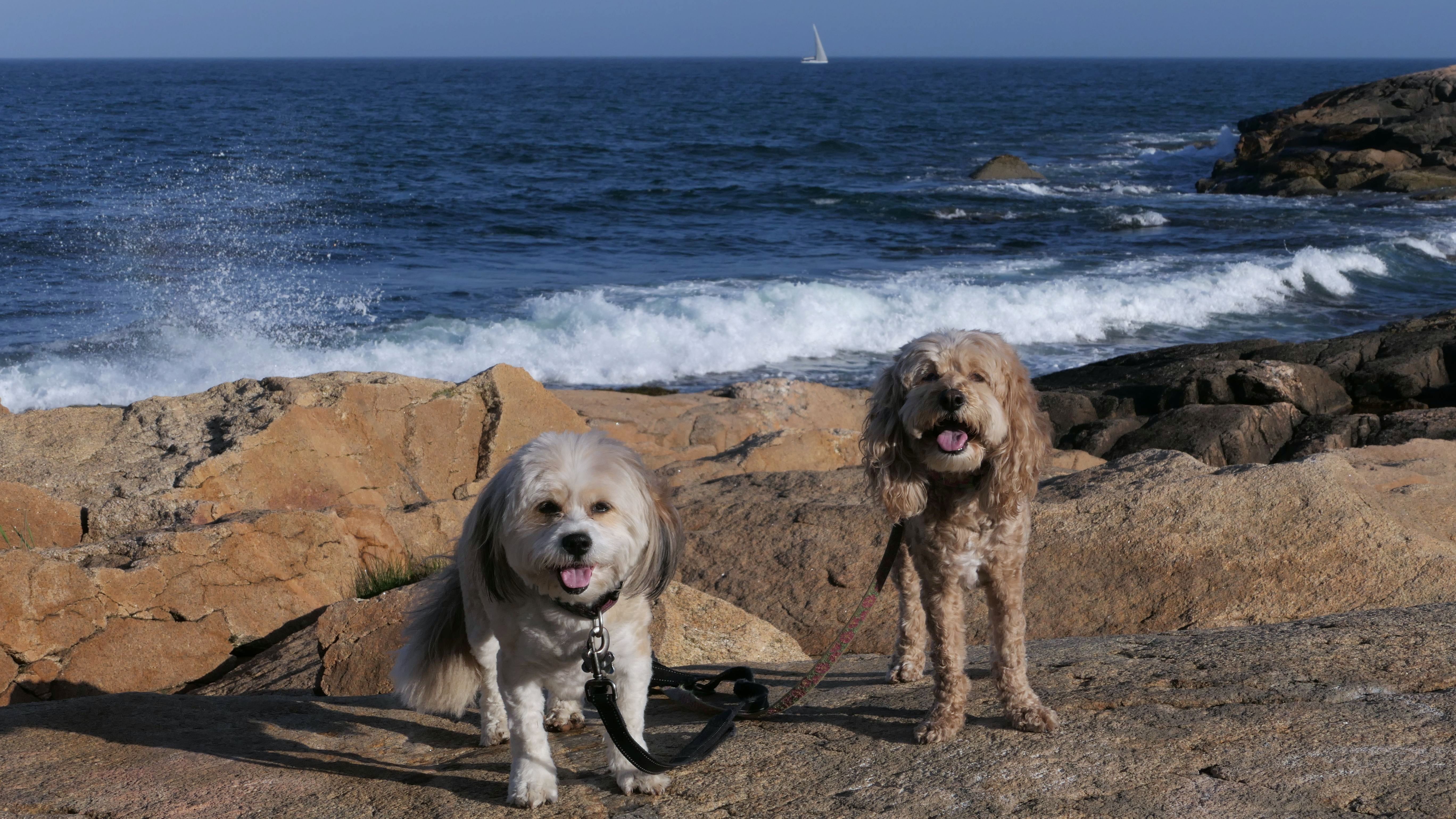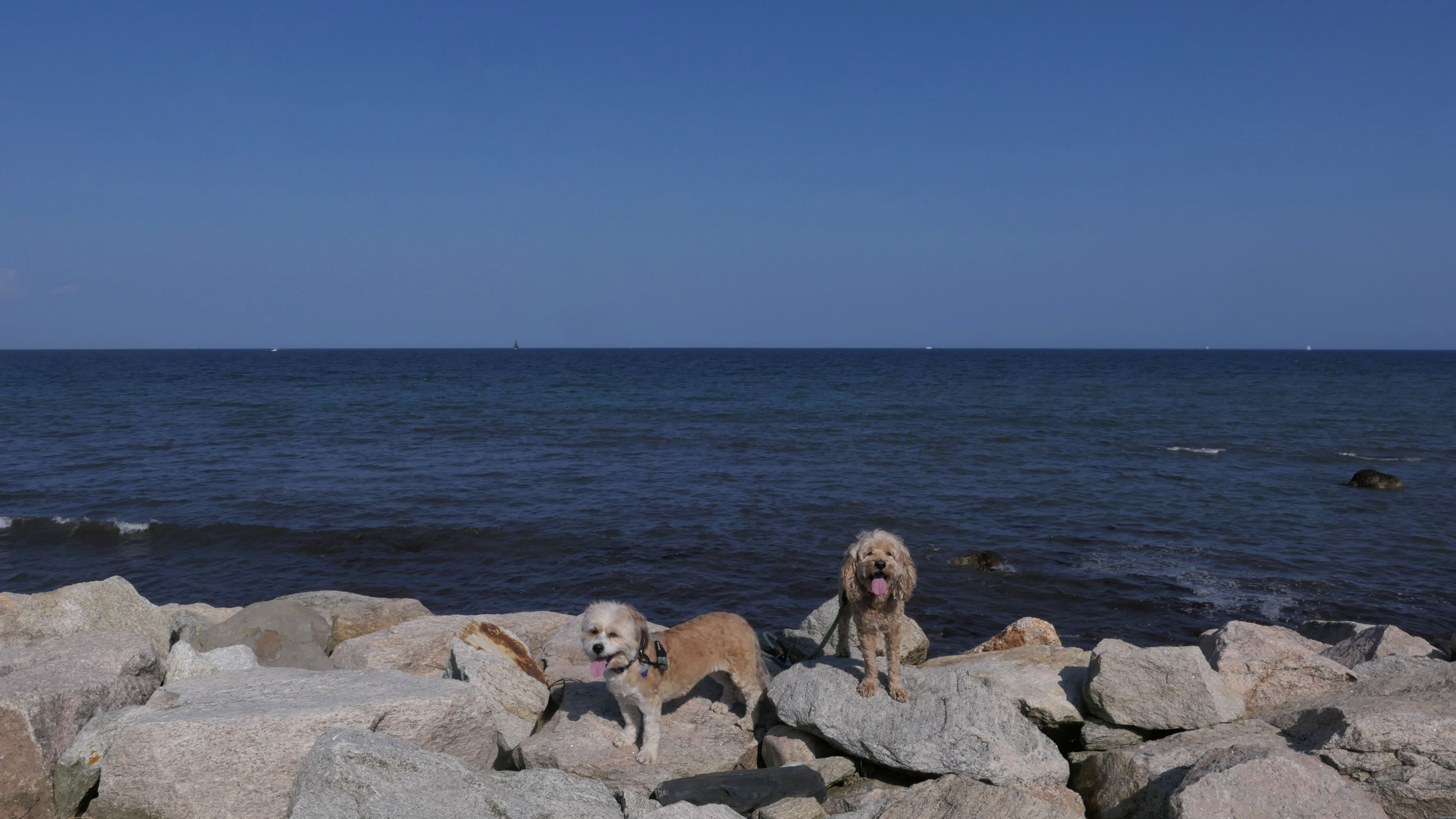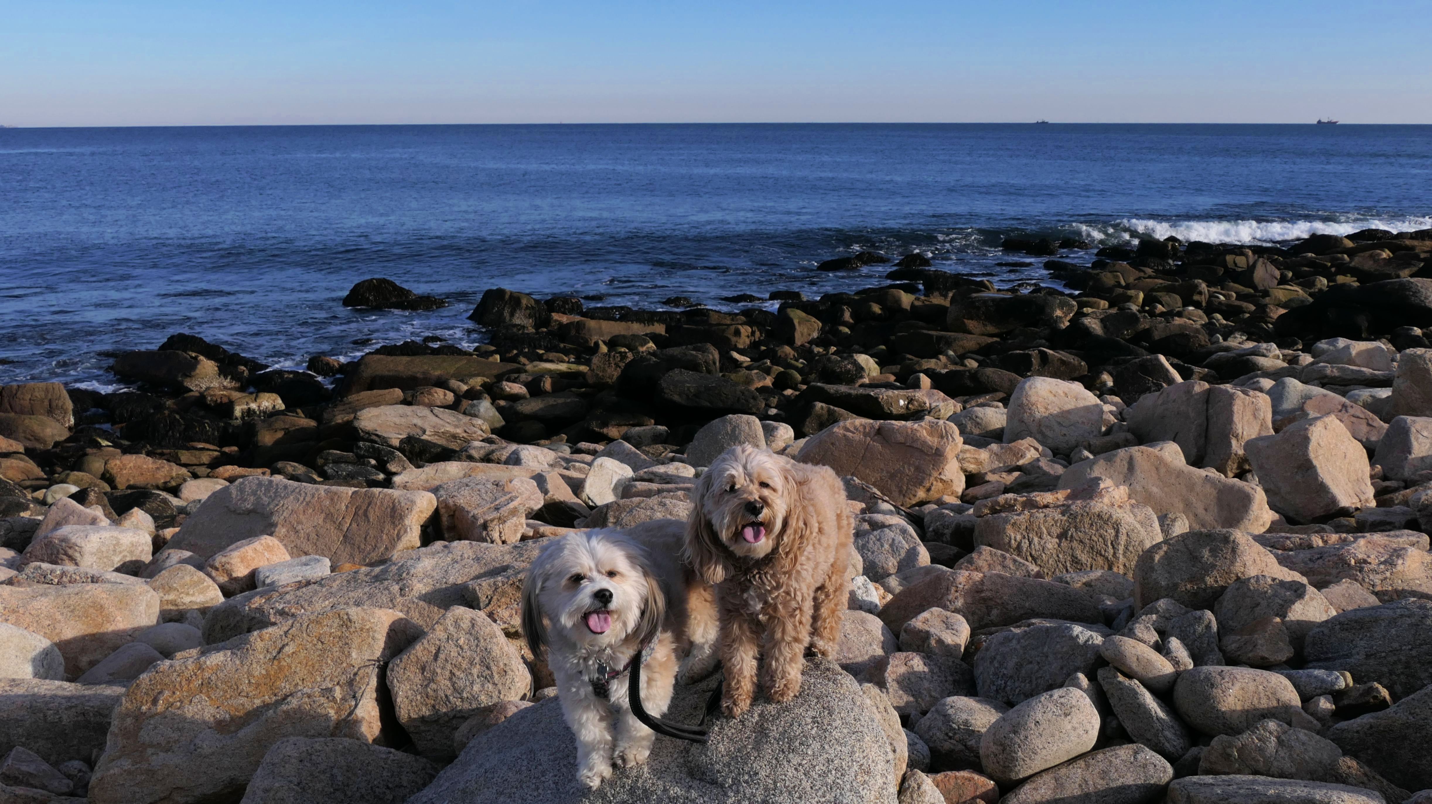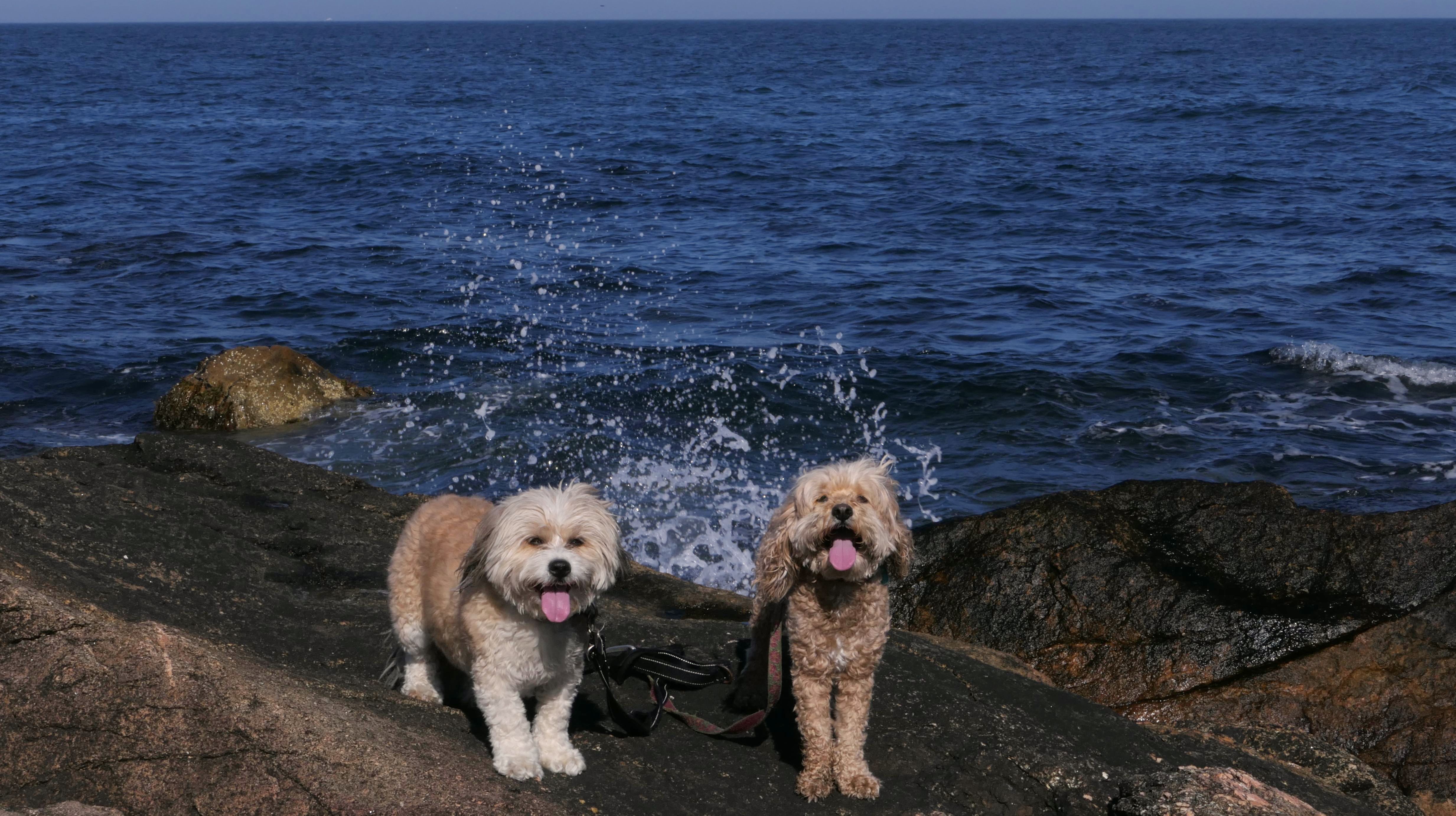 This is the second of the three public waterfront access areas that we visited on this day. Like Bass Rock, it also features a steep trail that leads down to the rocks on the shoreline. The rocks are easier to access here. In addtion to the people fishing, there were also groups of people sun-bathing here, and even another dog! I learned the hard way that despite the rocks looking easier to traverse, they can be slippery. Mandy wanted to go down to the water, and kind of pulled me along and I slipped and landed on my rear! Ultimately I was okay, and we made our way to Hazard Rock later in the day.