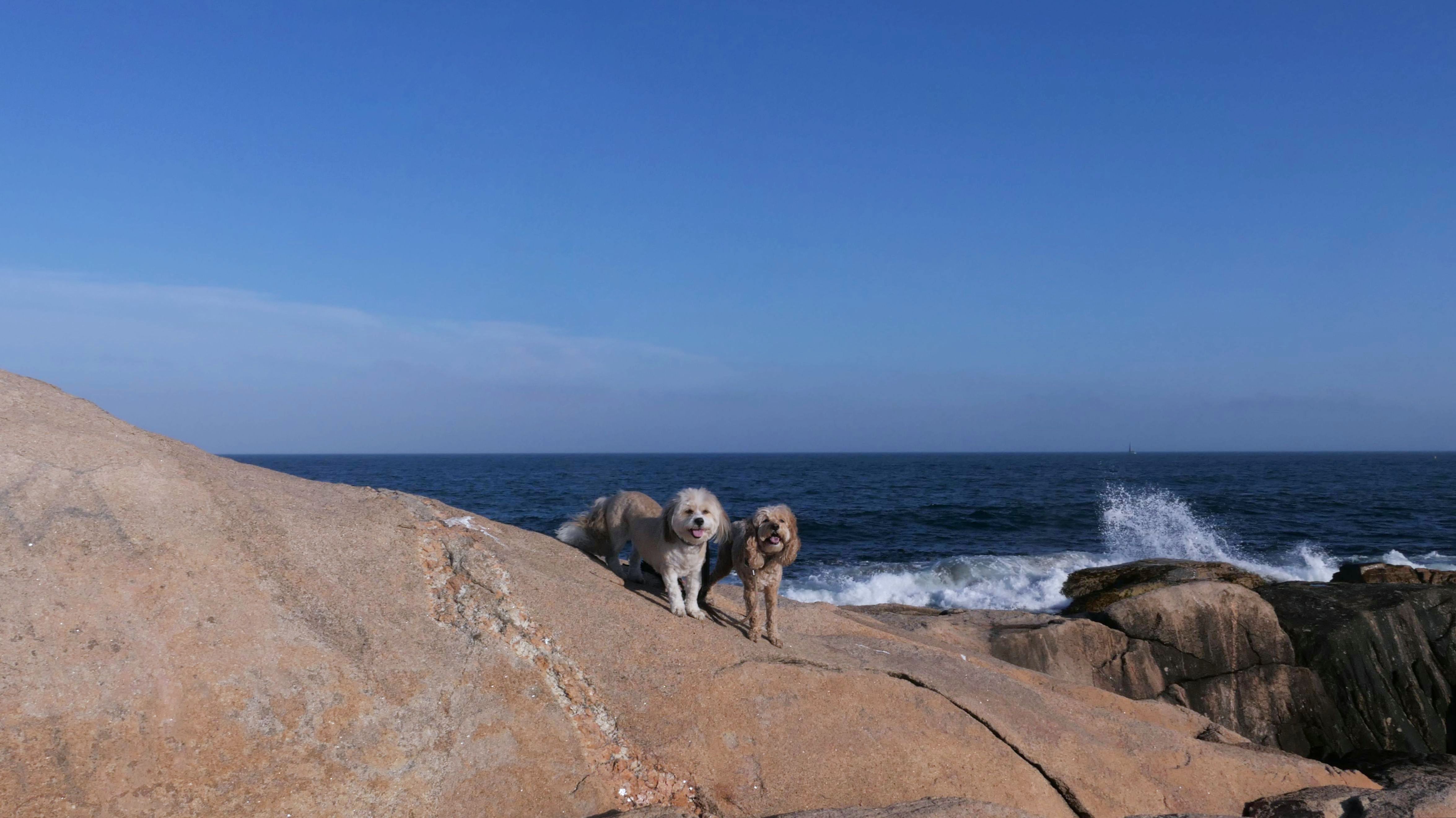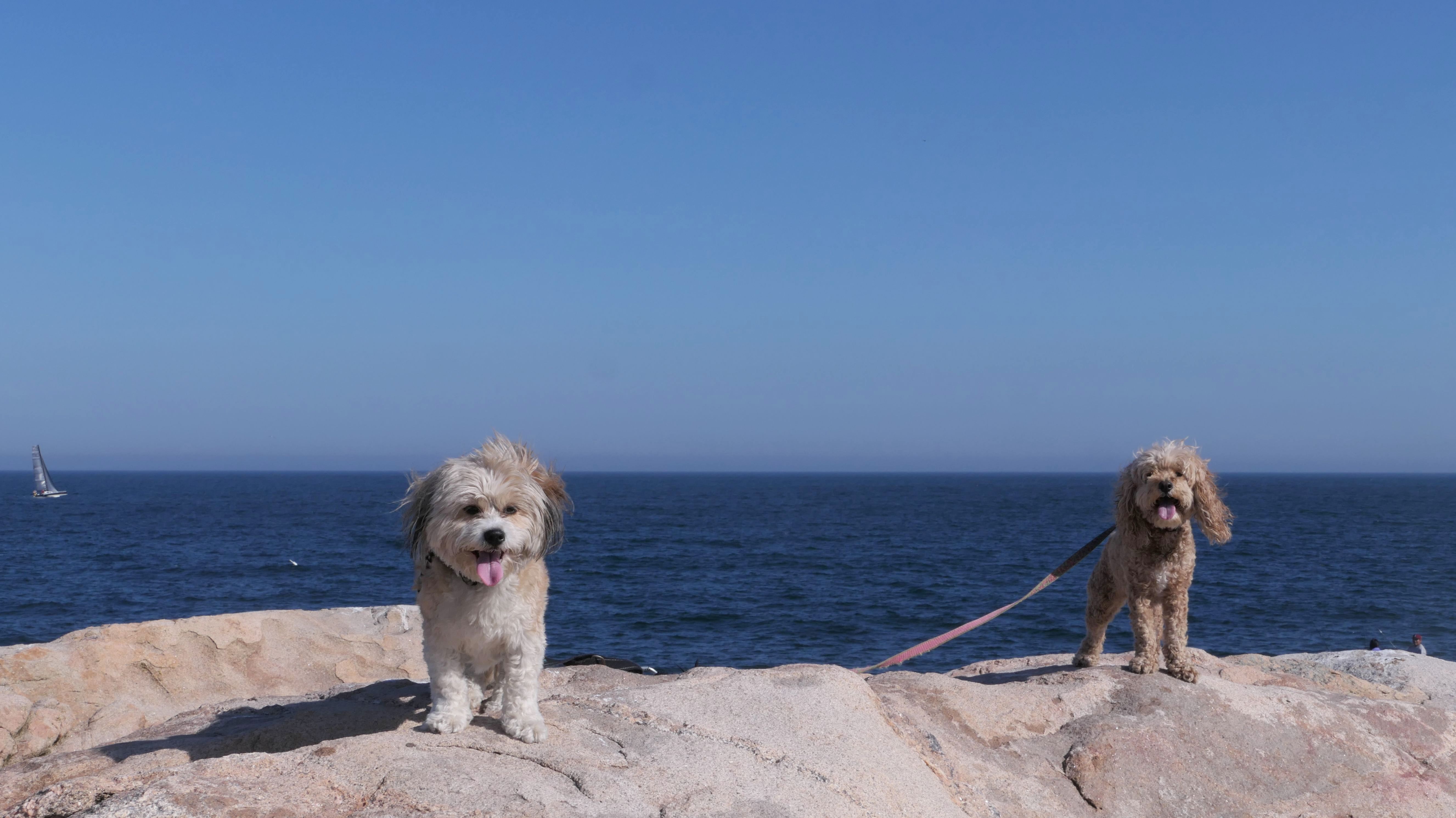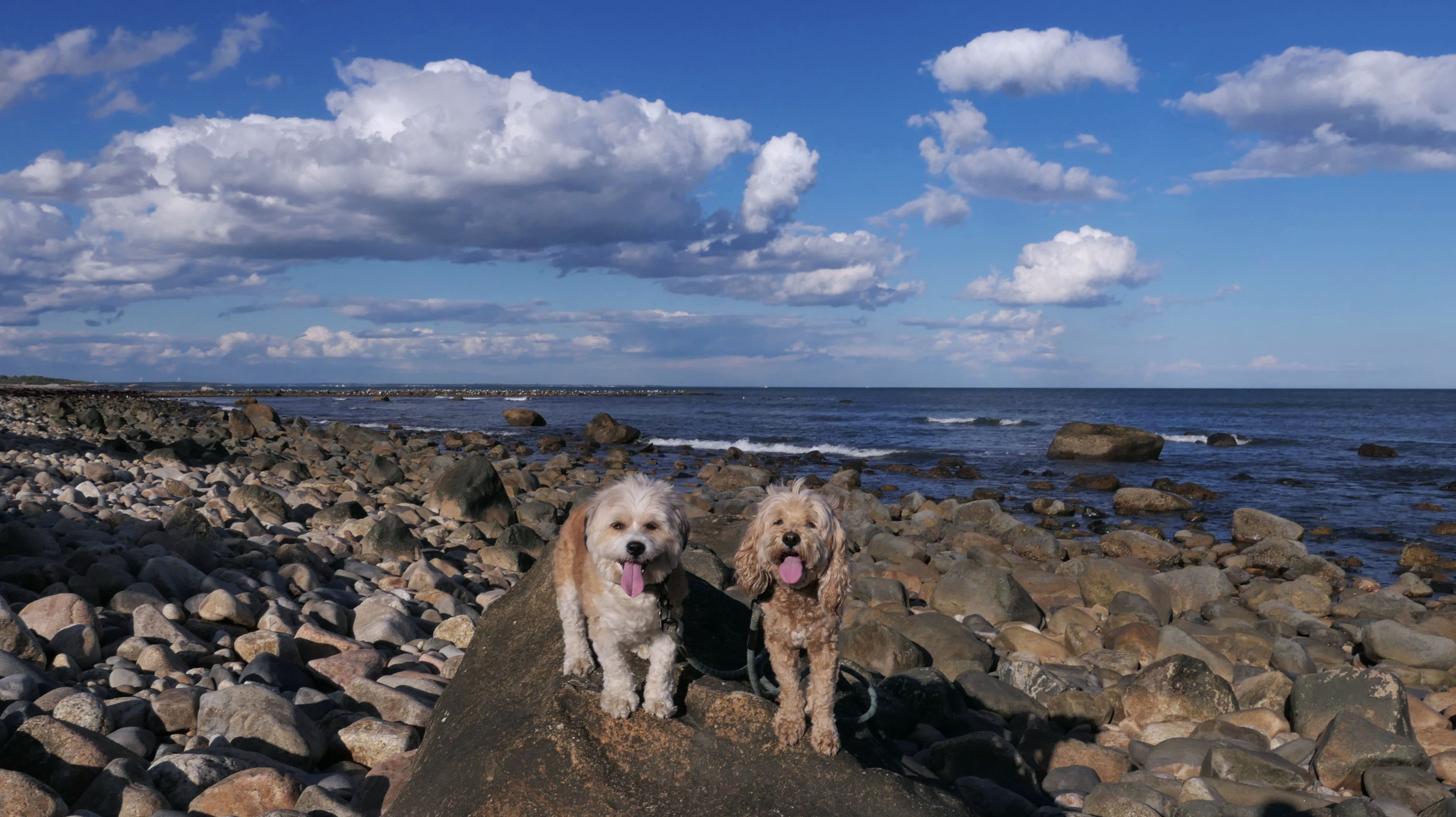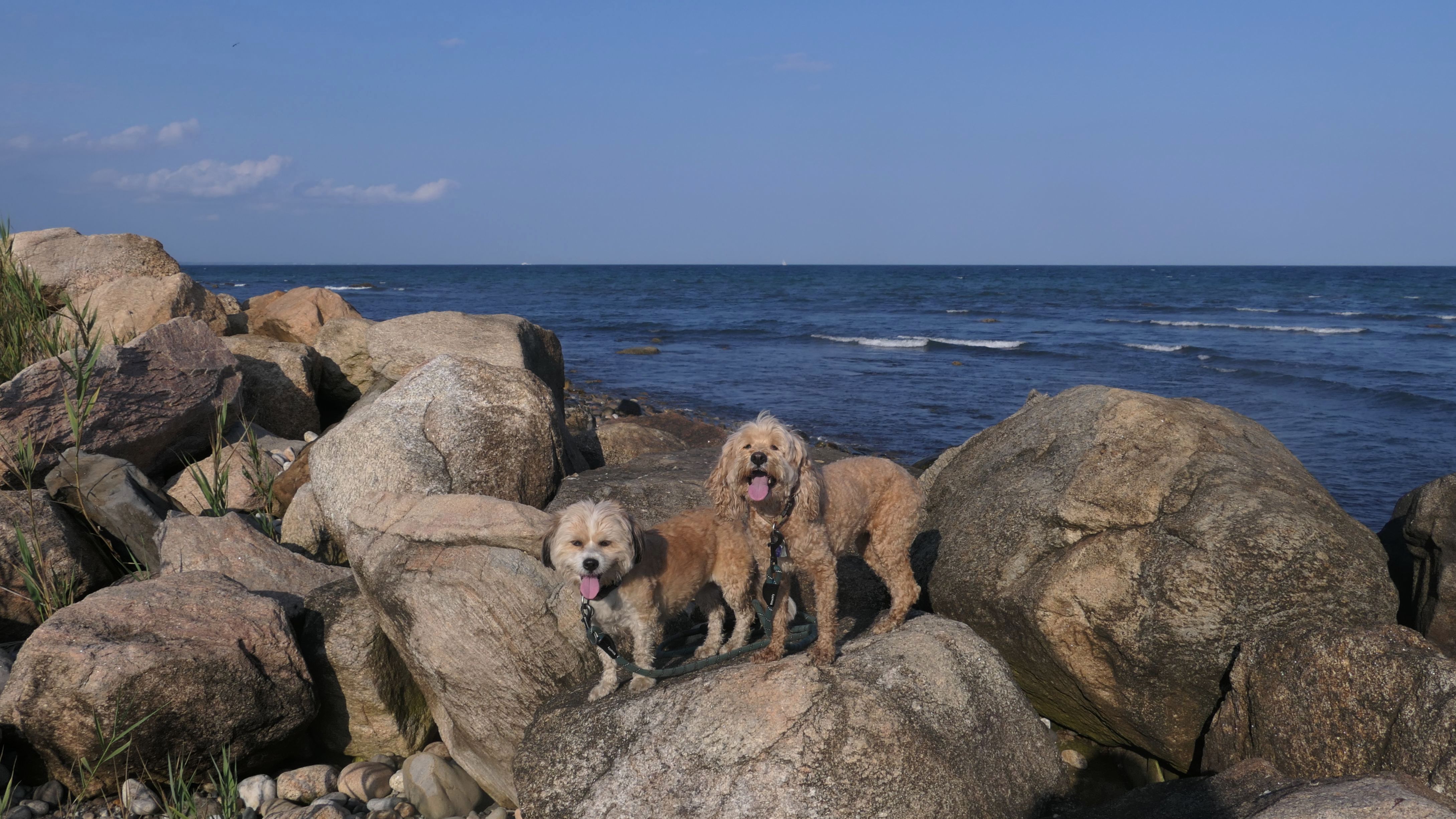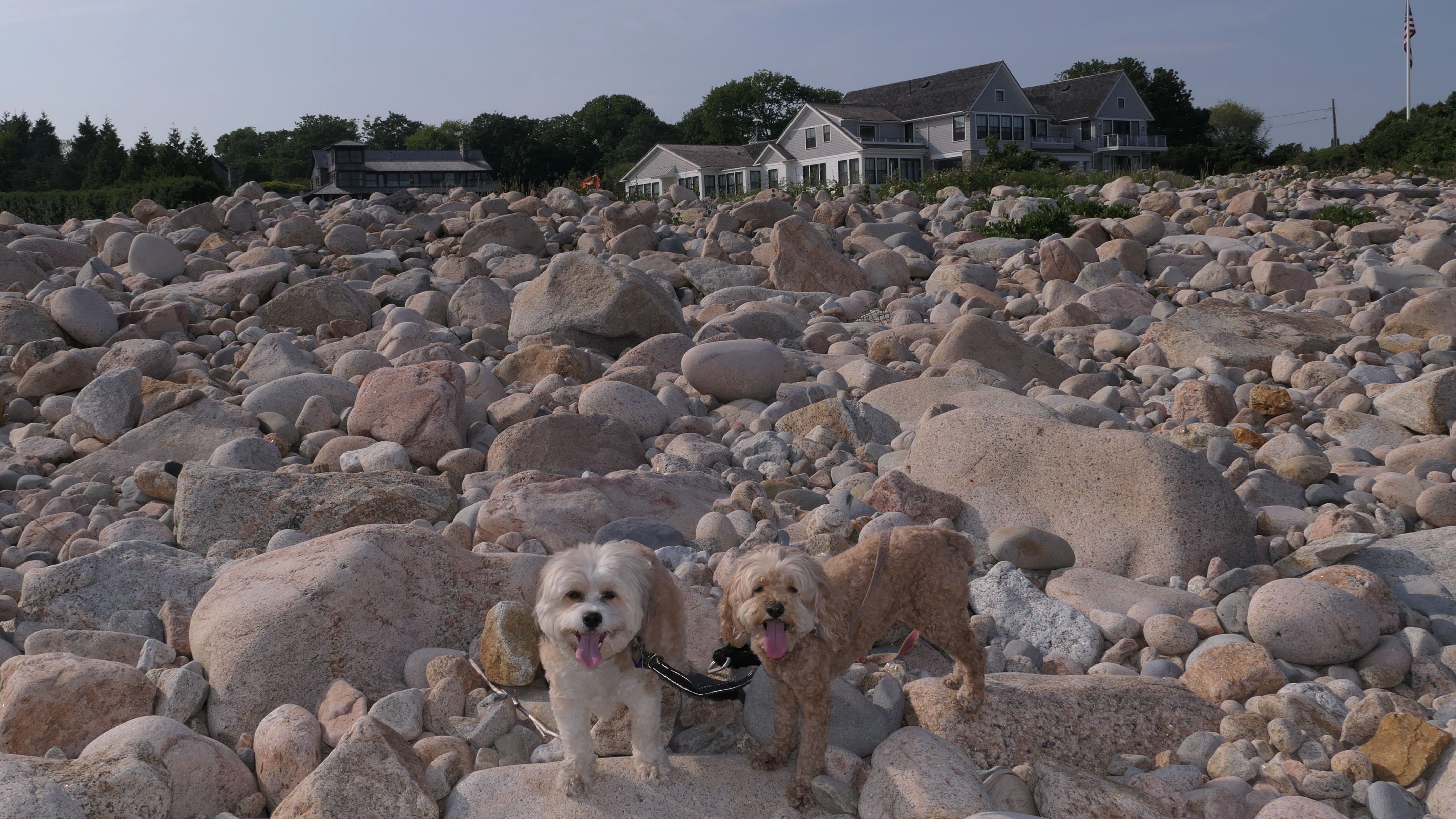 This is the second of the three public waterfront access areas that we visited on this day. Like Bass Rock, it also features a steep trail that leads down to the rocks on the shoreline. The rocks are easier to access here. In addtion to the people fishing, there were also groups of people sun-bathing here, and even another dog! I learned the hard way that despite the rocks looking easier to traverse, they can be slippery. Mandy wanted to go down to the water, and kind of pulled me along and I slipped and landed on my rear! Ultimately I was okay, and we made our way to Hazard Rock later in the day.