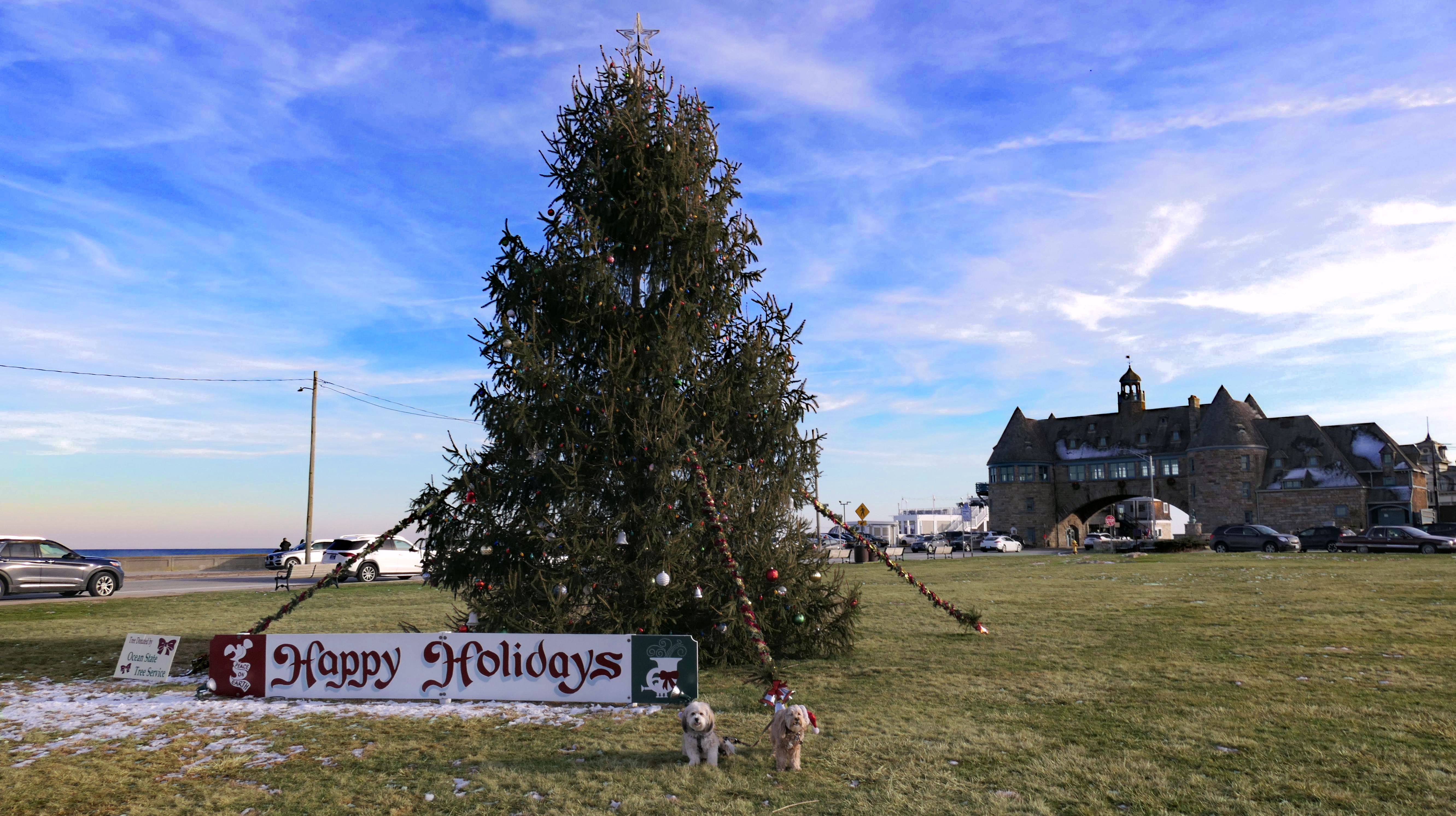 After climbing on the rocks at Ocean Road Shoreline Access, near the state pier, we utilized the Seawall Walk to reach this area. We took pictures at the Narragansett Christmas Tree, on display near the gazebo.
