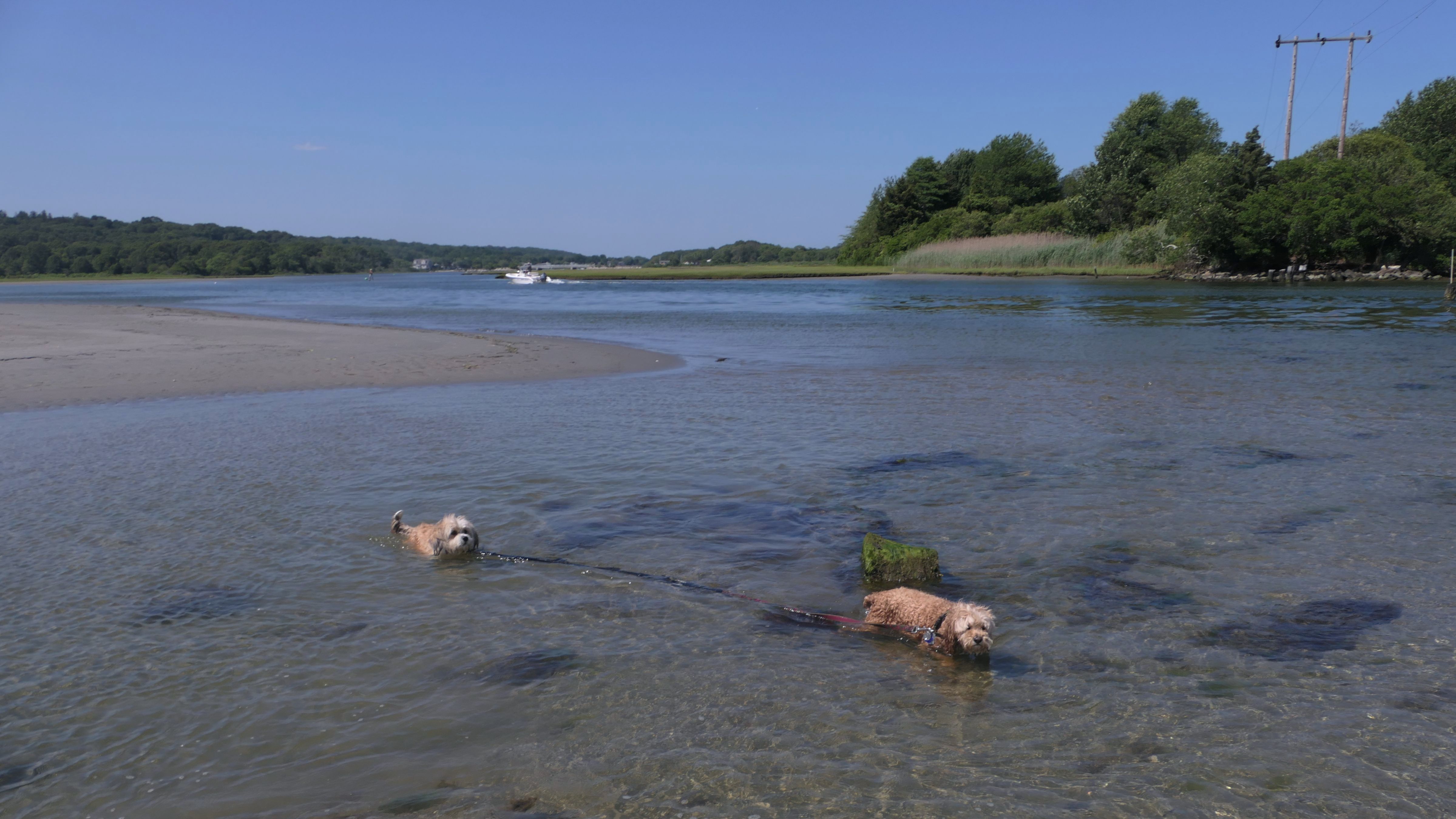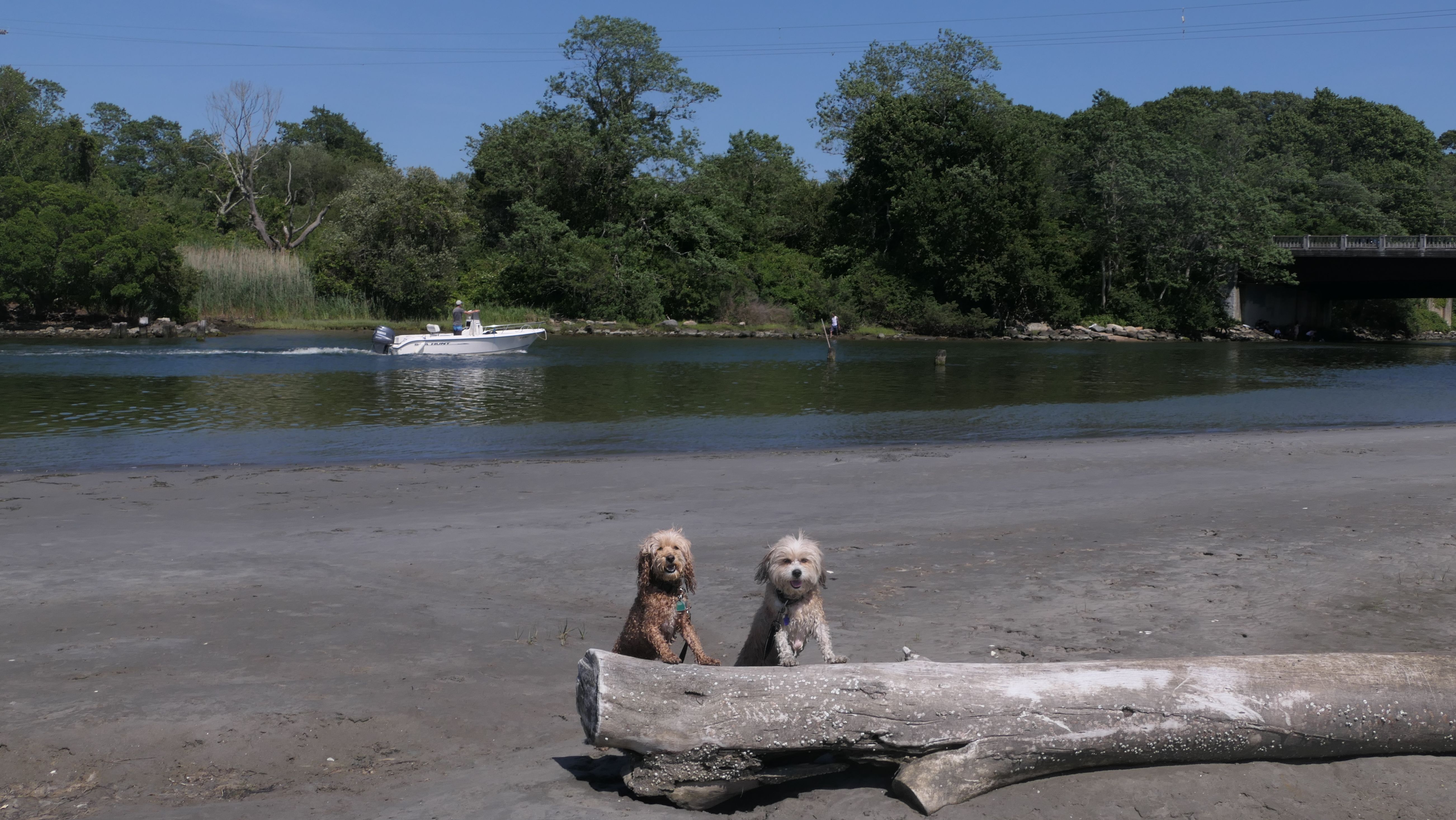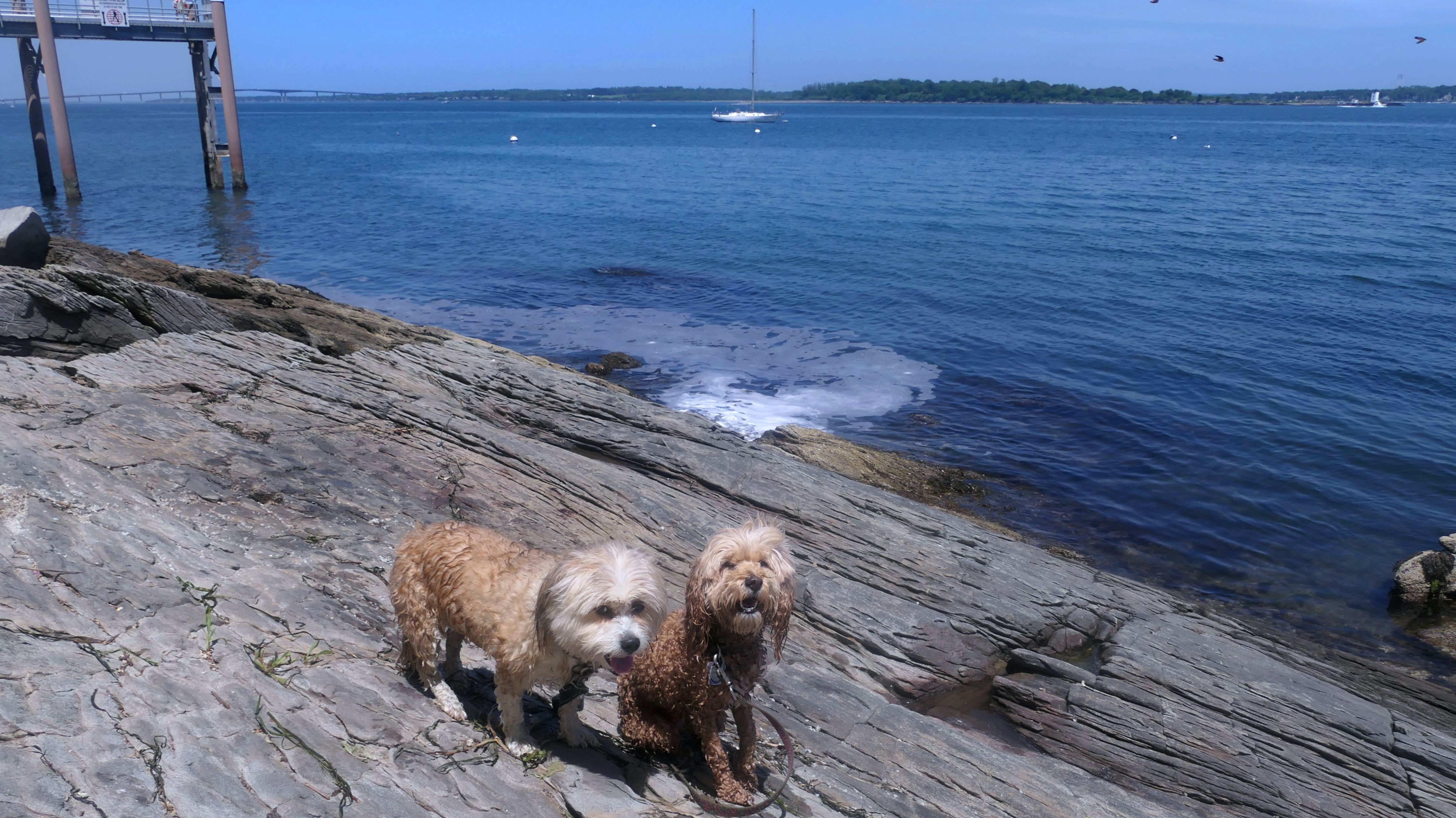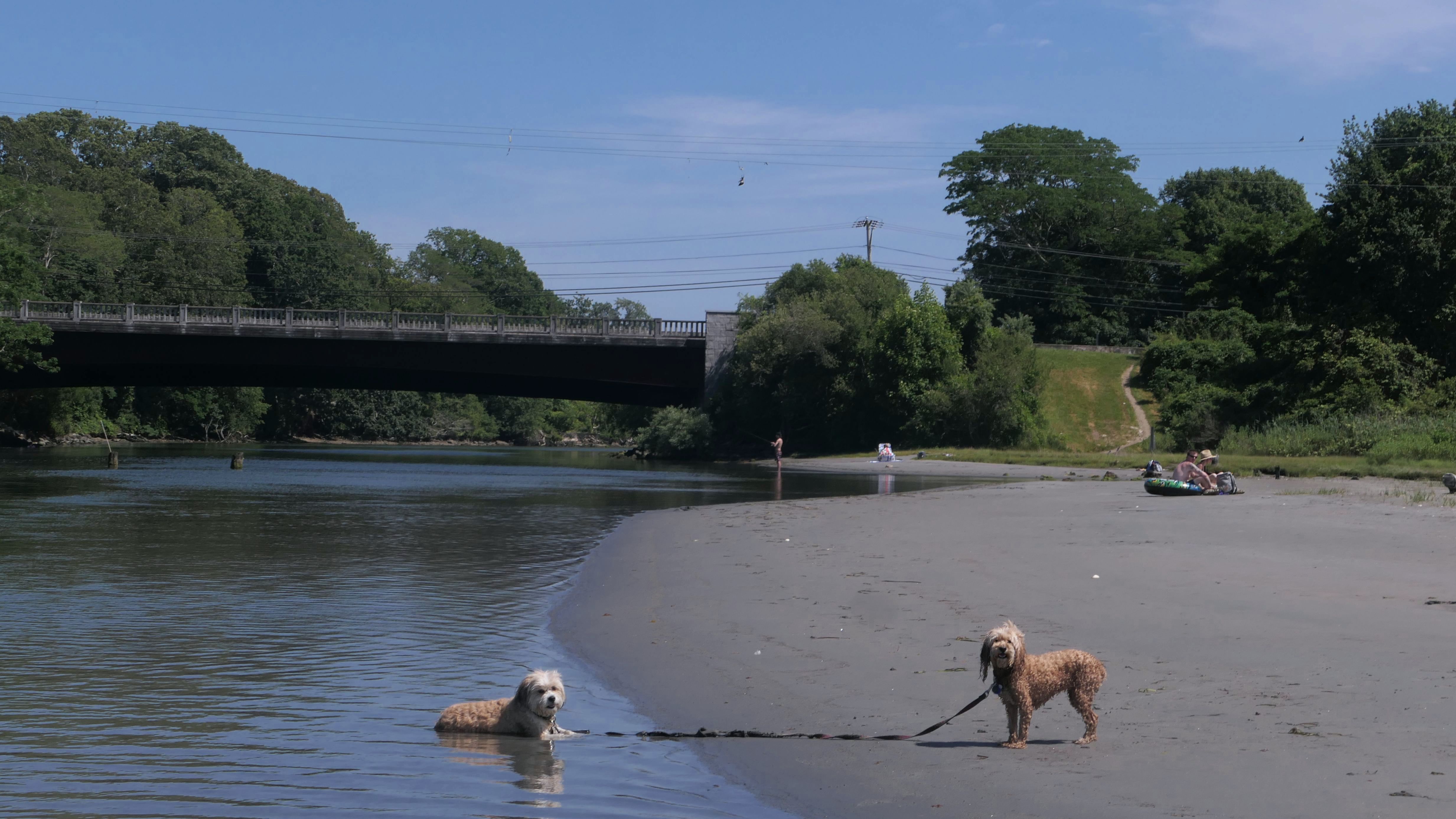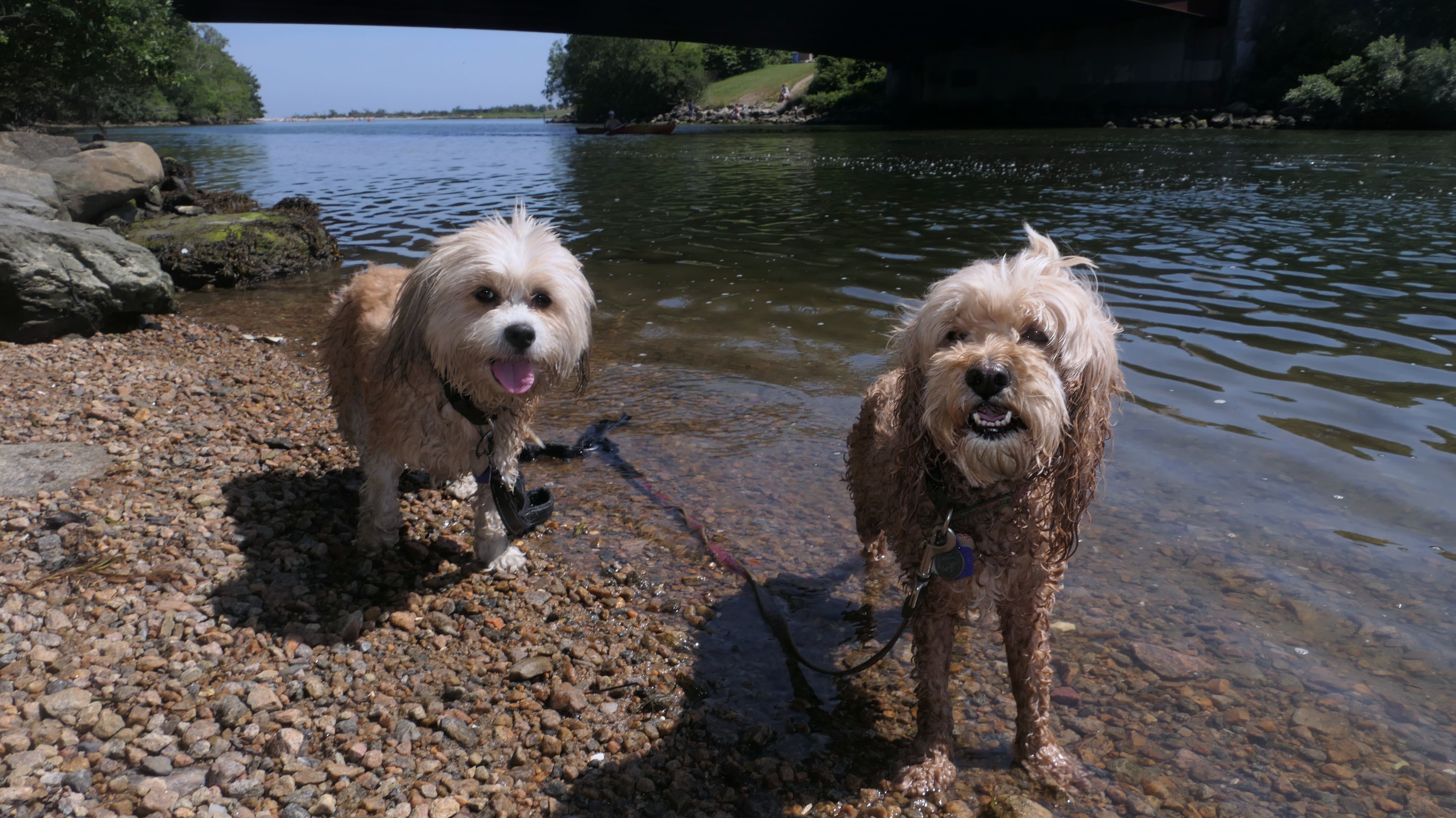 This was Day 3 of the late June heat wave. Record temps were recorded throughout the region, with many areas topping 100 degrees. Even the Rhode Island shore was well over 90. It was far too hot to go on any long hikes, so we went to a number of different places where the dogs could spend as much time in the water as they wanted to cool off. We went to Dog Beach first, but there was no parking available, so this was our next stop. This time around, the RSV Endeavor research vessel was not docked here. It must be out on a mission! We were able to get to the rocky area on the other side of the ship dock this time. We stayed here for a bit, and Mandy and Lexi actually played on the beach. The water was calm, shallow, and warm. Our next stop was the Sprague Bridge Recreation area.