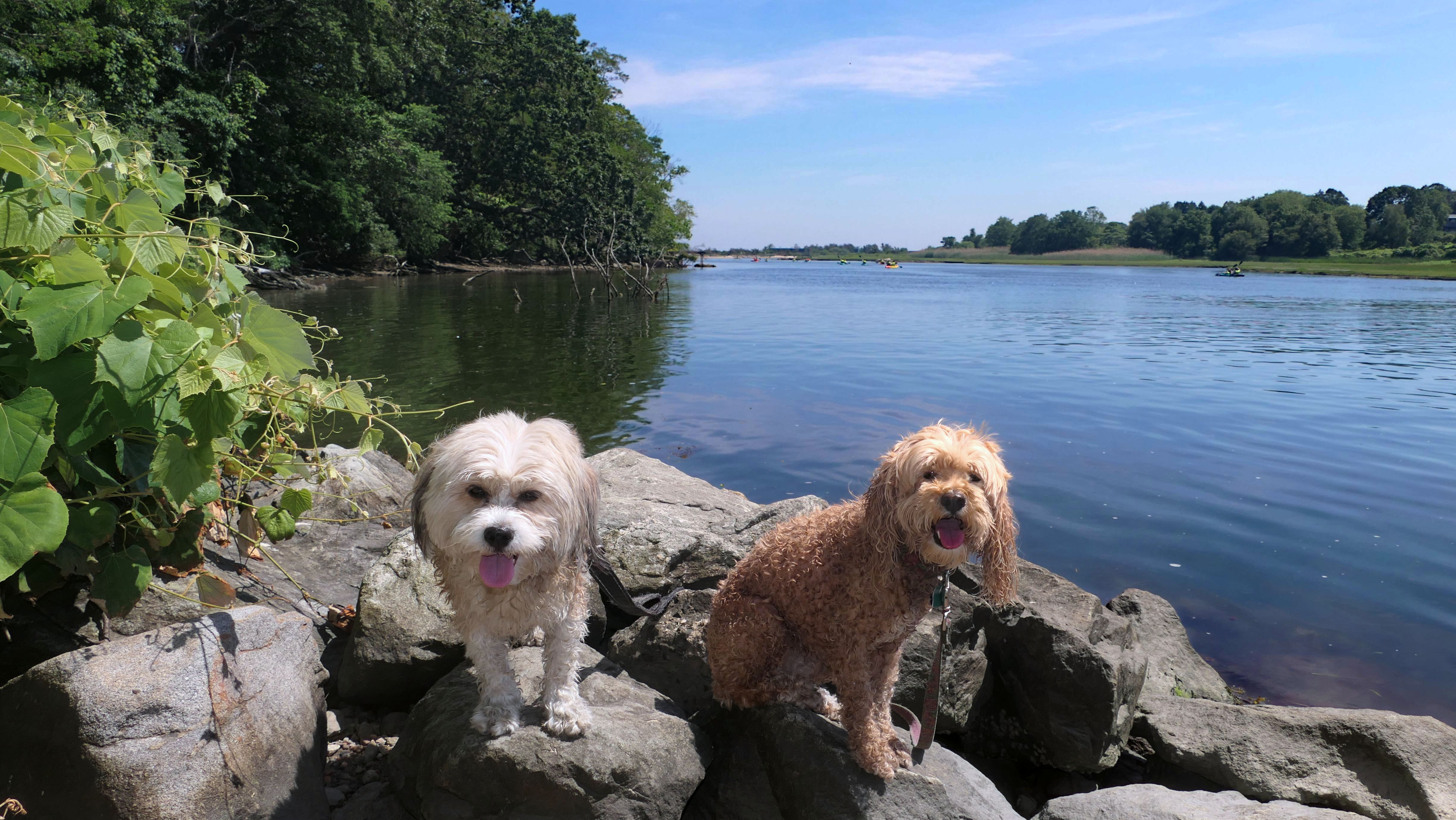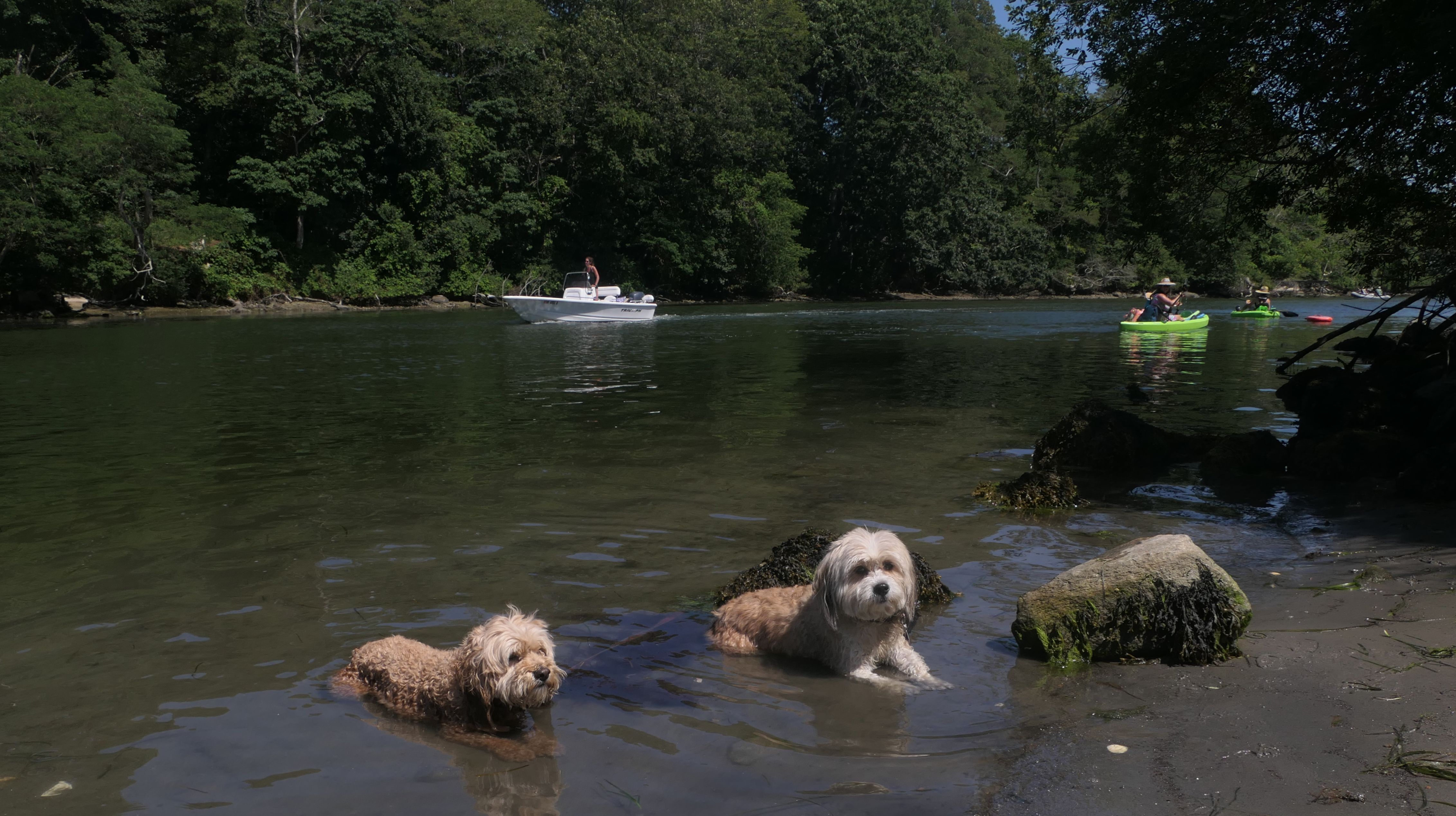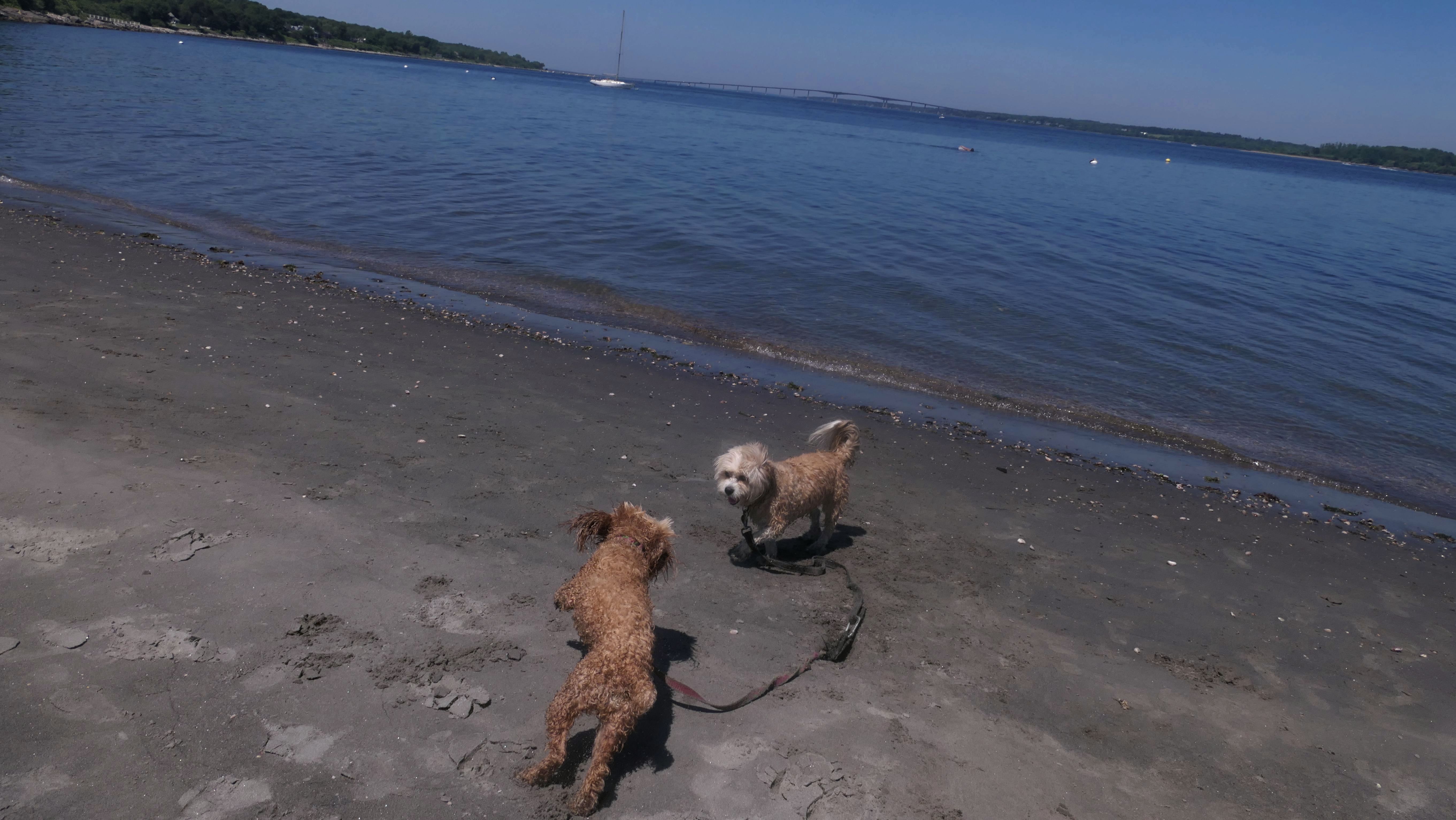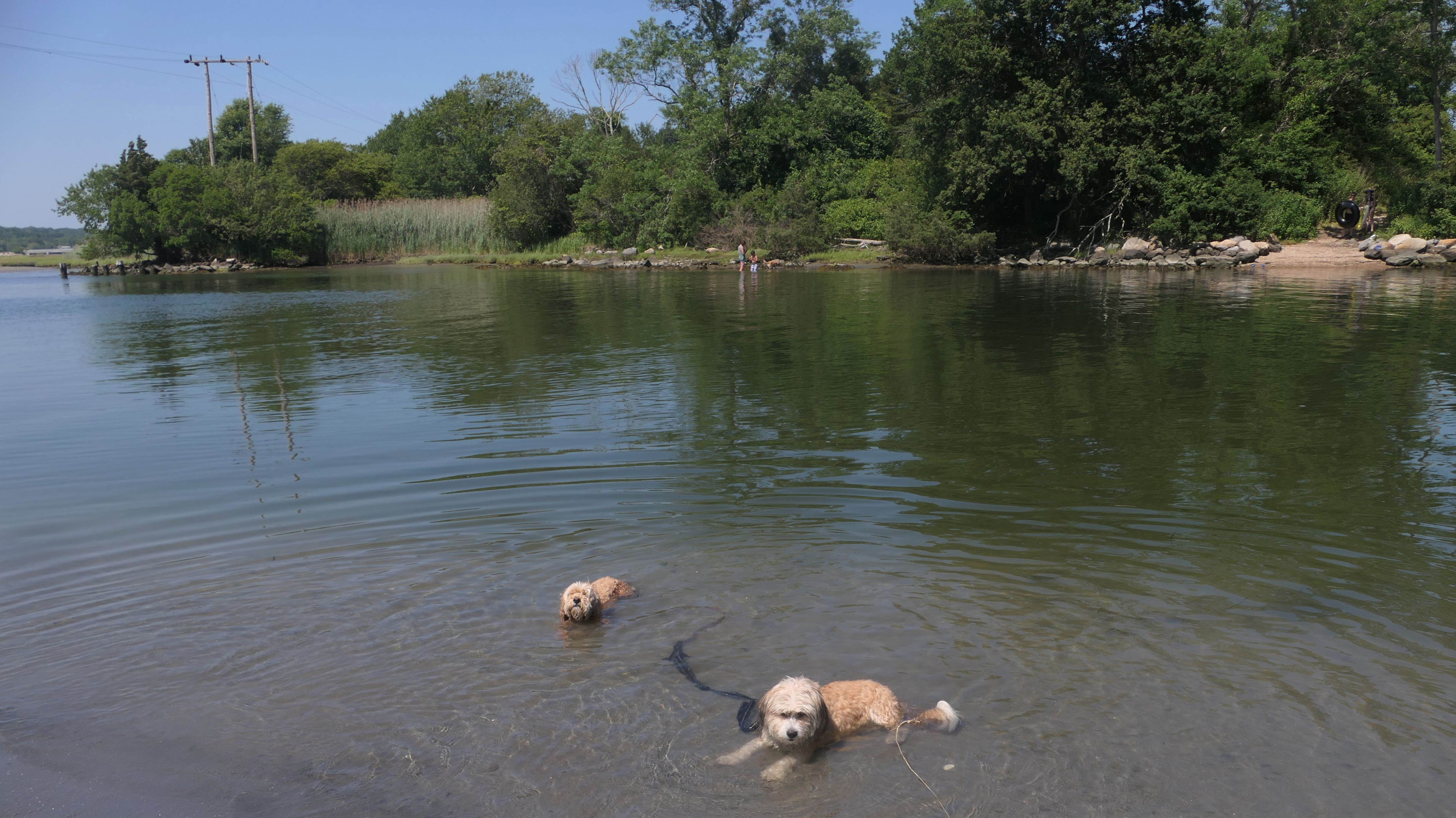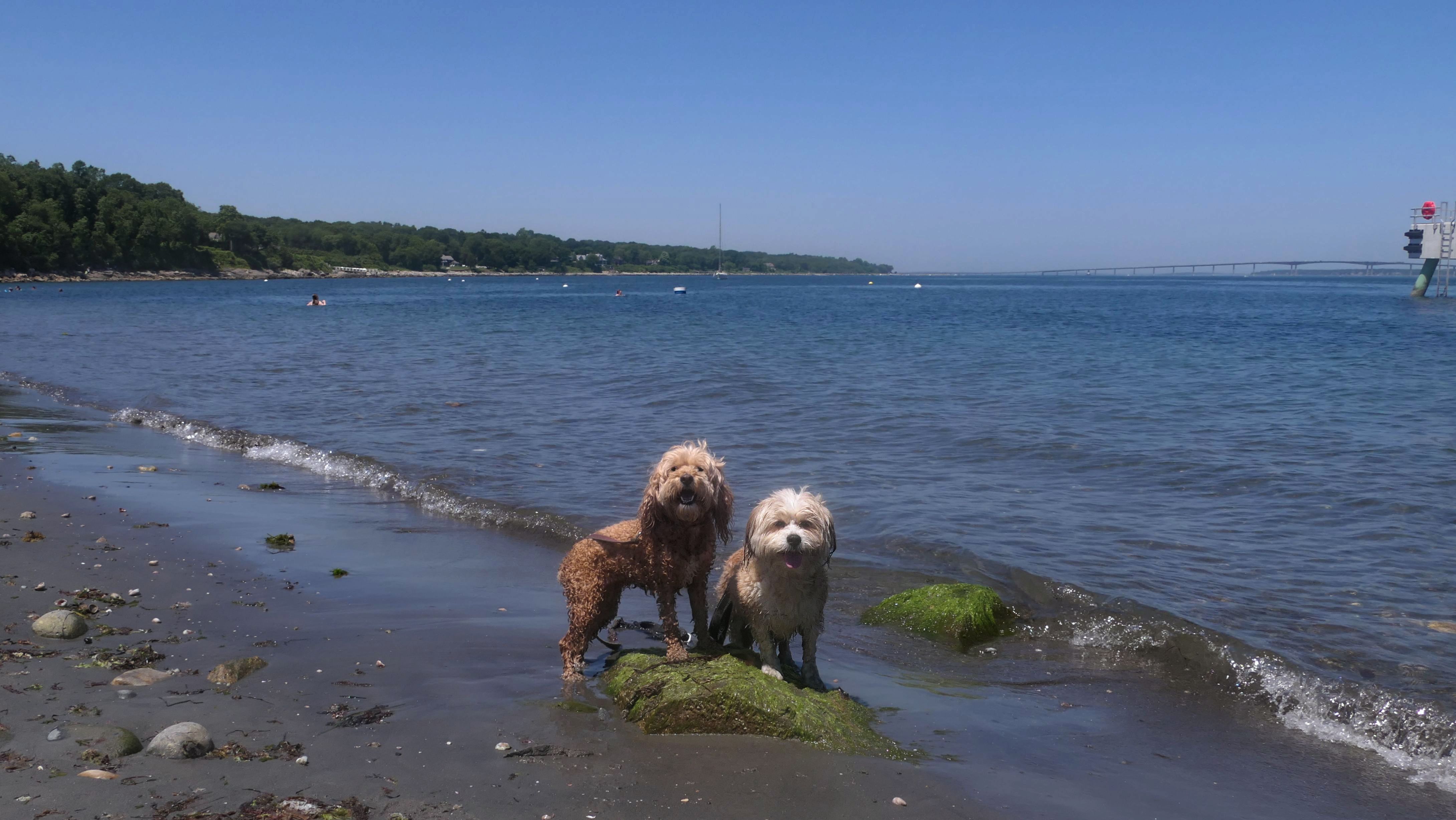 This was Day 3 of the late June heat wave. Record temps were recorded throughout the region, with many areas topping 100 degrees. Even the Rhode Island shore was well over 90. It was far too hot to go on any long hikes, so we went to a number of different places where the dogs could spend as much time in the water as they wanted to cool off. We went to Dog Beach first, but there was no parking available, so this was our next stop. This time around, the RSV Endeavor research vessel was not docked here. It must be out on a mission! We were able to get to the rocky area on the other side of the ship dock this time. We stayed here for a bit, and Mandy and Lexi actually played on the beach. The water was calm, shallow, and warm. Our next stop was the Sprague Bridge Recreation area.