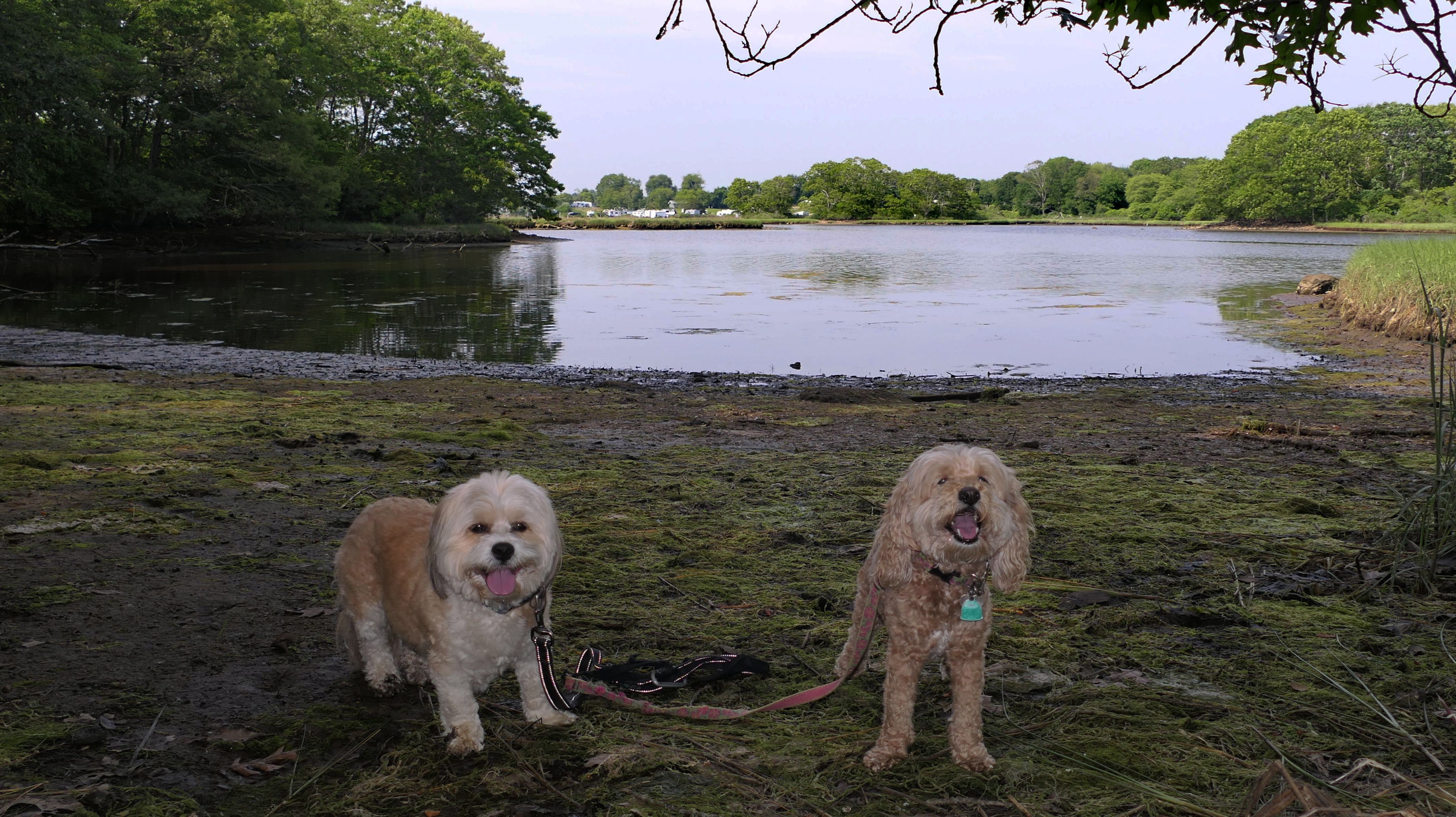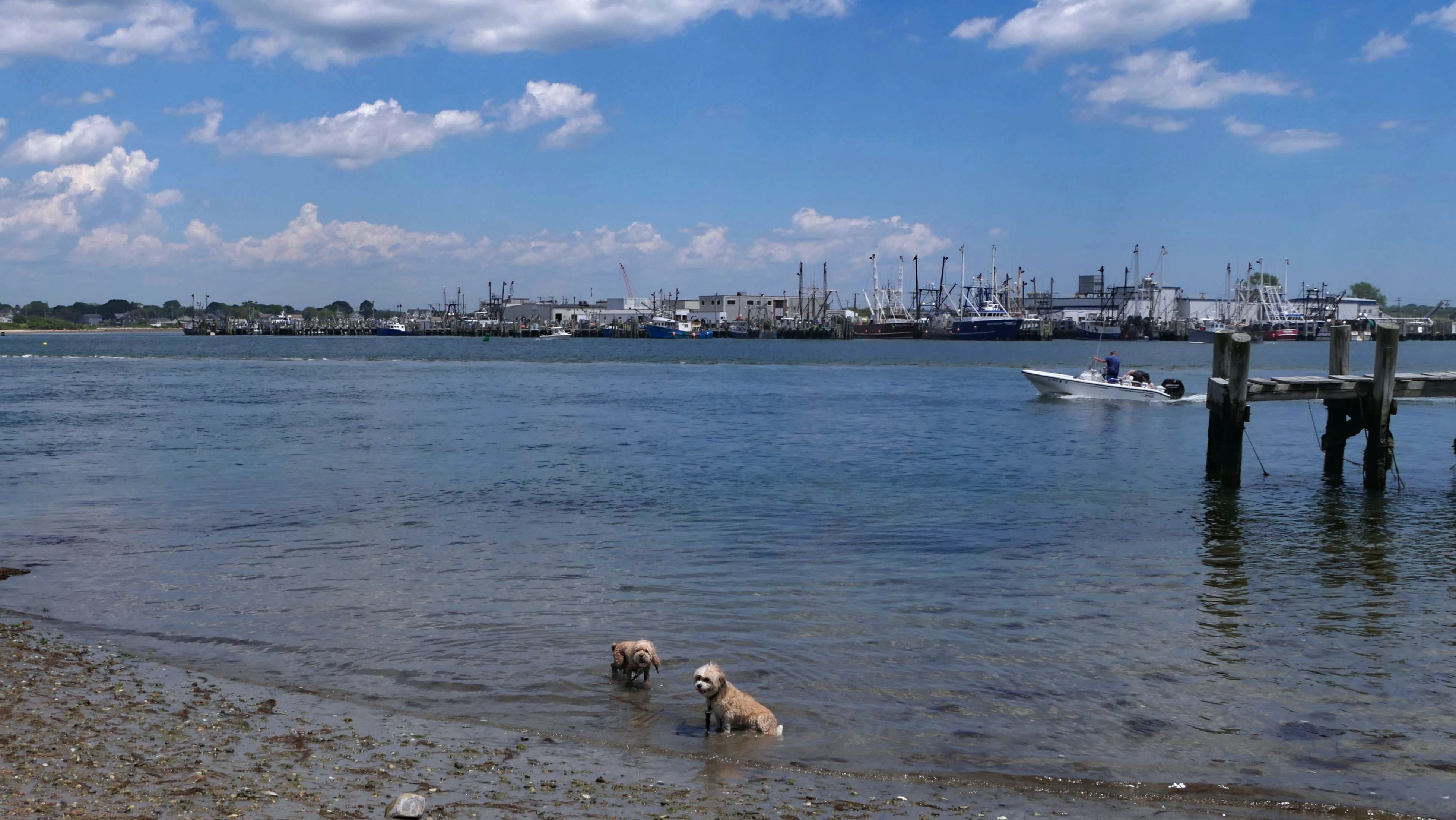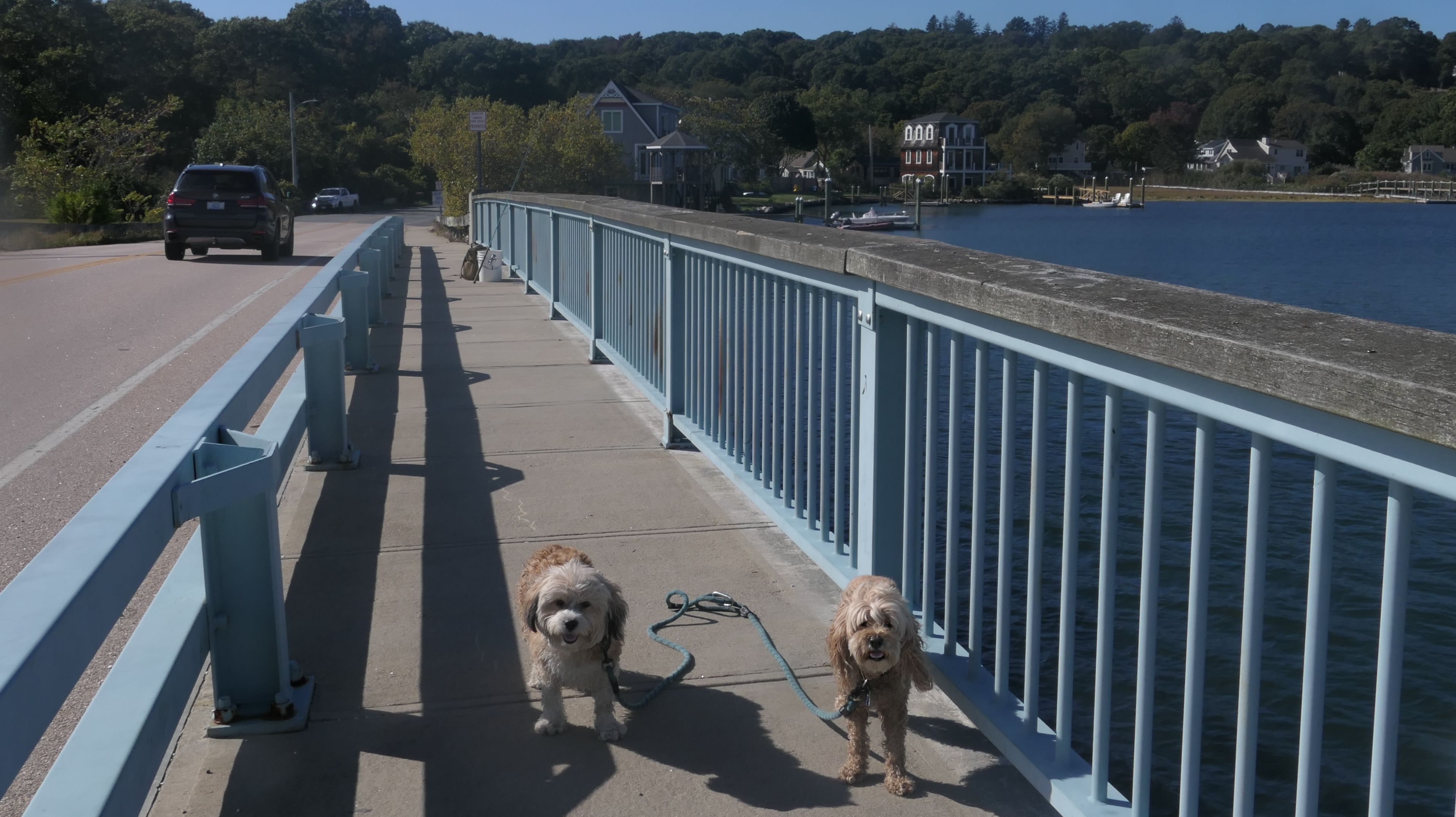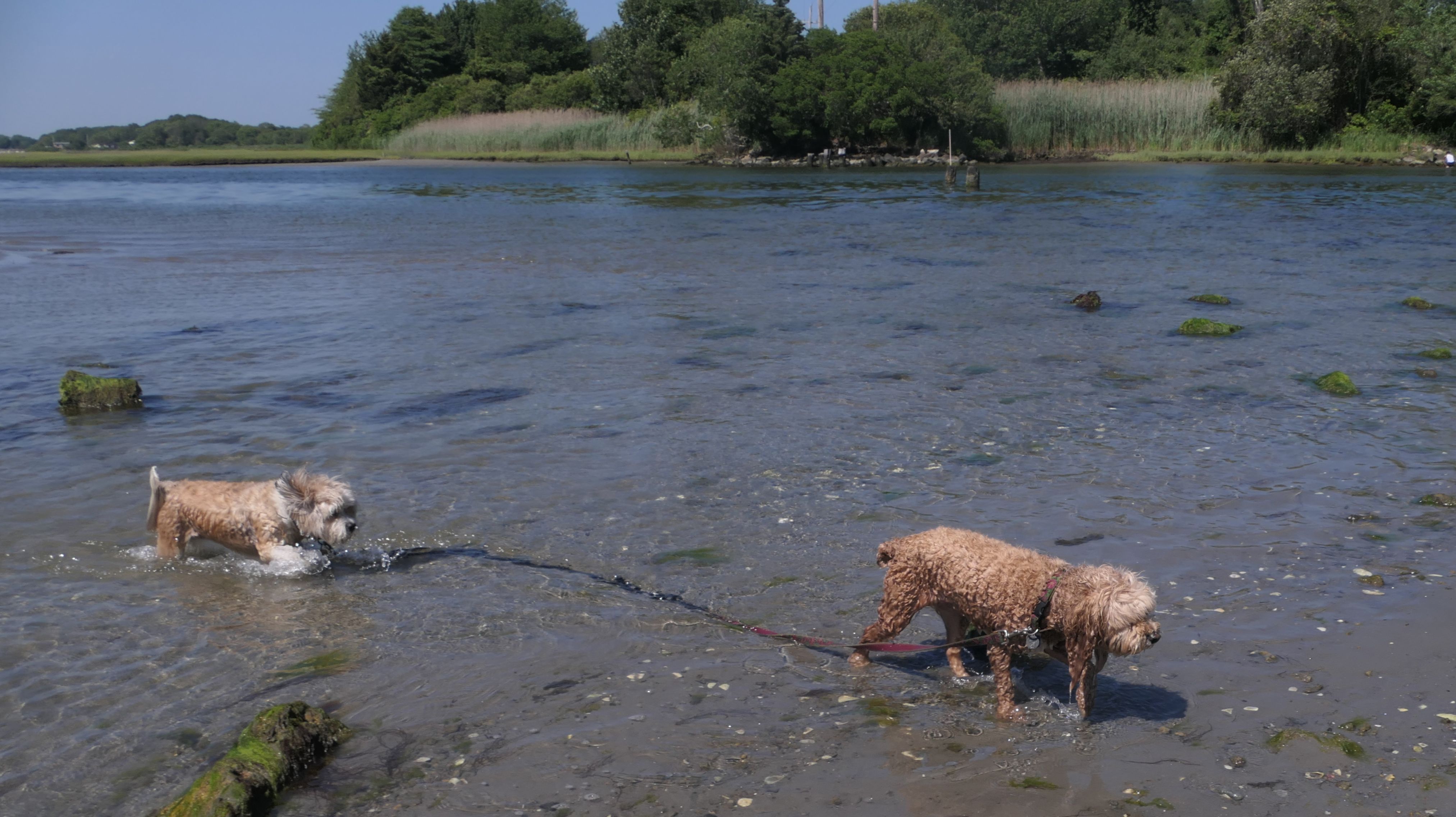 This was Day 3 of the late June heat wave. Record temps were recorded throughout the region, with many areas topping 100 degrees. Even the Rhode Island shore was well over 90. It was far too hot to go on any long hikes, so we went to a number of different places where the dogs could spend as much time in the water as they wanted to cool off. We went to Dog Beach first, but there was no parking available, so this was our next stop. This time around, the RSV Endeavor research vessel was not docked here. It must be out on a mission! We were able to get to the rocky area on the other side of the ship dock this time. We stayed here for a bit, and Mandy and Lexi actually played on the beach. The water was calm, shallow, and warm. Our next stop was the Sprague Bridge Recreation area.