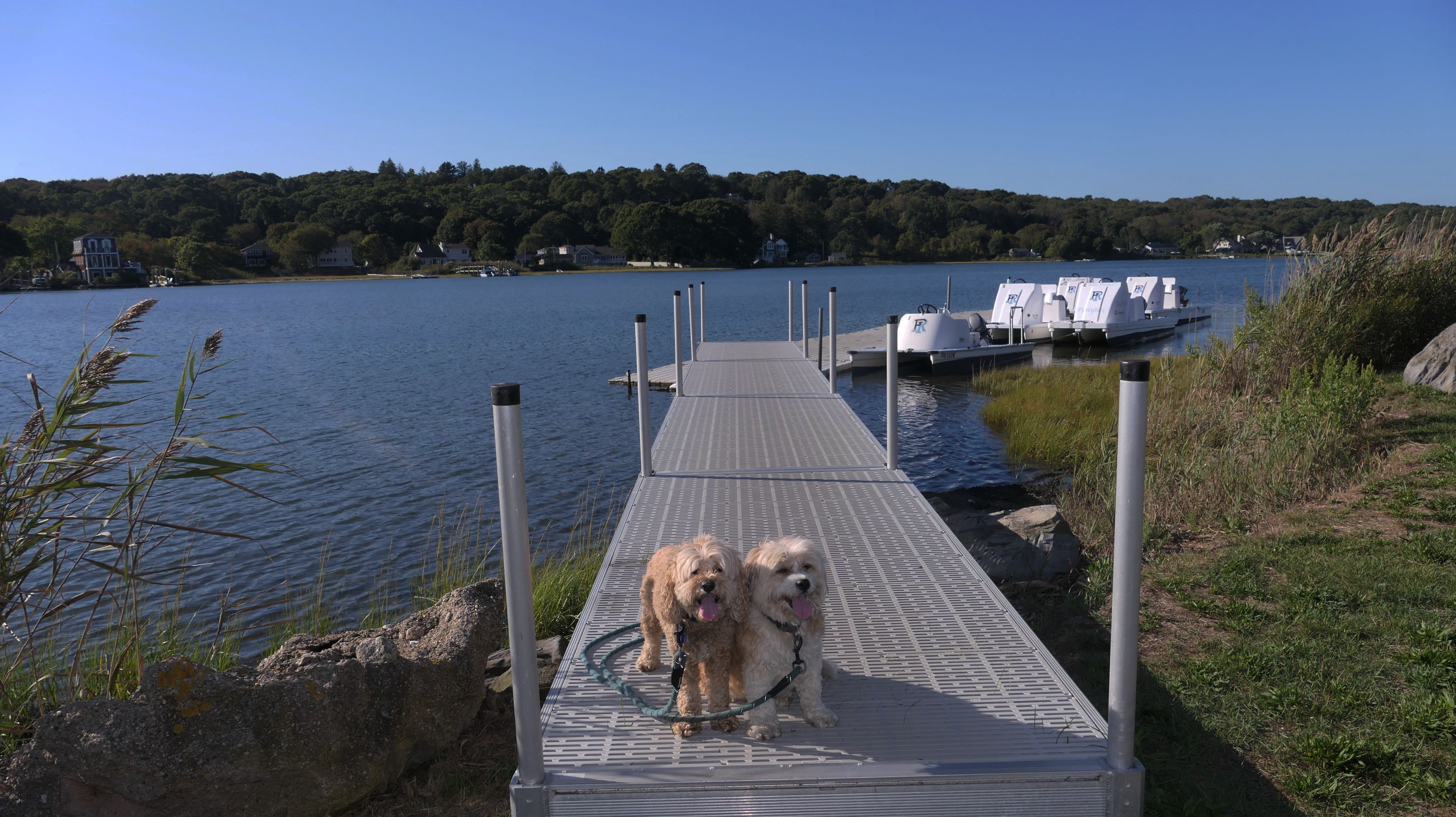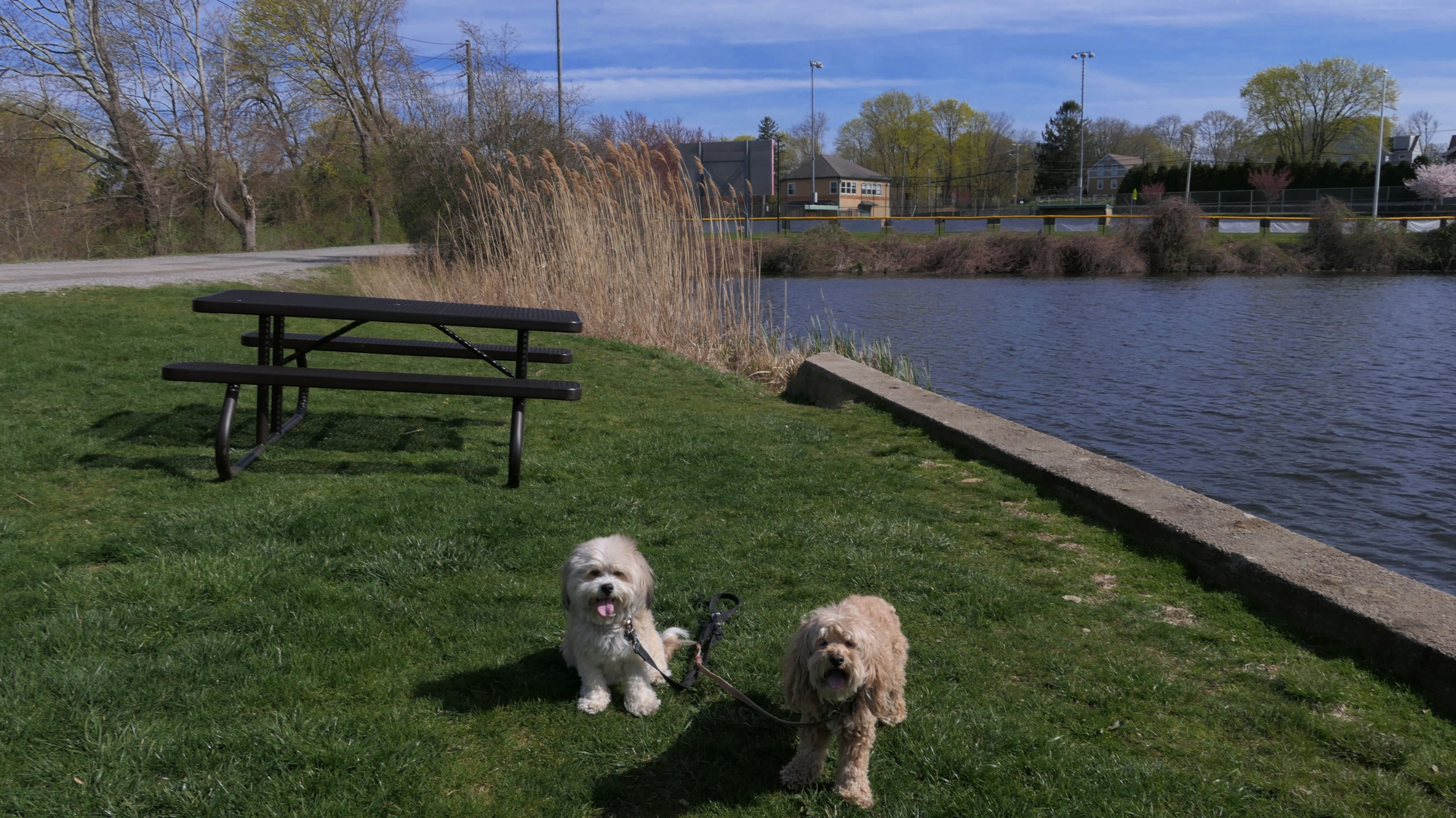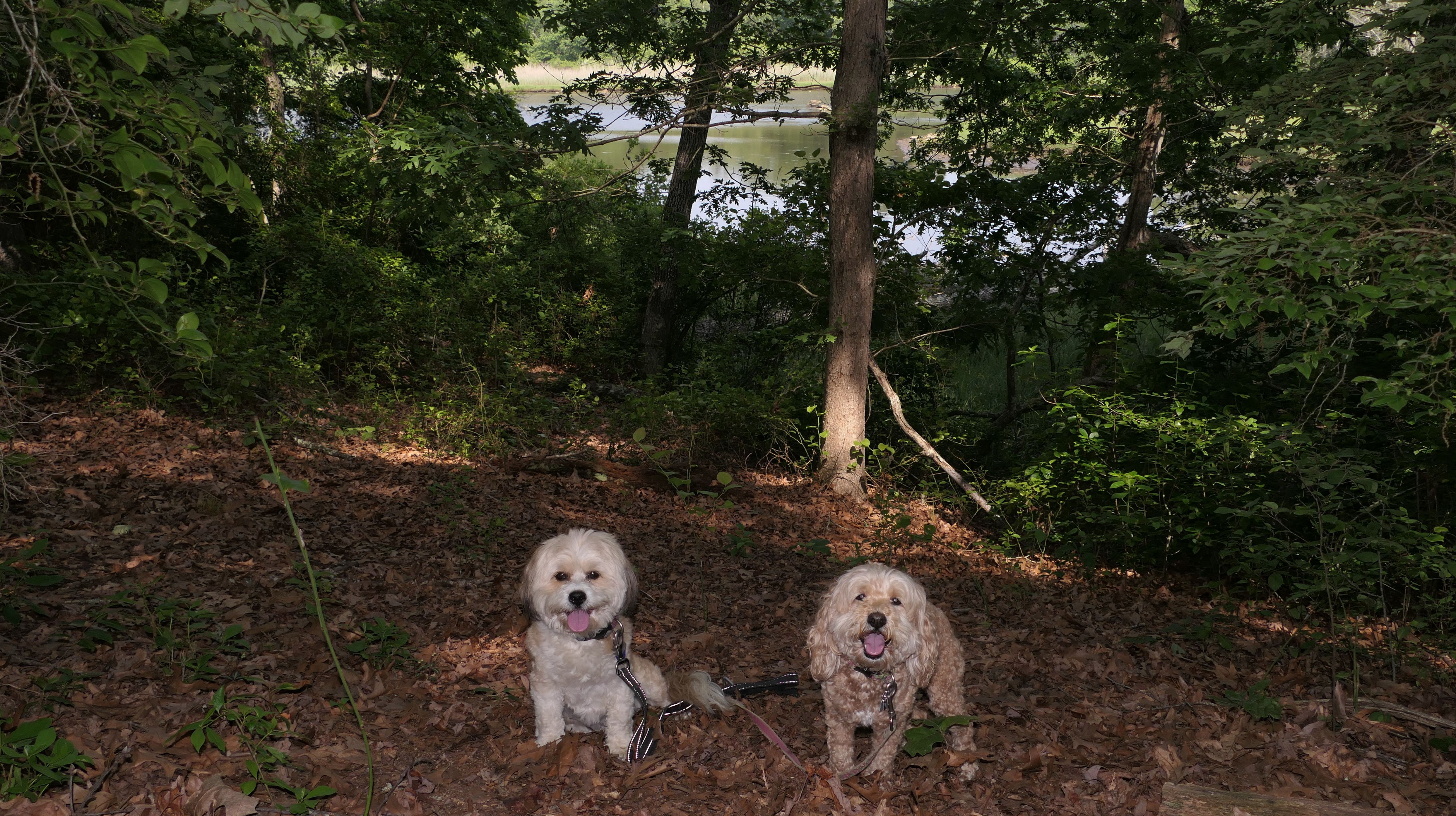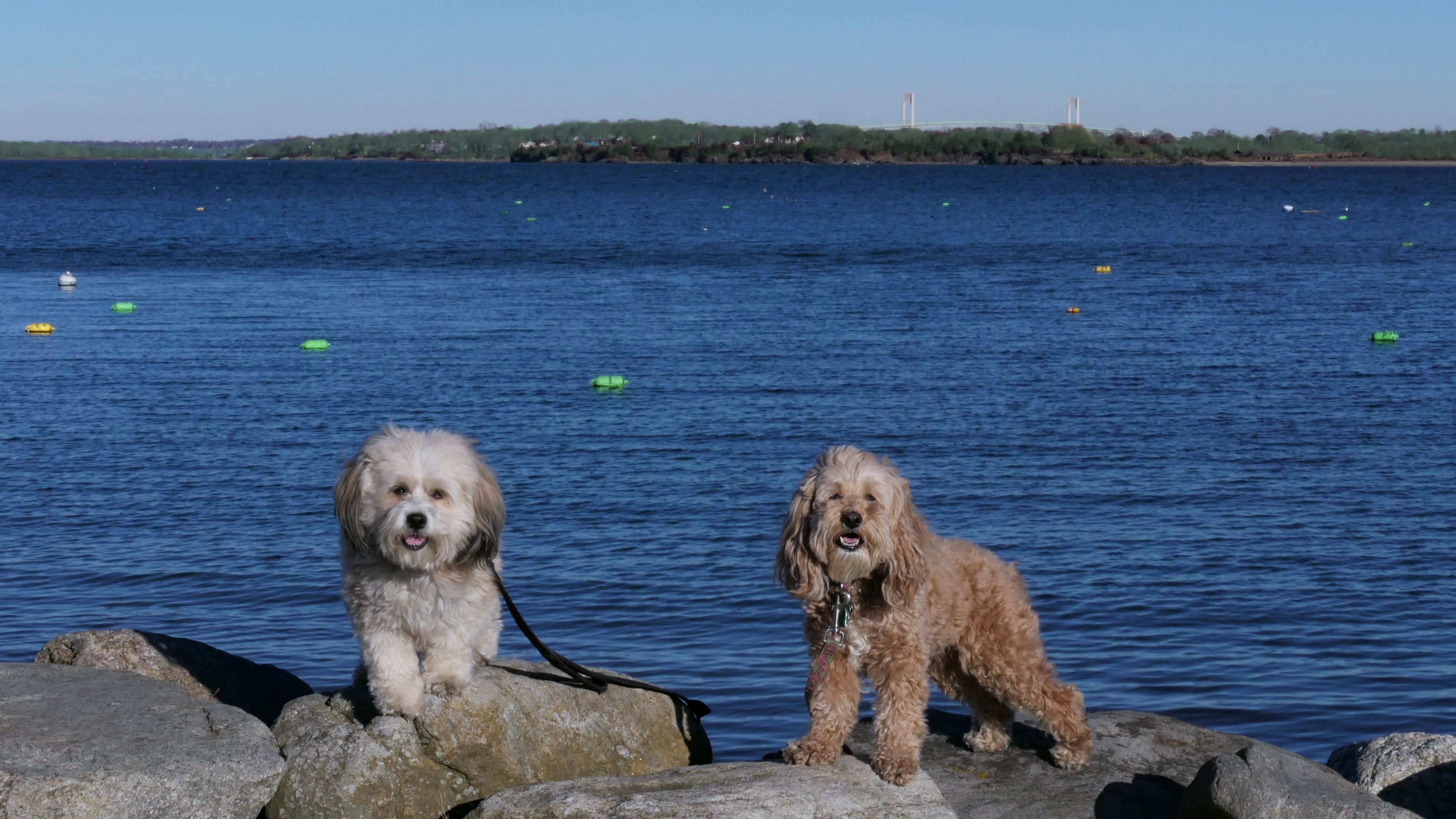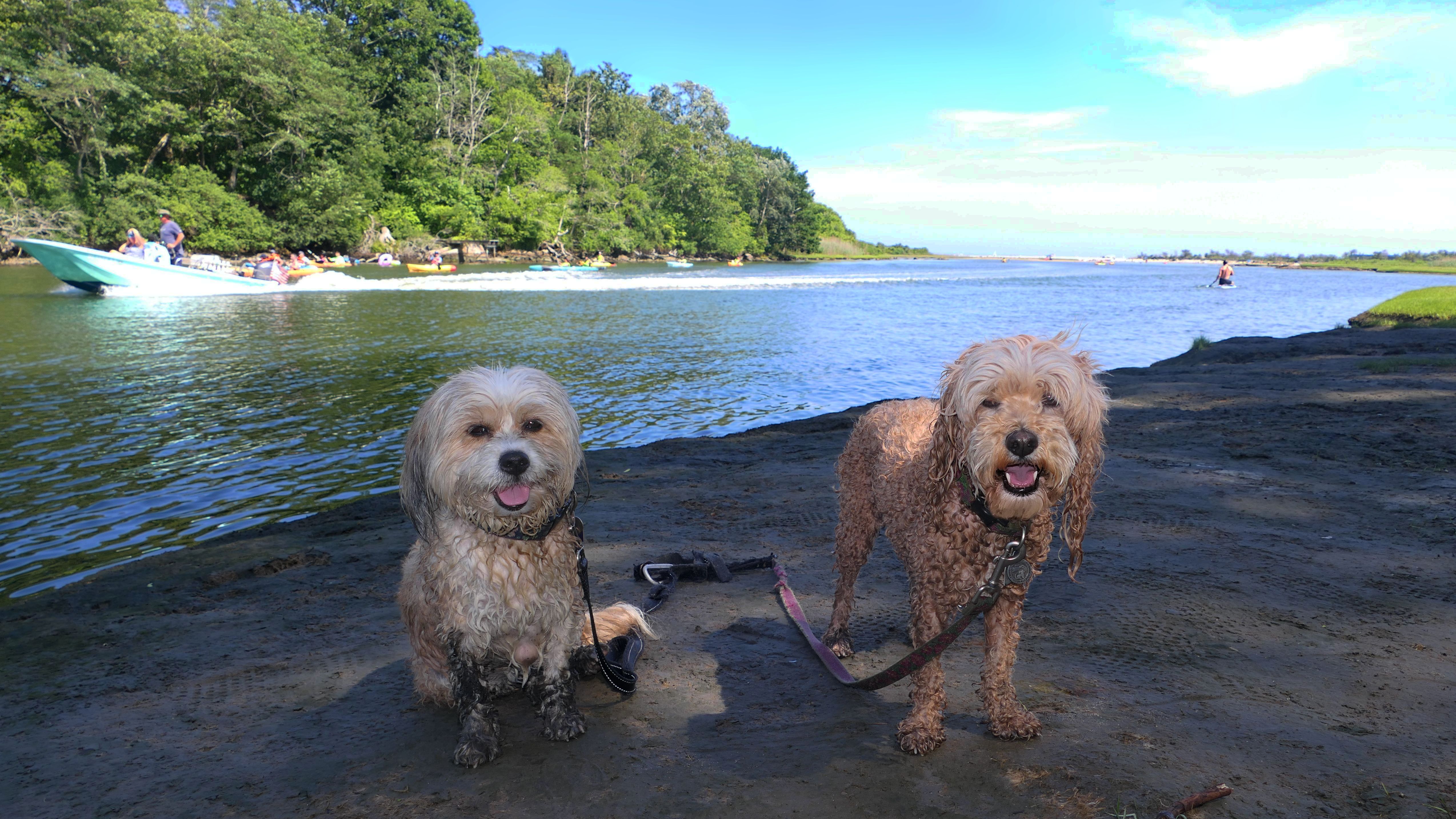 This was Day 3 of the late June heat wave. Record temps were recorded throughout the region, with many areas topping 100 degrees. Even the Rhode Island shore was well over 90. It was far too hot to go on any long hikes, so we went to a number of different places where the dogs could spend as much time in the water as they wanted to cool off. We went to Dog Beach first, but there was no parking available, so this was our next stop. This time around, the RSV Endeavor research vessel was not docked here. It must be out on a mission! We were able to get to the rocky area on the other side of the ship dock this time. We stayed here for a bit, and Mandy and Lexi actually played on the beach. The water was calm, shallow, and warm. Our next stop was the Sprague Bridge Recreation area.
