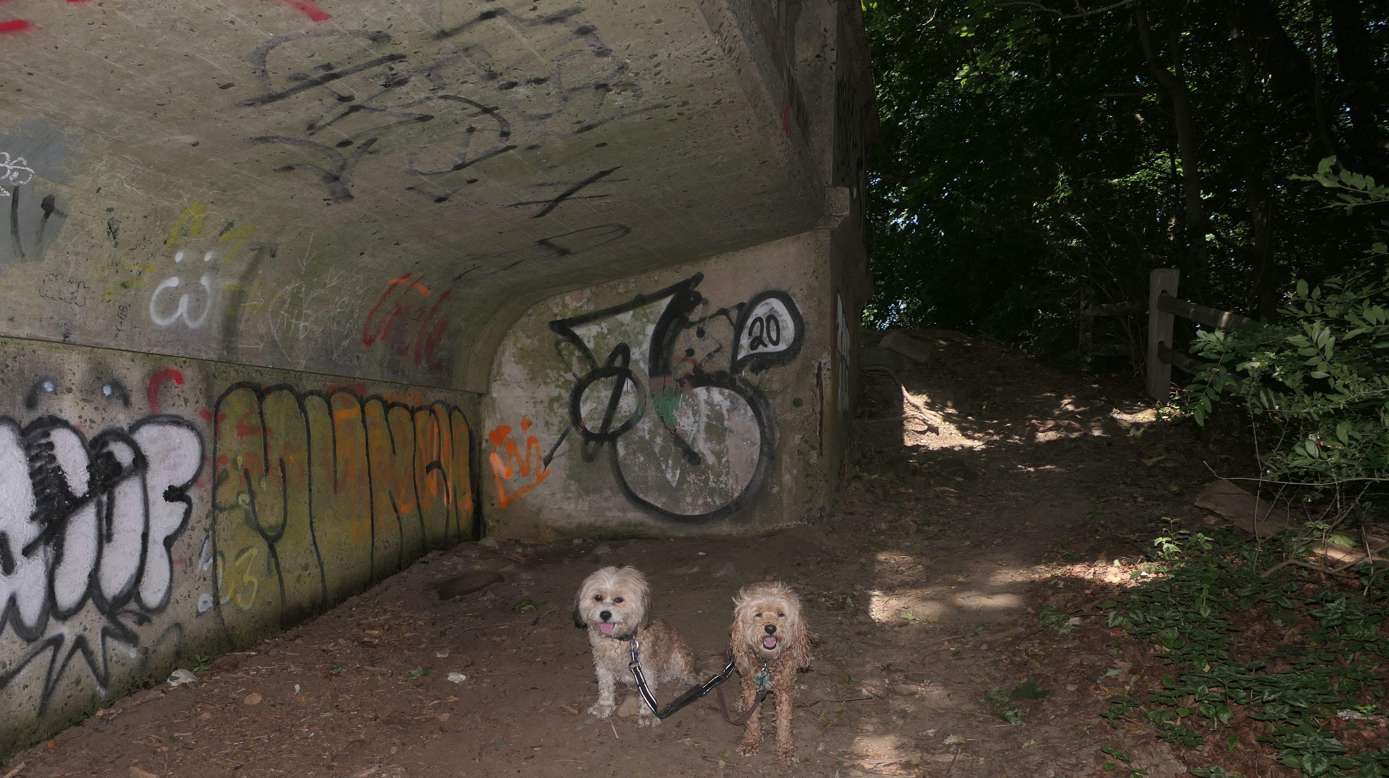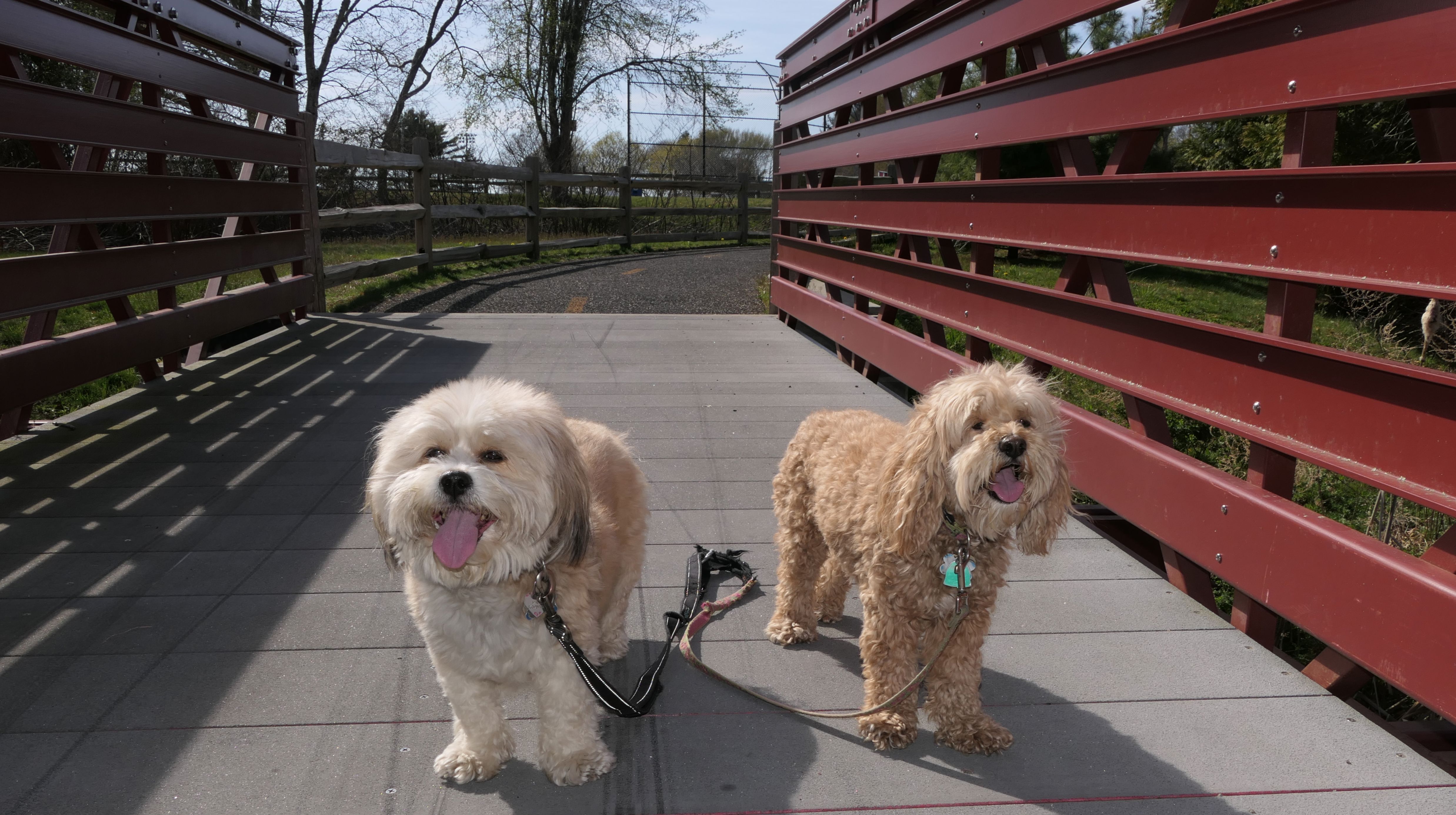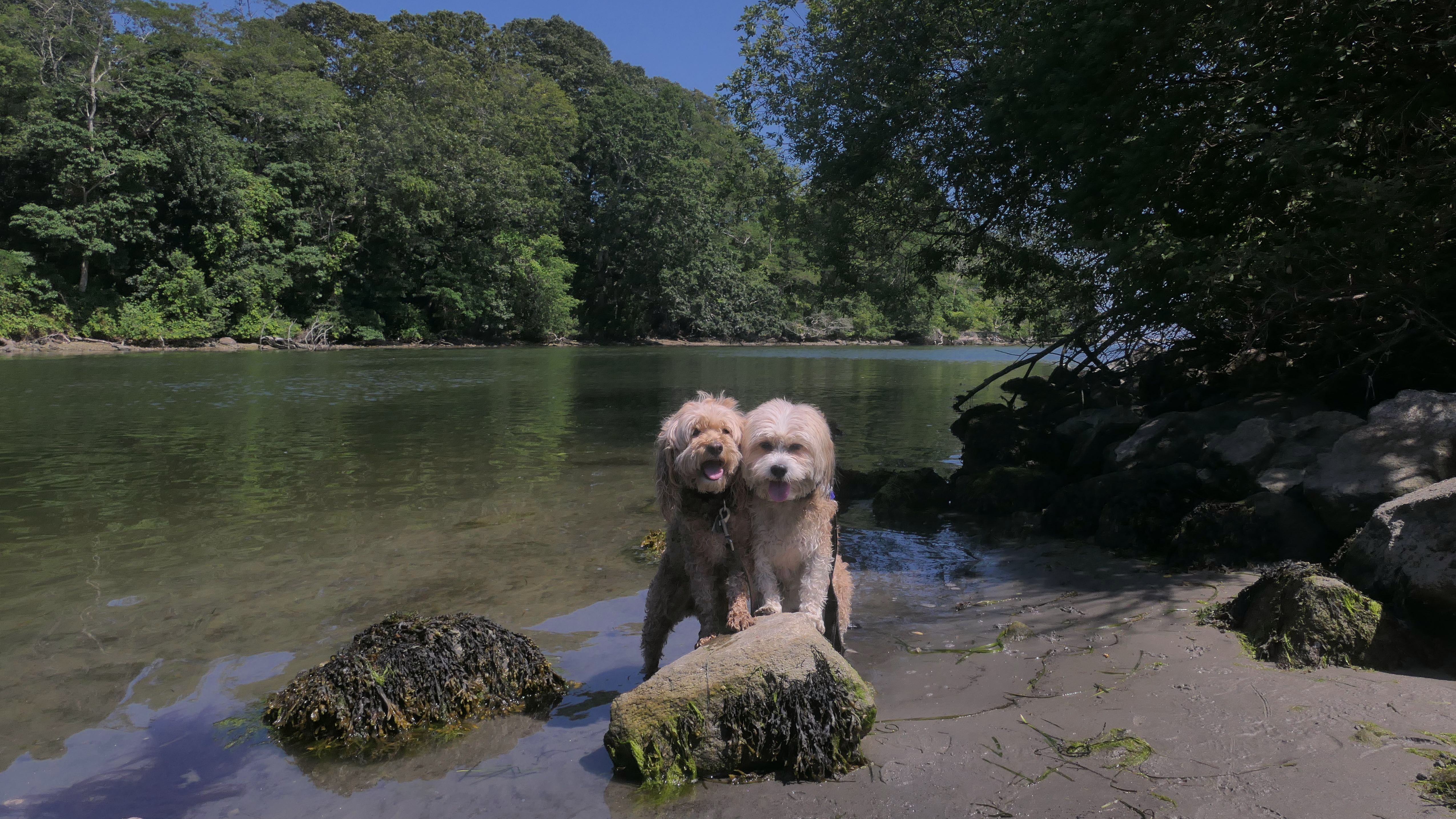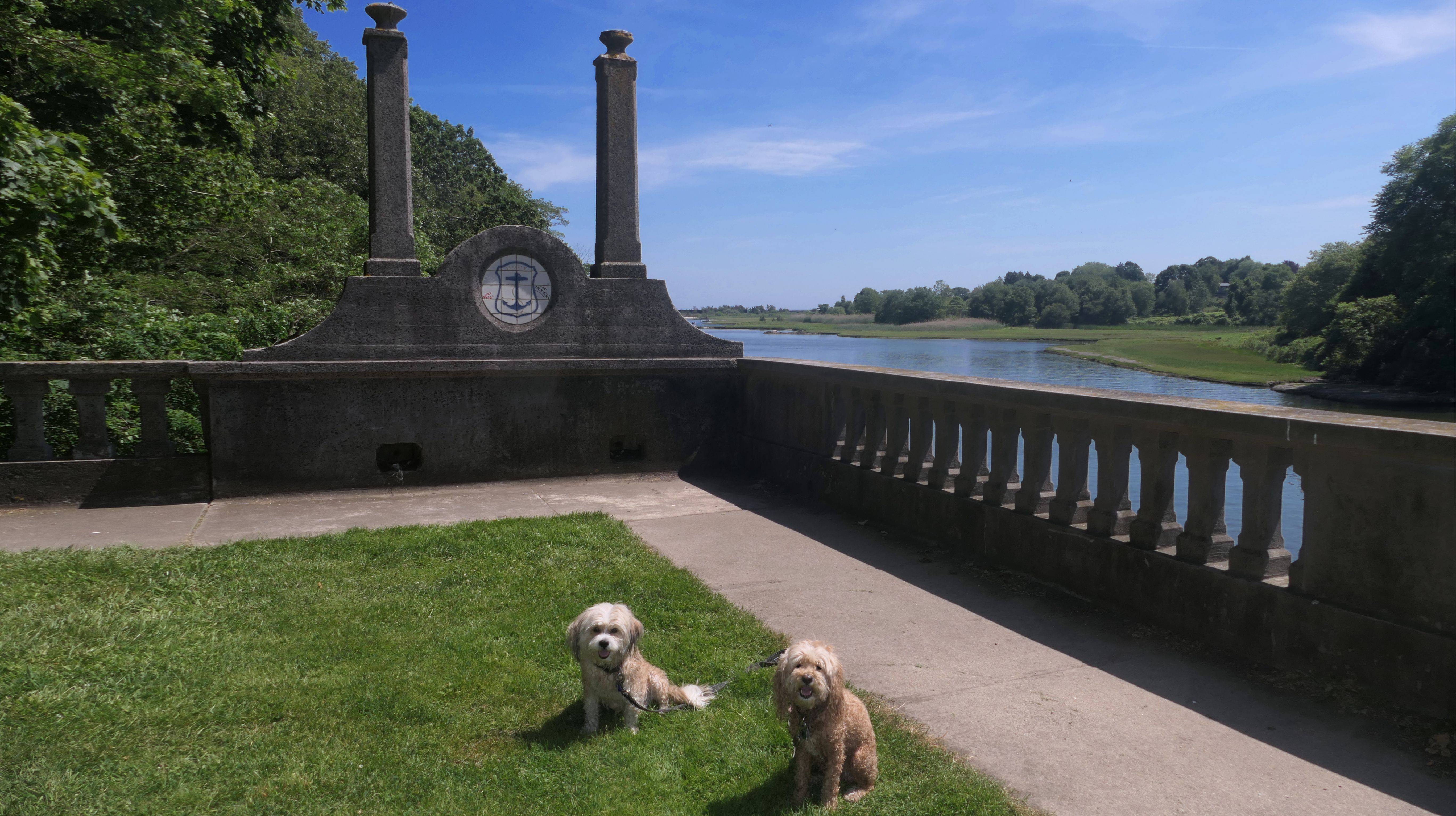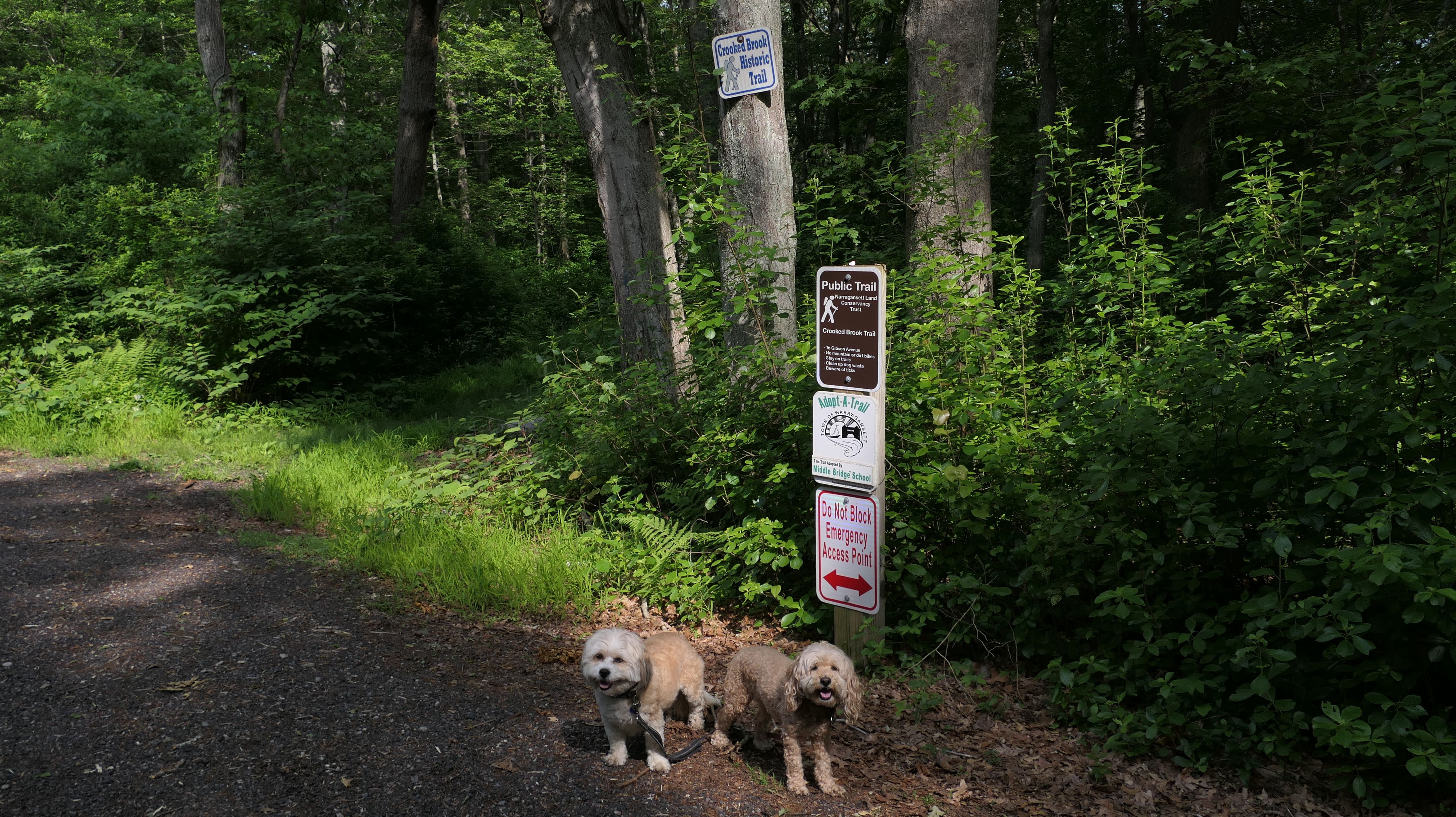 This was Day 3 of the late June heat wave. Record temps were recorded throughout the region, with many areas topping 100 degrees. Even the Rhode Island shore was well over 90. It was far too hot to go on any long hikes, so we went to a number of different places where the dogs could spend as much time in the water as they wanted to cool off. We went to Dog Beach first, but there was no parking available, so this was our next stop. This time around, the RSV Endeavor research vessel was not docked here. It must be out on a mission! We were able to get to the rocky area on the other side of the ship dock this time. We stayed here for a bit, and Mandy and Lexi actually played on the beach. The water was calm, shallow, and warm. Our next stop was the Sprague Bridge Recreation area.