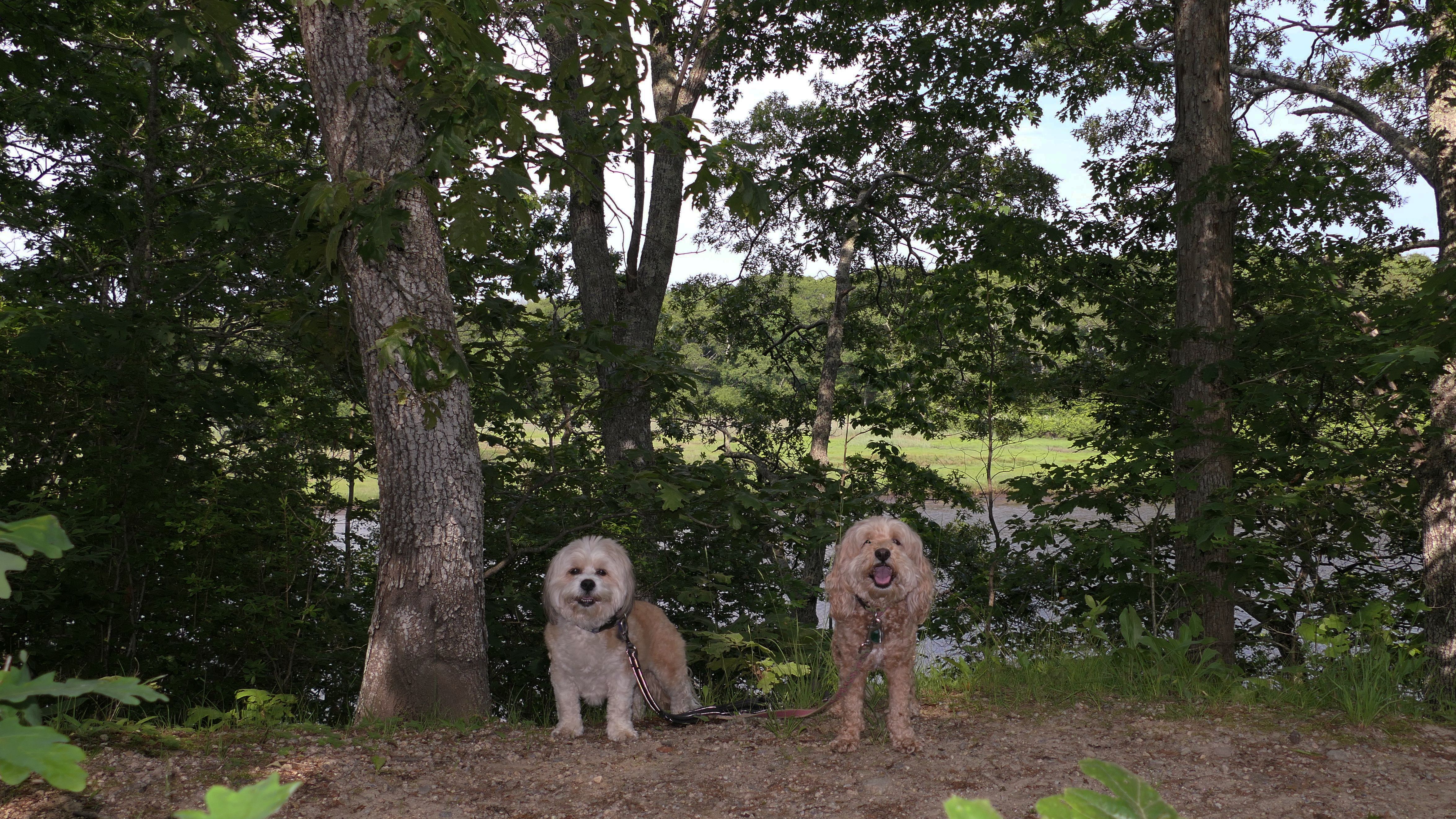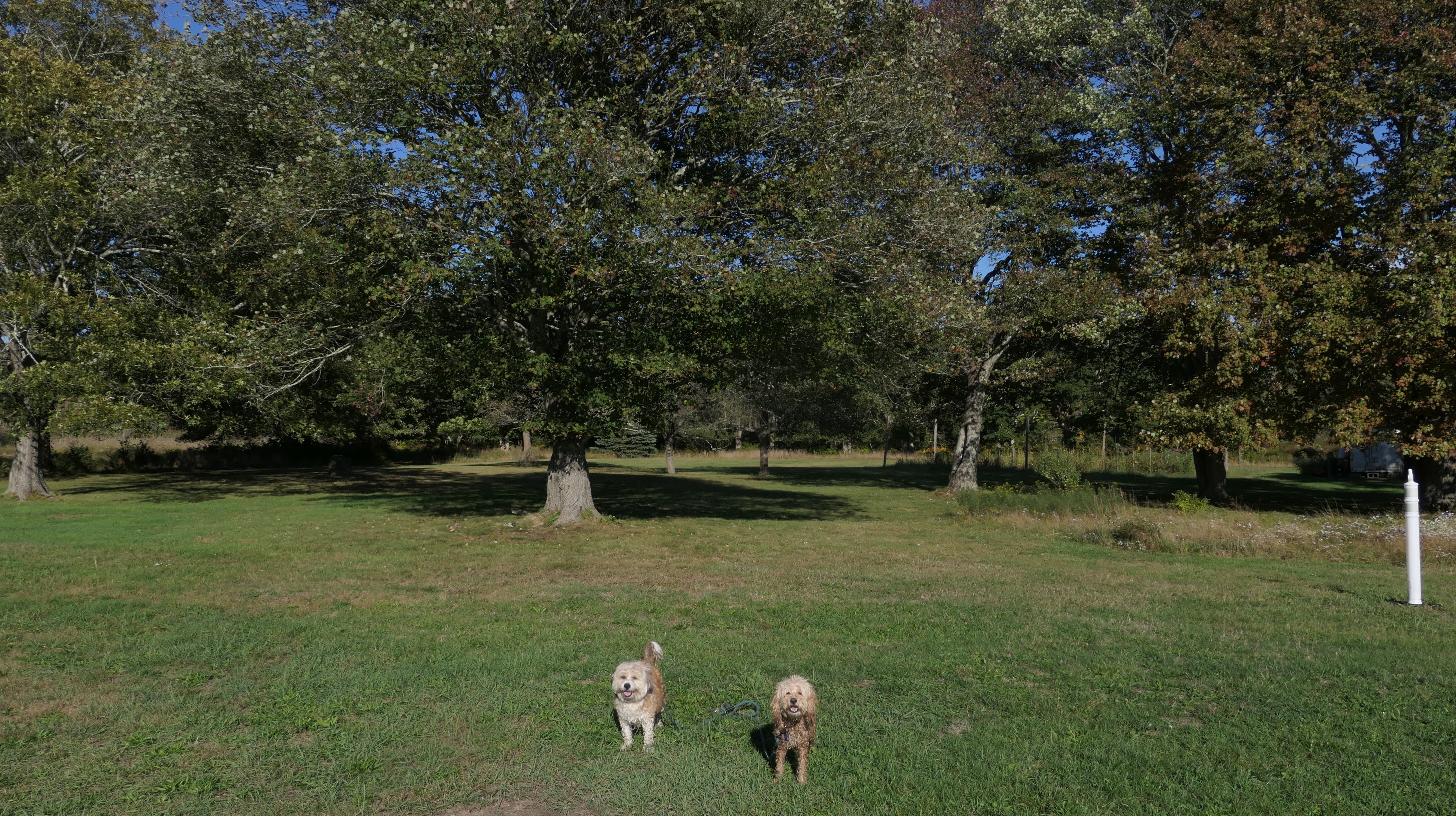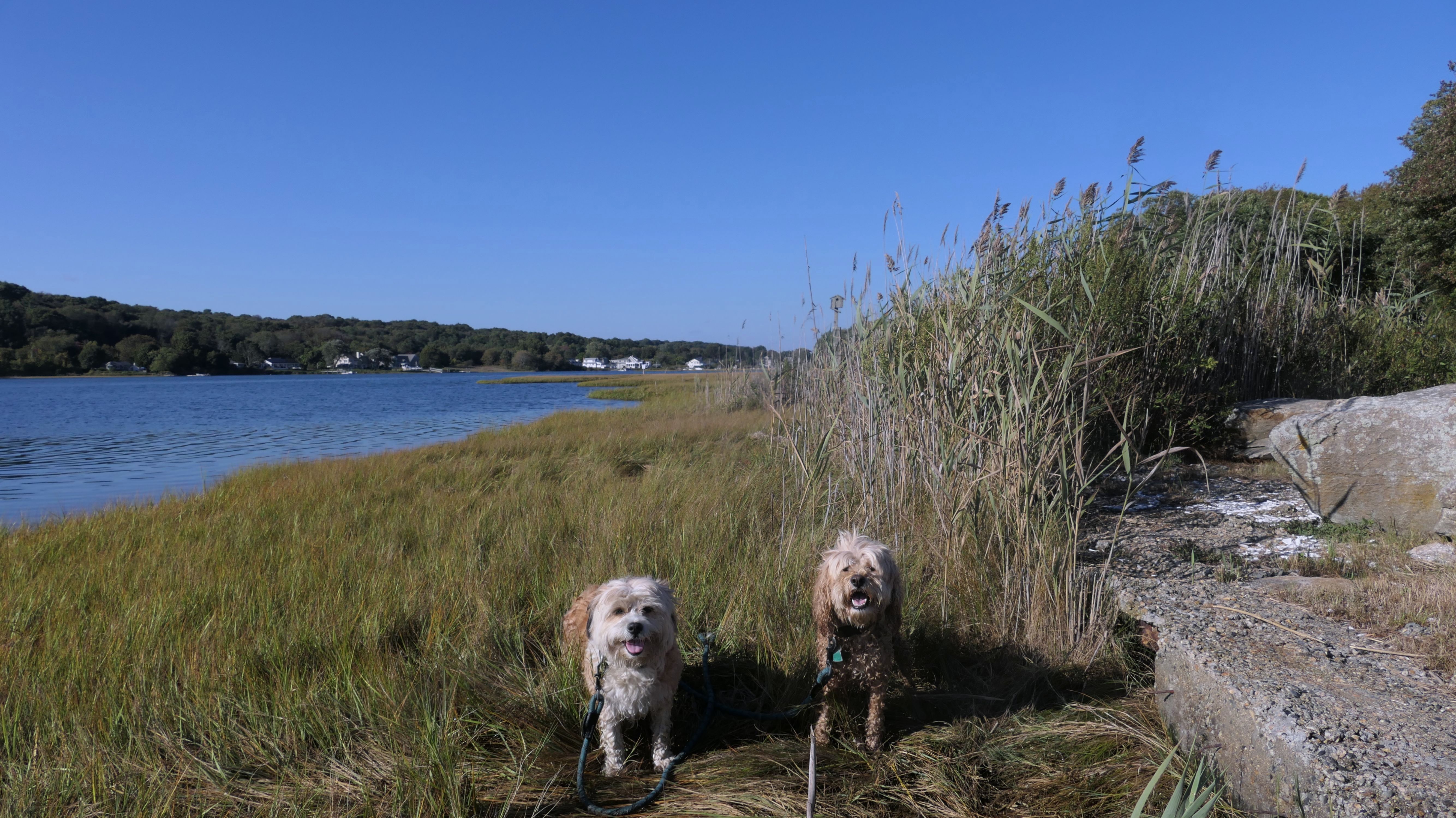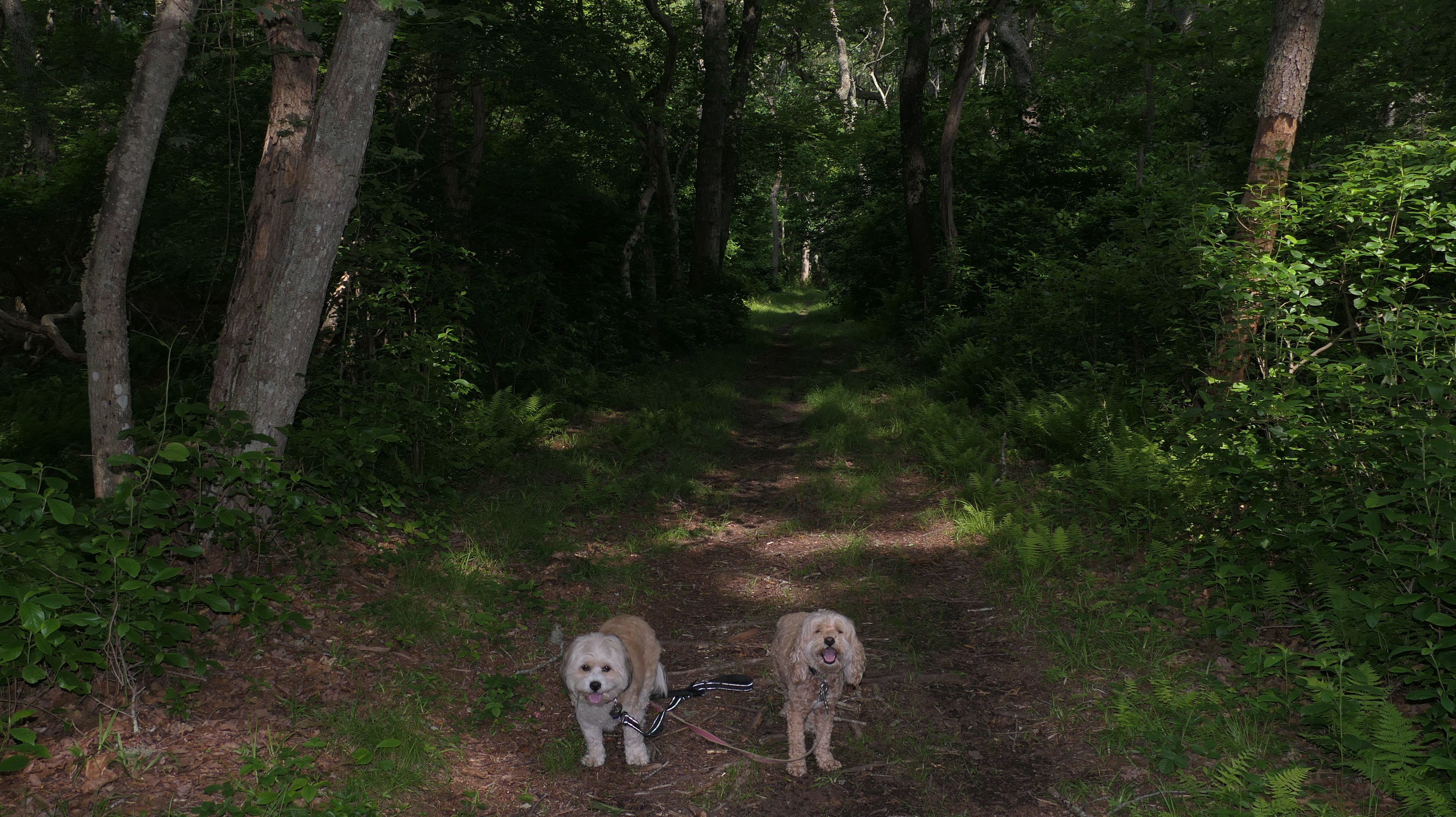 This is a beatiful trail. We parked at Narragansett Town Beach, and headed to the trail head across the street. It's a completely flat, easy trail that heads to the South County Museum (you can park for free here to access the trail during the beach season), and eventually ends at the Community Center near the Elementary School. Near the museum, the trail runs right by the farm animals. As you can see in the photo, Mr. Goat insisted on posing for a picture as well. As great as this trail is, there is one huge problem with it...and that was ticks! The dogs were covered with them! So I would avoid this trail this time of year. I've read that the bugs are relentless during the summer months, so that might not be a great time either. It probably looks pretty "bleh" in the winter, so maybe the fall is a good time to visit.
