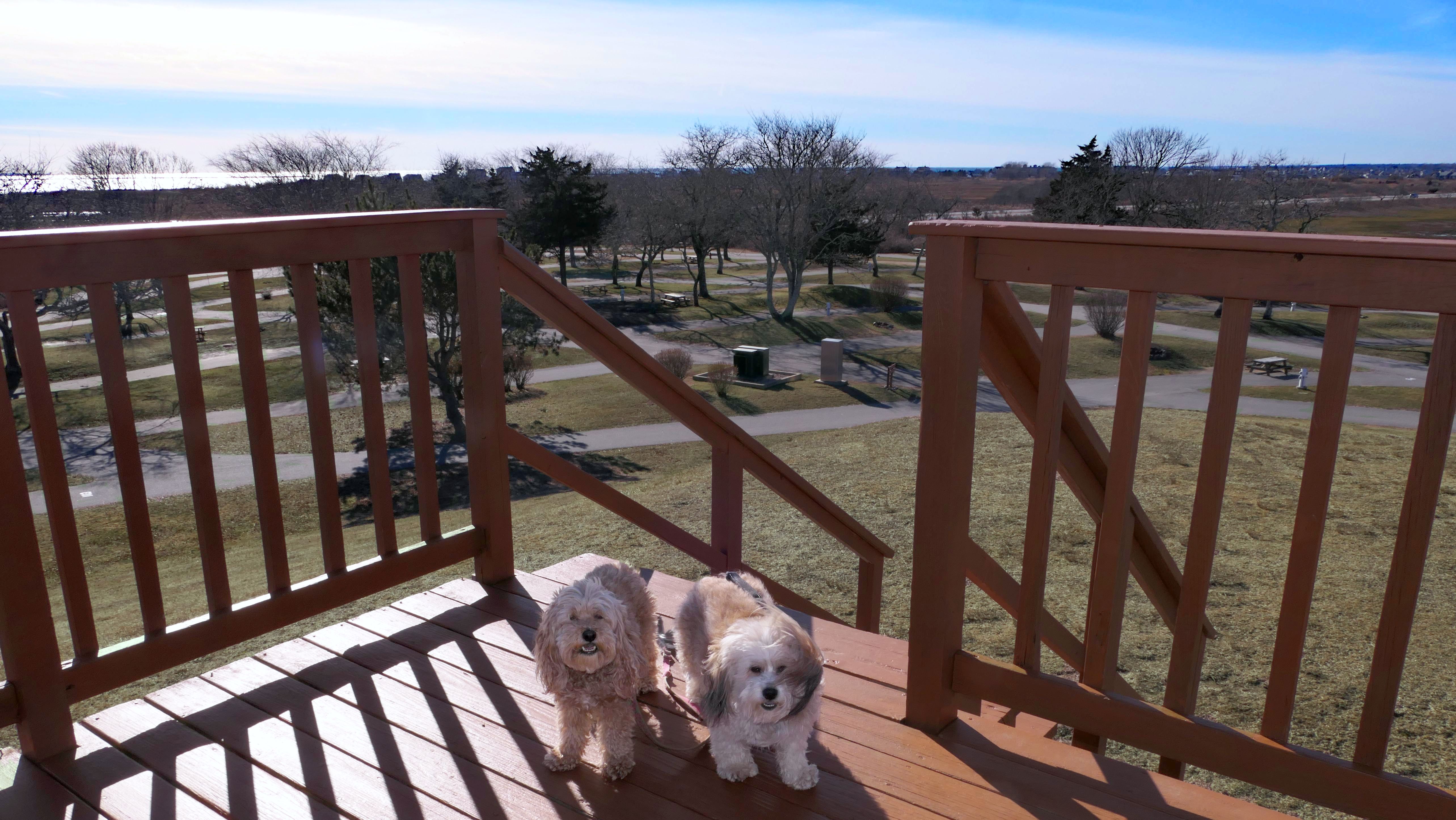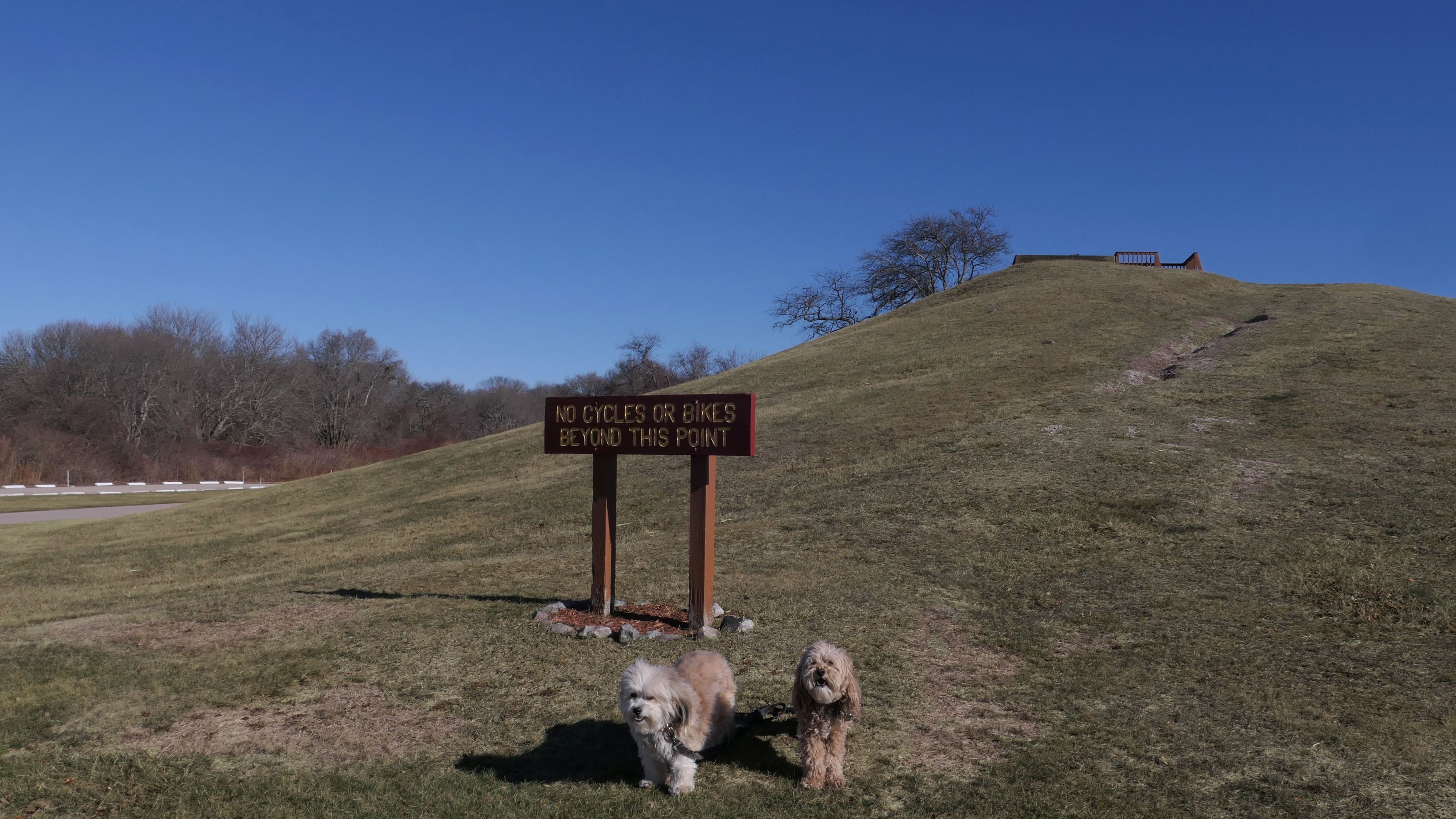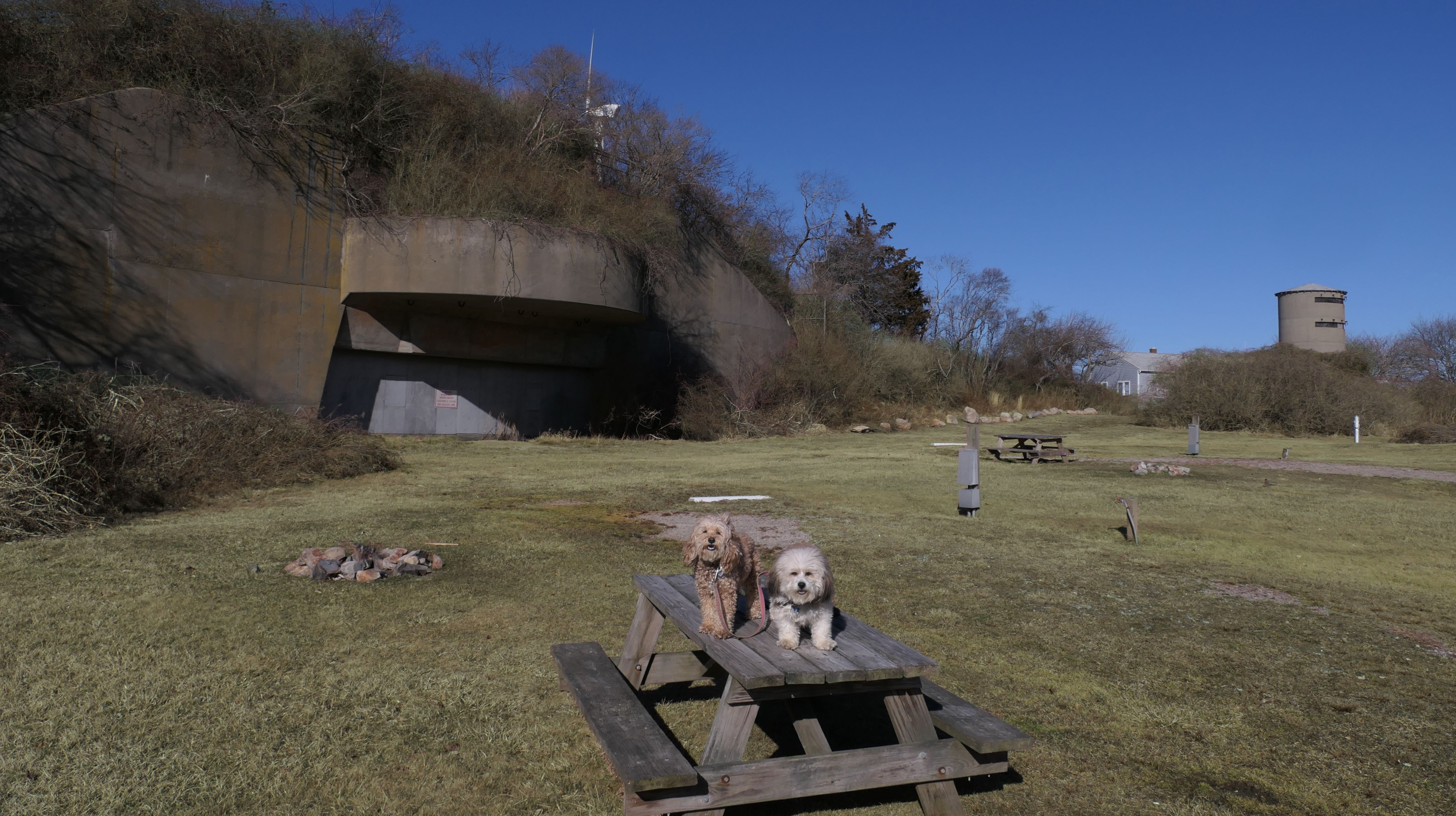 We tried to visit here once in the summer but were turned away at the gate. We were told that the park was for camping only, and I couldn't come here just to take the dogs for a walk. For this visit, the campground was closed because it was the middle of winter, so we were able to check out the place. The park is located at the site of Fort Greene, and old military fort. Remnants of the fort still exist. (The other portion of the old fort is located nearby at Camp Cronin). Other than the short trail that leads to the top of an old cannon battery mount, most of the park is dedicated to camping activities. The individual sites are small, and close together, so it doesn't like the campground offers much in the way of privacy. Point Judith Pond can be accessed from the west side of the park. There is an observation platforms with views of the shoreline as well. It's really not that scenic of a spot, at least this time of the year. We circled the entire park, walking for just about two miles total.