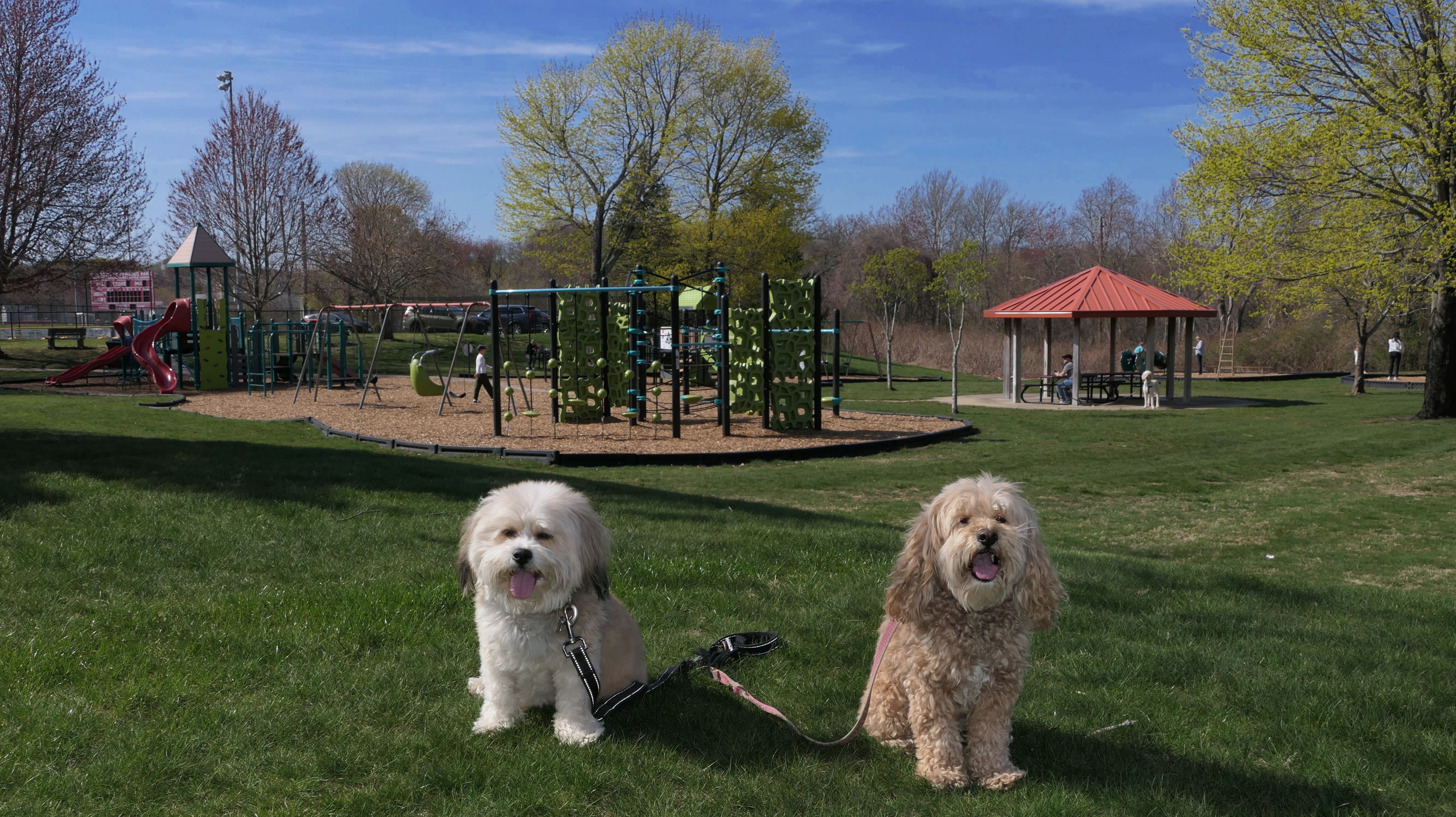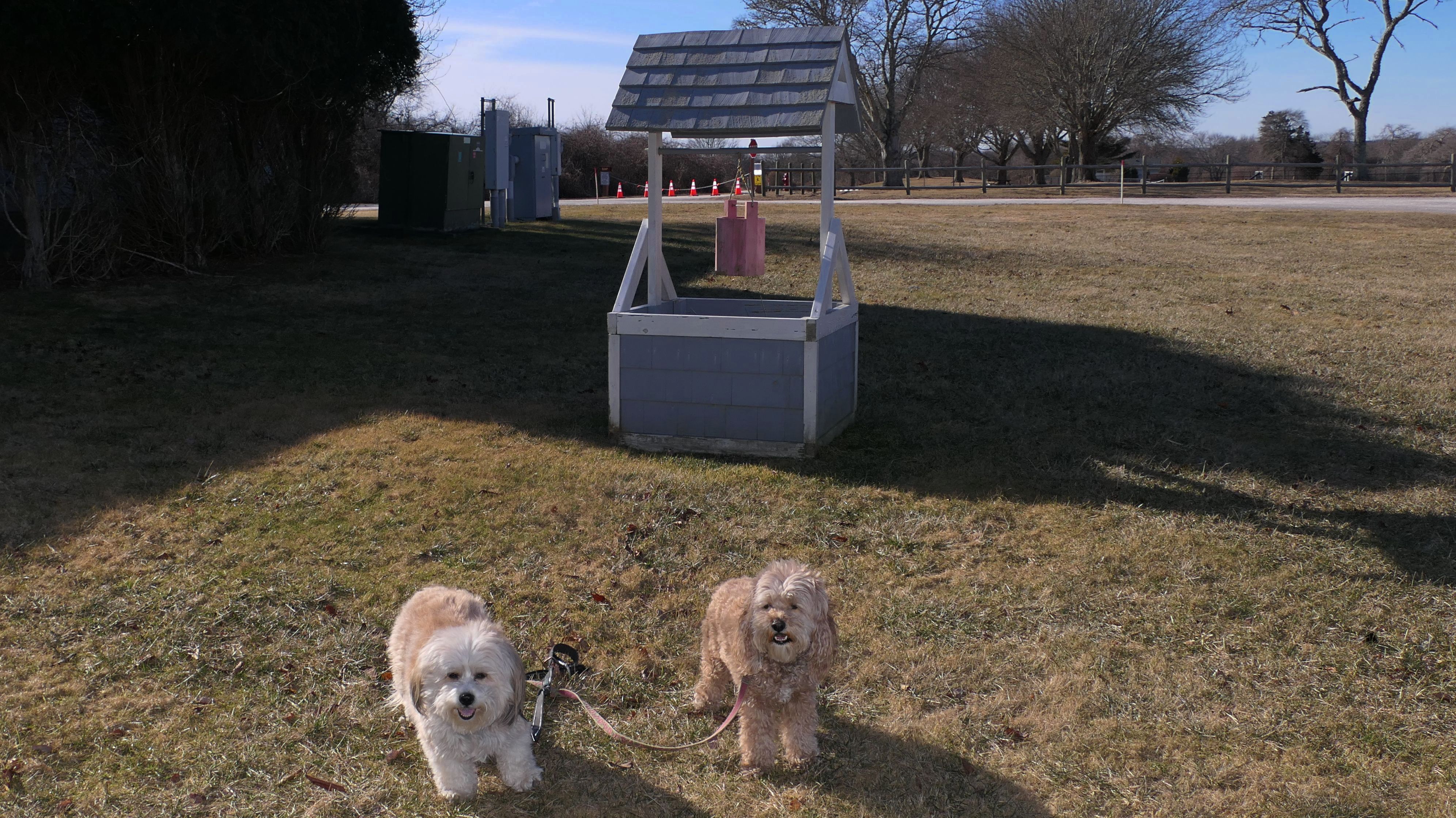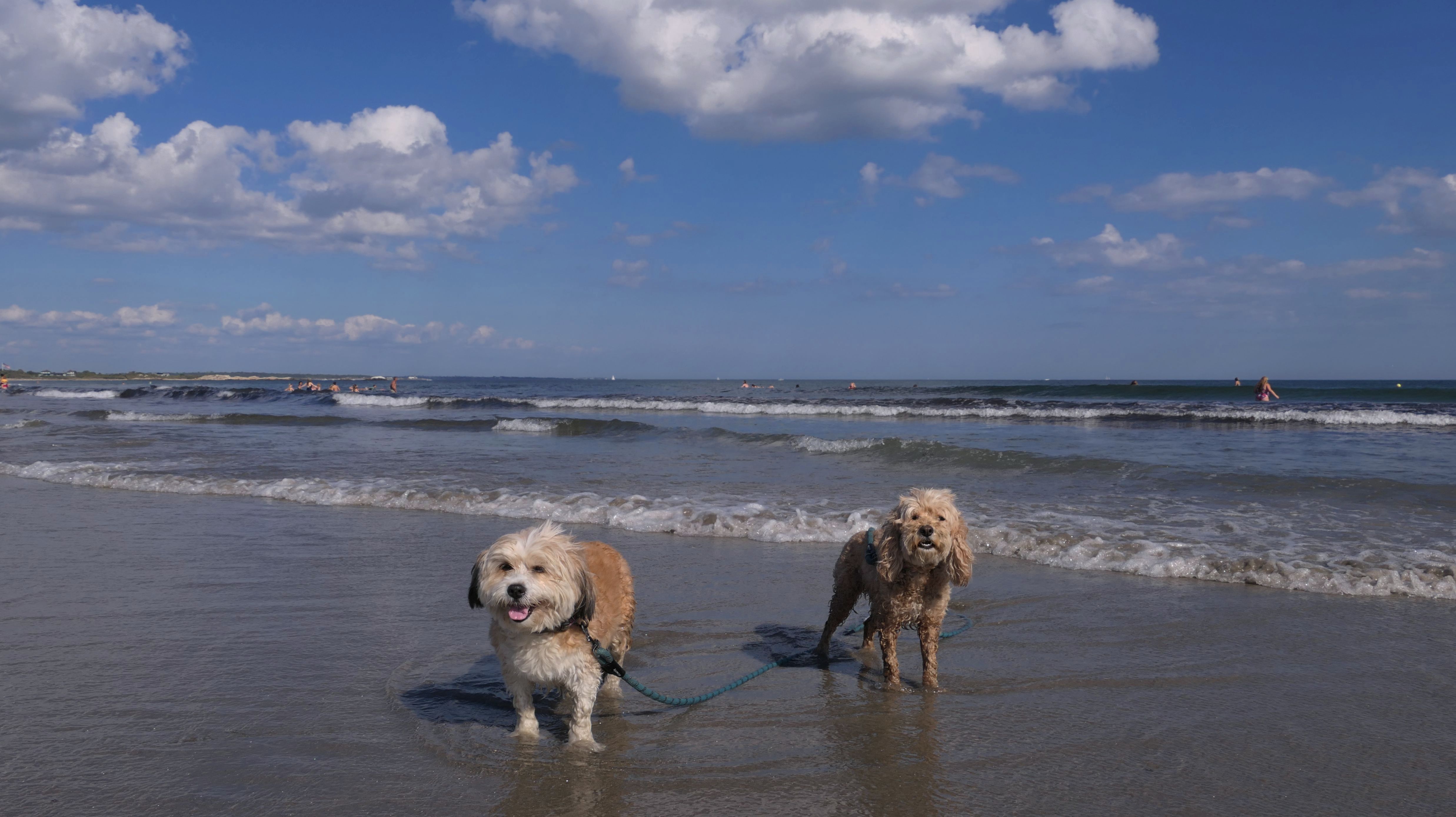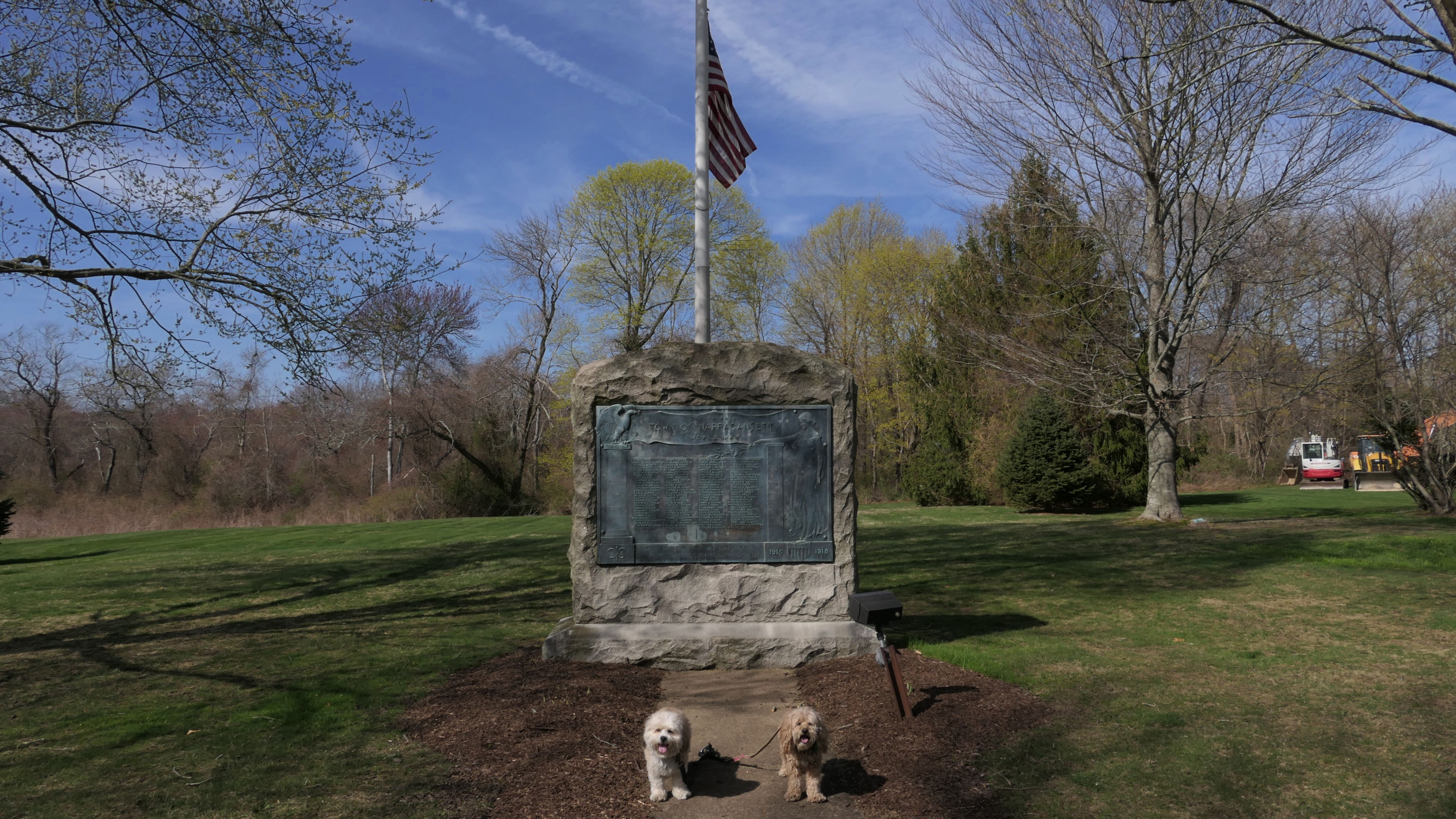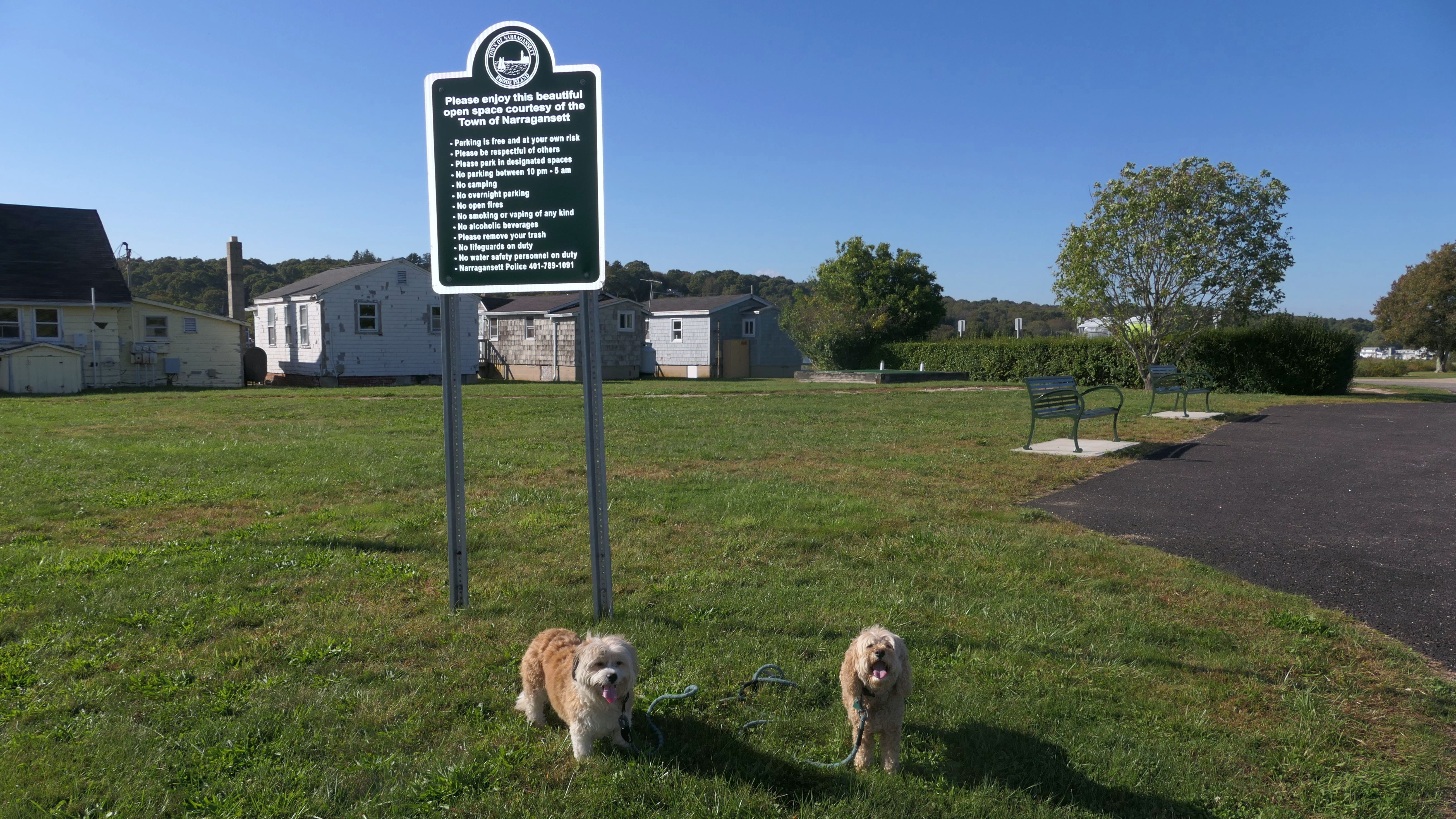 This might be the best beach we visited yet! Dogs are only allowed from September 16 through May 15. The beach is techincally "closed" from the day after Labor Day until Memorial Day Weekend, but that just means there are no life guards I guess, because the place was packed. It was another great day weather-wise. It seemed like it was a bit cool for humans on the beach. It was only in the upper 60's, but that didn't seem to stop anyone. There were plenty of people in the water, sunbathing, and walking their dogs. It looks like they stop collecting parking fees at the main lot after Labor Day, so that may have led to the amount of people as well. We arrived just before 3PM, and had to park on a nearby road because the lot was full. We walked the length of the beach and back. The sand was very nice here. Not rocky like some of the beaches. There were less people at the north end of the beach, so it was easier to get pictures of the dogs with less distractions. I guess that part of the beach is "Conochet Club Beach". There was some sort of event going on near the North Beach Clubhouse. There was a band playing and food trucks. There is also a small grassy area in front of the beach labeled "Pettaquamscutt Park" on some maps. This area is the home of the "Canonchet Memorial", which includes two statues. The dogs got to cool off in the water too! A good time was had by all!