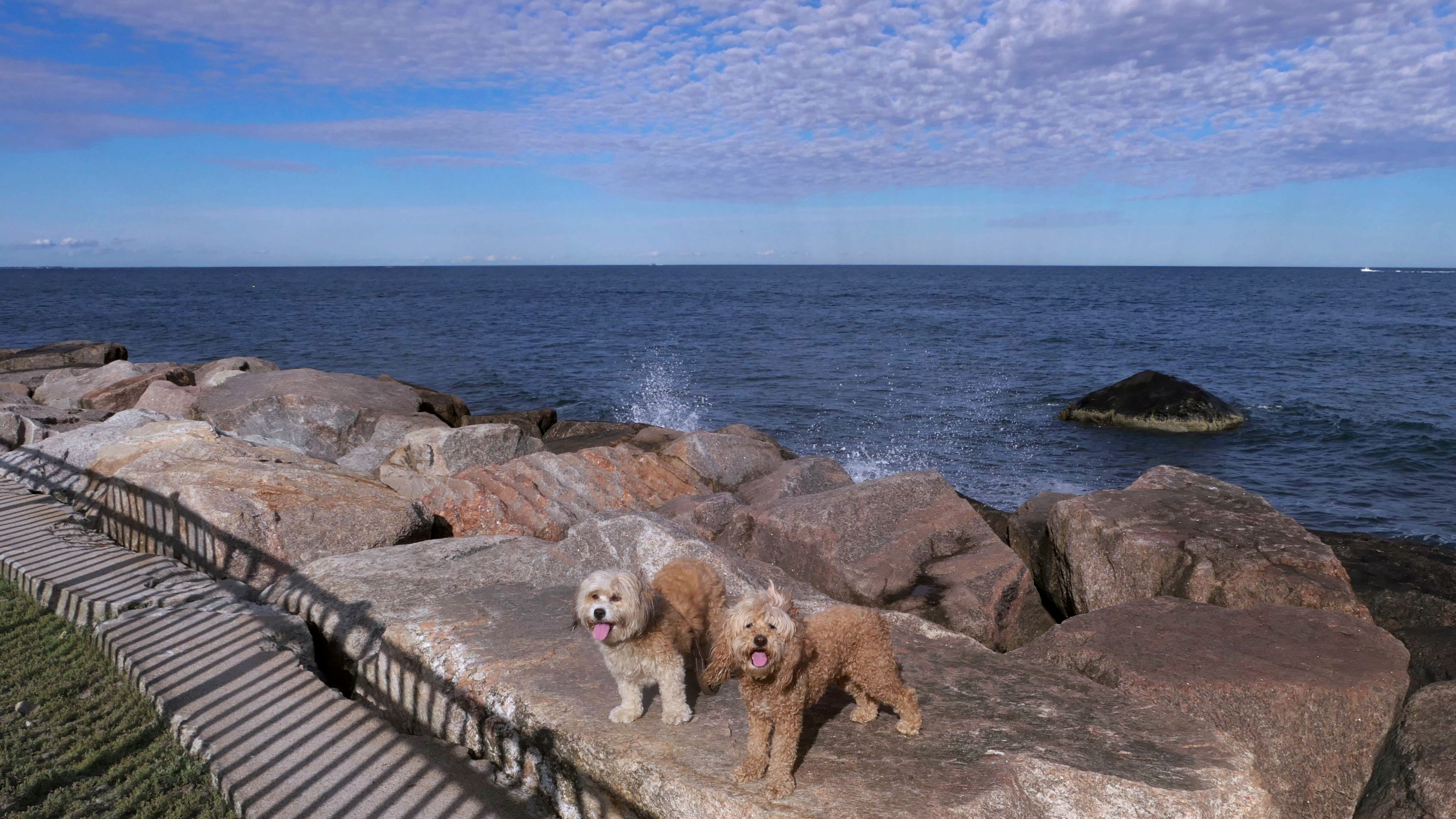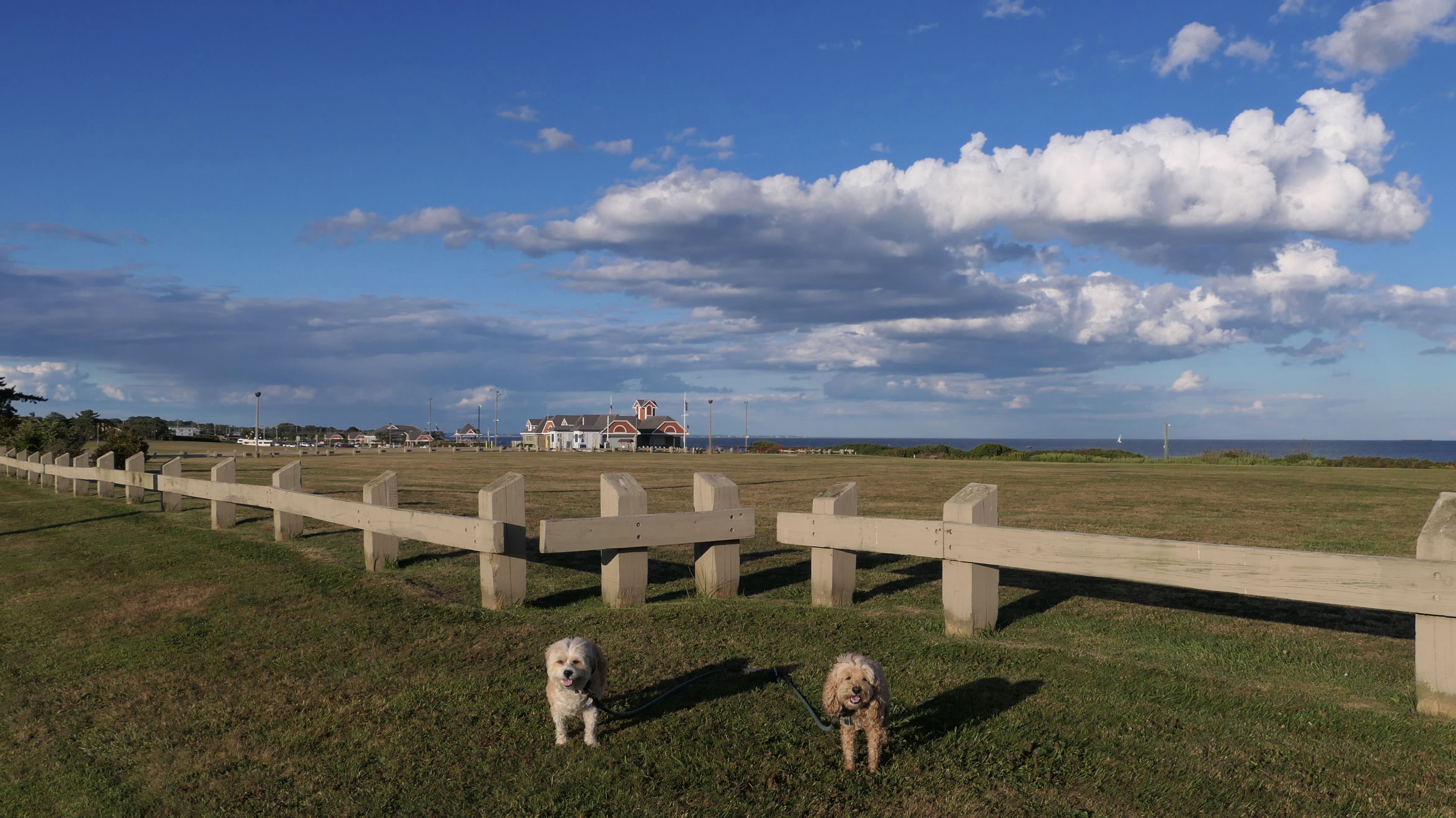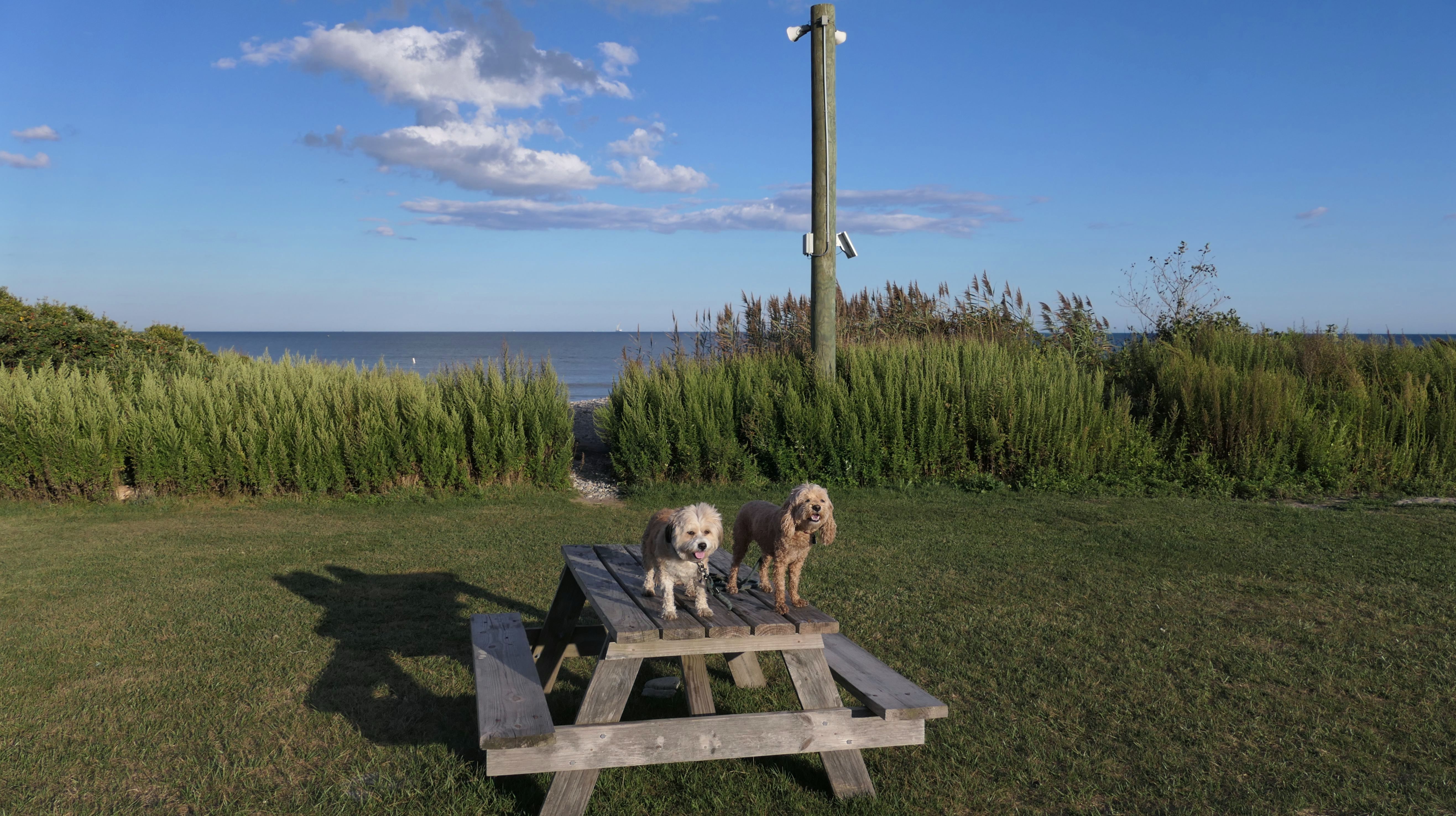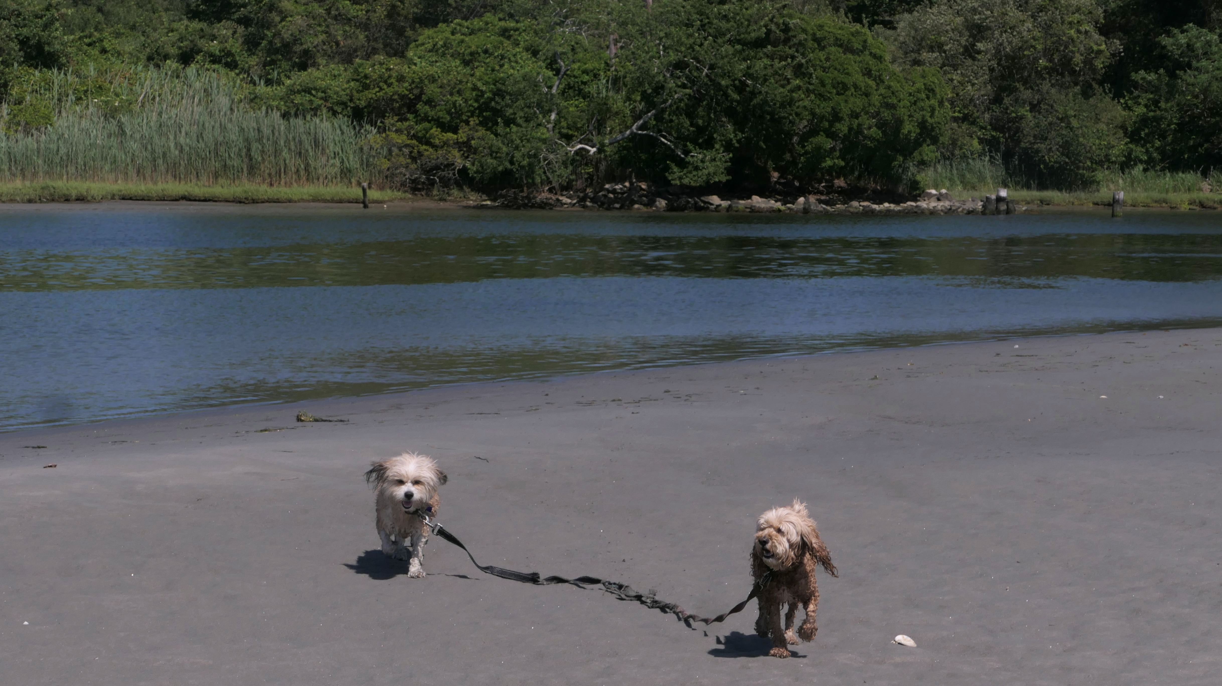 This is one of our favorite spots in the area. For this visit, there was wildfire smoke in the upper atmosphere that really dimmed the sunlight. We walked on the jetty a bit, the dogs cooled off, and then they played on the beach. We also took a walk to Rose Nulman Park and back.