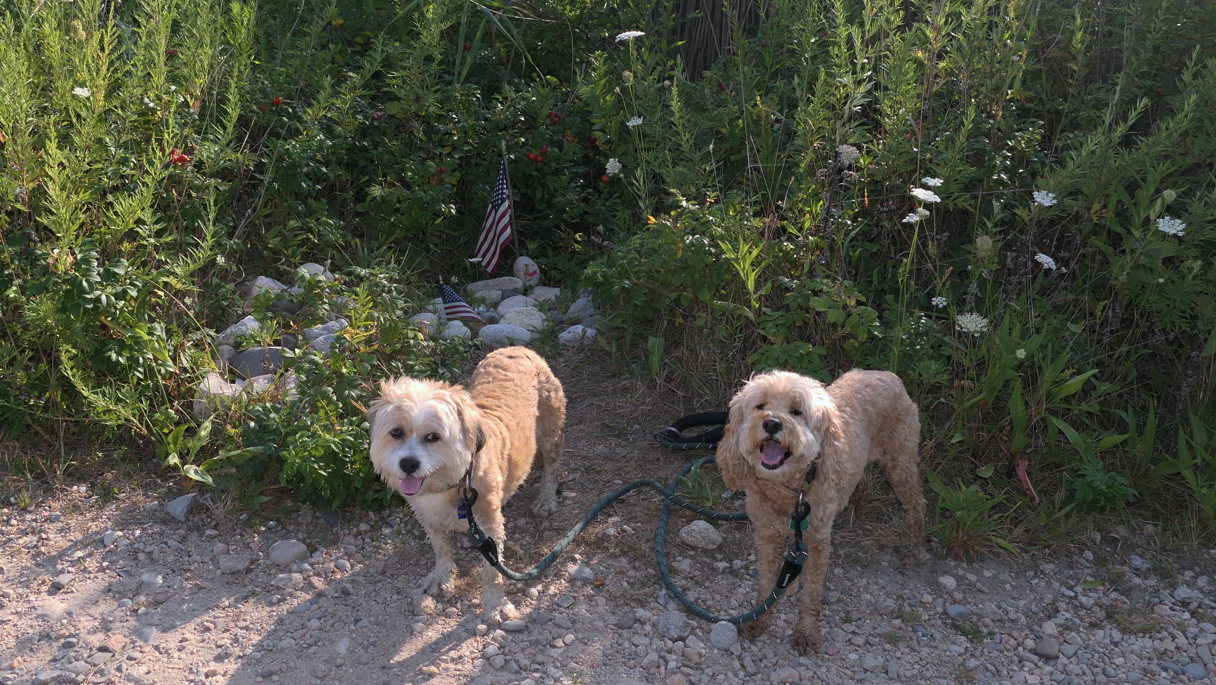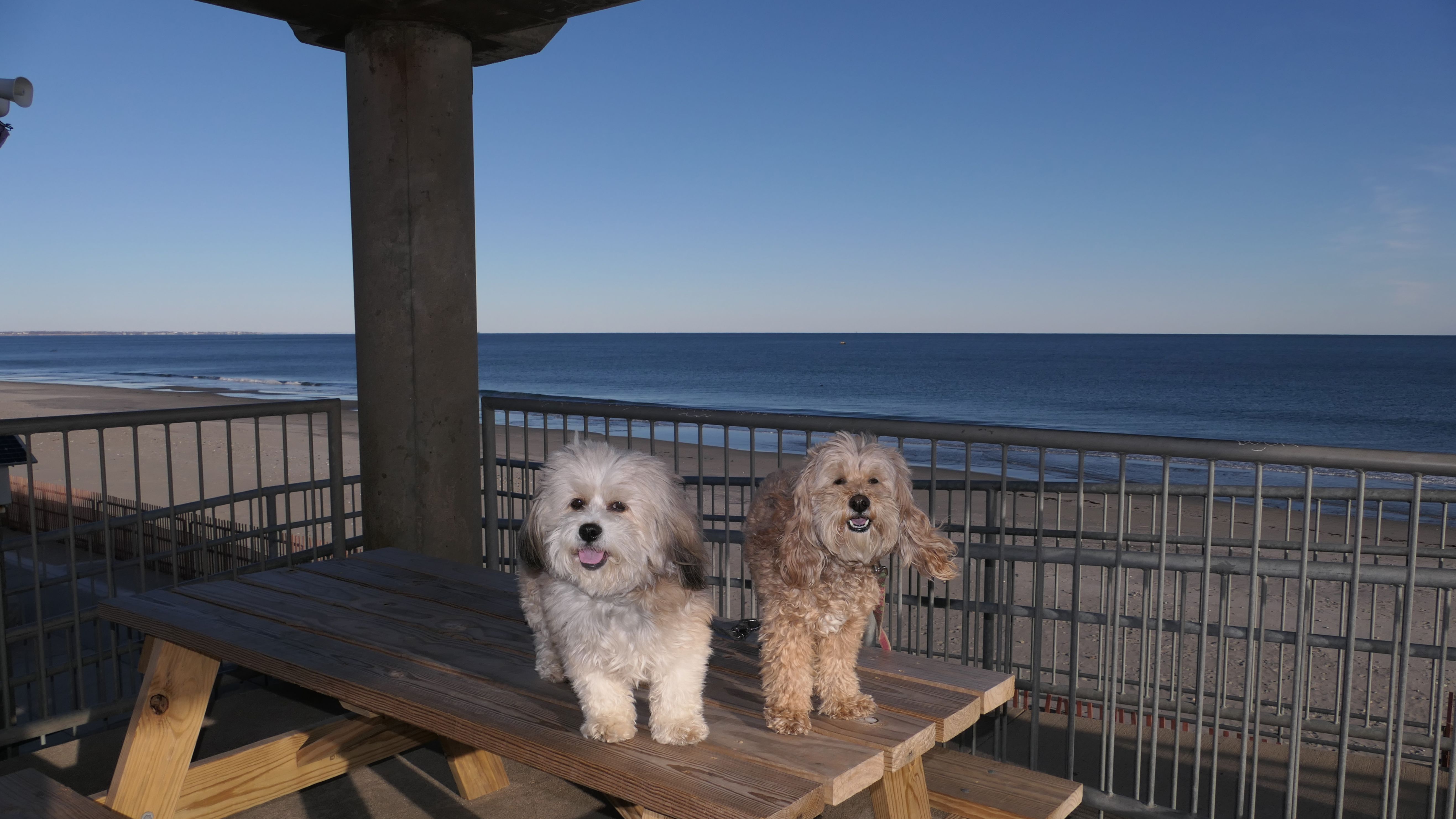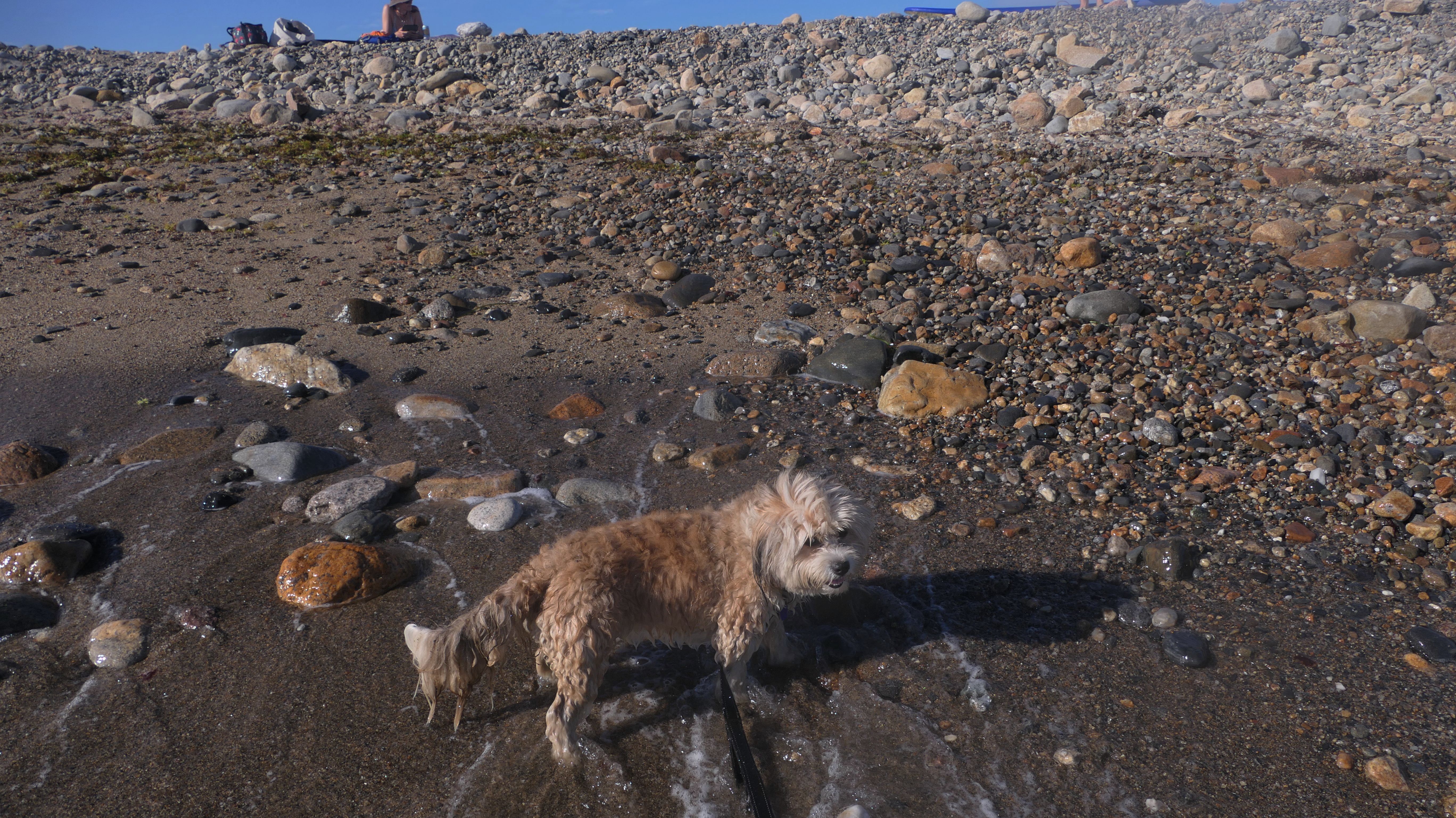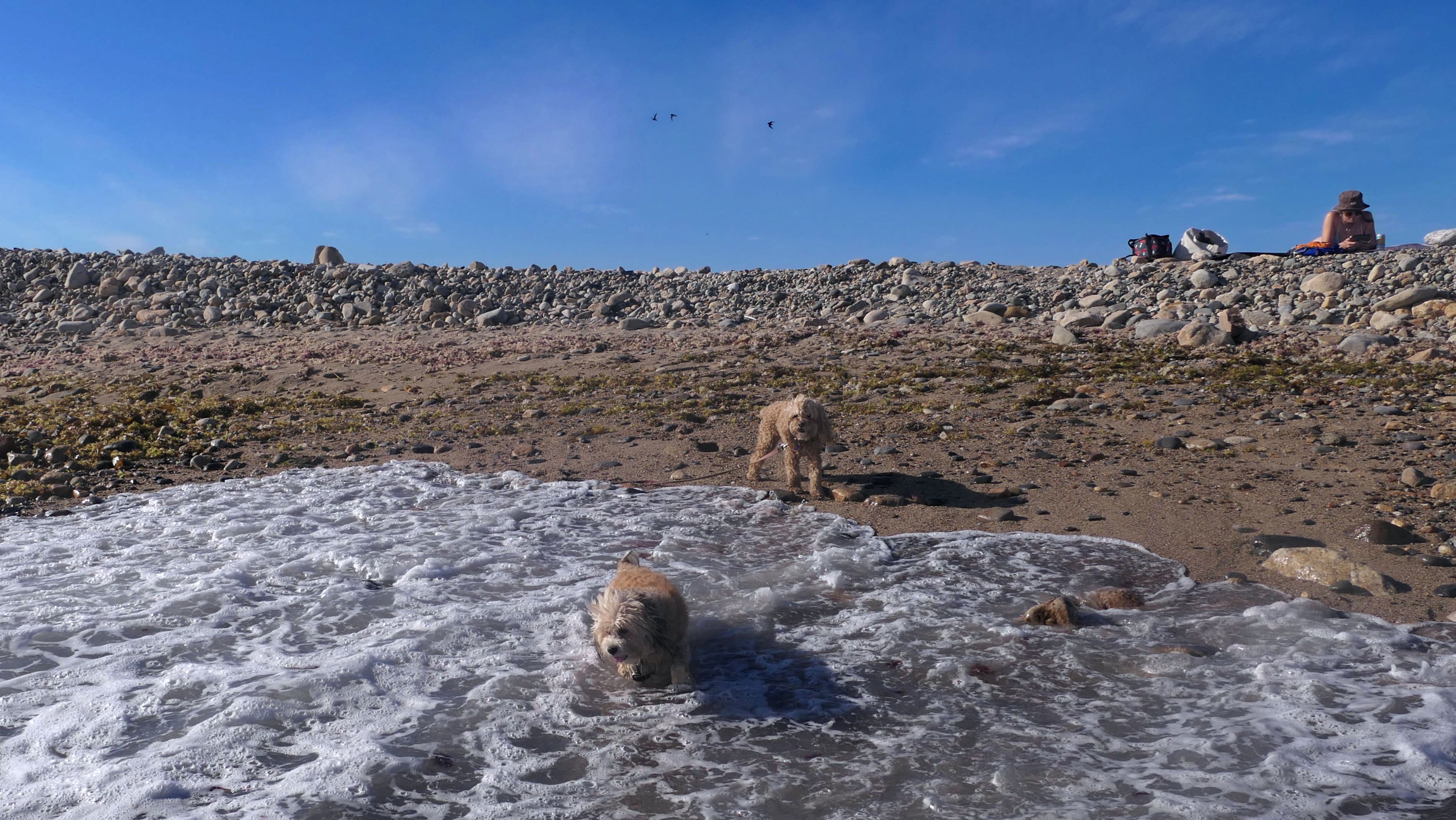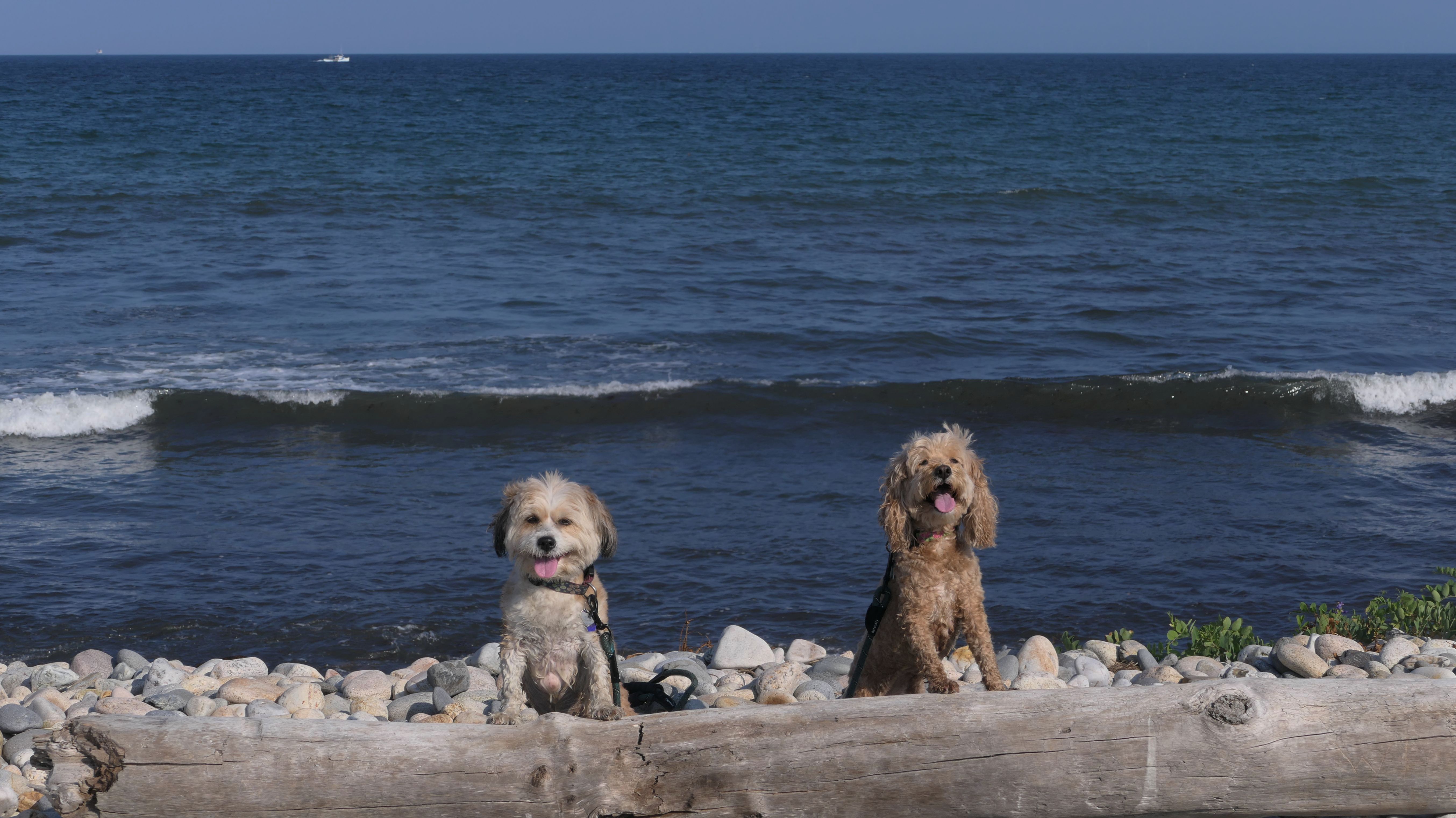 This is one of our favorite spots in the area. For this visit, there was wildfire smoke in the upper atmosphere that really dimmed the sunlight. We walked on the jetty a bit, the dogs cooled off, and then they played on the beach. We also took a walk to Rose Nulman Park and back.