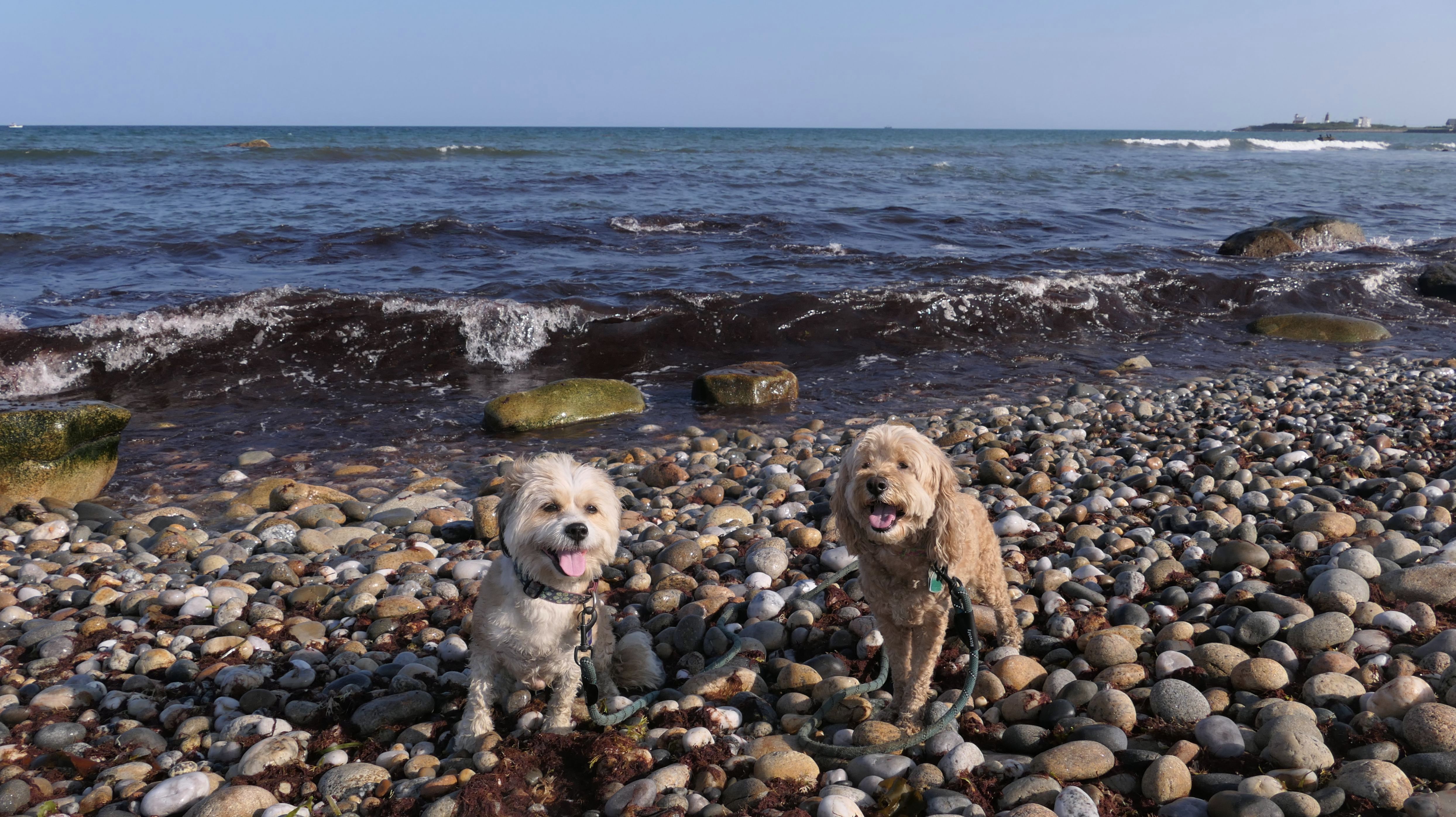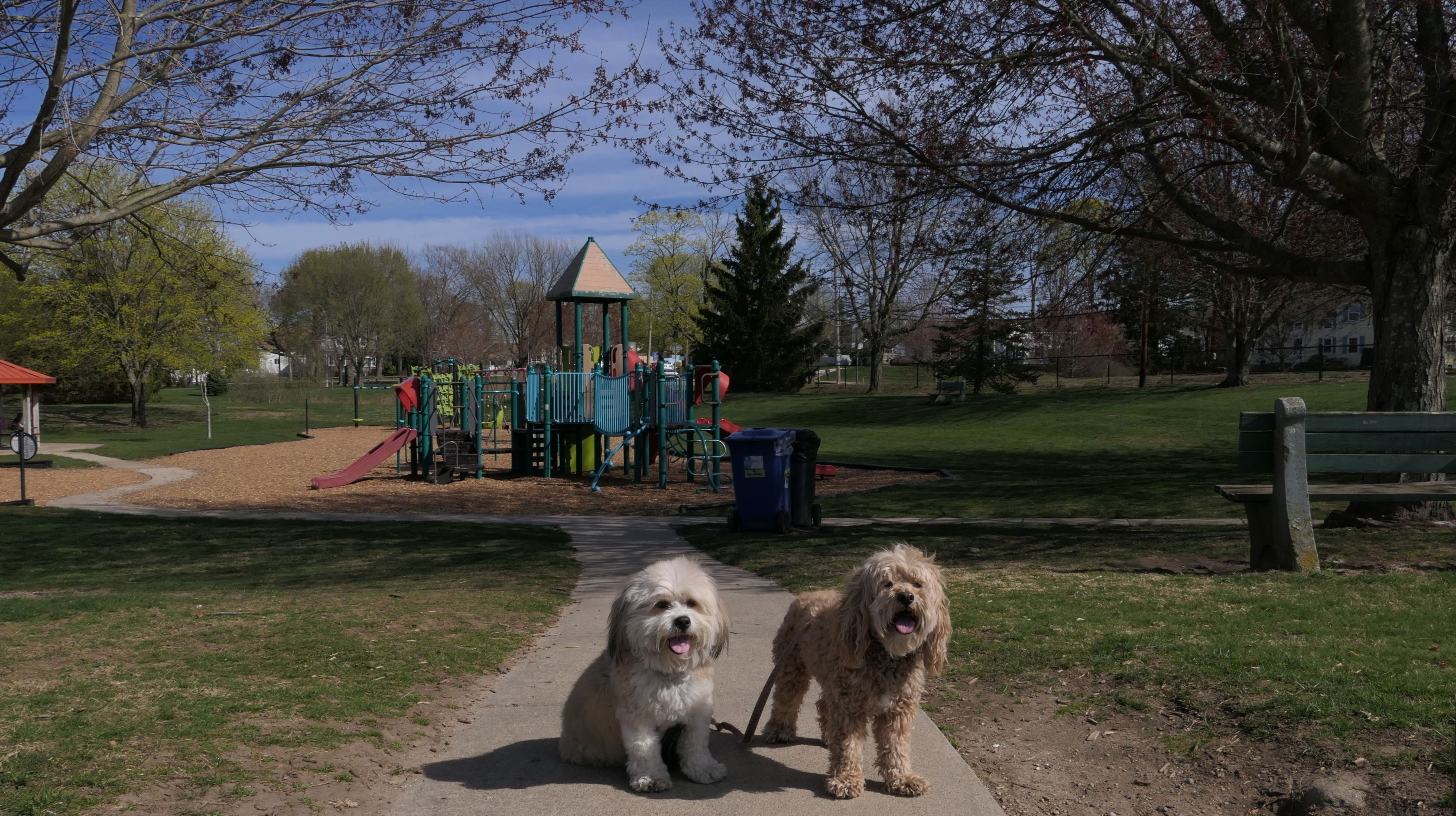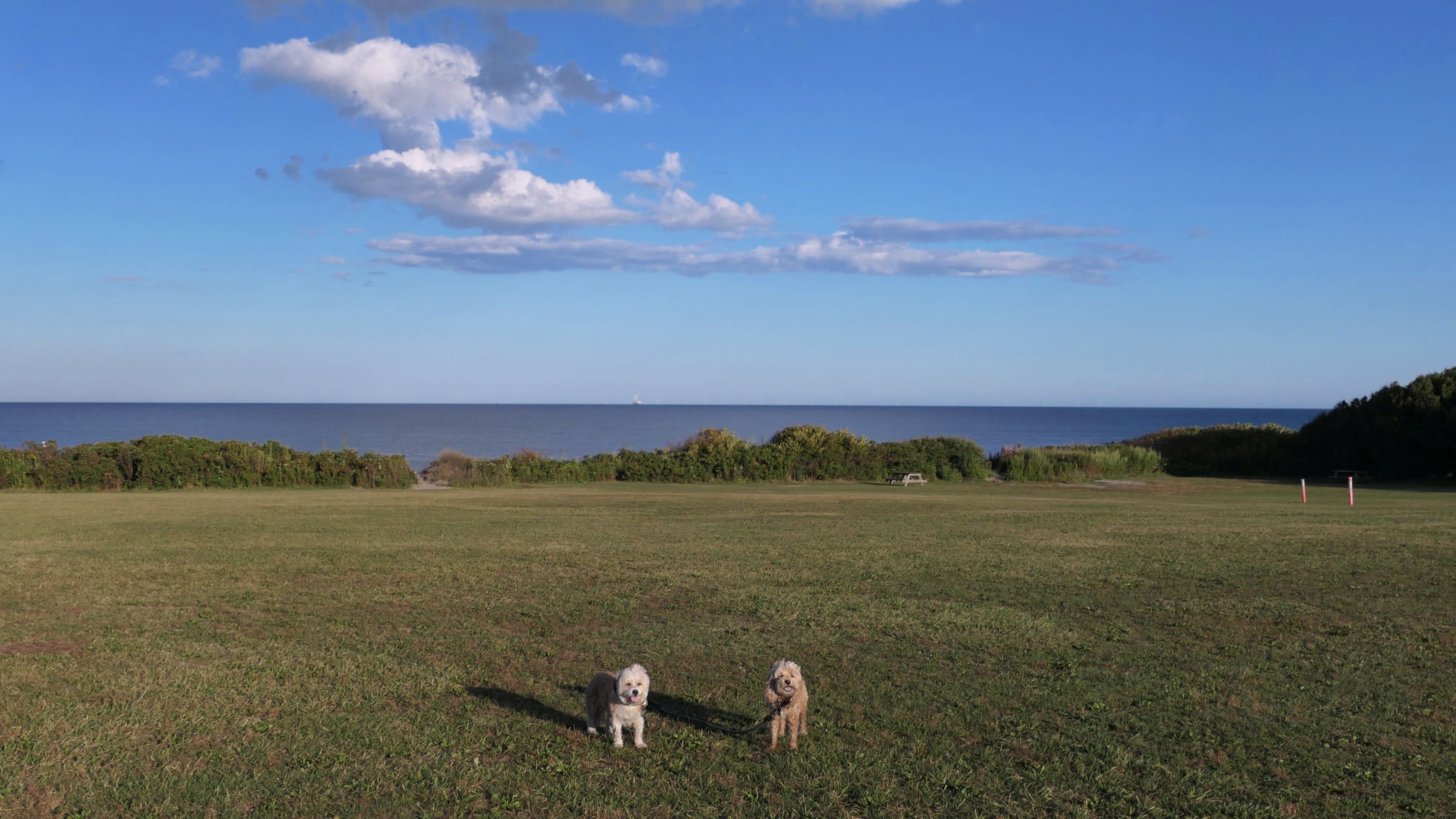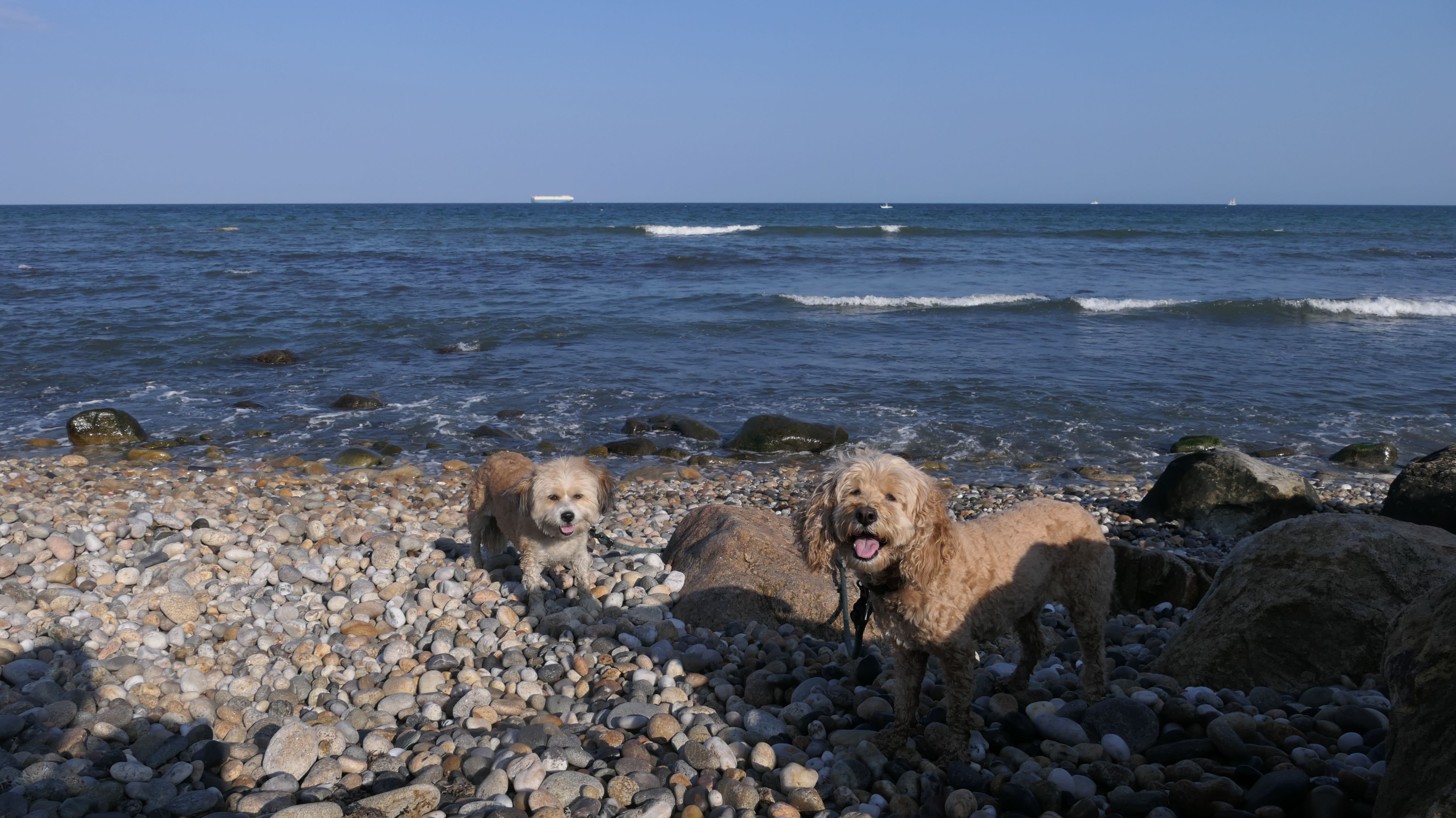 This is one of our favorite spots in the area. For this visit, there was wildfire smoke in the upper atmosphere that really dimmed the sunlight. We walked on the jetty a bit, the dogs cooled off, and then they played on the beach. We also took a walk to Rose Nulman Park and back.