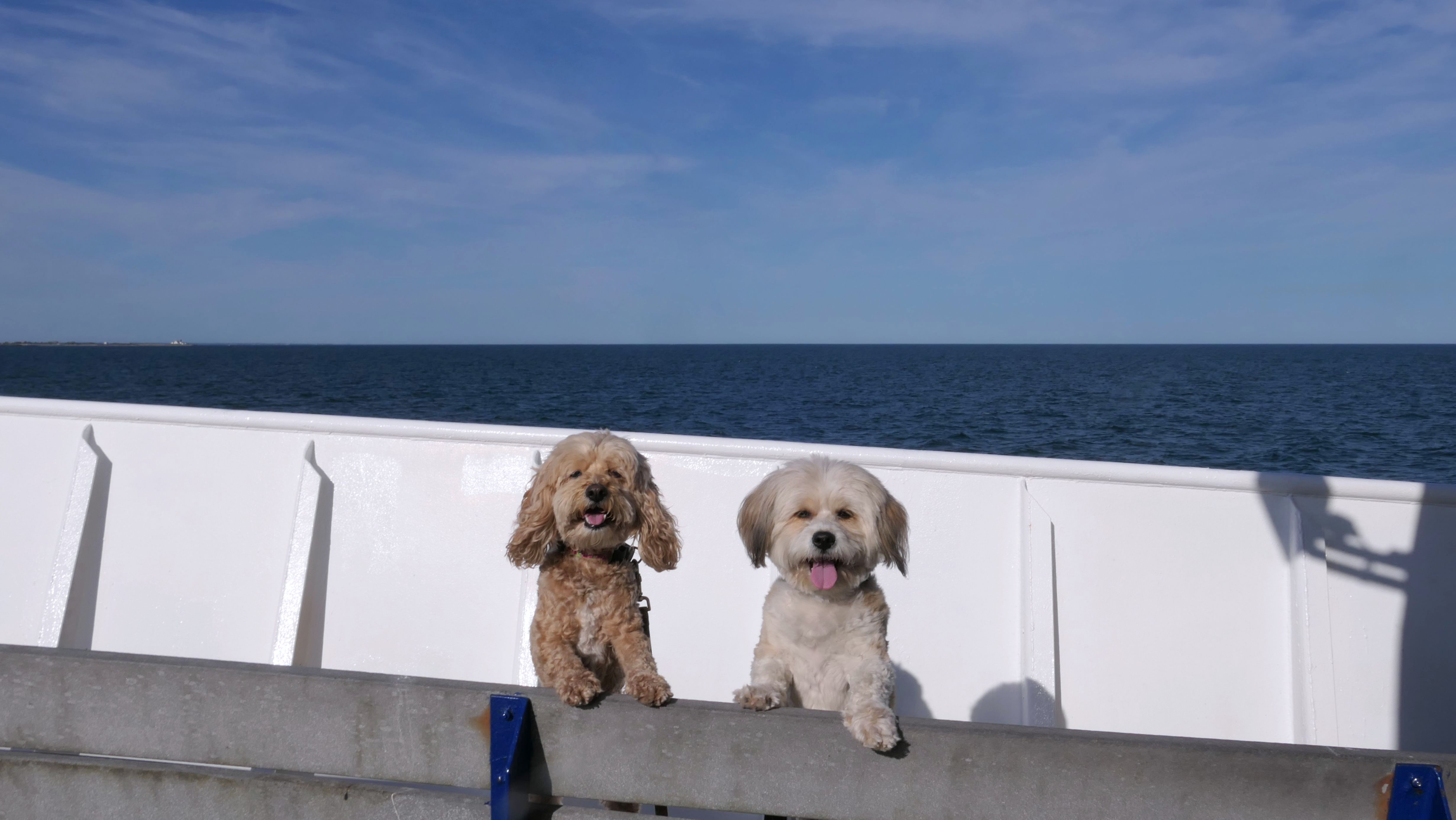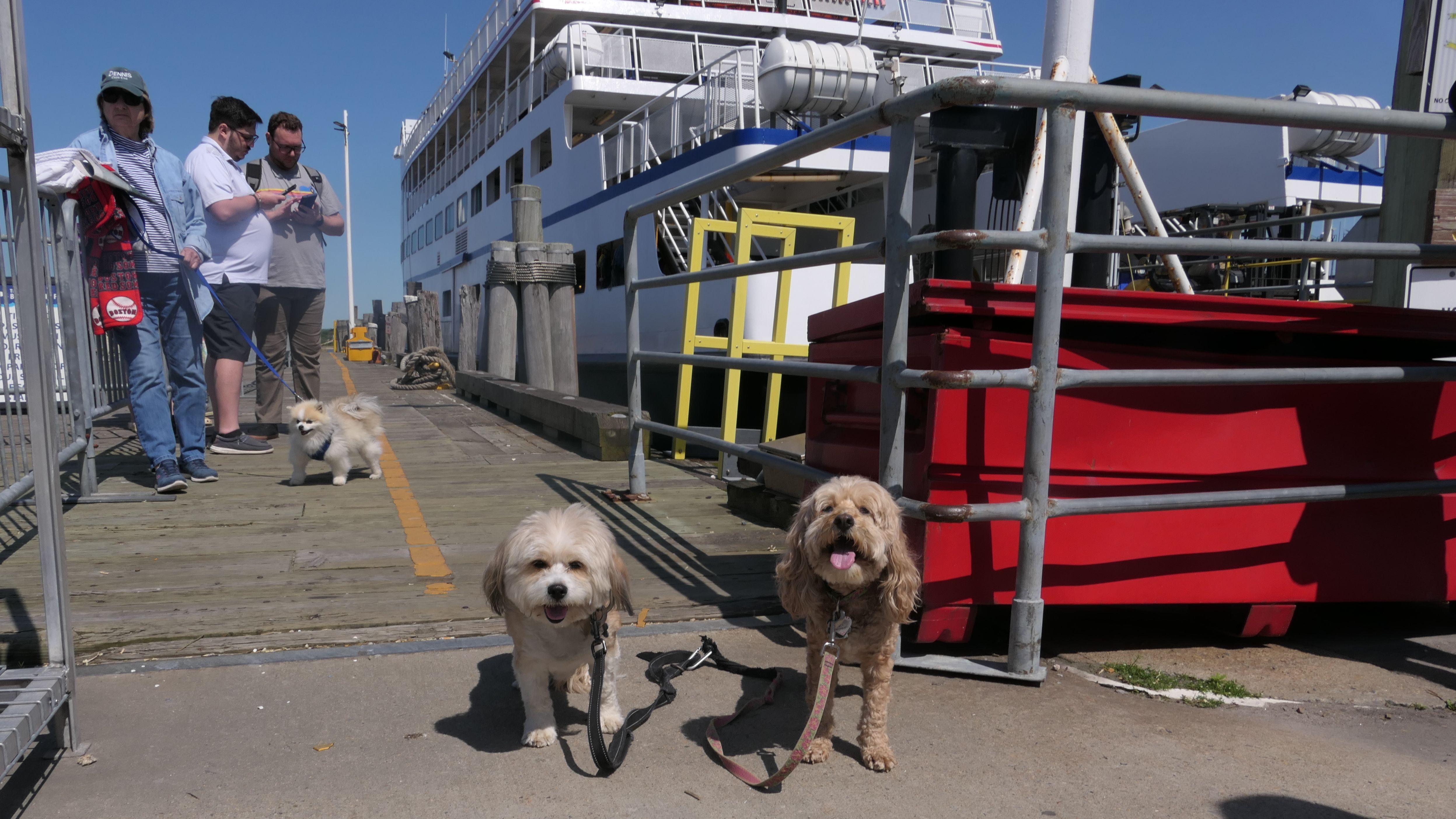 In order to visit every town in Rhode Island, we need to take a boat to get to New Shoreham (aka Block Island). So we arrived at Point Judith to take the Block Island Ferry to New Shoreham. This was the dogs first trip on a ferry, and Mandy didn't like it all. (No big deal for Lexi!) We took the high speed ferry, and it soon as it started to get moving, she started to shake. Dogs can only be on the outside deck of the ship, and they are not supposed to be on the benches, but I had to put Mandy on my lap to calm her down, which worked.