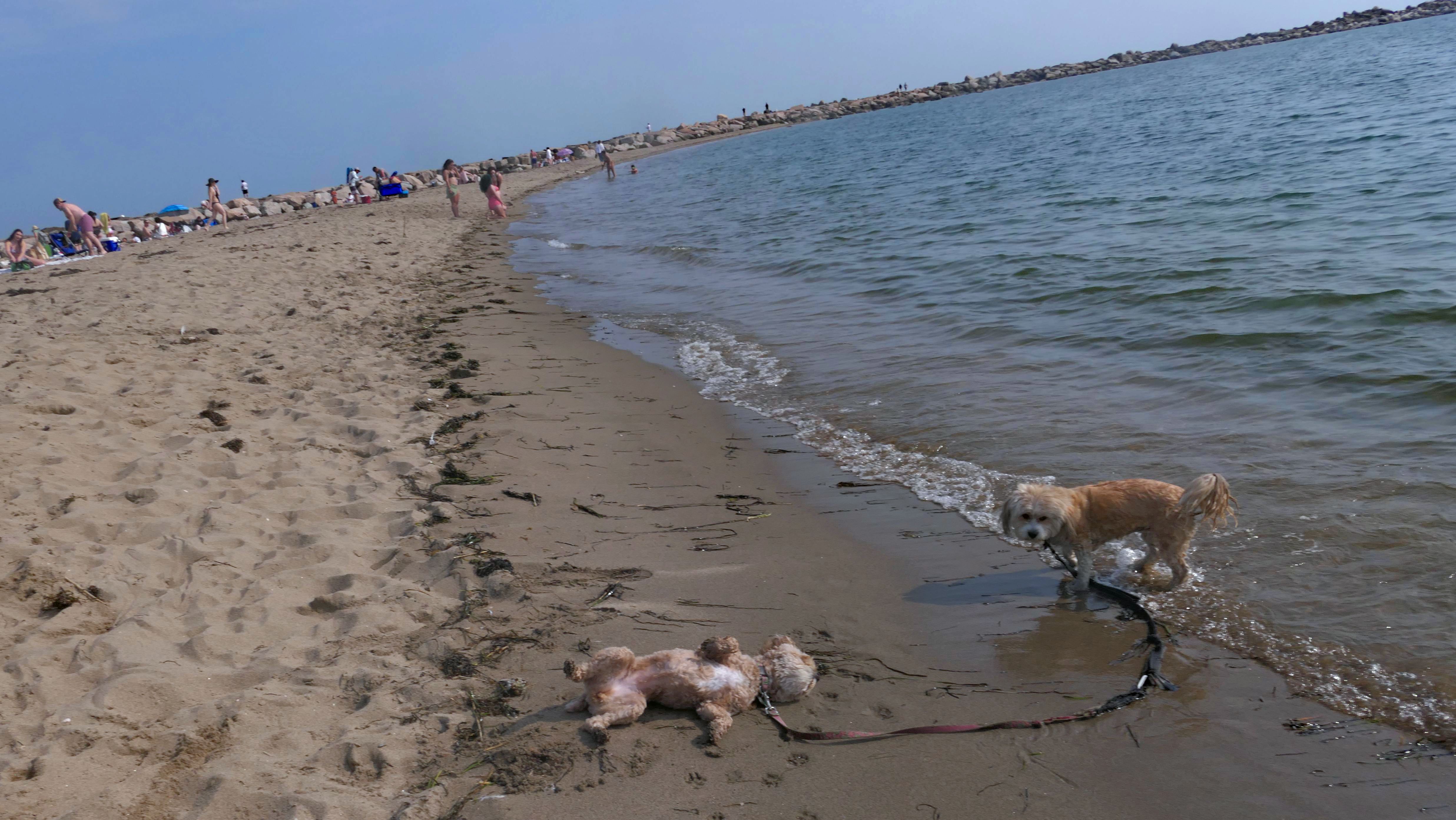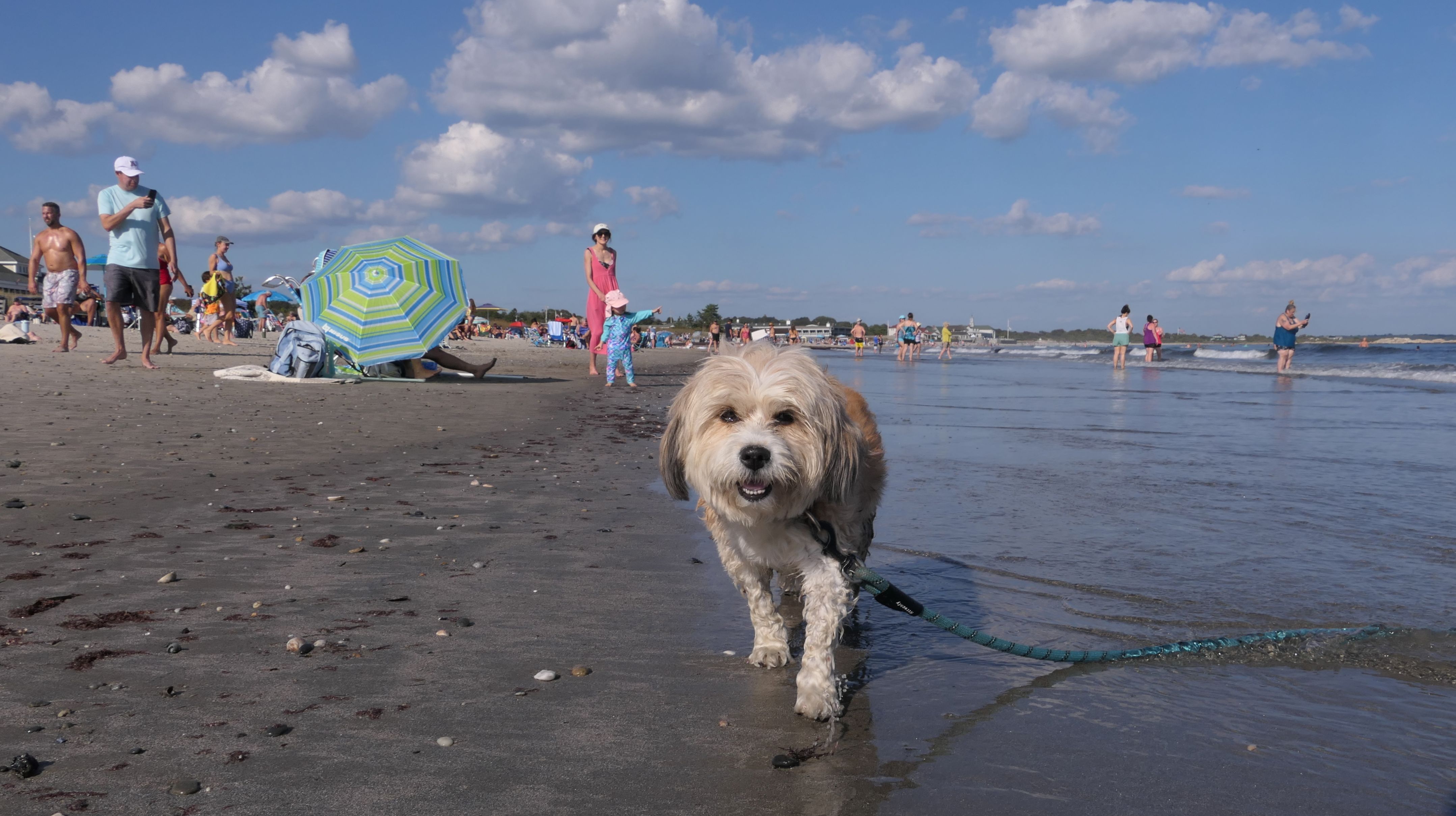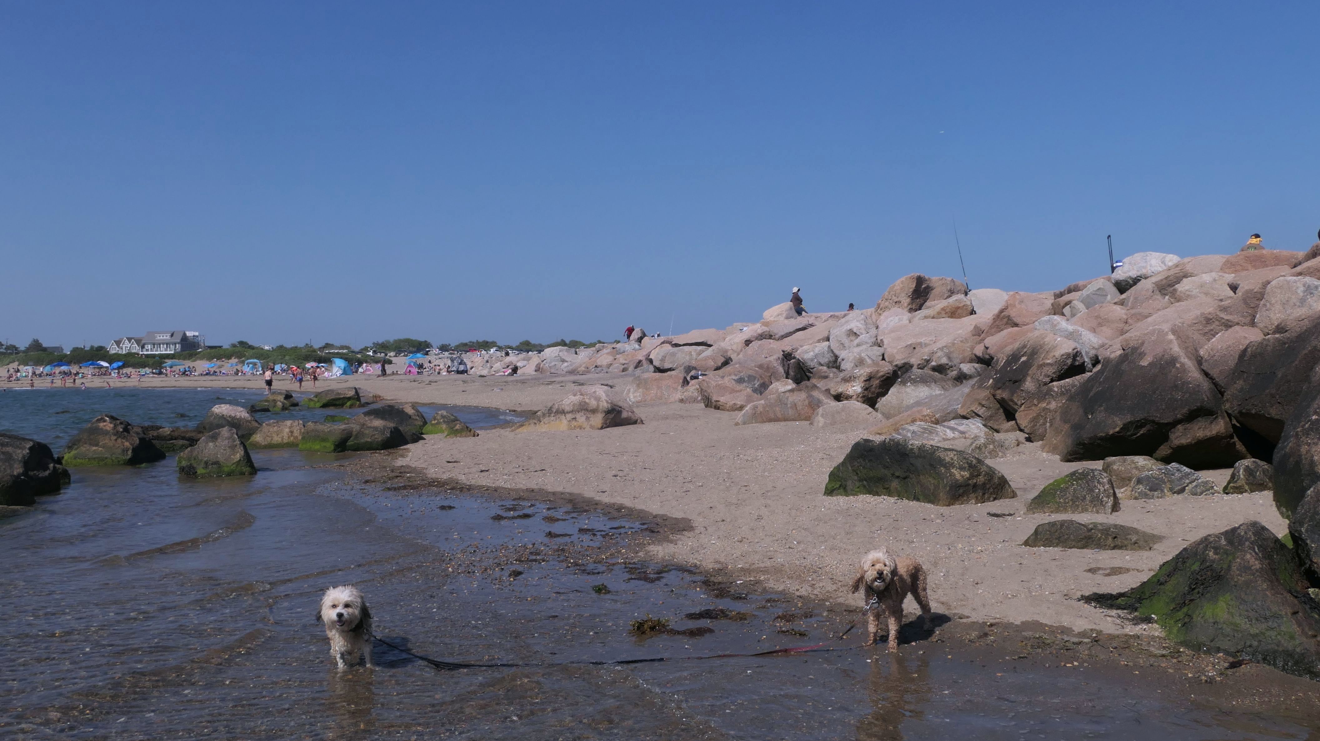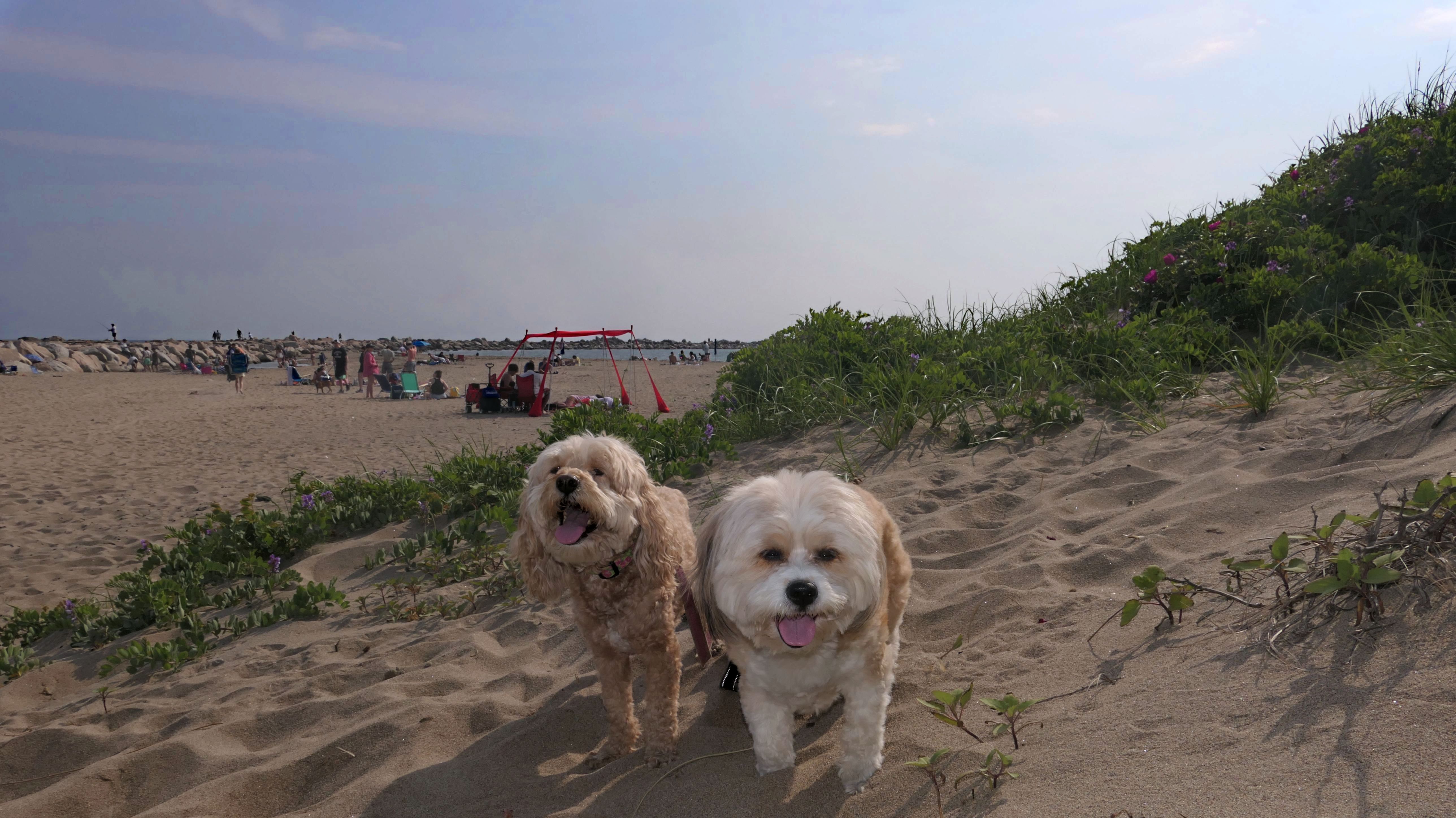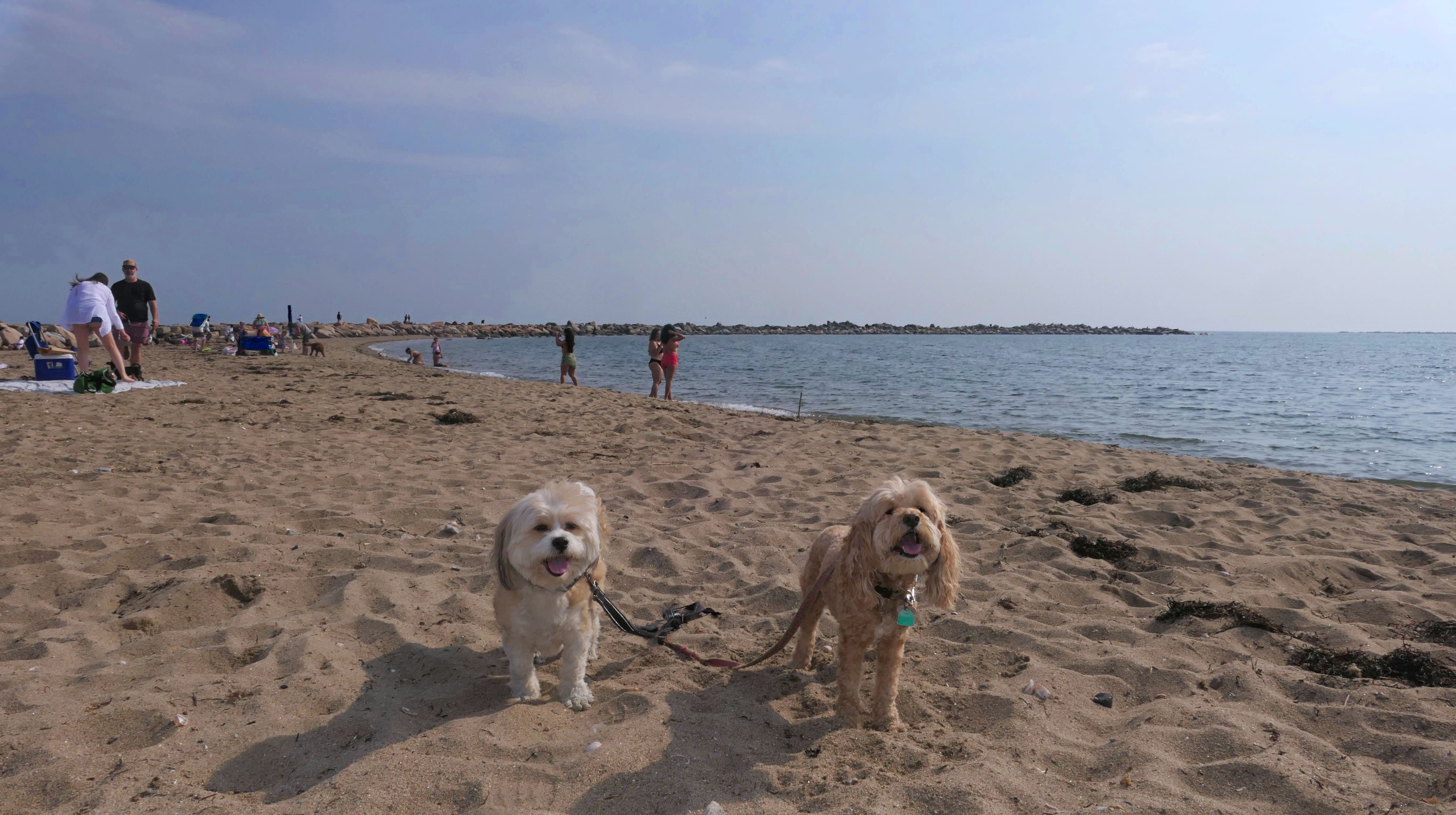 It was a hot day, so we came down to this beach. As mentioned previously on this page, dogs are allowed year round here, and there is no parking fee. The lot was almost full, and the beach was pretty busy. I'm not sure what was going on with the two guys holding woodwind instruments. They weren't playing the instruments, so maybe they were shooting a video. We only stayed about a half hour or so this time around, as it started to get cloudy, so we went somewhere sunnier.