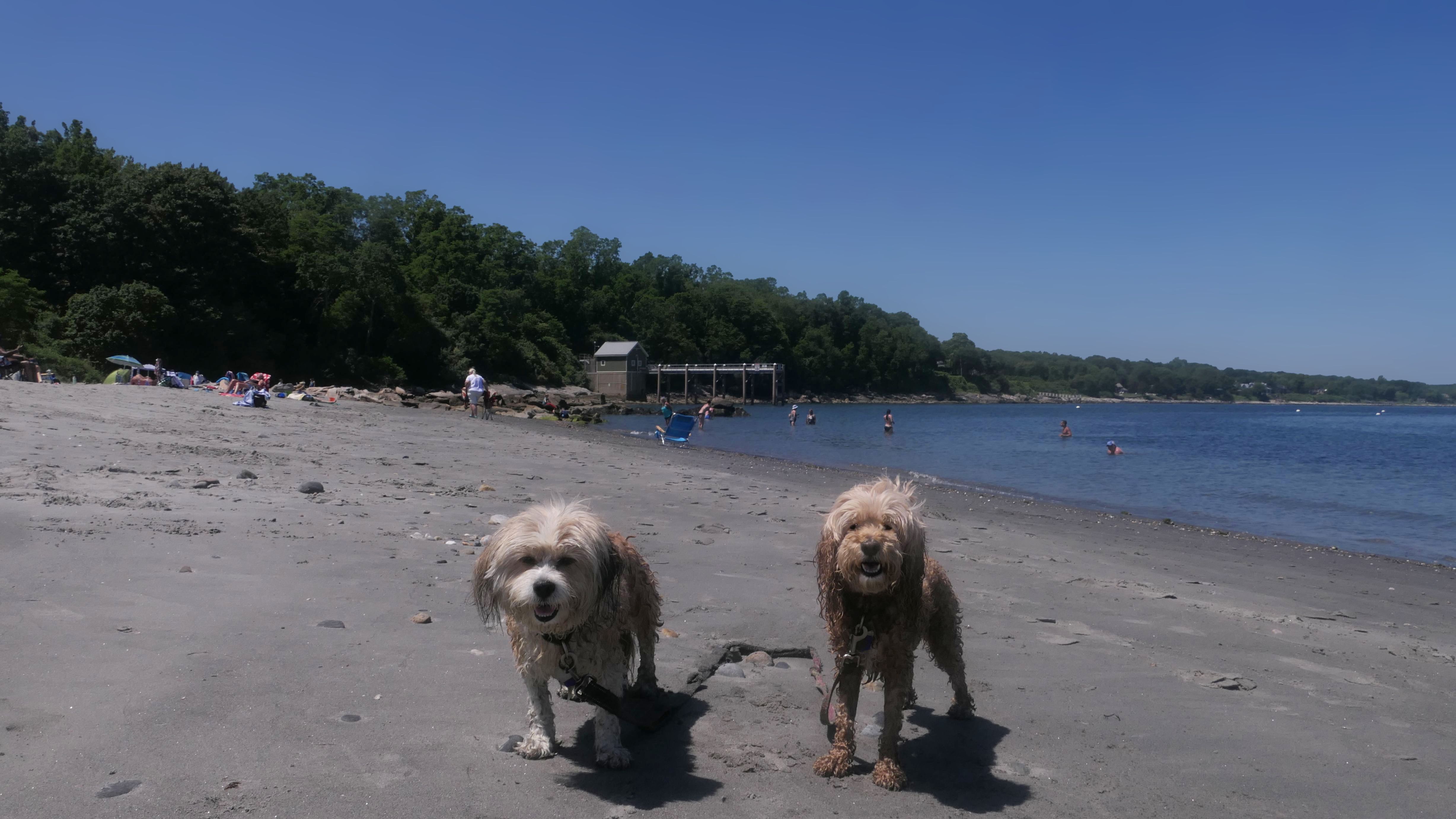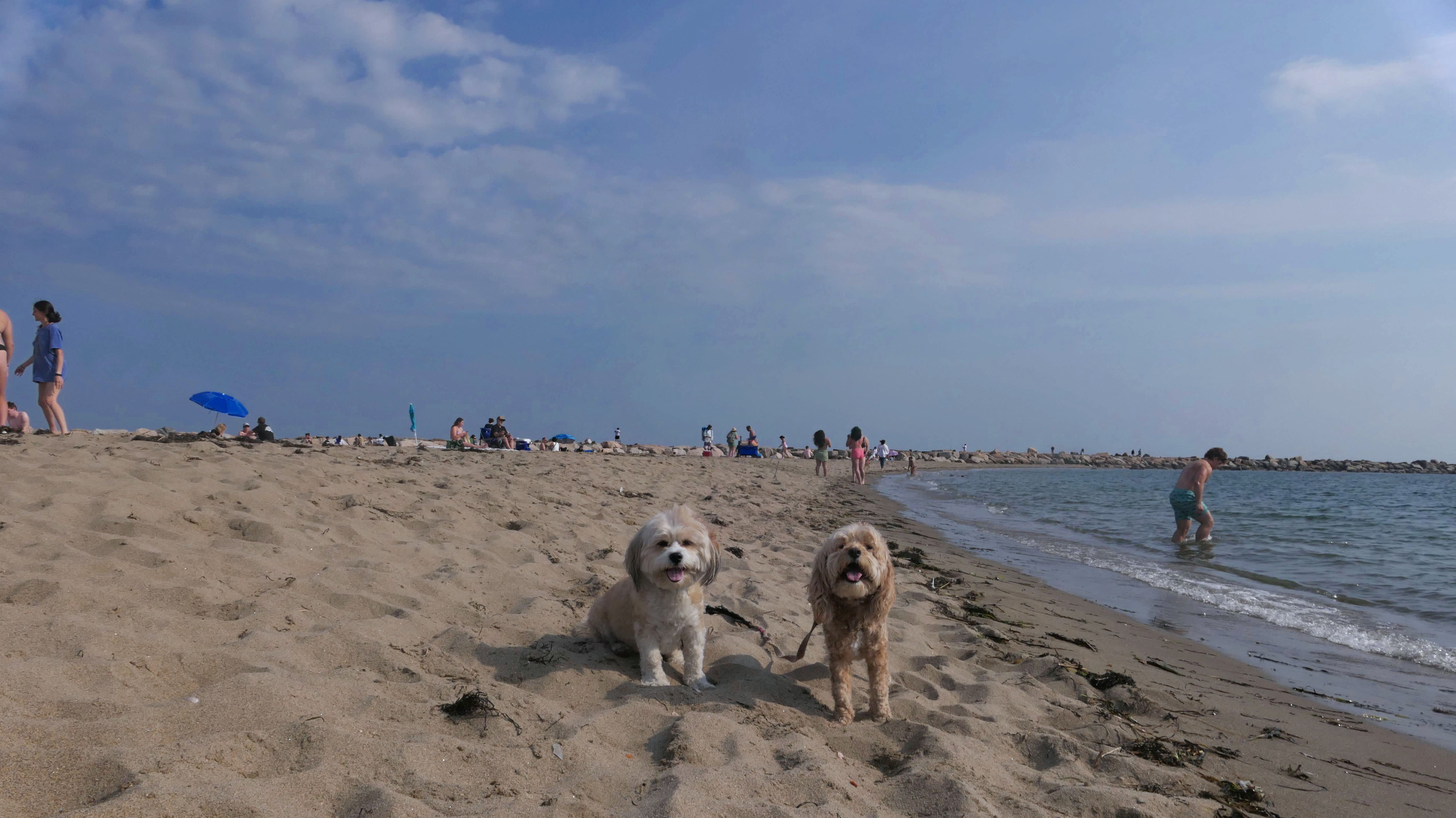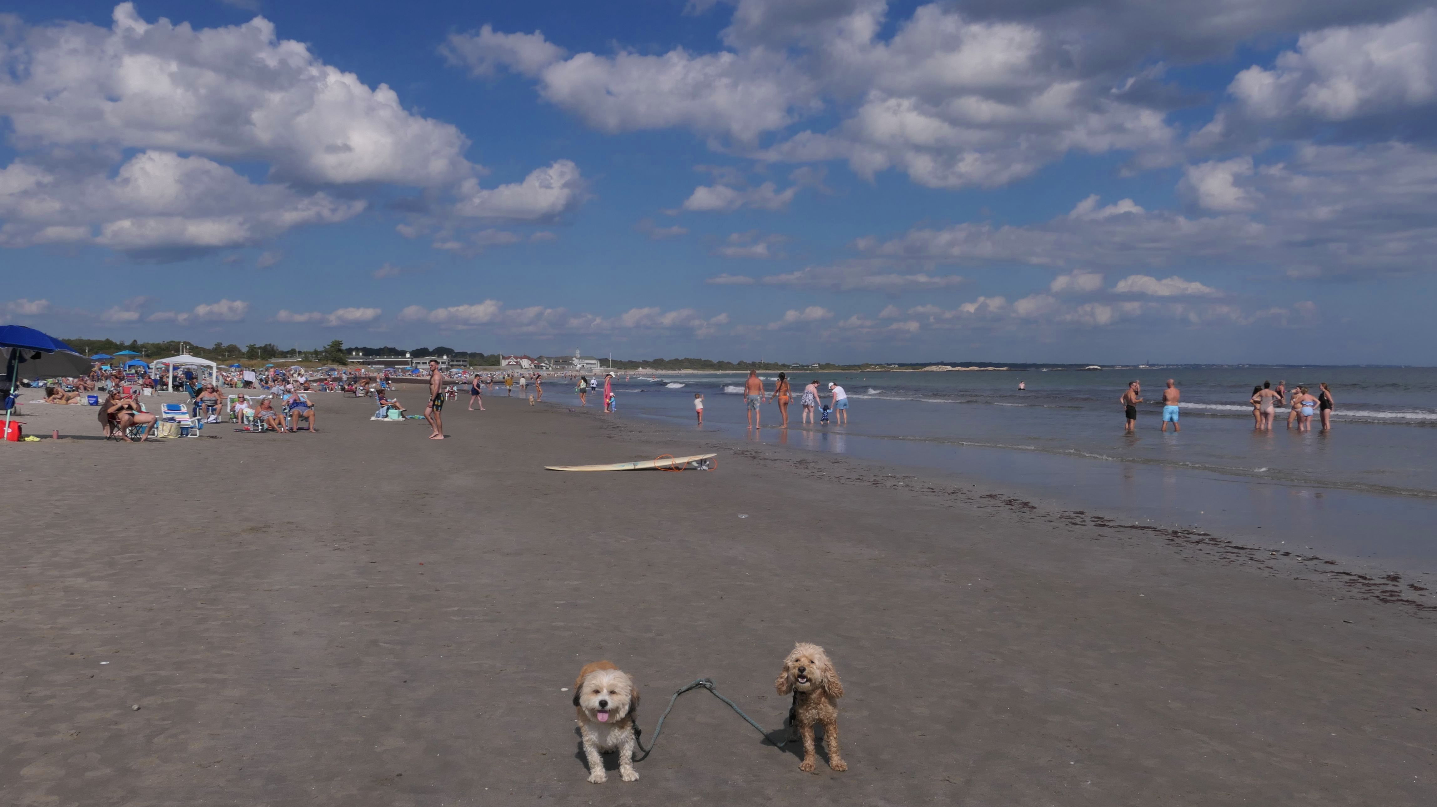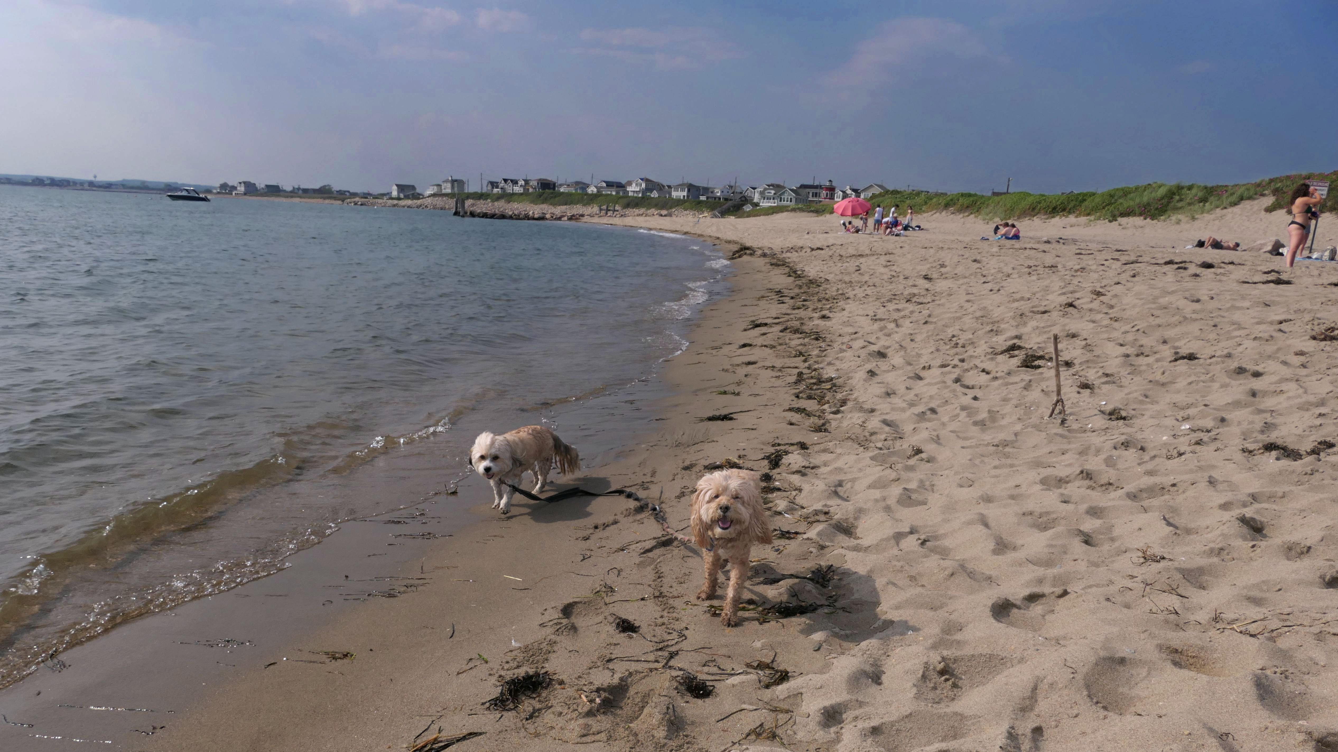 It was a hot day, so we came down to this beach. As mentioned previously on this page, dogs are allowed year round here, and there is no parking fee. The lot was almost full, and the beach was pretty busy. I'm not sure what was going on with the two guys holding woodwind instruments. They weren't playing the instruments, so maybe they were shooting a video. We only stayed about a half hour or so this time around, as it started to get cloudy, so we went somewhere sunnier.