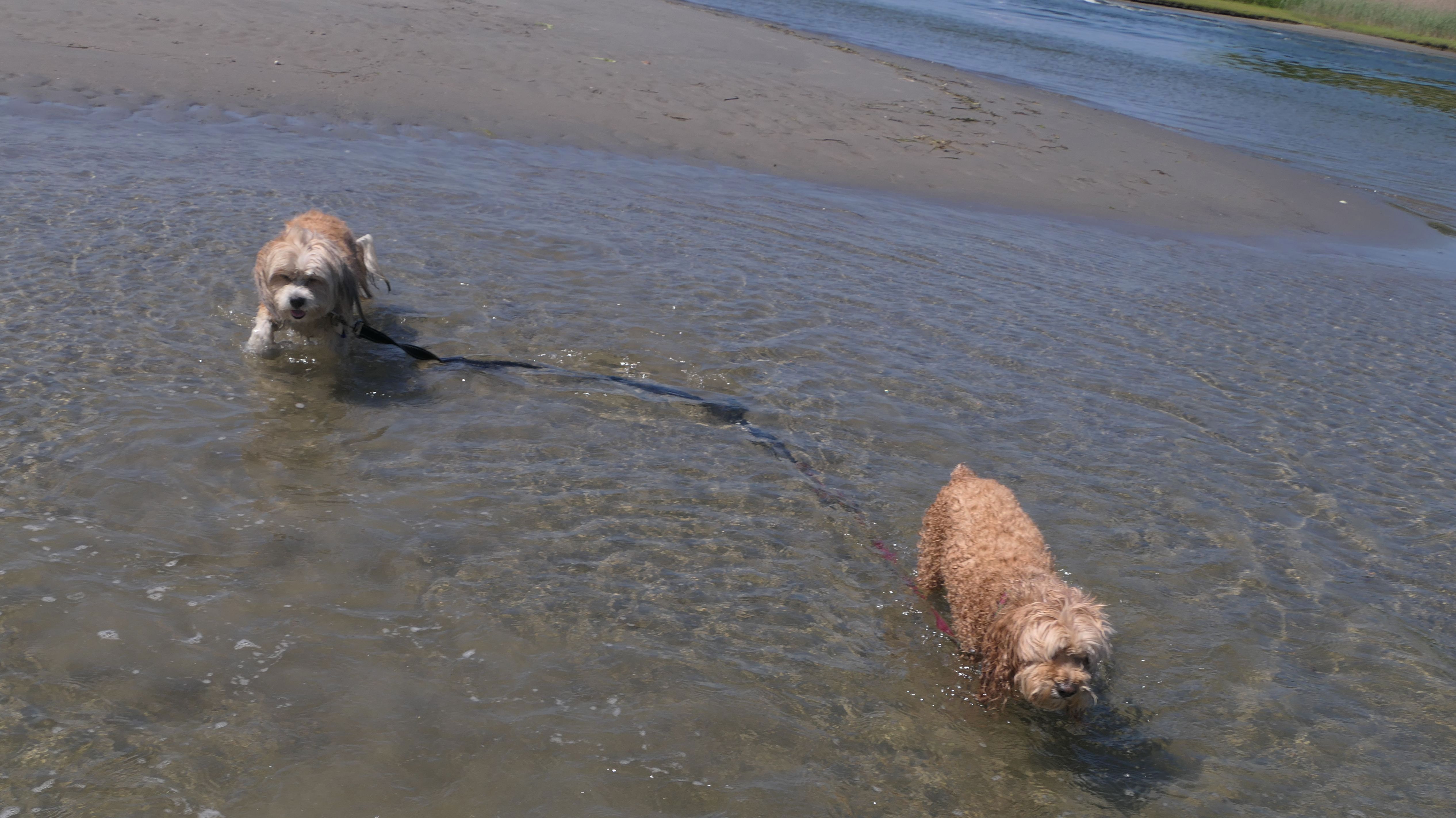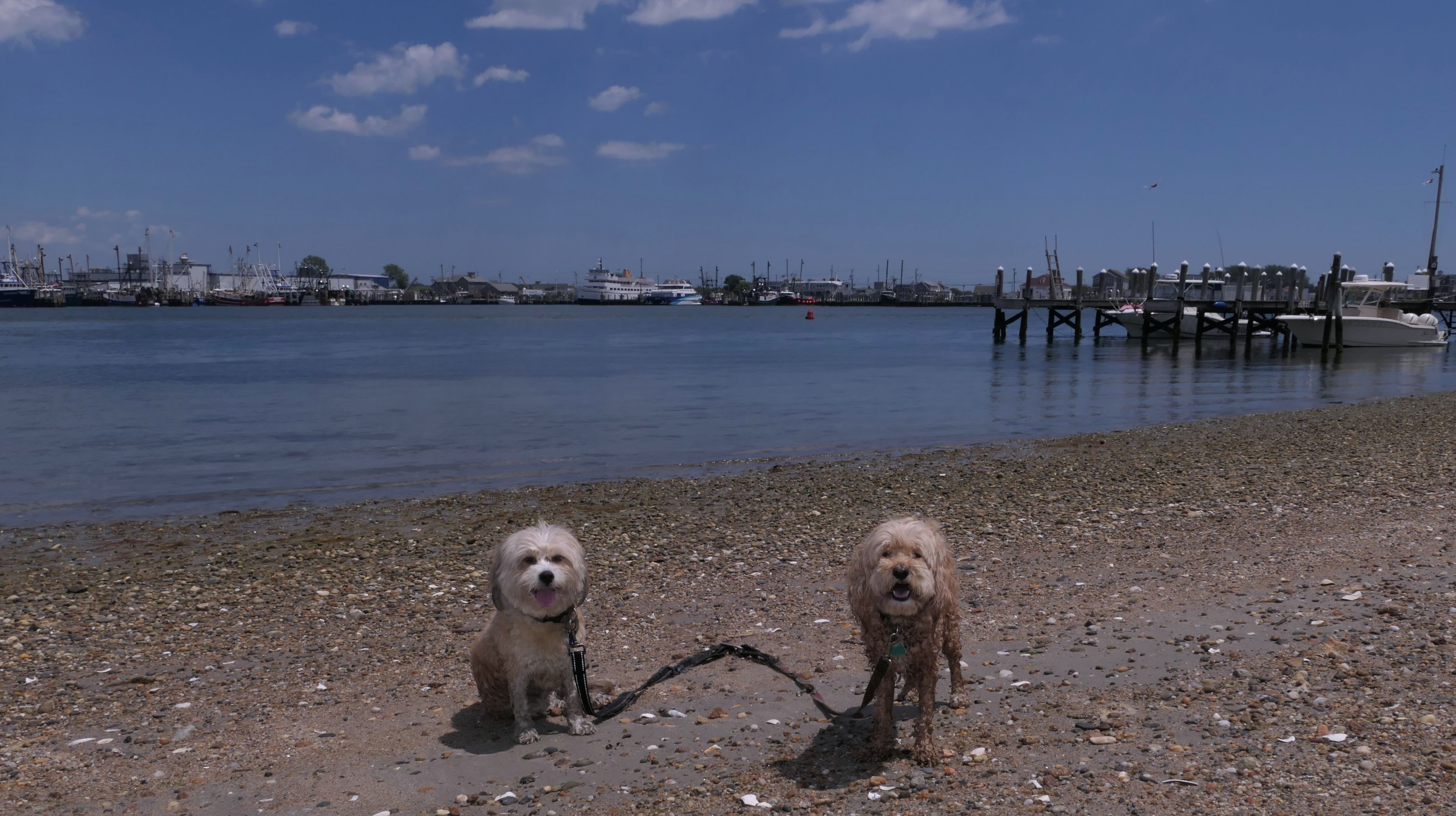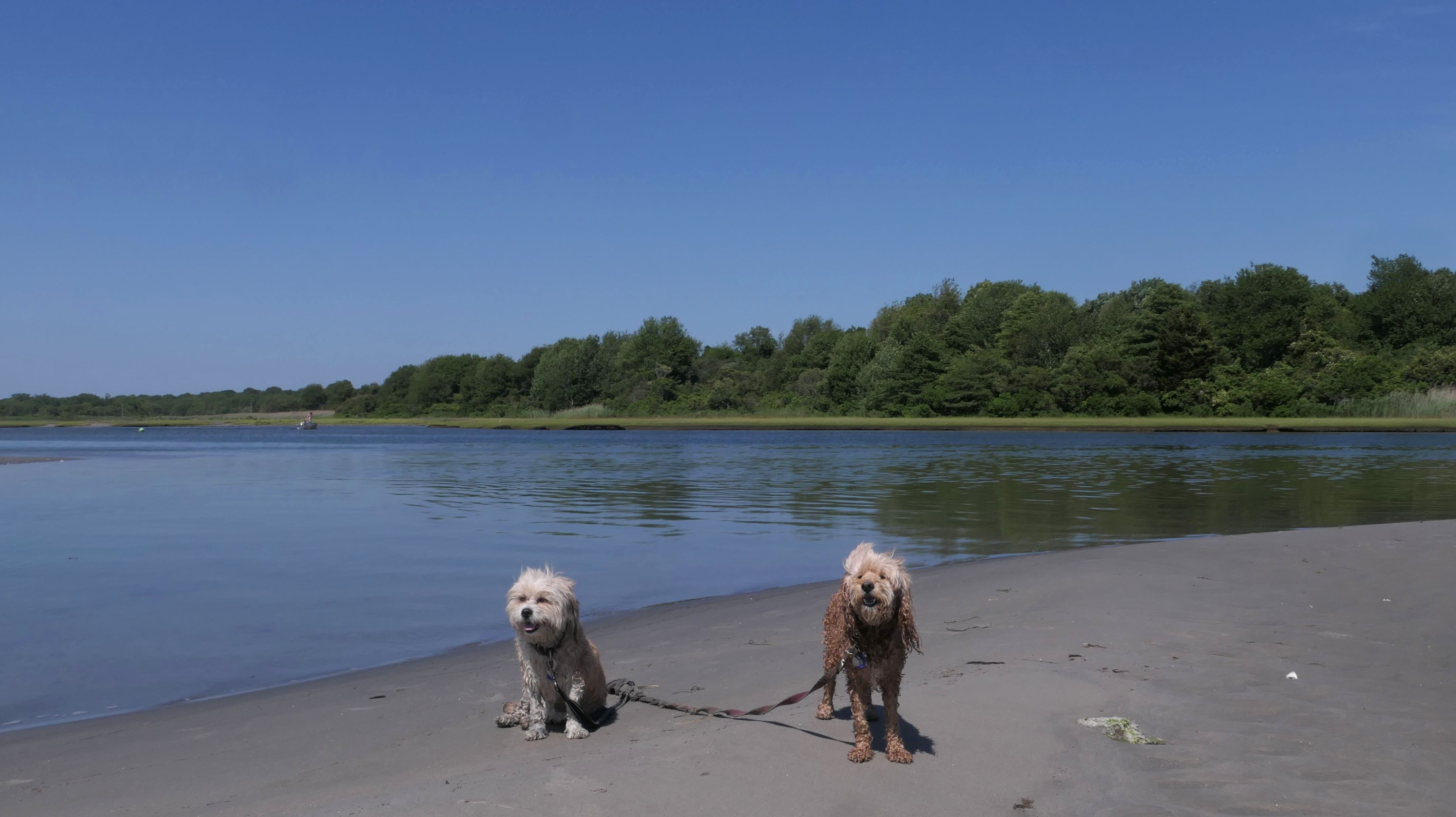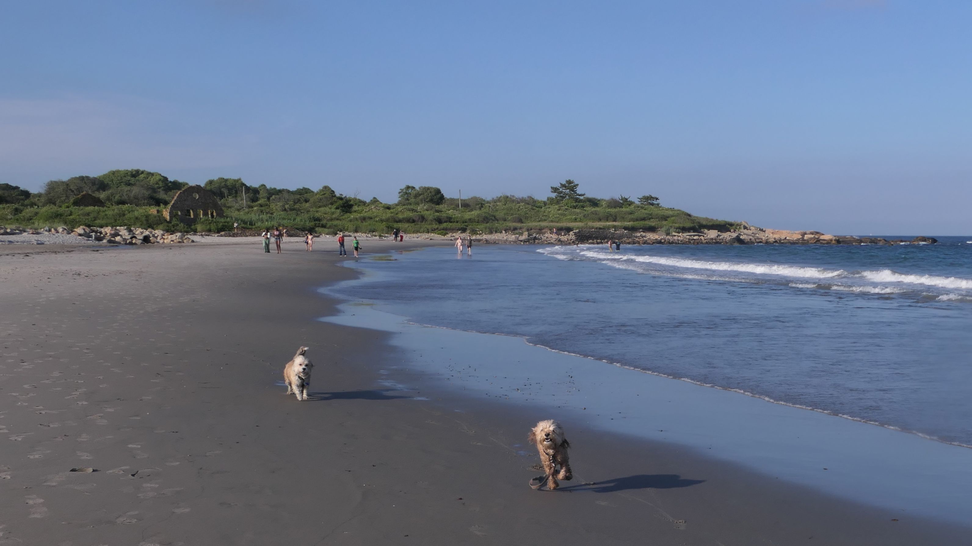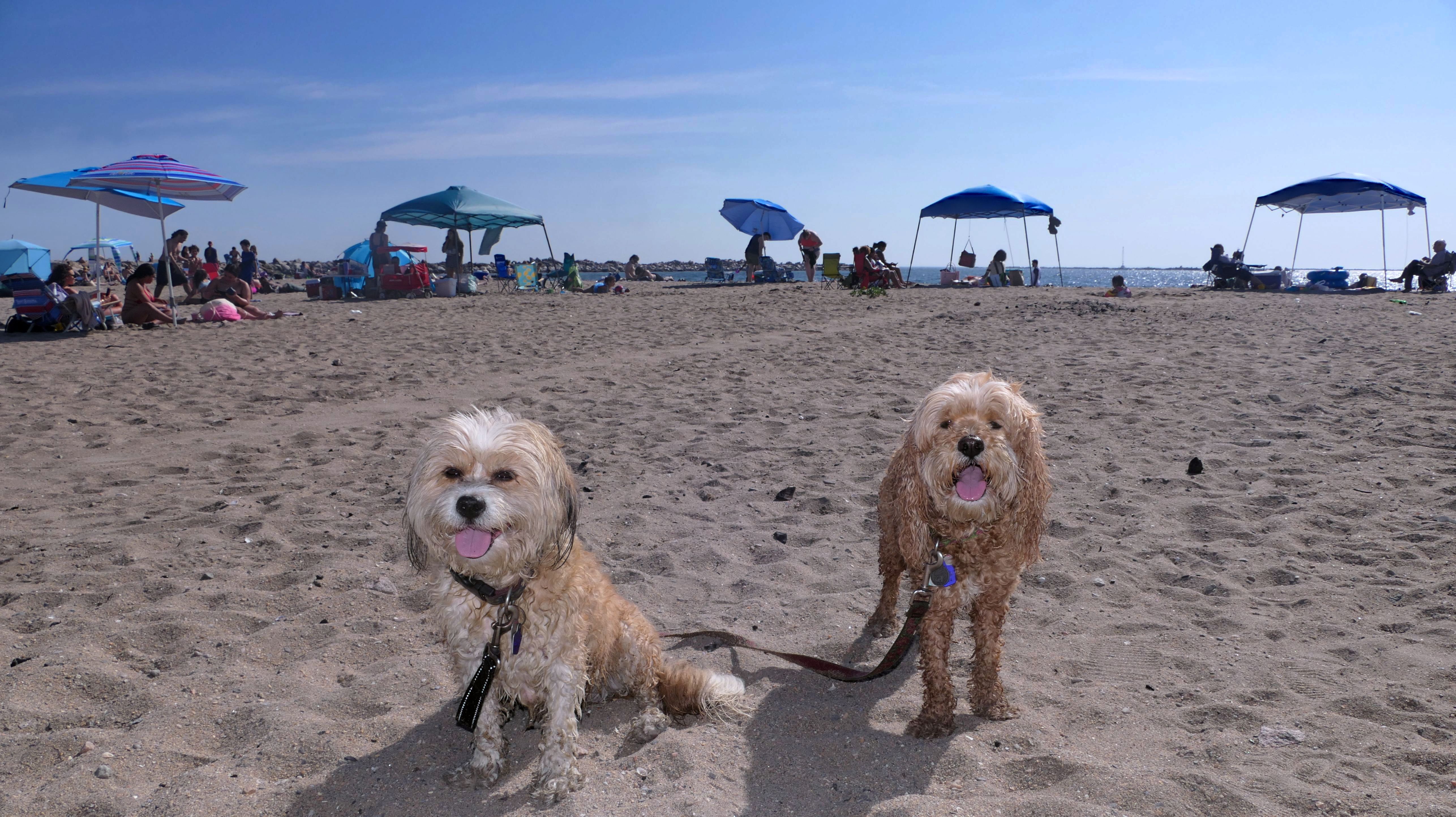 It was a hot day, so we came down to this beach. As mentioned previously on this page, dogs are allowed year round here, and there is no parking fee. The lot was almost full, and the beach was pretty busy. I'm not sure what was going on with the two guys holding woodwind instruments. They weren't playing the instruments, so maybe they were shooting a video. We only stayed about a half hour or so this time around, as it started to get cloudy, so we went somewhere sunnier.