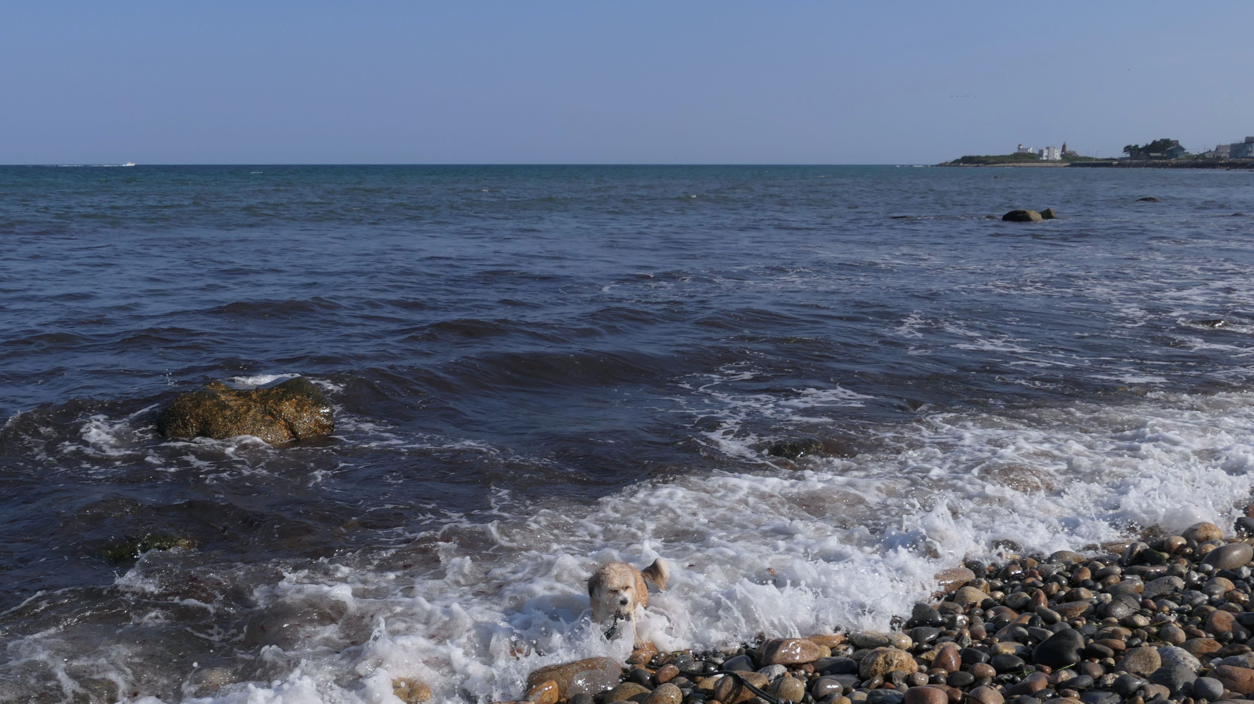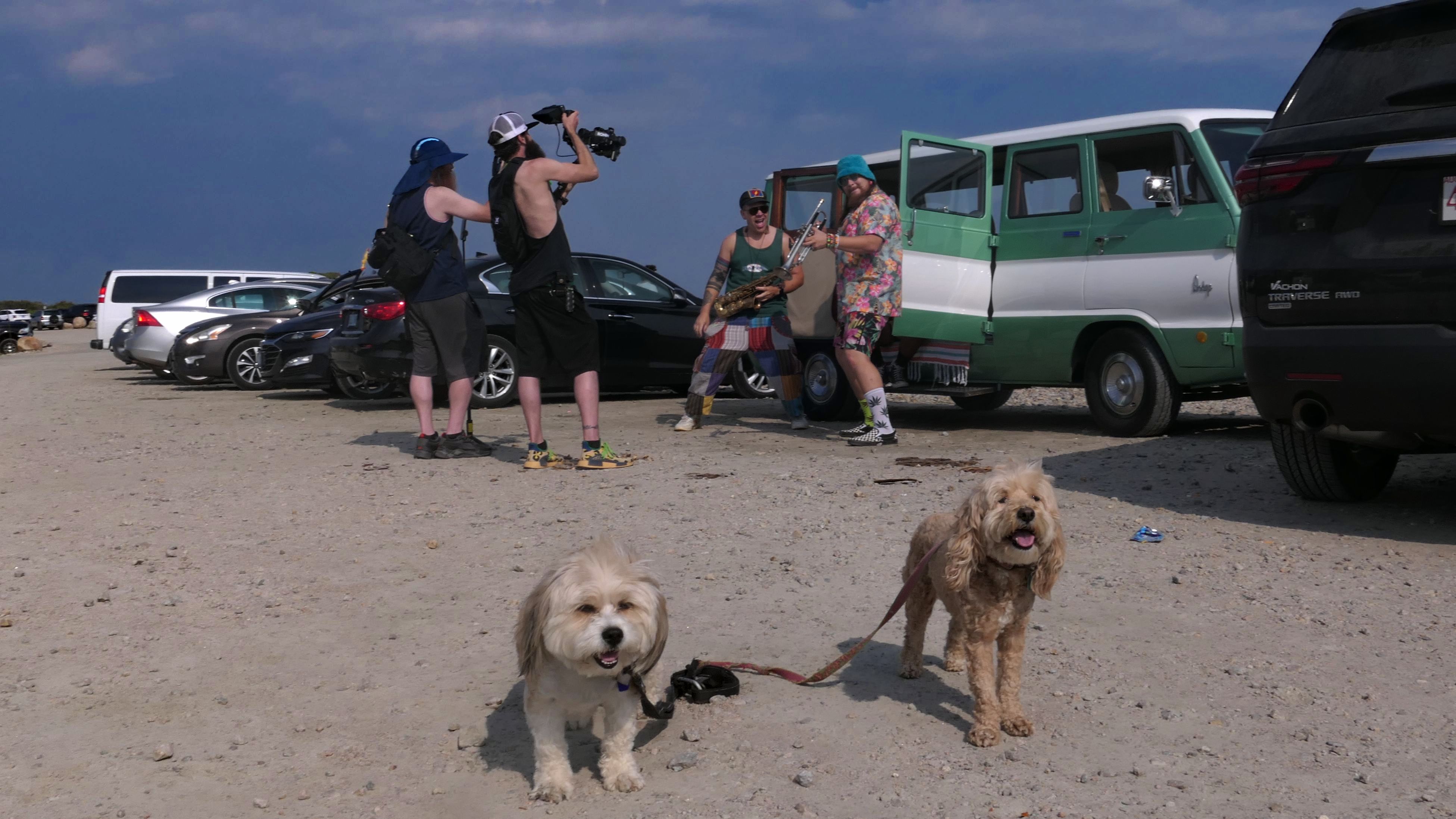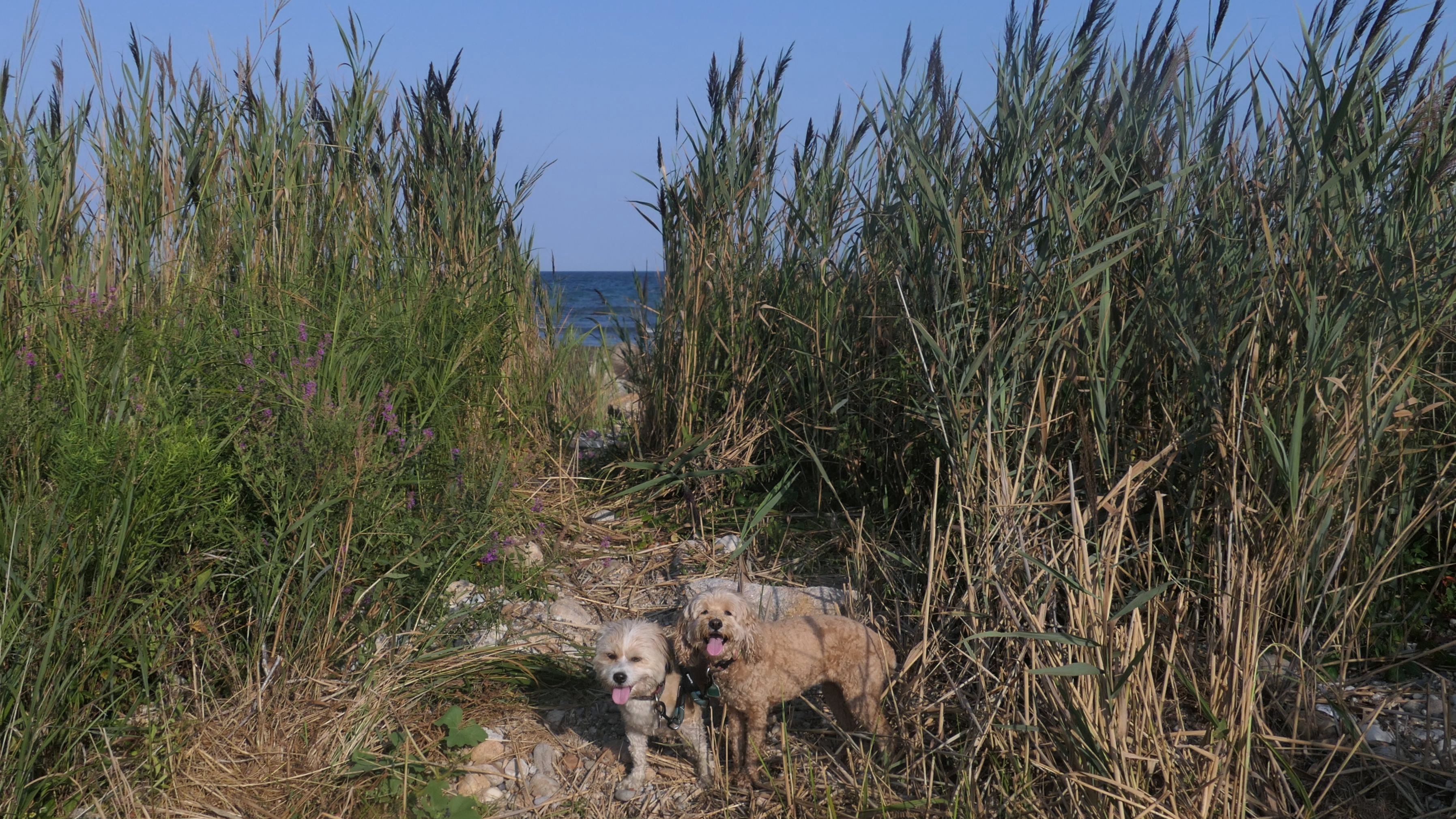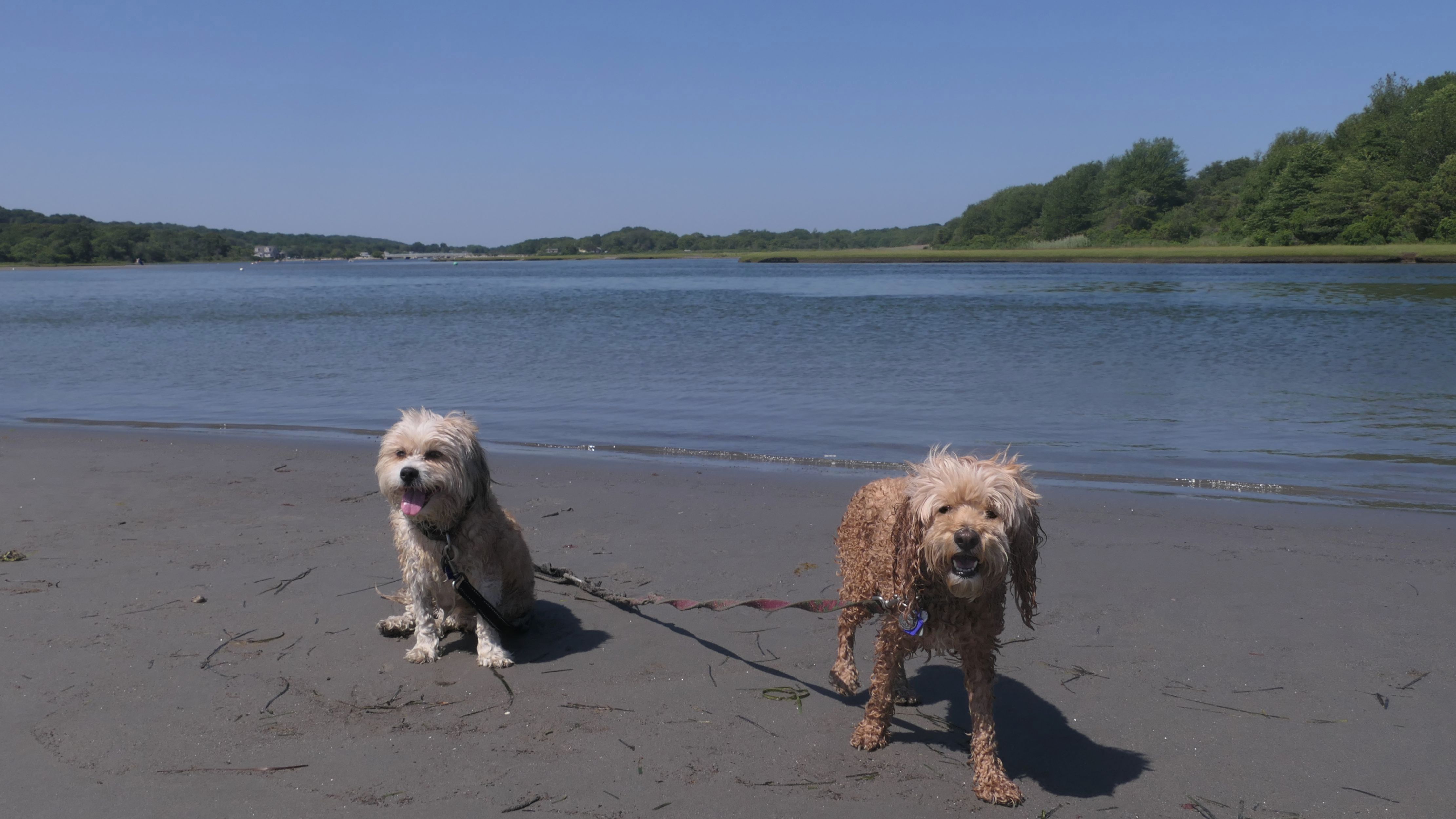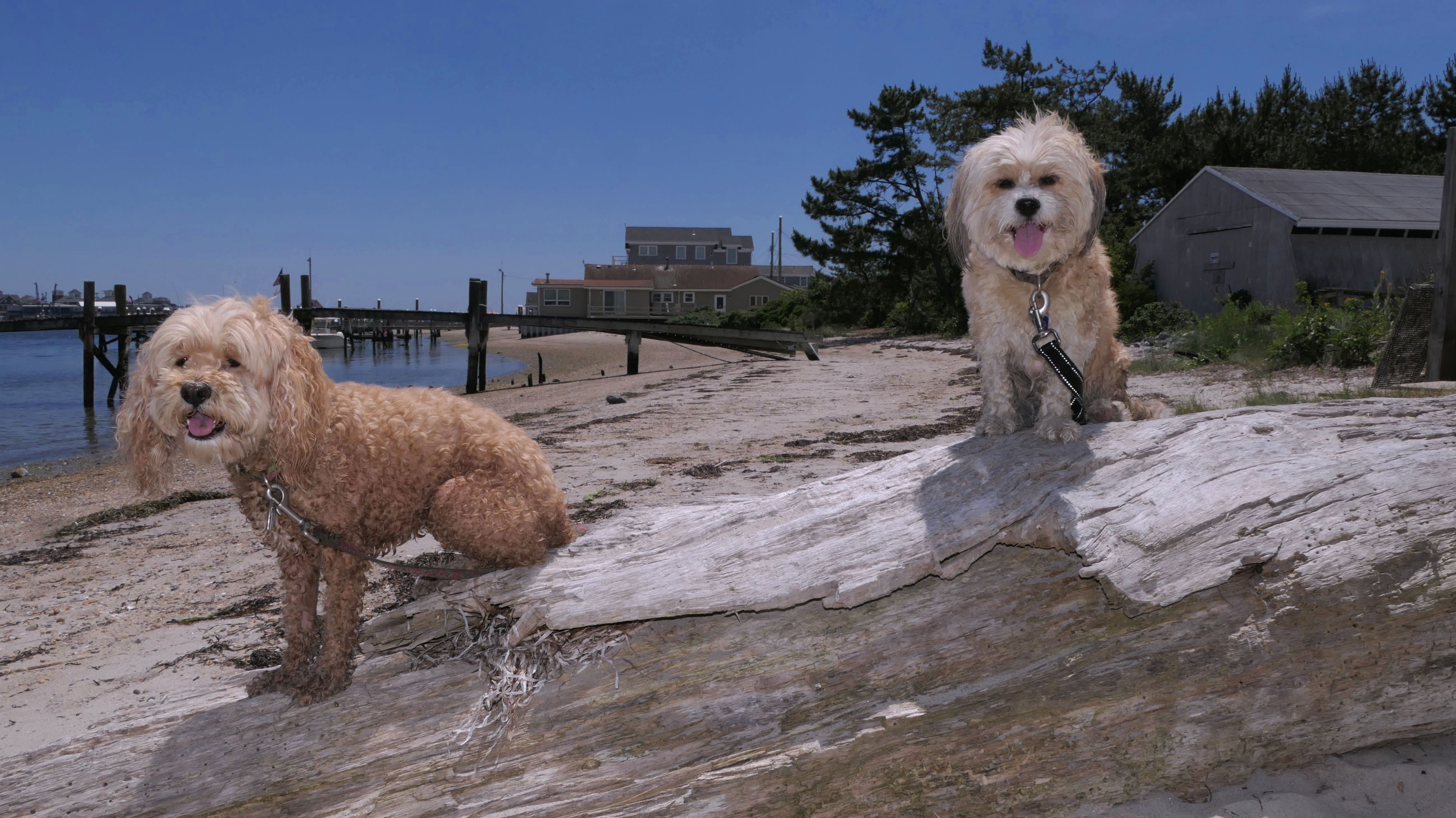 It was a hot day, so we came down to this beach. As mentioned previously on this page, dogs are allowed year round here, and there is no parking fee. The lot was almost full, and the beach was pretty busy. I'm not sure what was going on with the two guys holding woodwind instruments. They weren't playing the instruments, so maybe they were shooting a video. We only stayed about a half hour or so this time around, as it started to get cloudy, so we went somewhere sunnier.