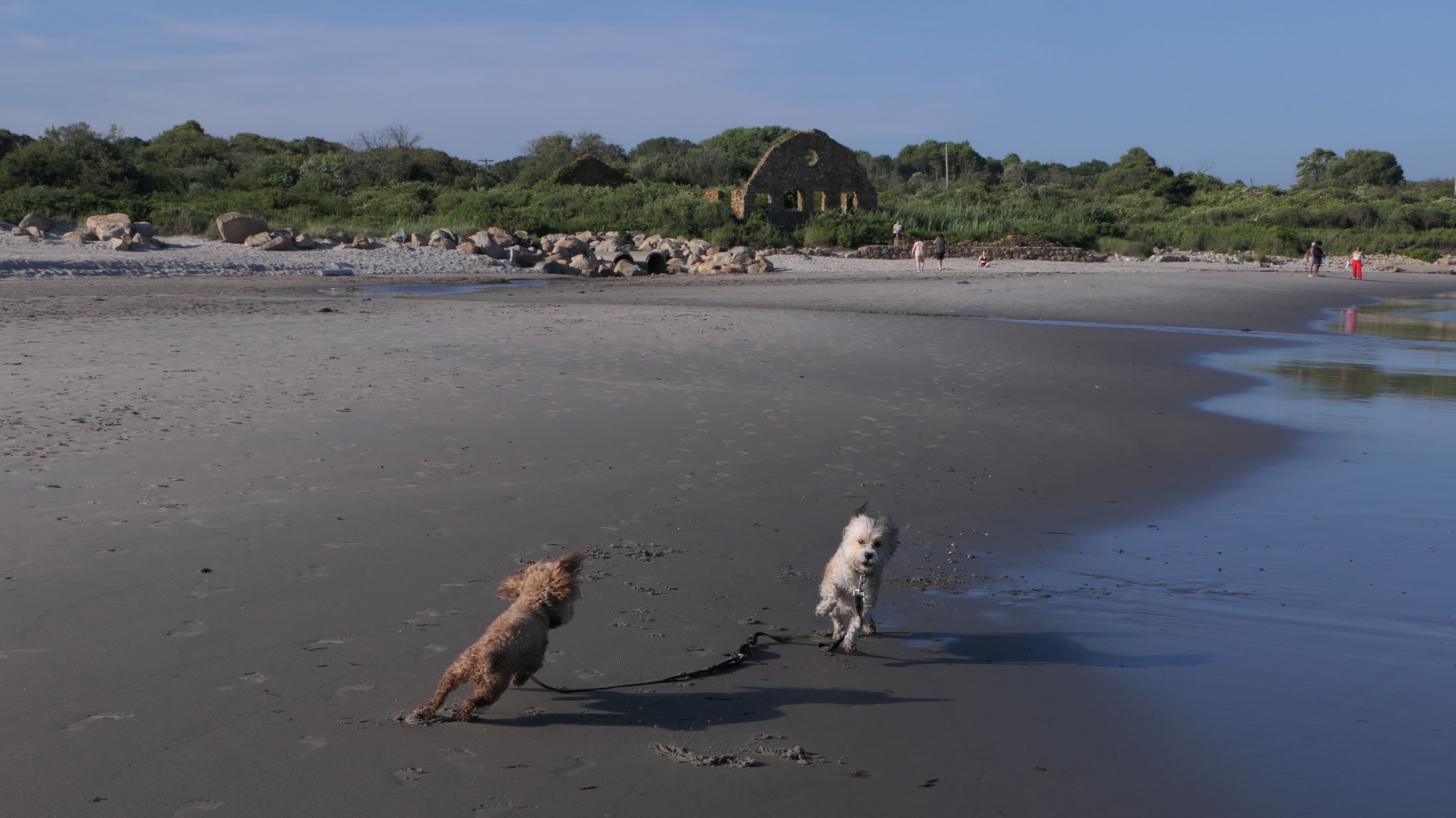 We've visited this beach enough times I wasn't even going to add an entry on this page for this trip, but I got some great photos of Mandy and Lexi running and playing on the beach, so I had to do a write-up. There's a small parking area that holds about a half dozen cars, on Ocean Road, just across the street from the Clarke Road intersection. We parked there and took a short trail that leads directly to the beach, bypassing the Black Rock trail and ruins. (It also bypasses having to pay to park during beach season). Dogs aren't really allowed here on the summer months, but we stayed at the north end near the ruins, and it was late in the day, so we didn't have any problems. It was a very hot day, and this was our 5th stop, so the idea was just to cool off in the water. Mandy and Lexi wouldn't go out that far into the water, but they did decide to get their crazies out and start playing on the beach. I love when they do that, and took plenty of action shots! It's good to see them still have this kind of energy, despite being 10 and 9 years old. Hopefully this energy will last for many years longer!