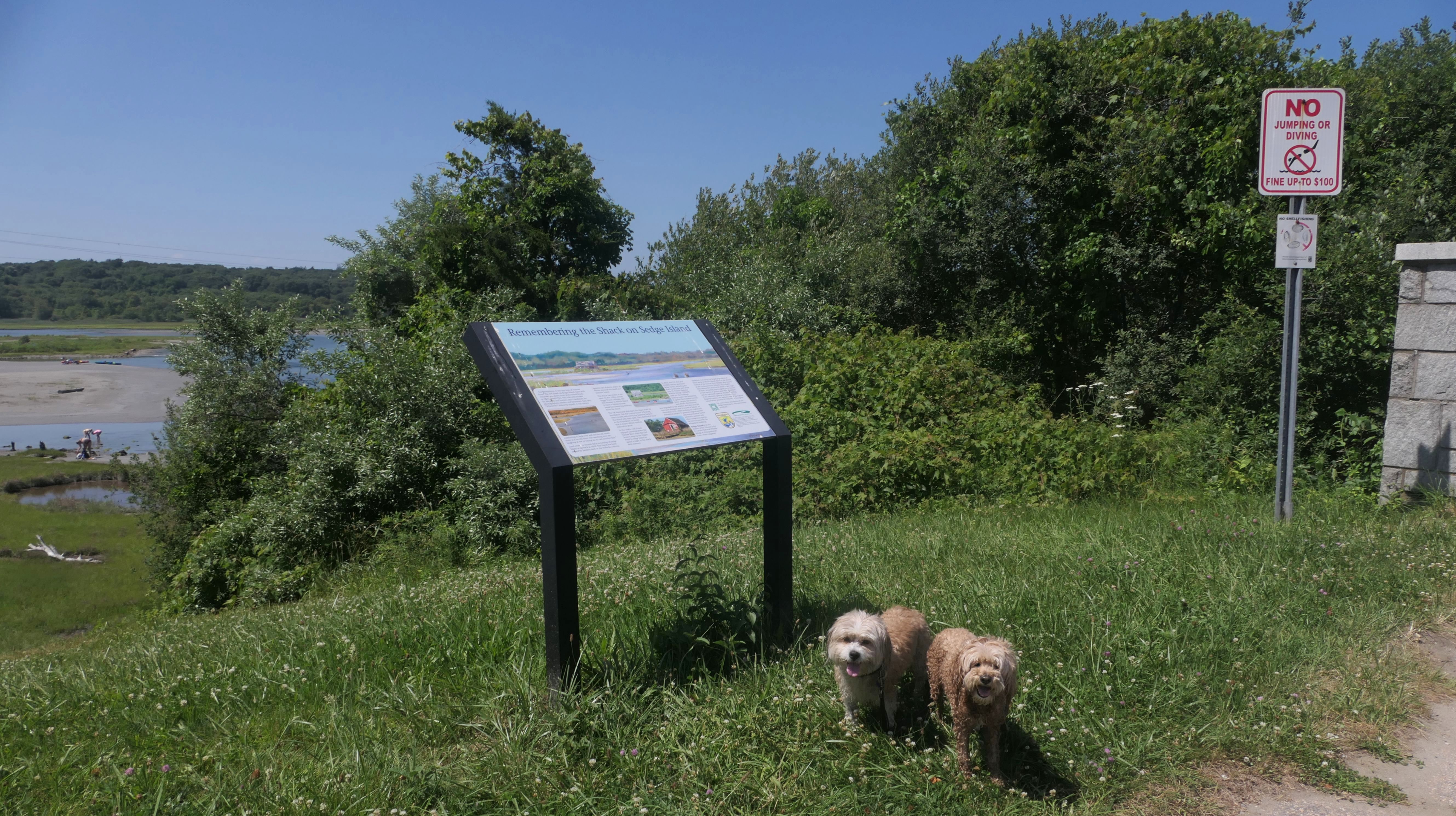 This was our 2nd stop on this very hot day. This wasn't a planned stop. I passed by on the way to Camp Cronin Beach and decided to stop and check it out. There's no signage or anything indicating the name of the park, but there are two small parking lots on the south side of Boston Neck Road, one on either side of the bridge. There is a third parking area for John H. Chafee Wildlife Refuge on the north side. Two of the three lots were full, despite it being a Tuesday afternoon. I guess everyone wass looking for water related activities when temps are nearing 100! There is an observation platform near one of the parking areas, that was once part of the old bridge prior to it being rebuilt. All four corners of the bridge feature paths that lead down to the Pettaquamscutt River. We checked out all four. One was very muddy, but the other three were interesting. The southern access points look out toward the mouth of the short river, at the east end of Town Beach. The northern access points lead to a salt marsh and Sedge Island. There was a lot of activity on this day, with kayaks, rafts, people fishing, and even sun-bathers. There was also a group of teenagers jumping off the bridge into the river below (despite the signs warning that it was illegal). The waters are calm and warm. We made our way out to a smaller island (which probably doesn't exist during high tide). Mandy didn't like passing through that much water, even though it wasn't deep. The area beyond this, is part of the wildlife refuge. This was a pretty nice find, and a good place to cool off on a hot day.