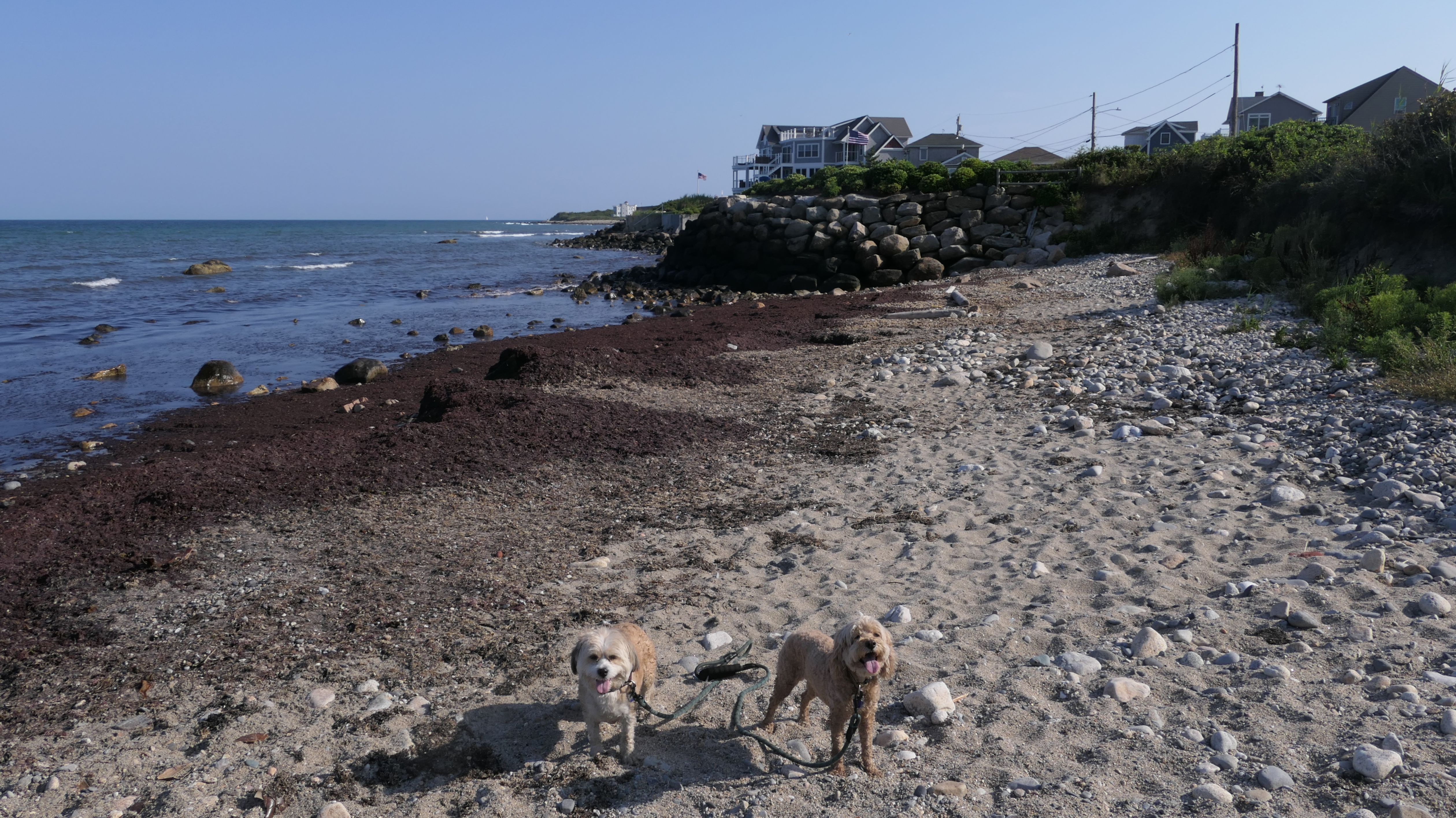 We parked near the intersection of Ocean Avenue and Point Judith Road, and walked to the access point on Major Arnold Road. We walked along the rocky shoreline until we hit the beach. Despite being a beautiful evening, the beach was practically deserted. Mandy and Lexi got to run around a bit.