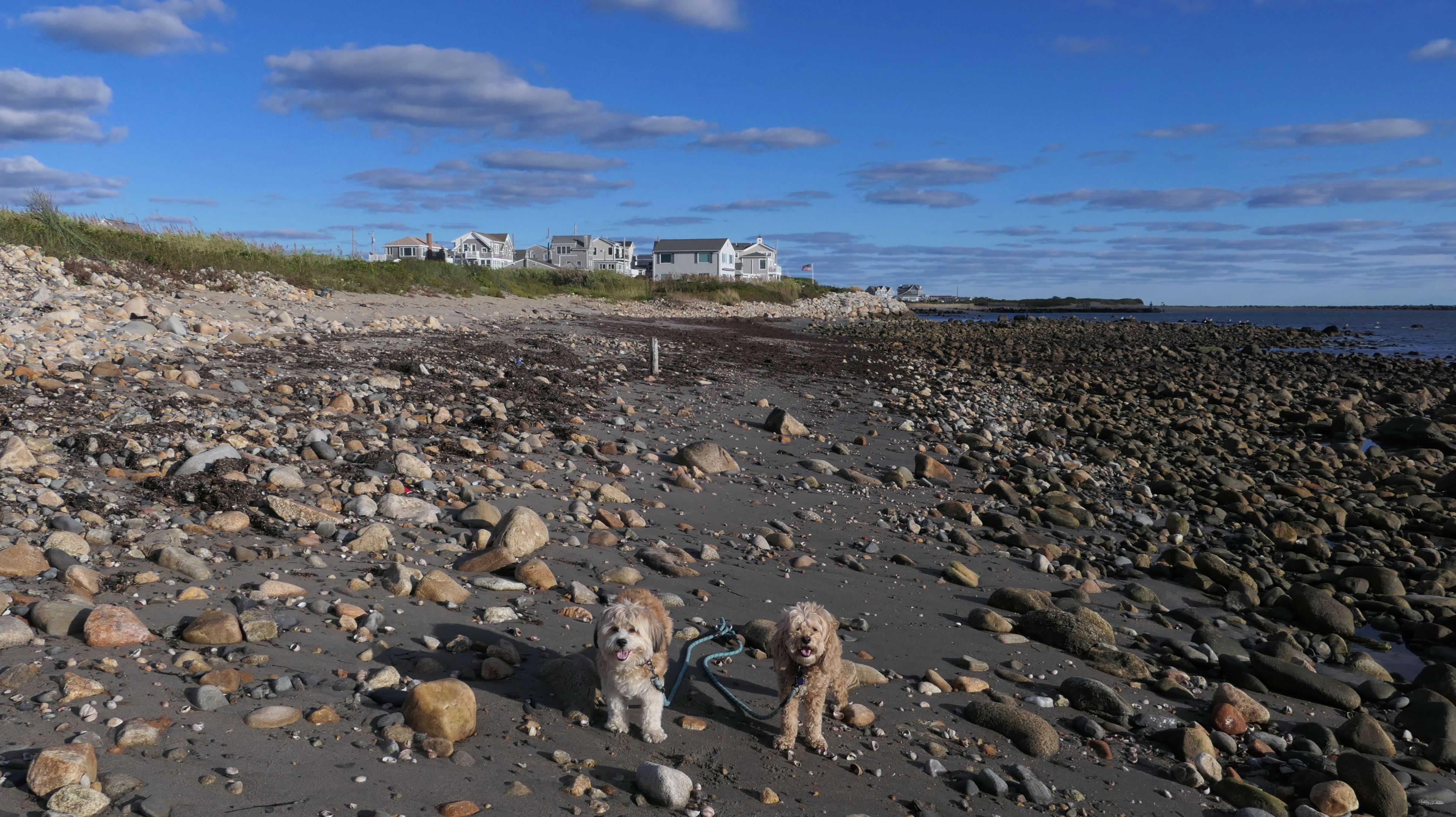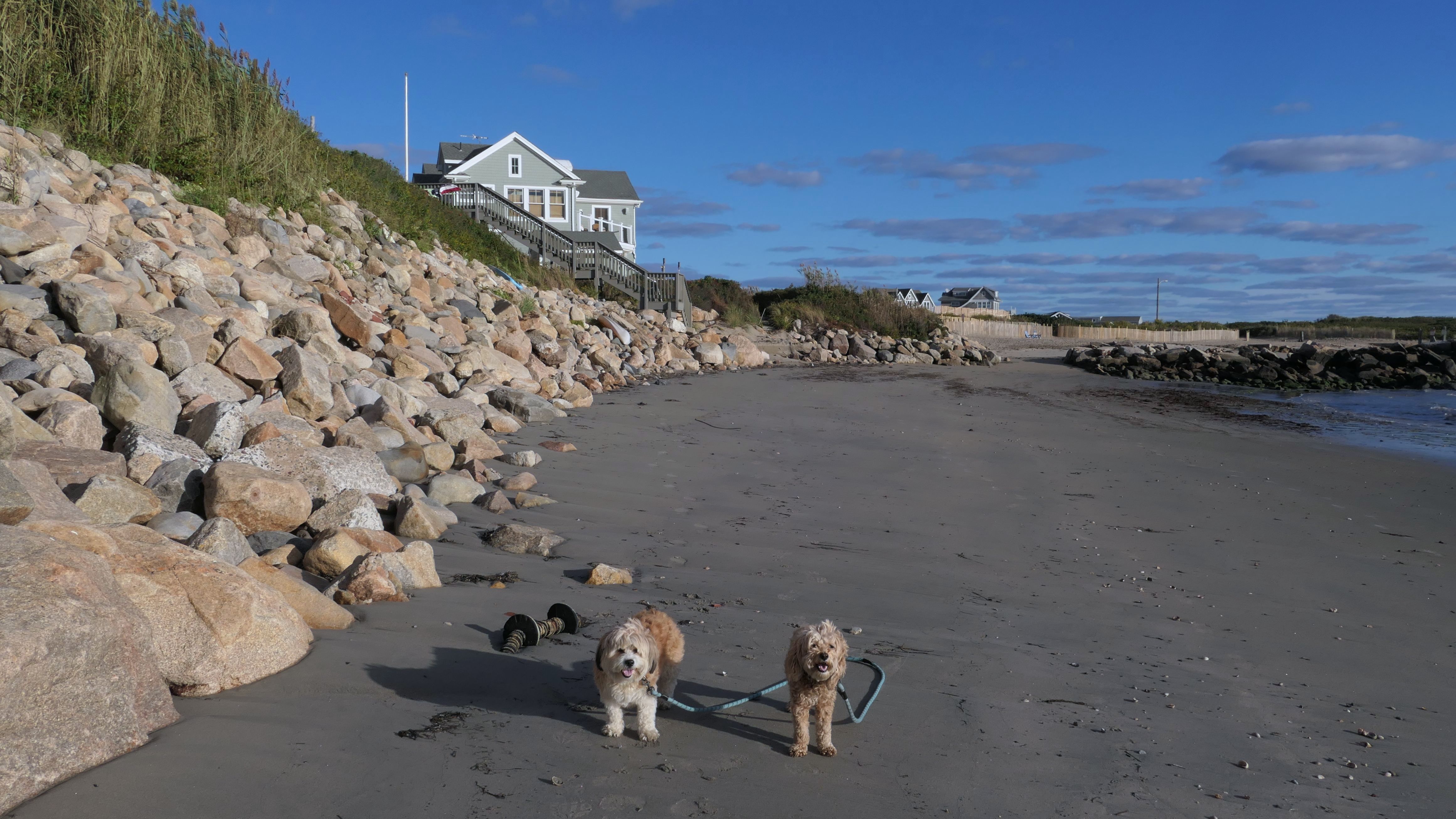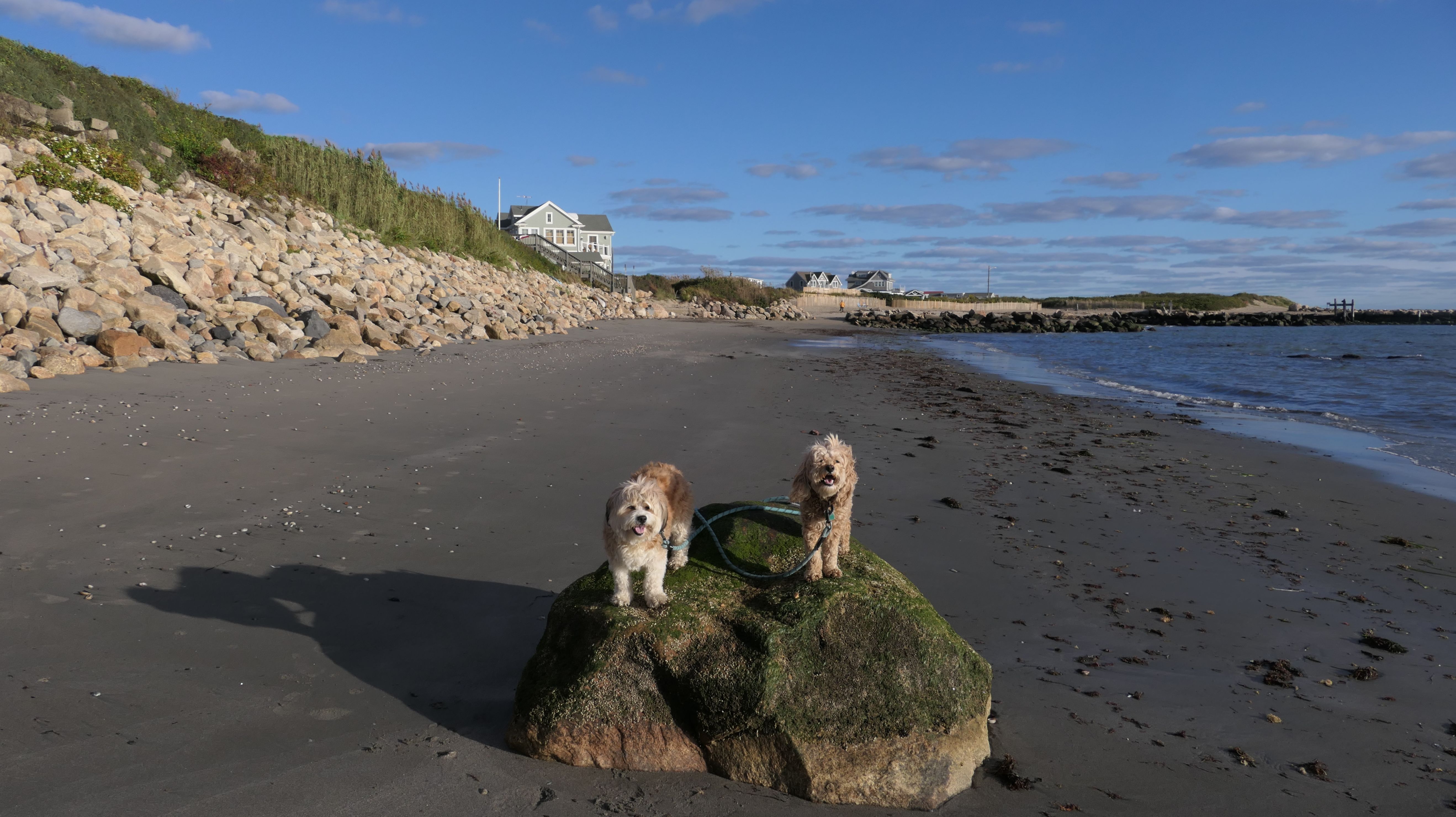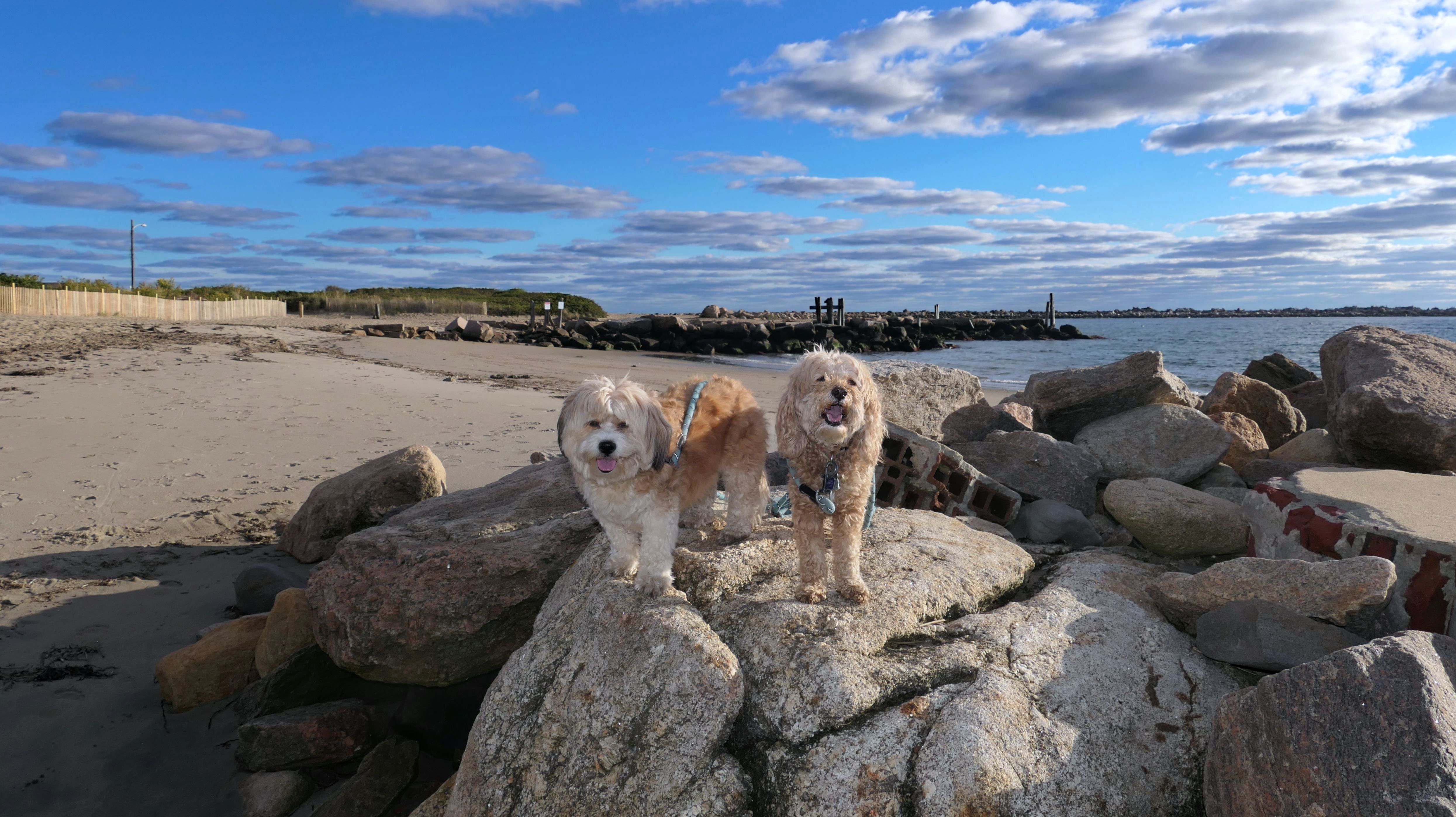 Due to the long weekend, we were let out of work early. I quickly decided to come to this beach, since we had only walked this stretch of sand once before. We started at Roger Wheeler State Beach and walked to Camp Cronin Beach and back. There's nothing new or noteworthy here. It's pretty much the same as last time we were here, except it was lower tide and we didn't have to climb over any large rocks. Waves are mild here, as breakwaters protect this area. It was cooler than it has been, but the dogs still went into the water toward the end of our walk.