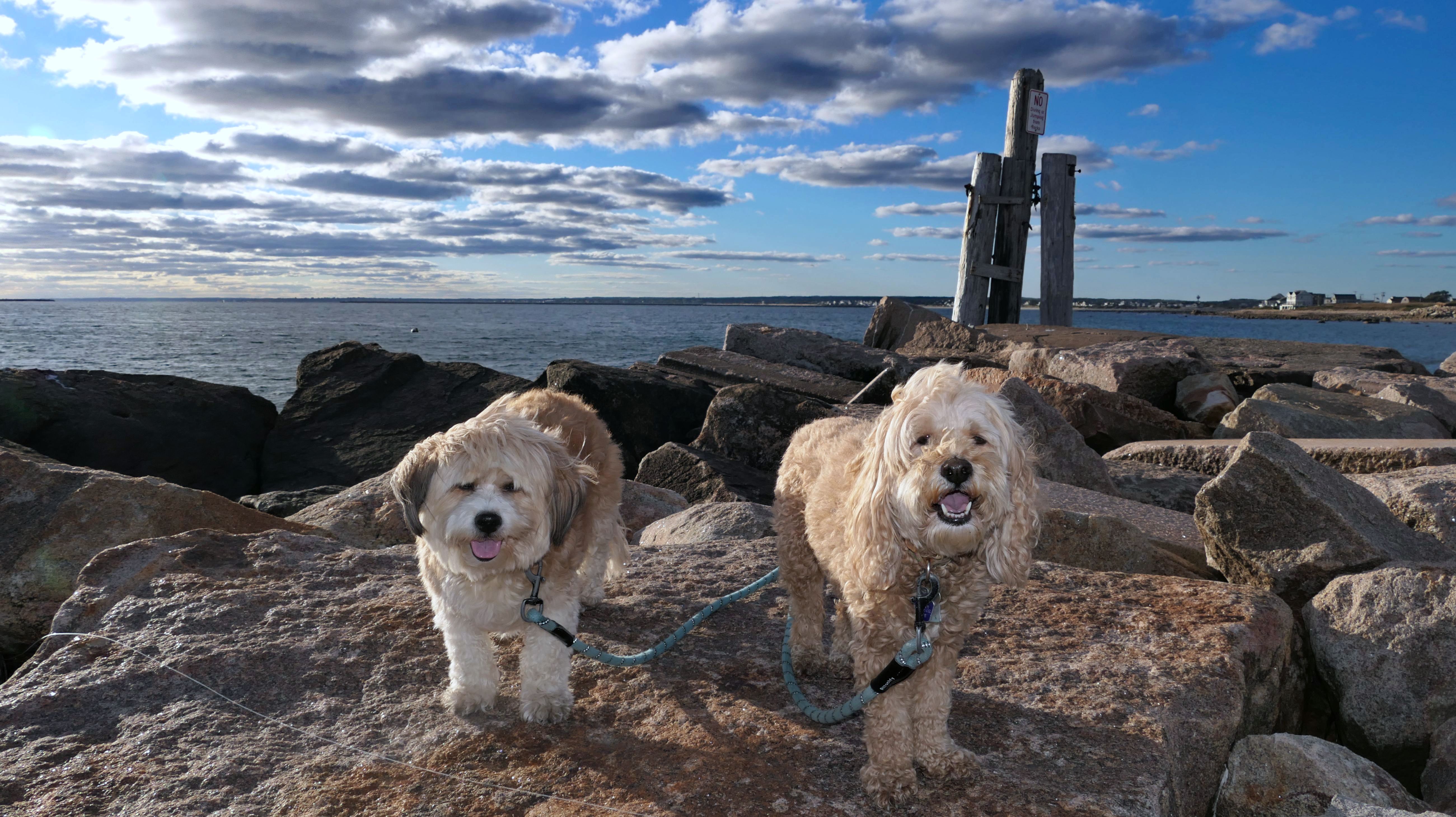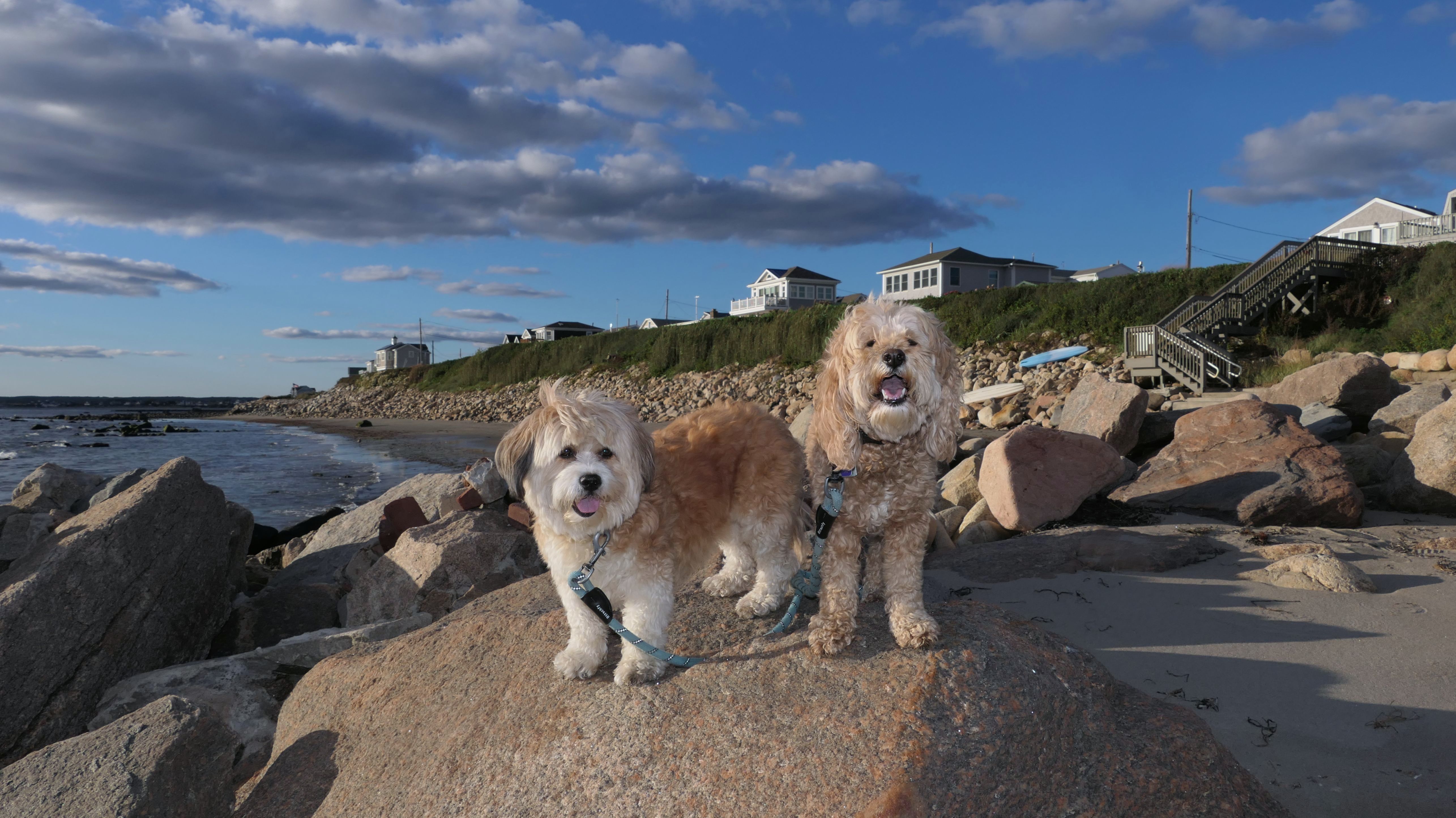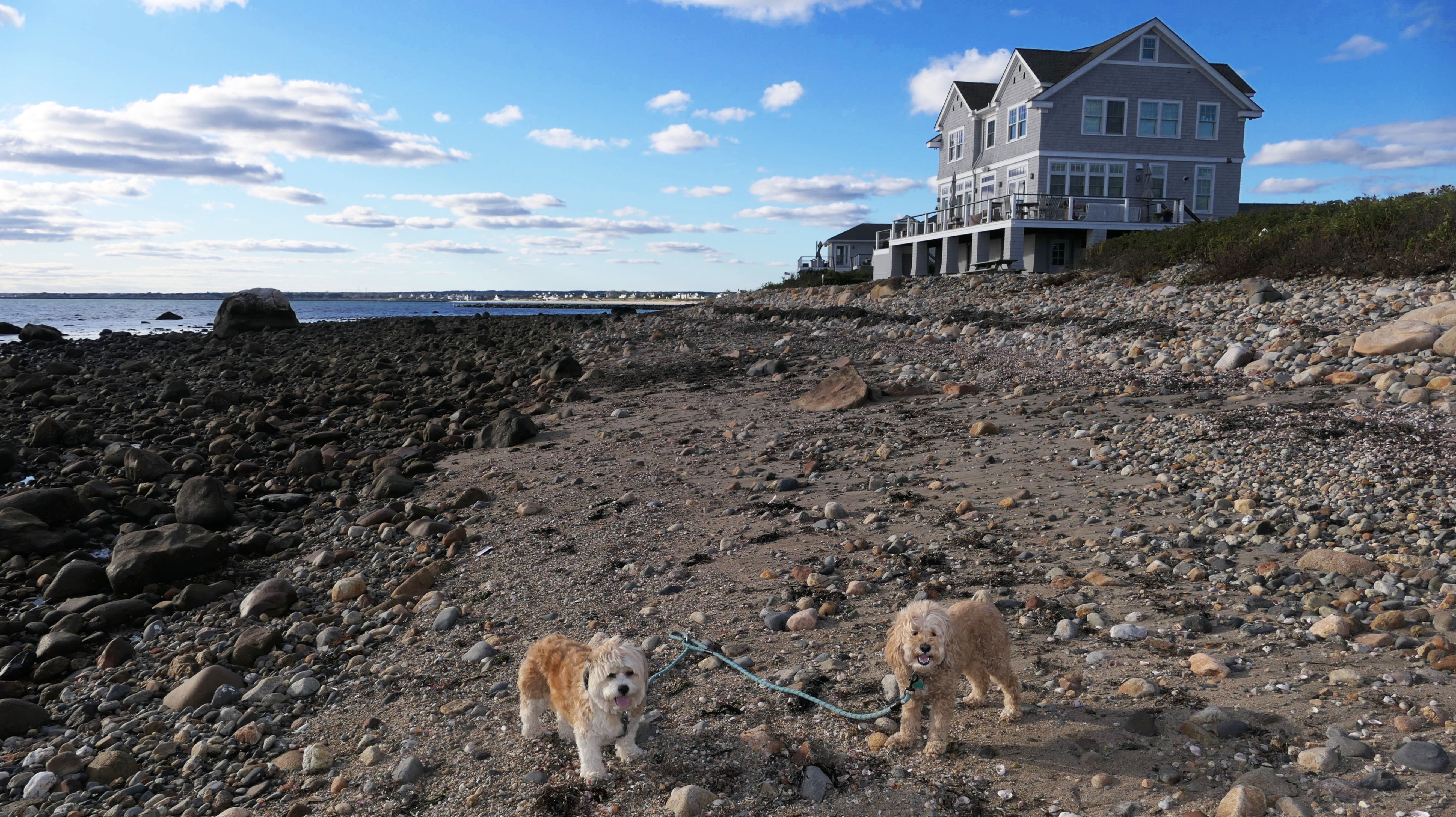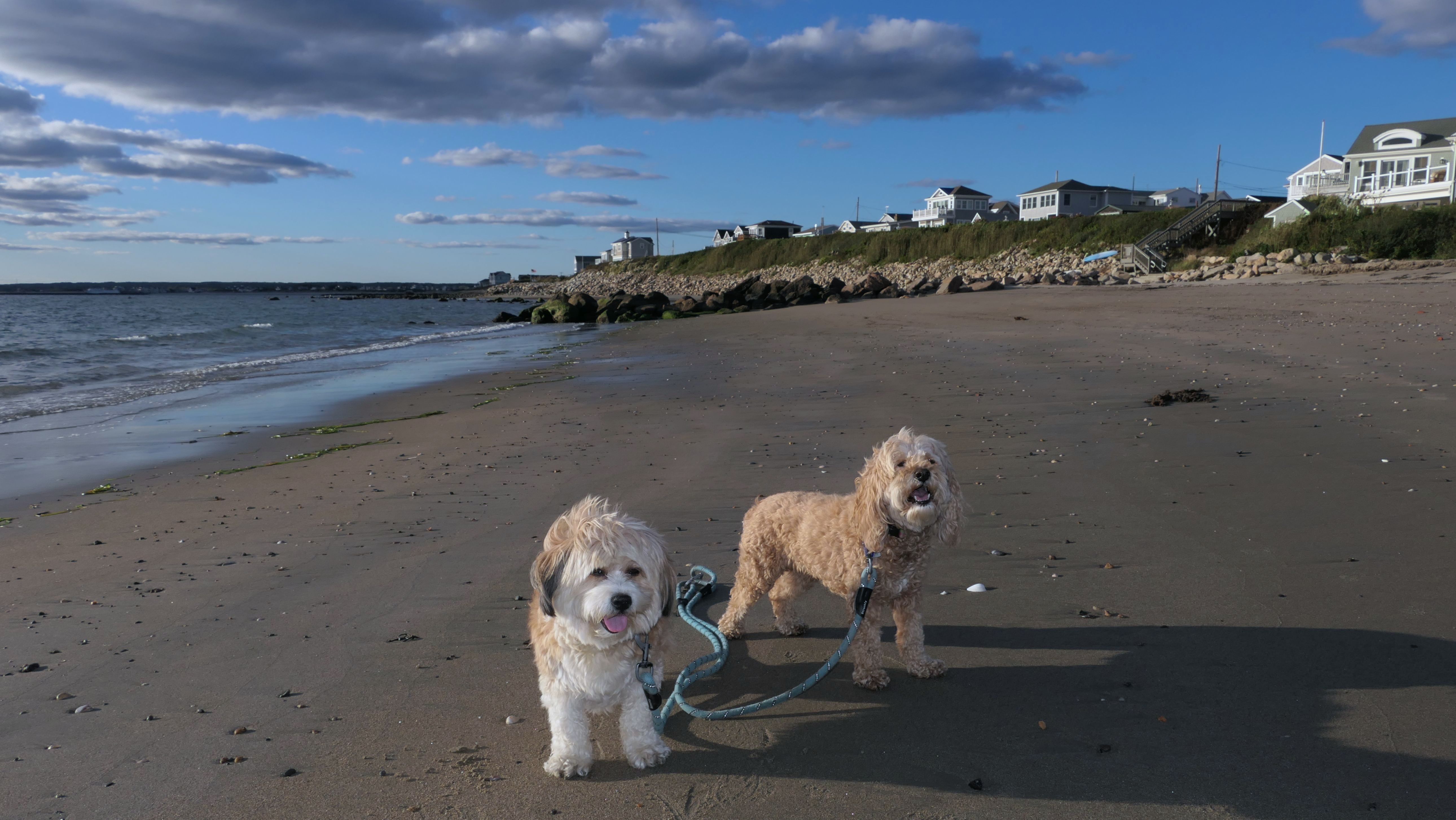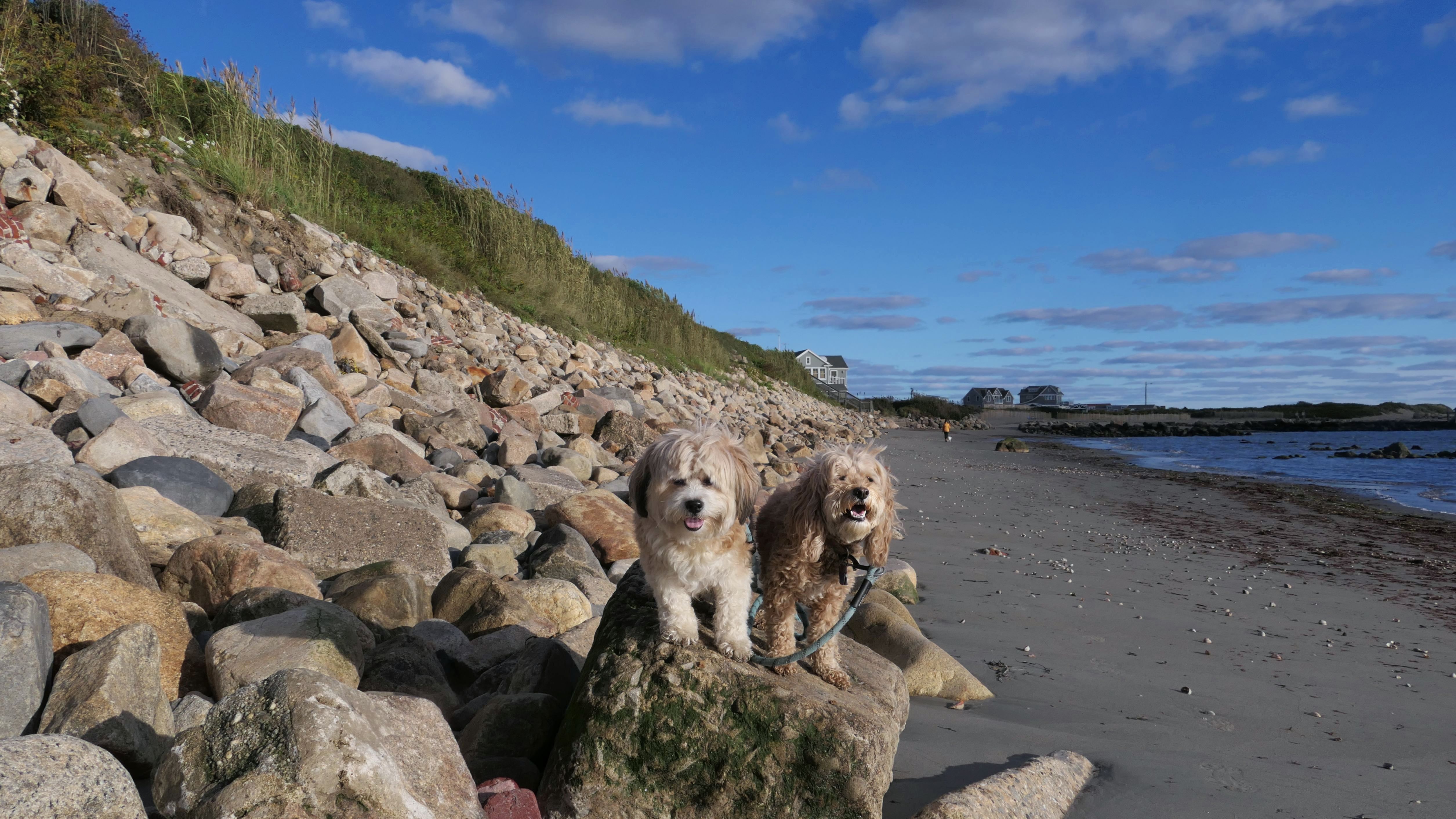Due to the long weekend, we were let out of work early. I quickly decided to come to this beach, since we had only walked this stretch of sand once before. We started at Roger Wheeler State Beach and walked to Camp Cronin Beach and back. There's nothing new or noteworthy here. It's pretty much the same as last time we were here, except it was lower tide and we didn't have to climb over any large rocks. Waves are mild here, as breakwaters protect this area. It was cooler than it has been, but the dogs still went into the water toward the end of our walk.