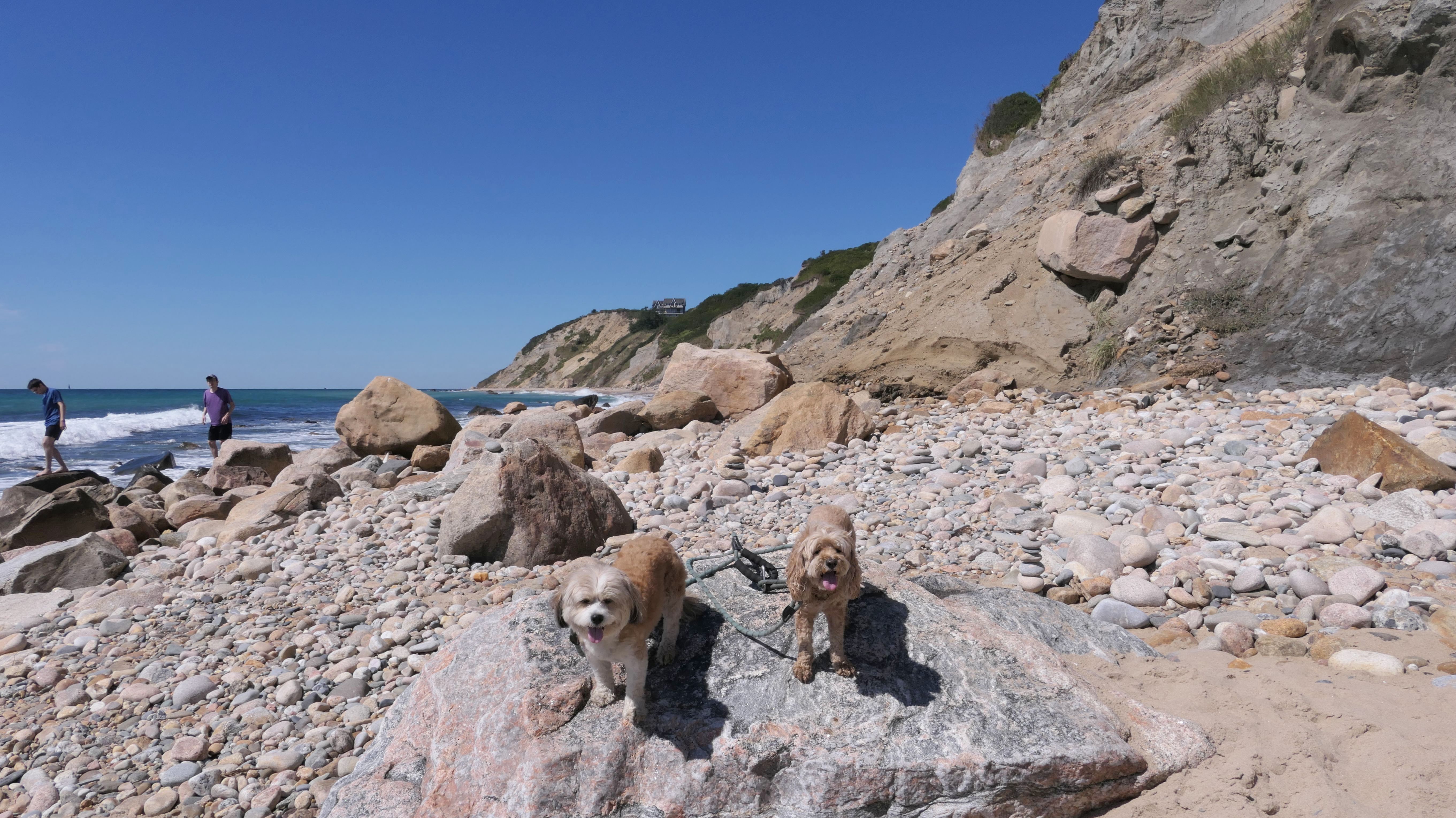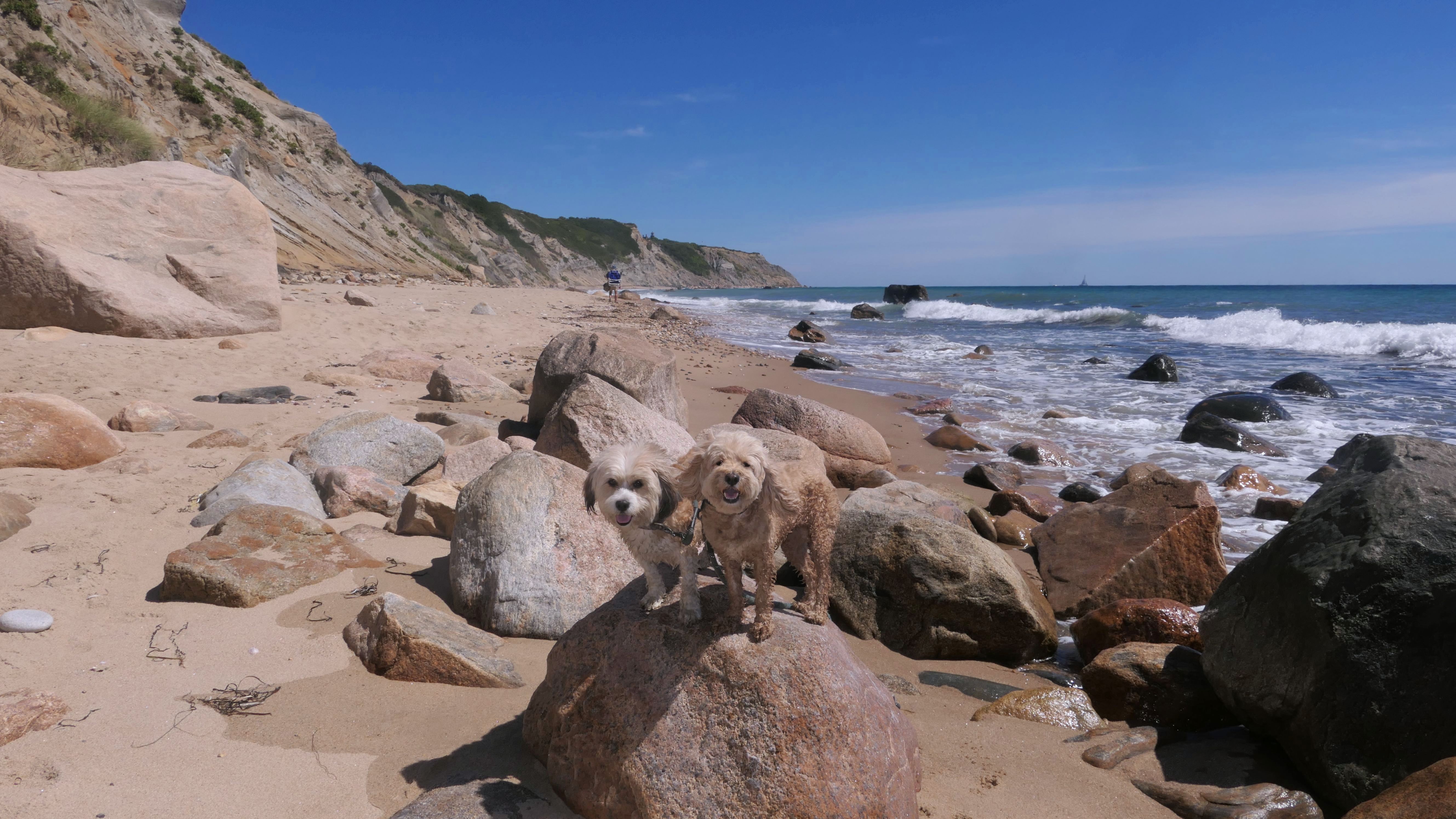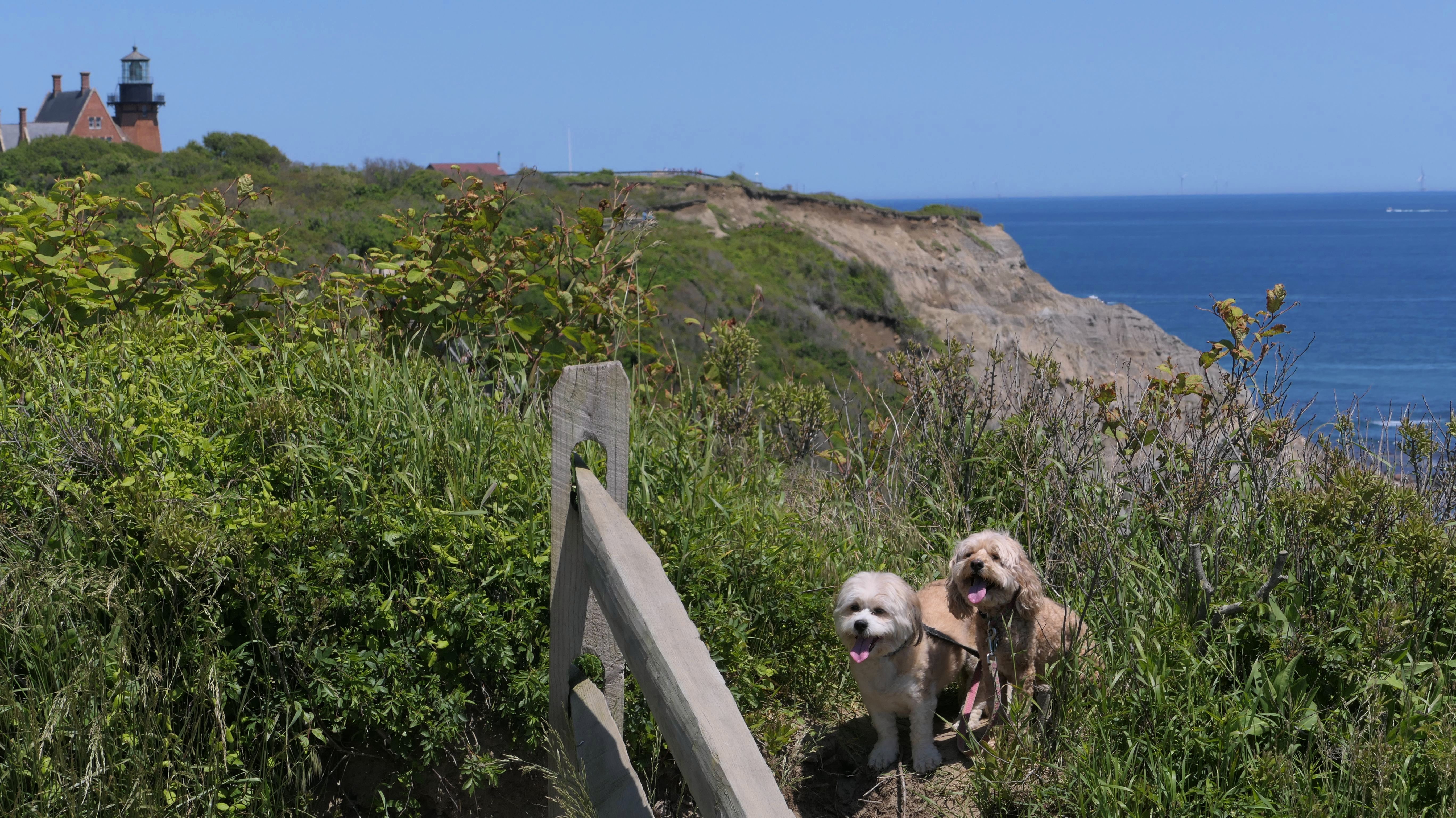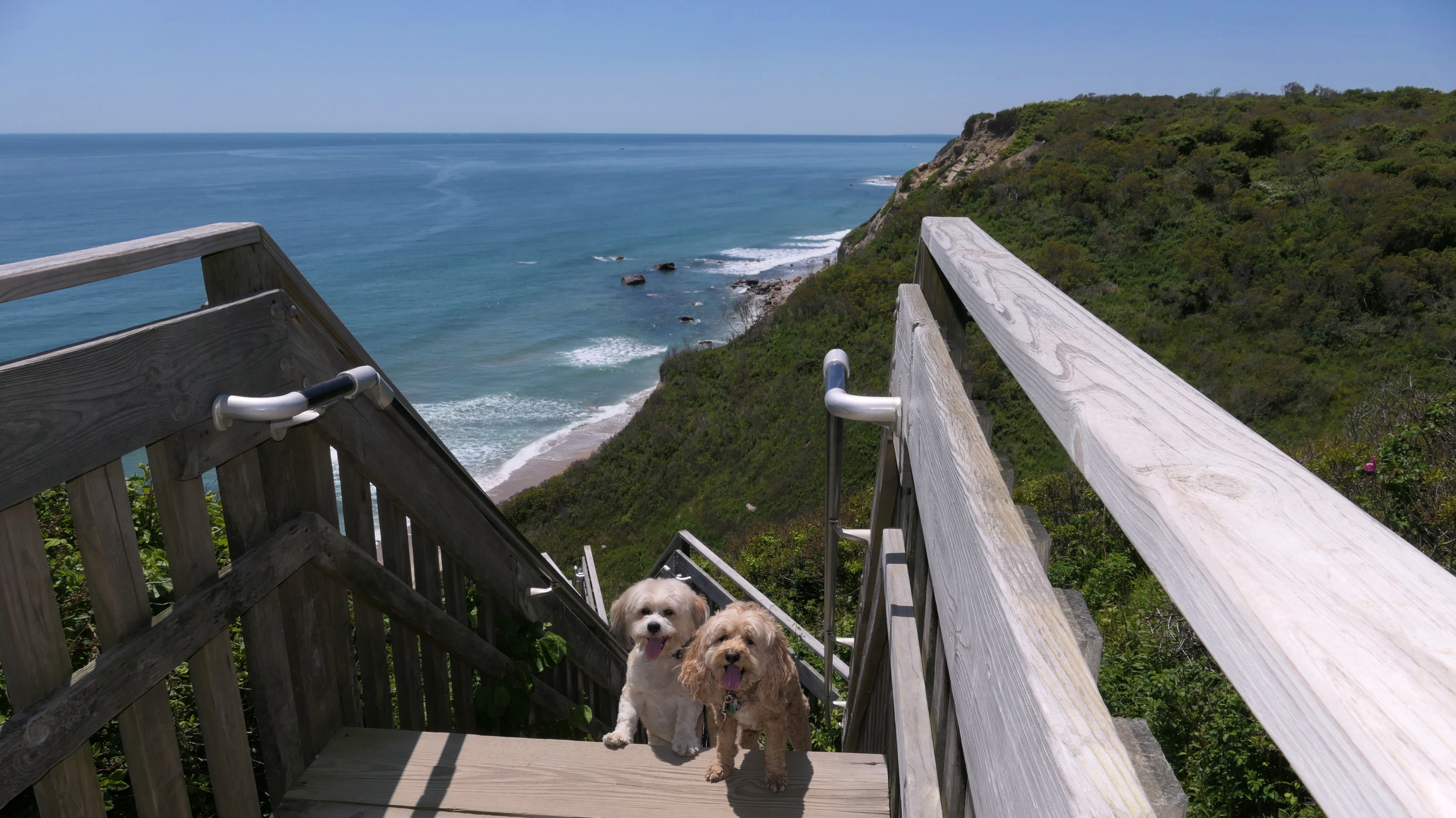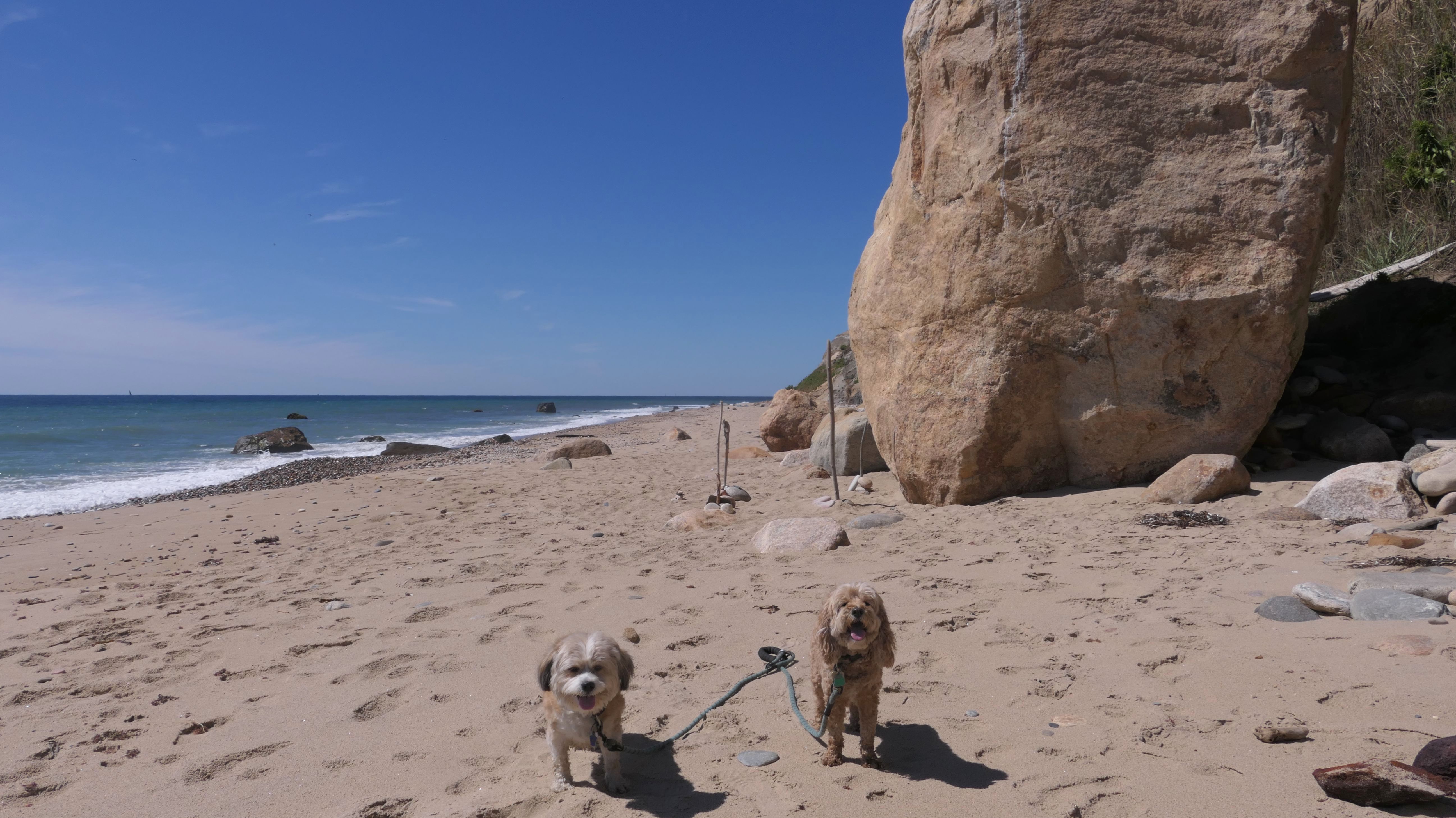 This was the highlight of this trip to Block Island. A couple months earlier we visited the Edward S Payne Overlook, and walked part way down the 141 steps, but did not go all the way down to the beach. This time, we were bound and determined to make it to the beach, so we went all the way down. At the bottom of the stairs is actually a series of rocks that have to be traversed carefully to get to the beach. Once at the bottom, we walked about a mile and a half along the beautiful shore, over to Vaill Beach before turning around and heading back. The views were gorgeous. The beach is a mix of sandy and rocky areas, with plenty of spots for great photos. One thing to be aware of, a section of the beach about a quarter mile from the stairs around the first bend, appears to be unofficially clothing optional. We encountered one nearly naked man sun bathing with his wife (he was wearing only a hat). His wife was wearing a bathing suit. Just something to be aware of. While we were walking back, I let the dogs off-leash to run around a bit. They always enjoy running free on the beach! We made it up the 141 steps on our way back with no issue. The hardest part was climbing over the rocks leading to the staircase. The area had gotten real busy, and there were people just sort of mulling around the rocks, making it difficult to get by. Once we got past that, the walk up wasn't too bad. I'm definitely glad we made it to this beach this time around. It was definitely worth the climb!