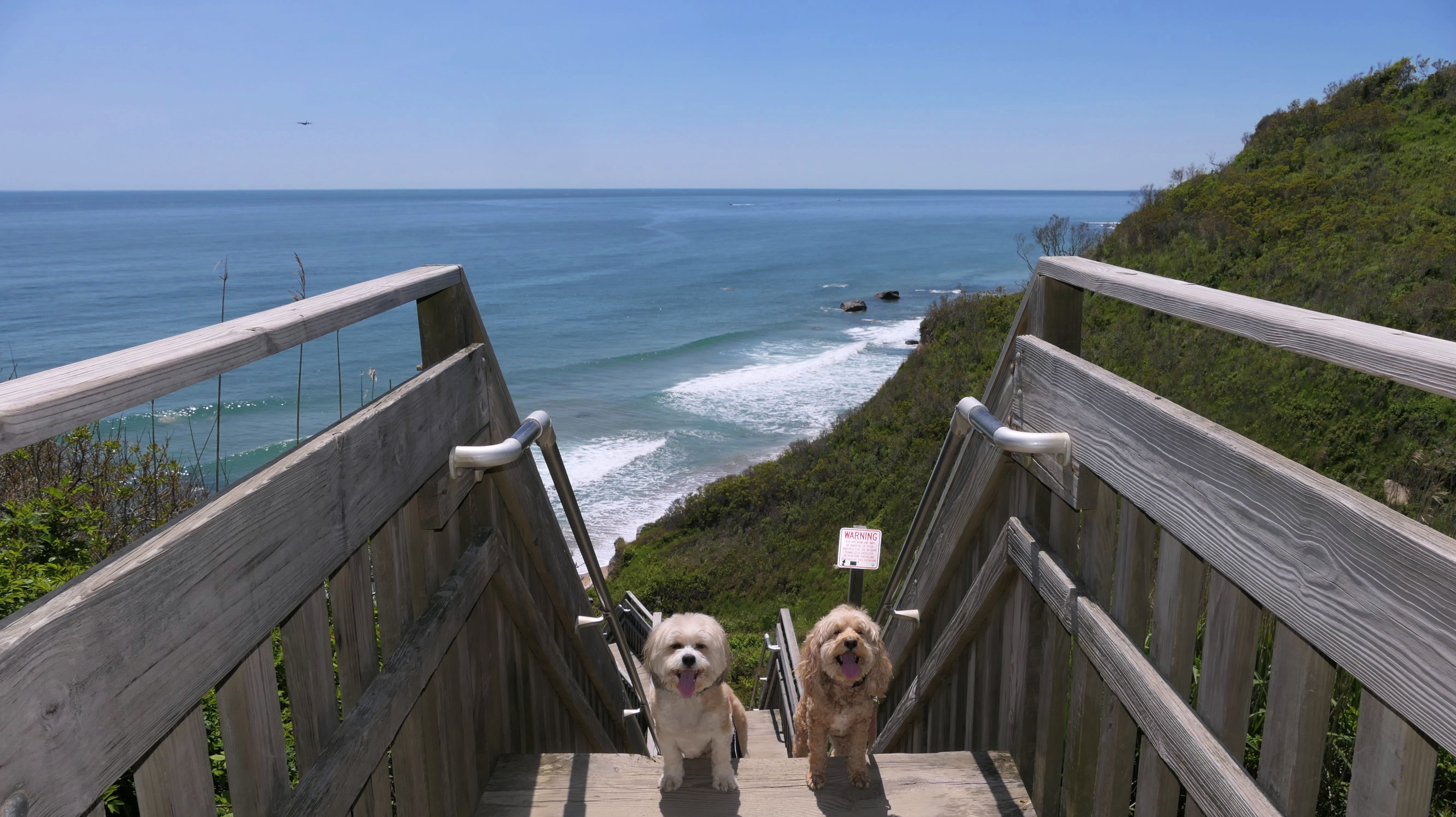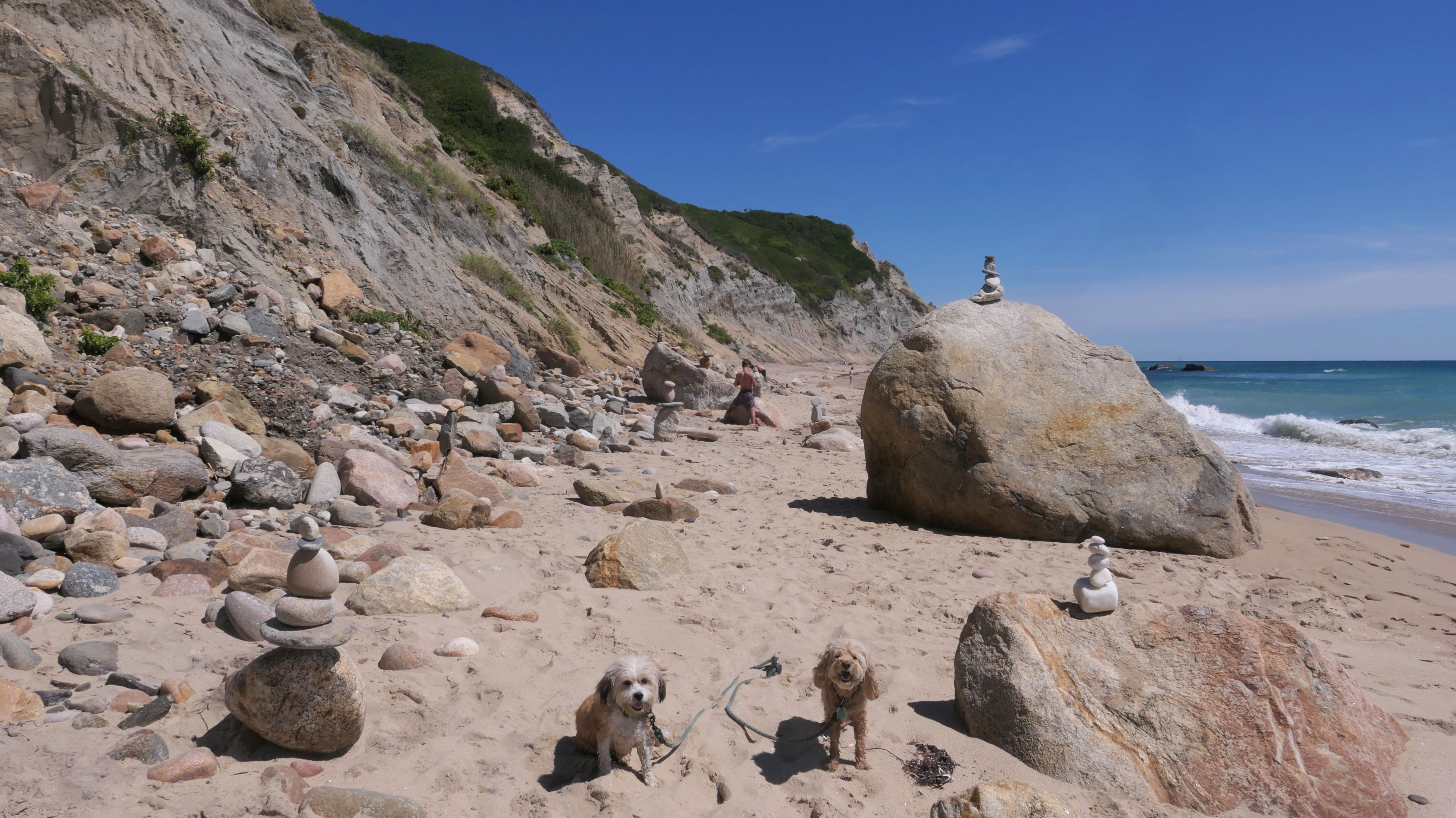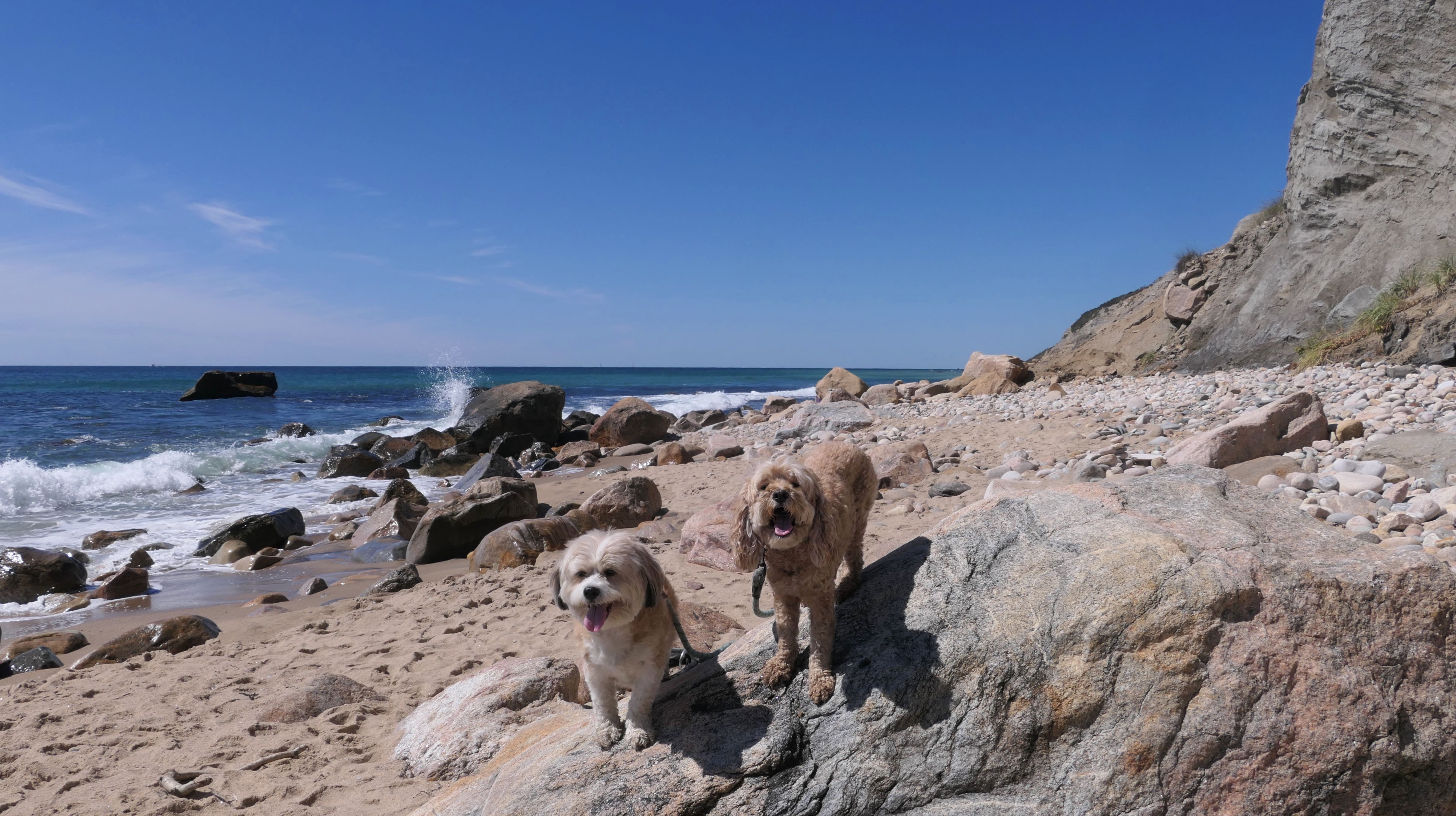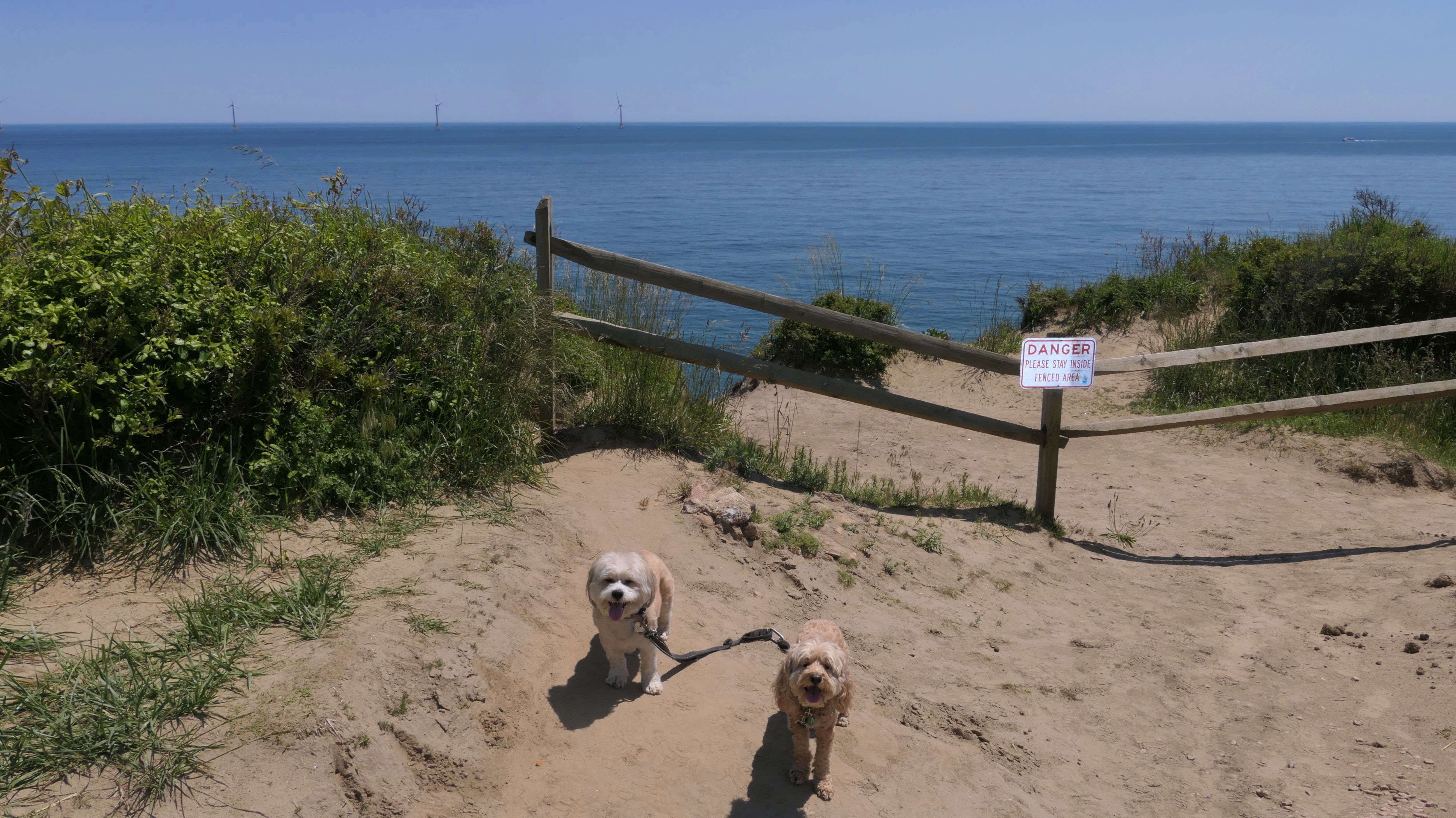 This was the highlight of this trip to Block Island. A couple months earlier we visited the Edward S Payne Overlook, and walked part way down the 141 steps, but did not go all the way down to the beach. This time, we were bound and determined to make it to the beach, so we went all the way down. At the bottom of the stairs is actually a series of rocks that have to be traversed carefully to get to the beach. Once at the bottom, we walked about a mile and a half along the beautiful shore, over to Vaill Beach before turning around and heading back. The views were gorgeous. The beach is a mix of sandy and rocky areas, with plenty of spots for great photos. One thing to be aware of, a section of the beach about a quarter mile from the stairs around the first bend, appears to be unofficially clothing optional. We encountered one nearly naked man sun bathing with his wife (he was wearing only a hat). His wife was wearing a bathing suit. Just something to be aware of. While we were walking back, I let the dogs off-leash to run around a bit. They always enjoy running free on the beach! We made it up the 141 steps on our way back with no issue. The hardest part was climbing over the rocks leading to the staircase. The area had gotten real busy, and there were people just sort of mulling around the rocks, making it difficult to get by. Once we got past that, the walk up wasn't too bad. I'm definitely glad we made it to this beach this time around. It was definitely worth the climb!