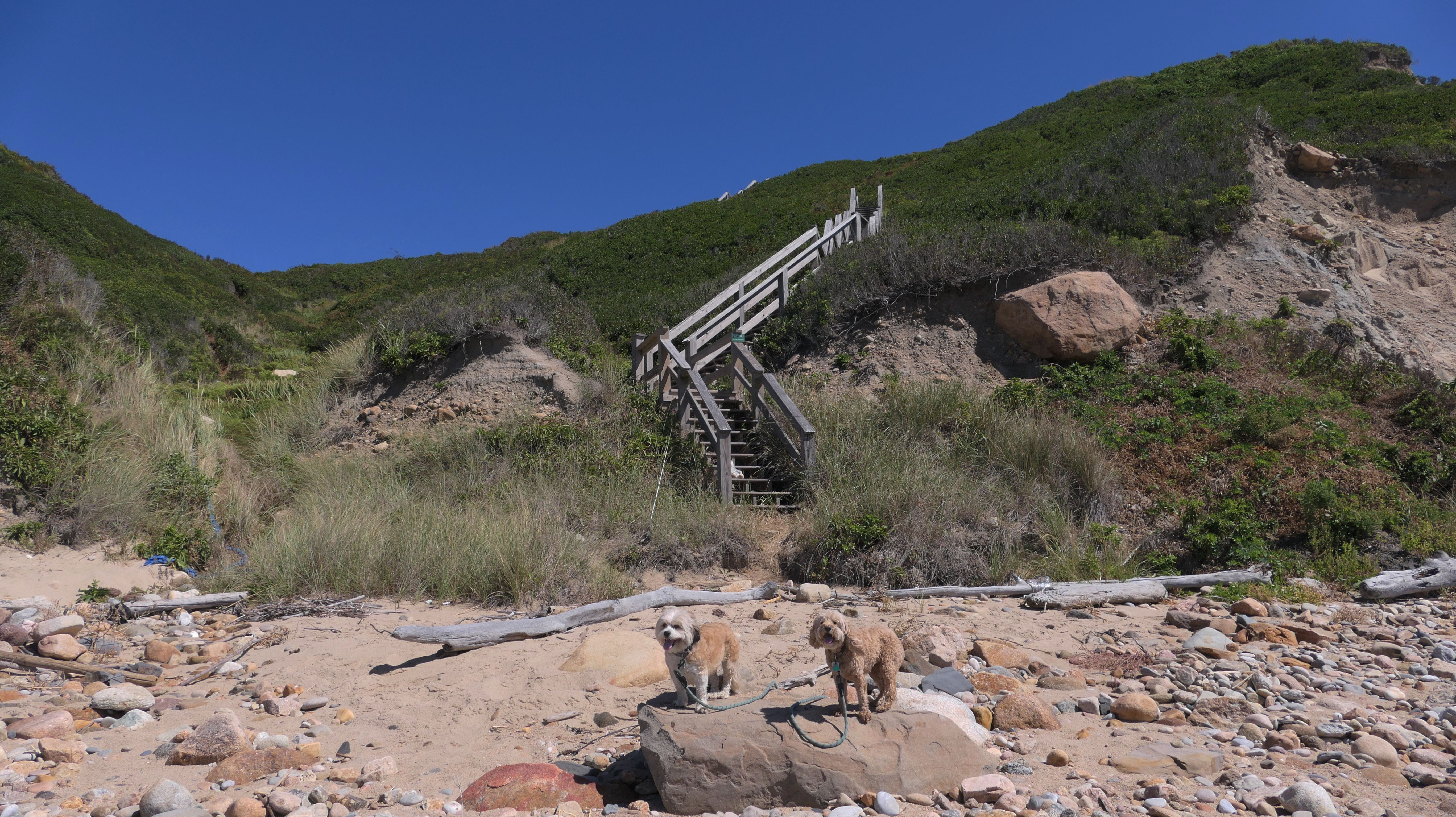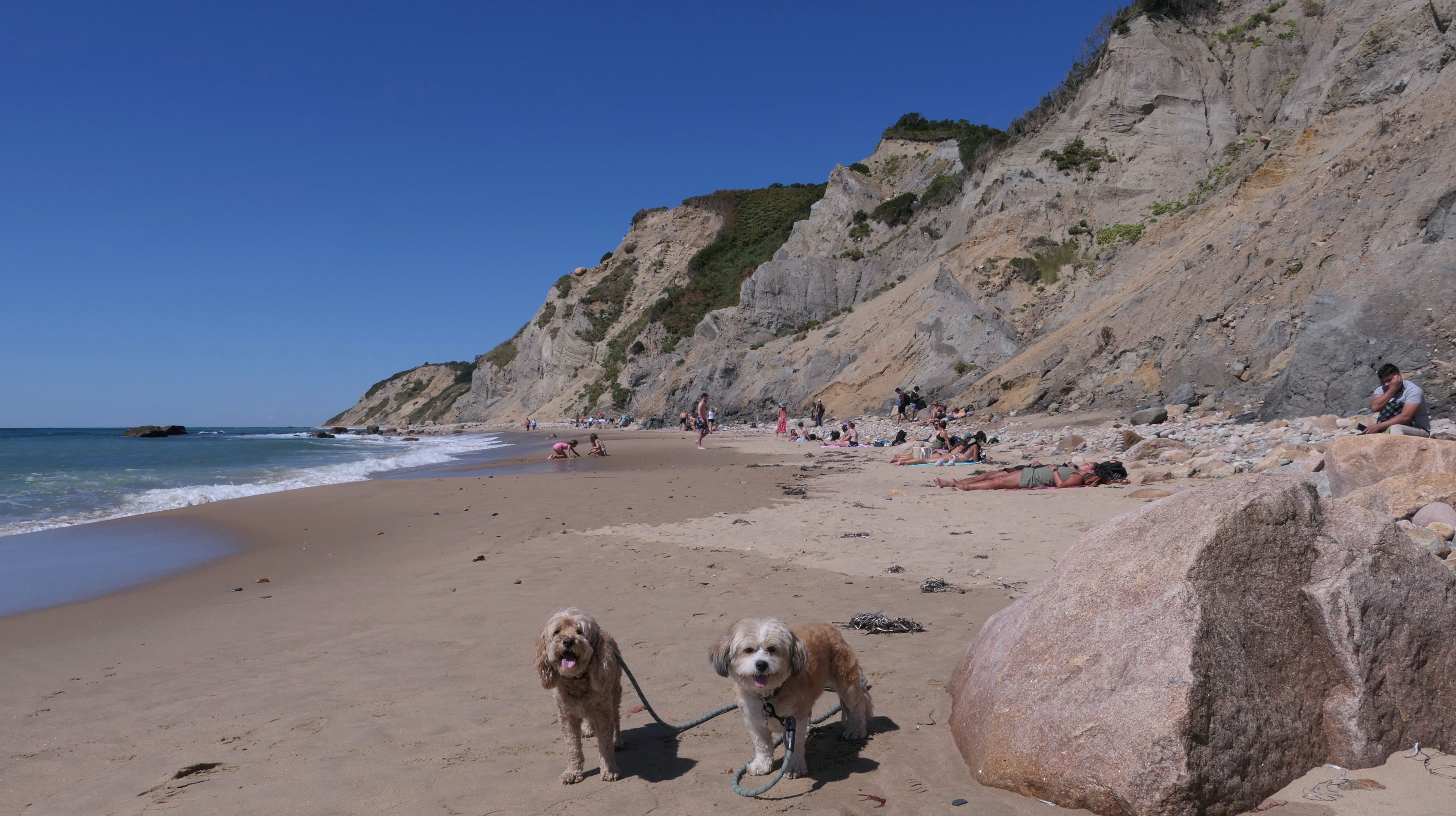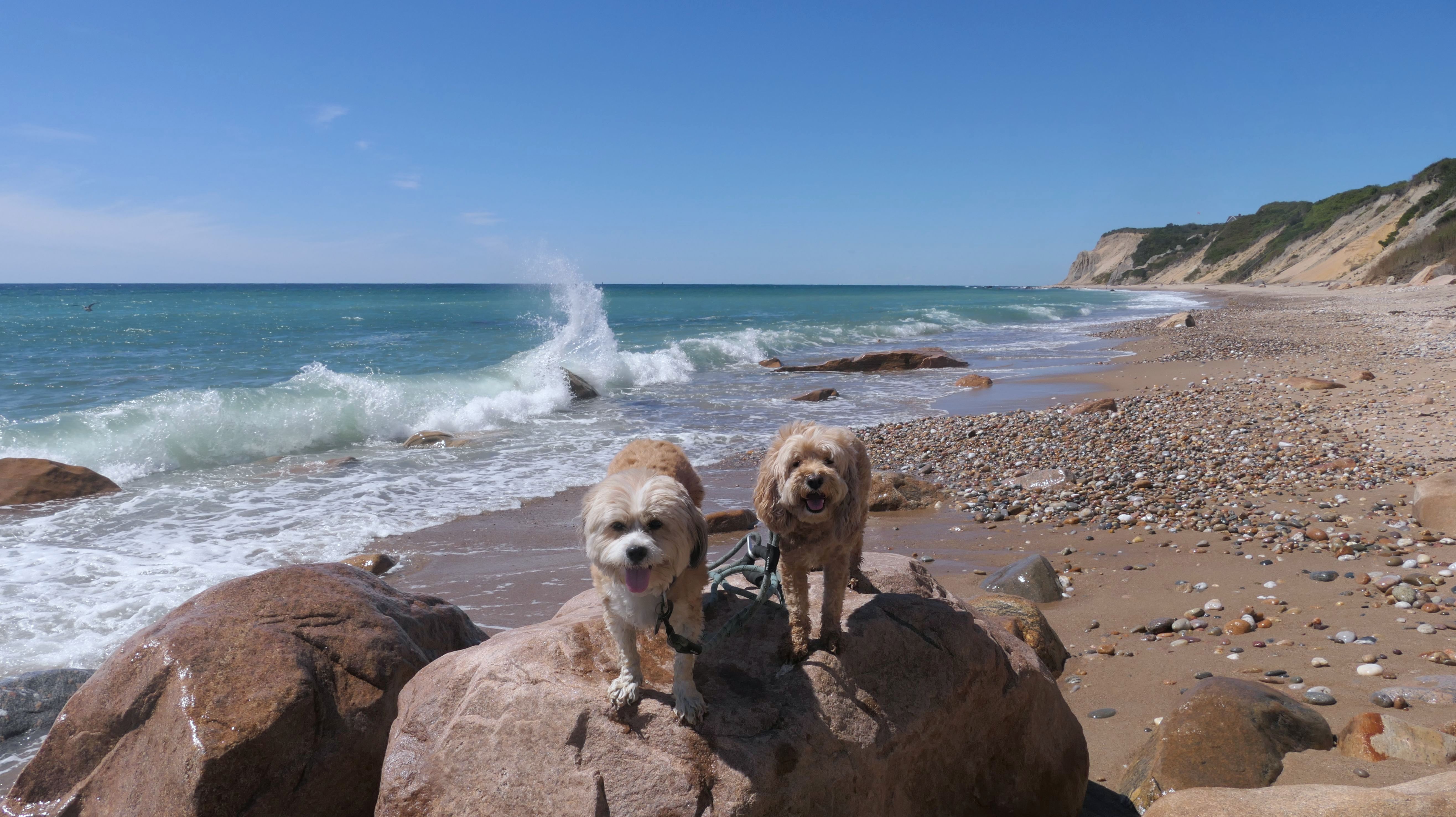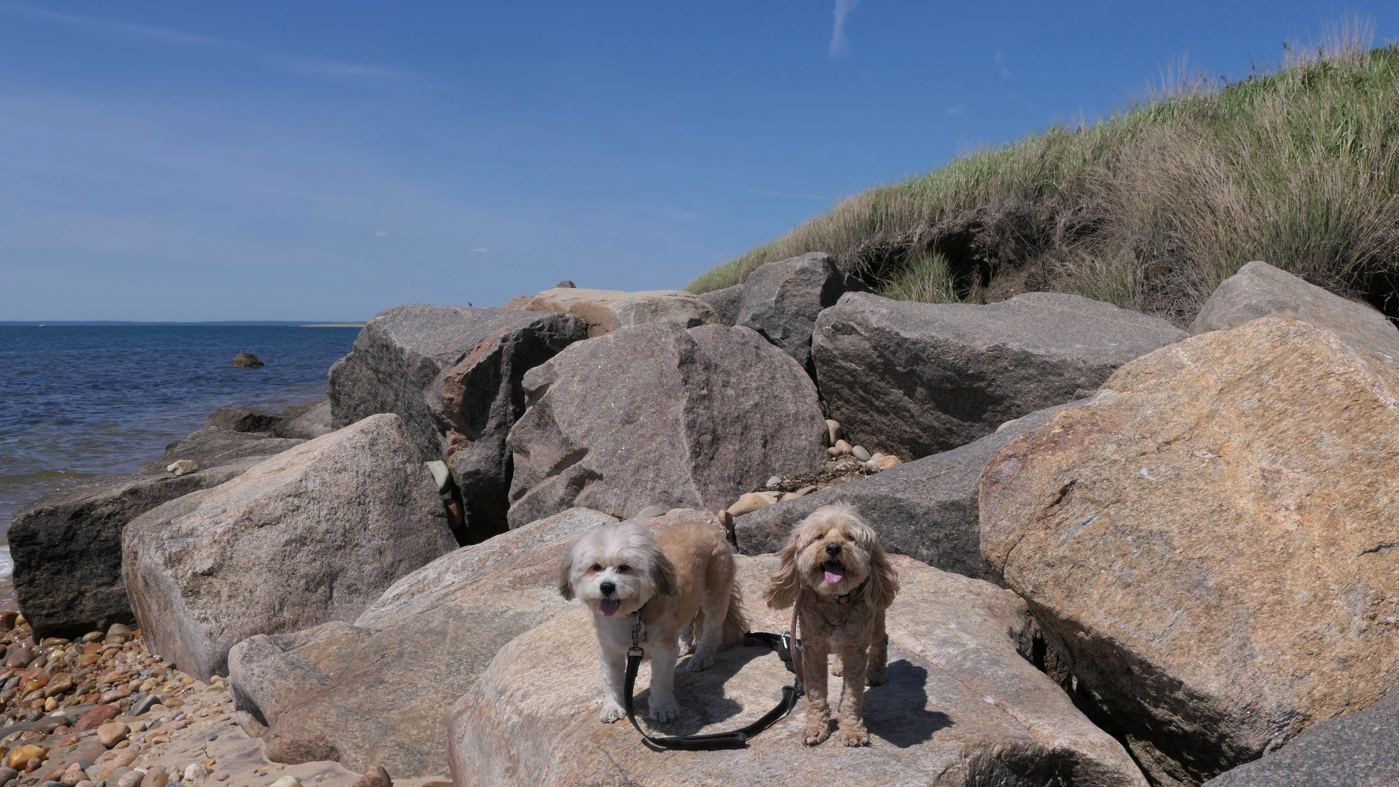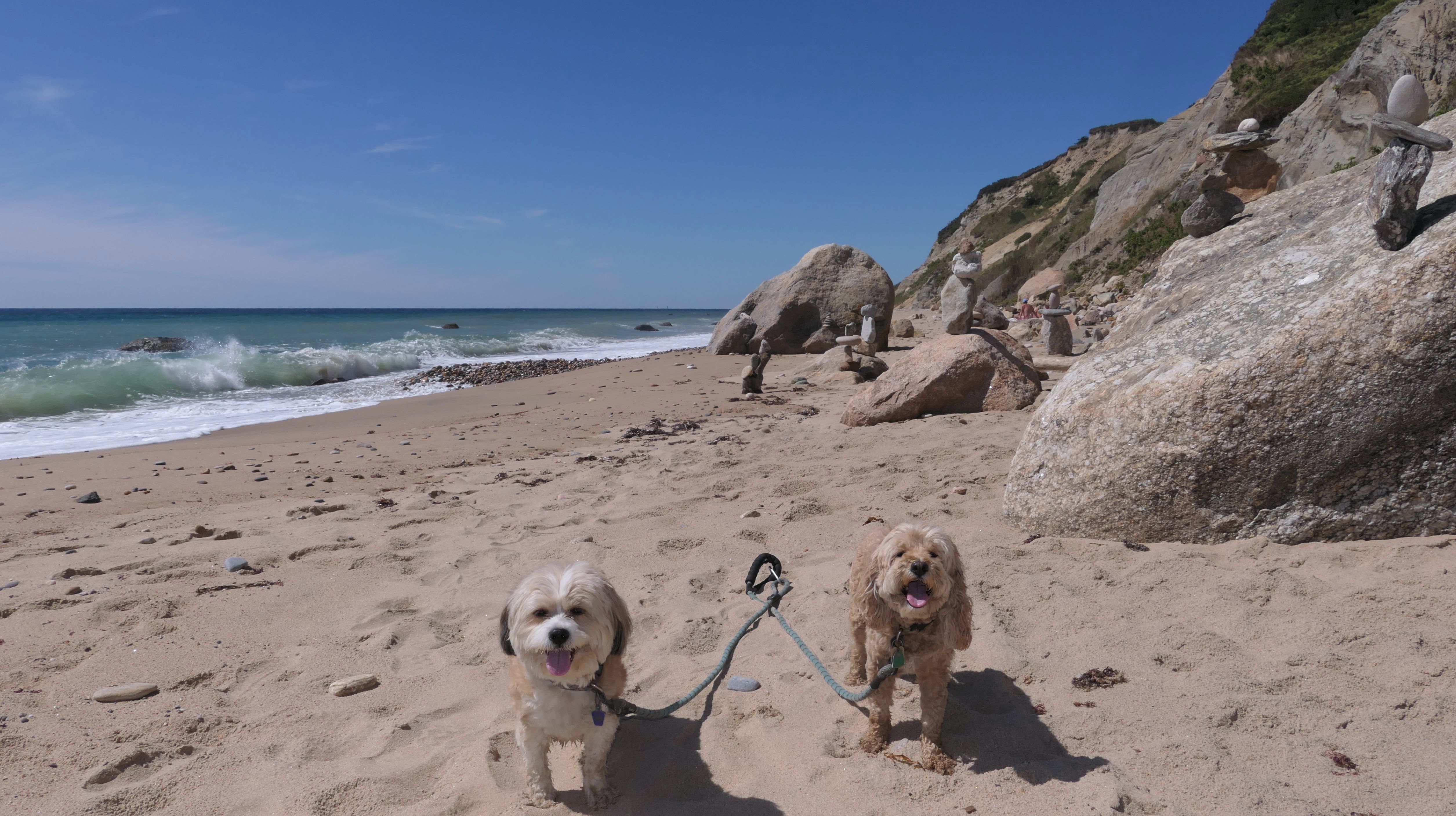 This was the highlight of this trip to Block Island. A couple months earlier we visited the Edward S Payne Overlook, and walked part way down the 141 steps, but did not go all the way down to the beach. This time, we were bound and determined to make it to the beach, so we went all the way down. At the bottom of the stairs is actually a series of rocks that have to be traversed carefully to get to the beach. Once at the bottom, we walked about a mile and a half along the beautiful shore, over to Vaill Beach before turning around and heading back. The views were gorgeous. The beach is a mix of sandy and rocky areas, with plenty of spots for great photos. One thing to be aware of, a section of the beach about a quarter mile from the stairs around the first bend, appears to be unofficially clothing optional. We encountered one nearly naked man sun bathing with his wife (he was wearing only a hat). His wife was wearing a bathing suit. Just something to be aware of. While we were walking back, I let the dogs off-leash to run around a bit. They always enjoy running free on the beach! We made it up the 141 steps on our way back with no issue. The hardest part was climbing over the rocks leading to the staircase. The area had gotten real busy, and there were people just sort of mulling around the rocks, making it difficult to get by. Once we got past that, the walk up wasn't too bad. I'm definitely glad we made it to this beach this time around. It was definitely worth the climb!