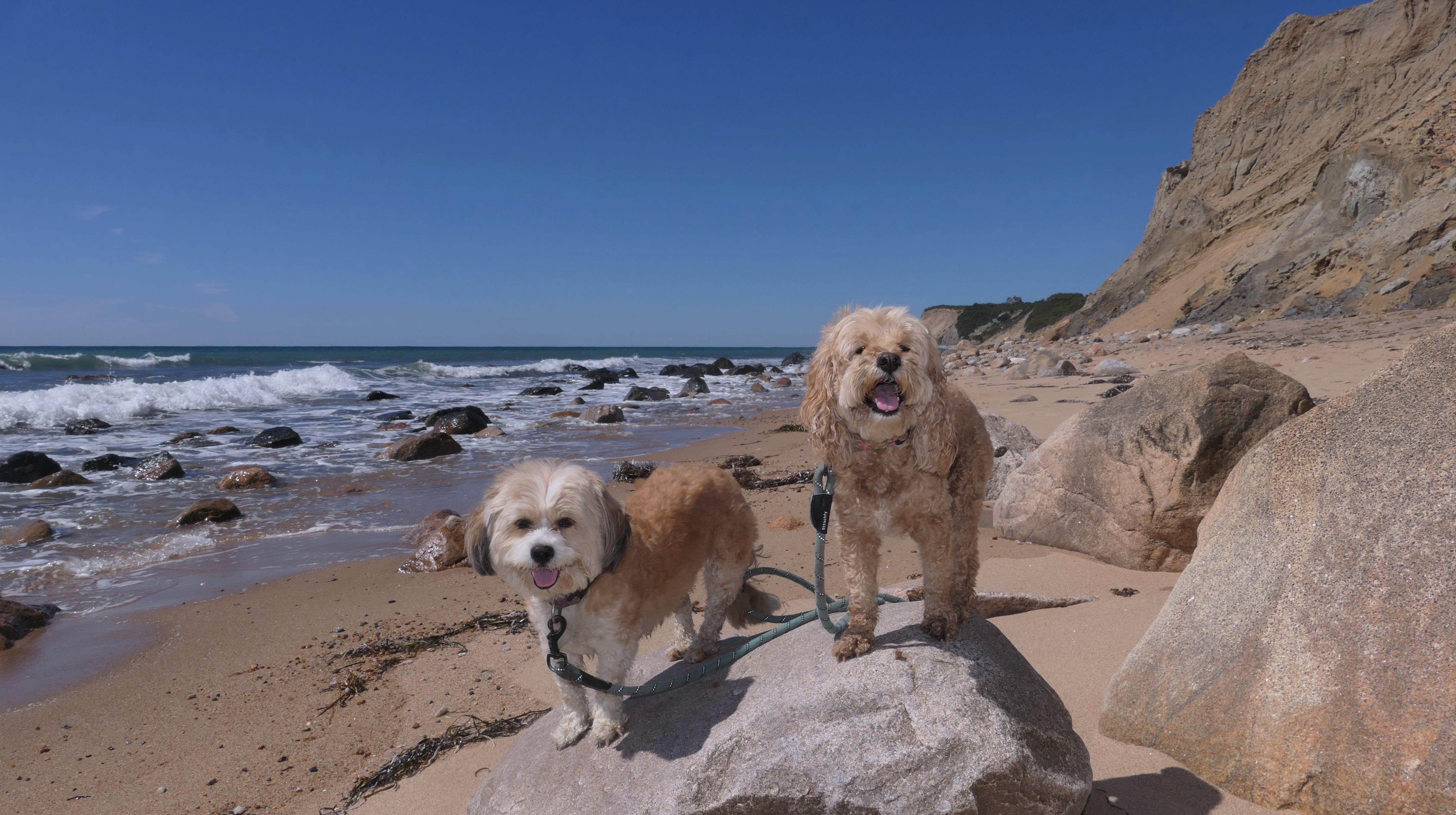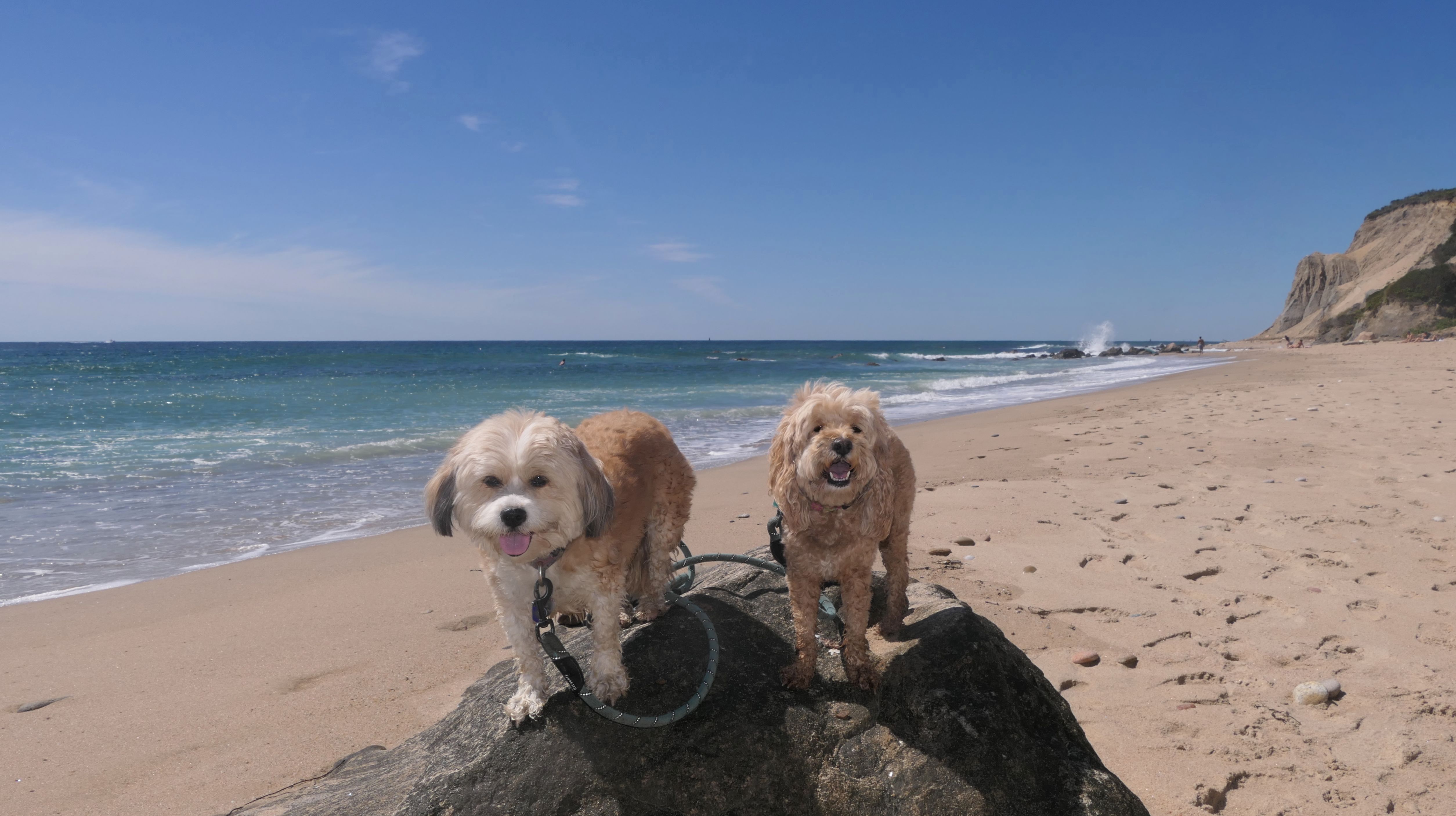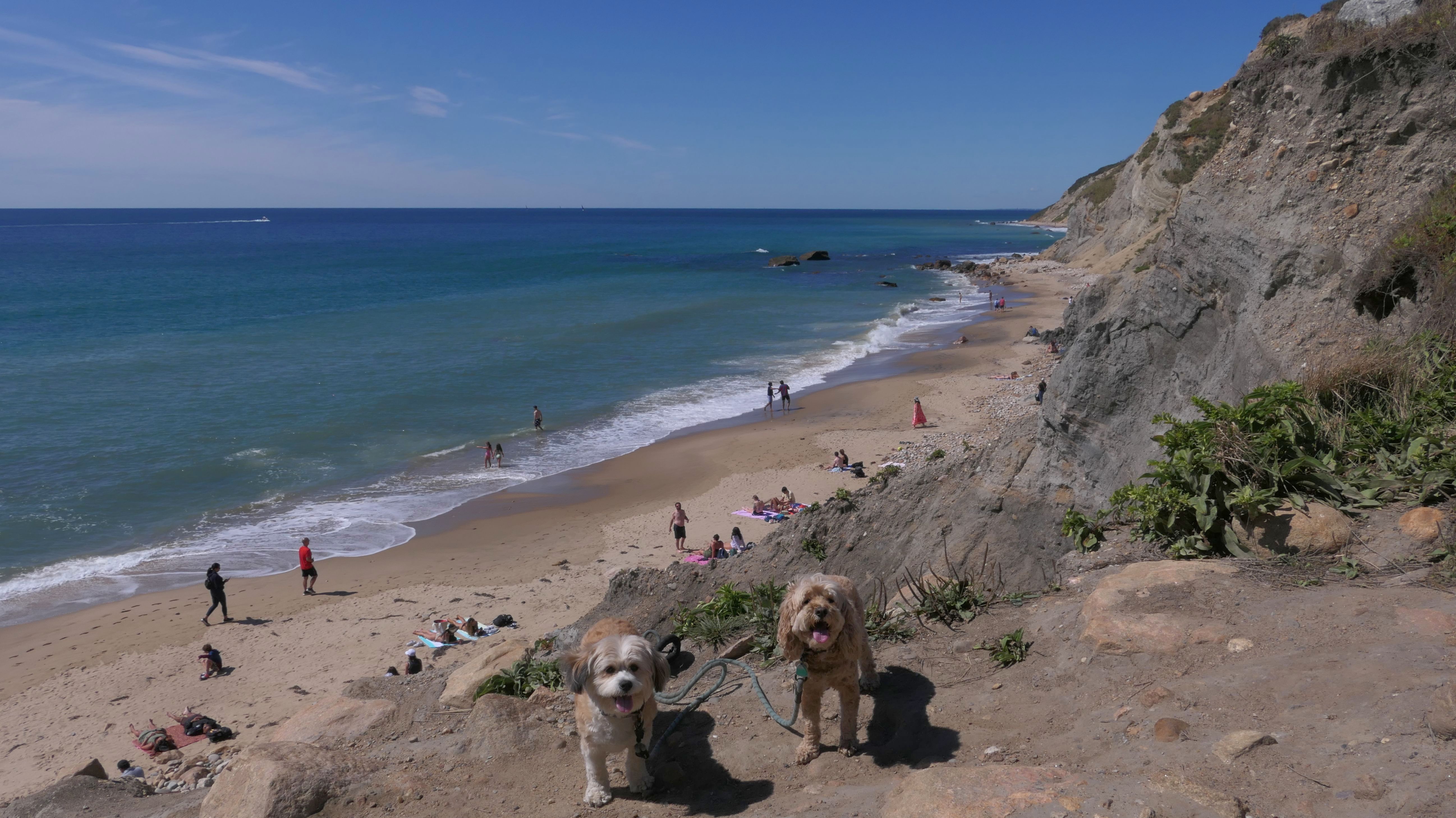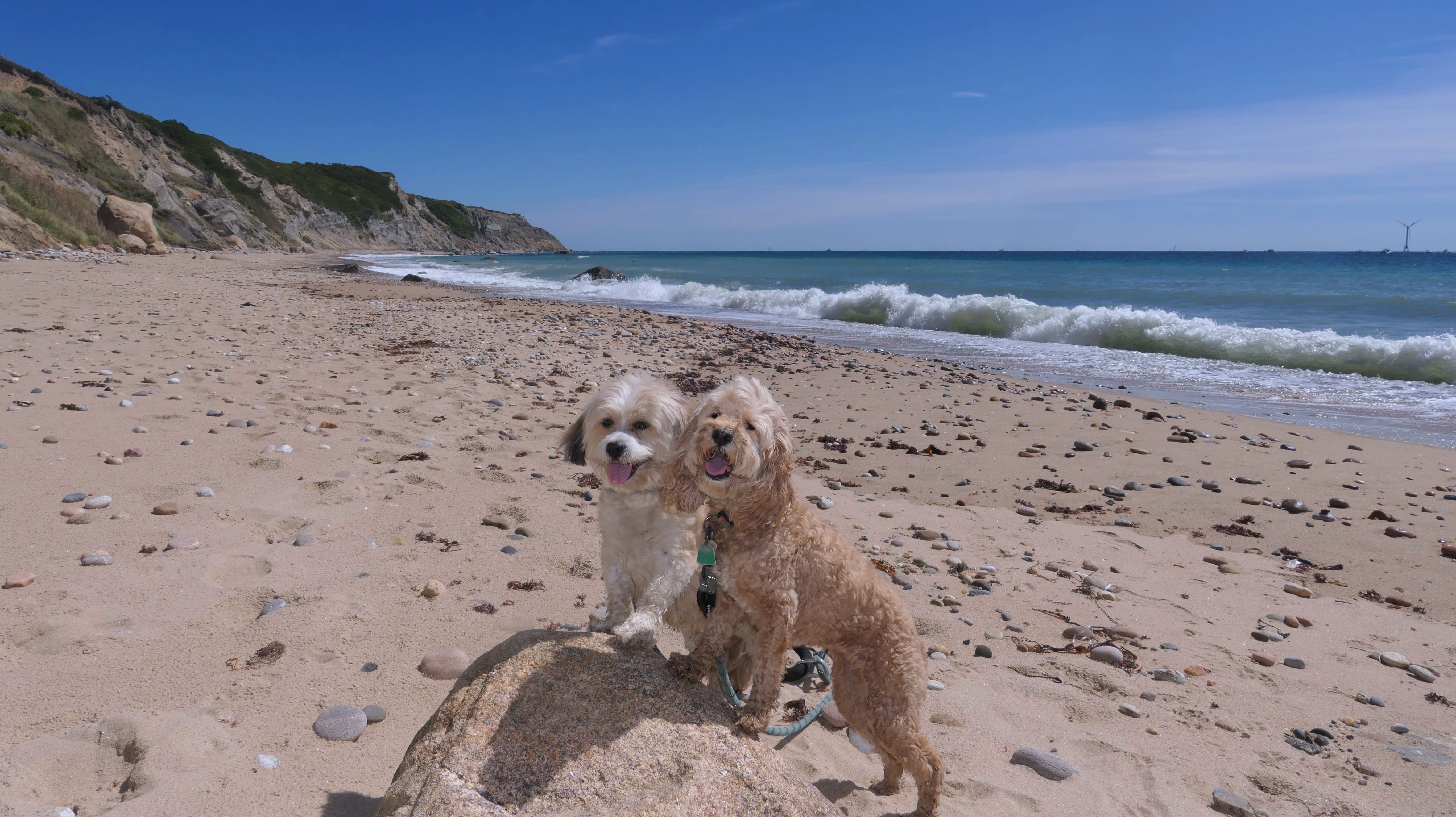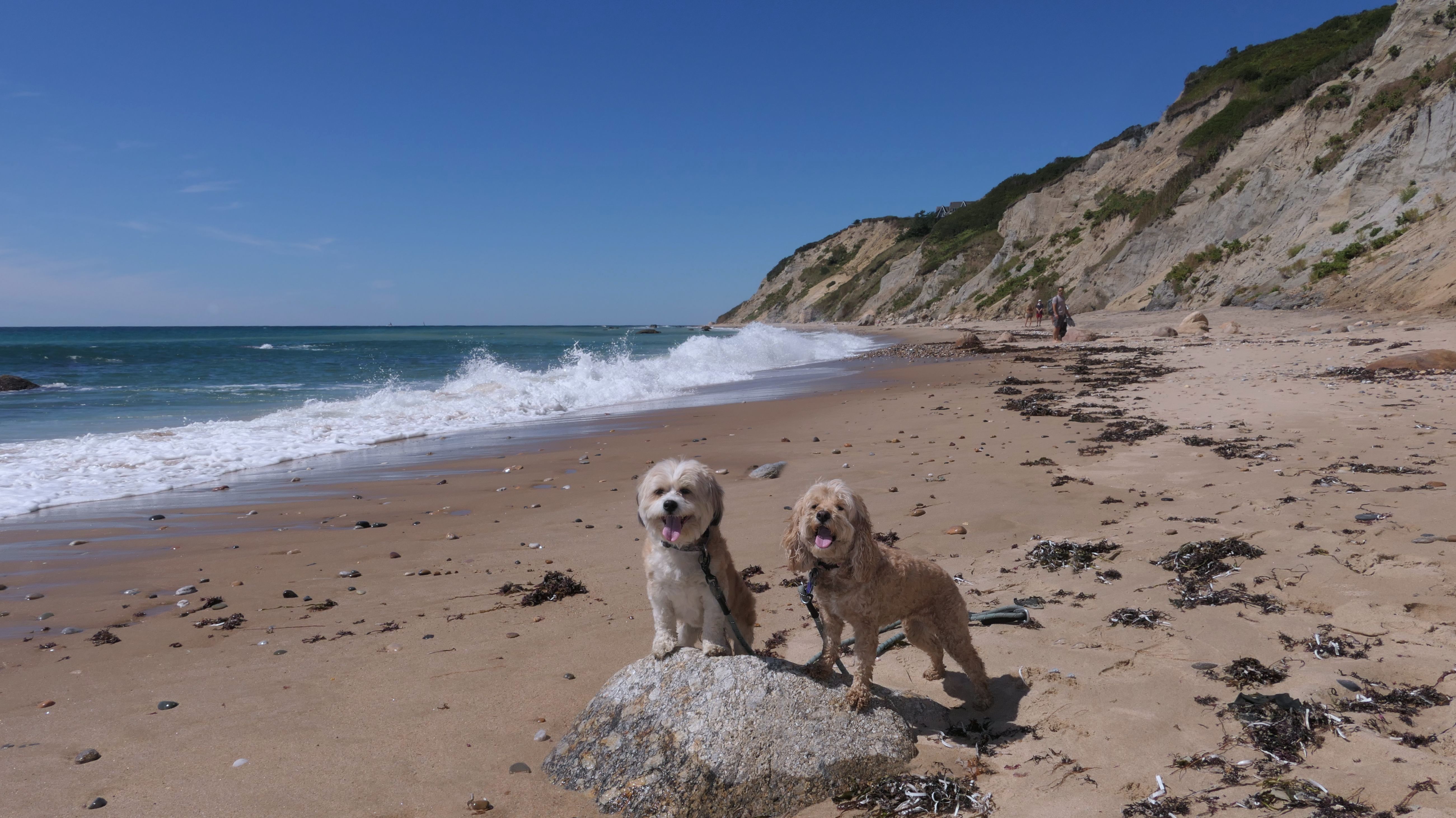 This was the highlight of this trip to Block Island. A couple months earlier we visited the Edward S Payne Overlook, and walked part way down the 141 steps, but did not go all the way down to the beach. This time, we were bound and determined to make it to the beach, so we went all the way down. At the bottom of the stairs is actually a series of rocks that have to be traversed carefully to get to the beach. Once at the bottom, we walked about a mile and a half along the beautiful shore, over to Vaill Beach before turning around and heading back. The views were gorgeous. The beach is a mix of sandy and rocky areas, with plenty of spots for great photos. One thing to be aware of, a section of the beach about a quarter mile from the stairs around the first bend, appears to be unofficially clothing optional. We encountered one nearly naked man sun bathing with his wife (he was wearing only a hat). His wife was wearing a bathing suit. Just something to be aware of. While we were walking back, I let the dogs off-leash to run around a bit. They always enjoy running free on the beach! We made it up the 141 steps on our way back with no issue. The hardest part was climbing over the rocks leading to the staircase. The area had gotten real busy, and there were people just sort of mulling around the rocks, making it difficult to get by. Once we got past that, the walk up wasn't too bad. I'm definitely glad we made it to this beach this time around. It was definitely worth the climb!