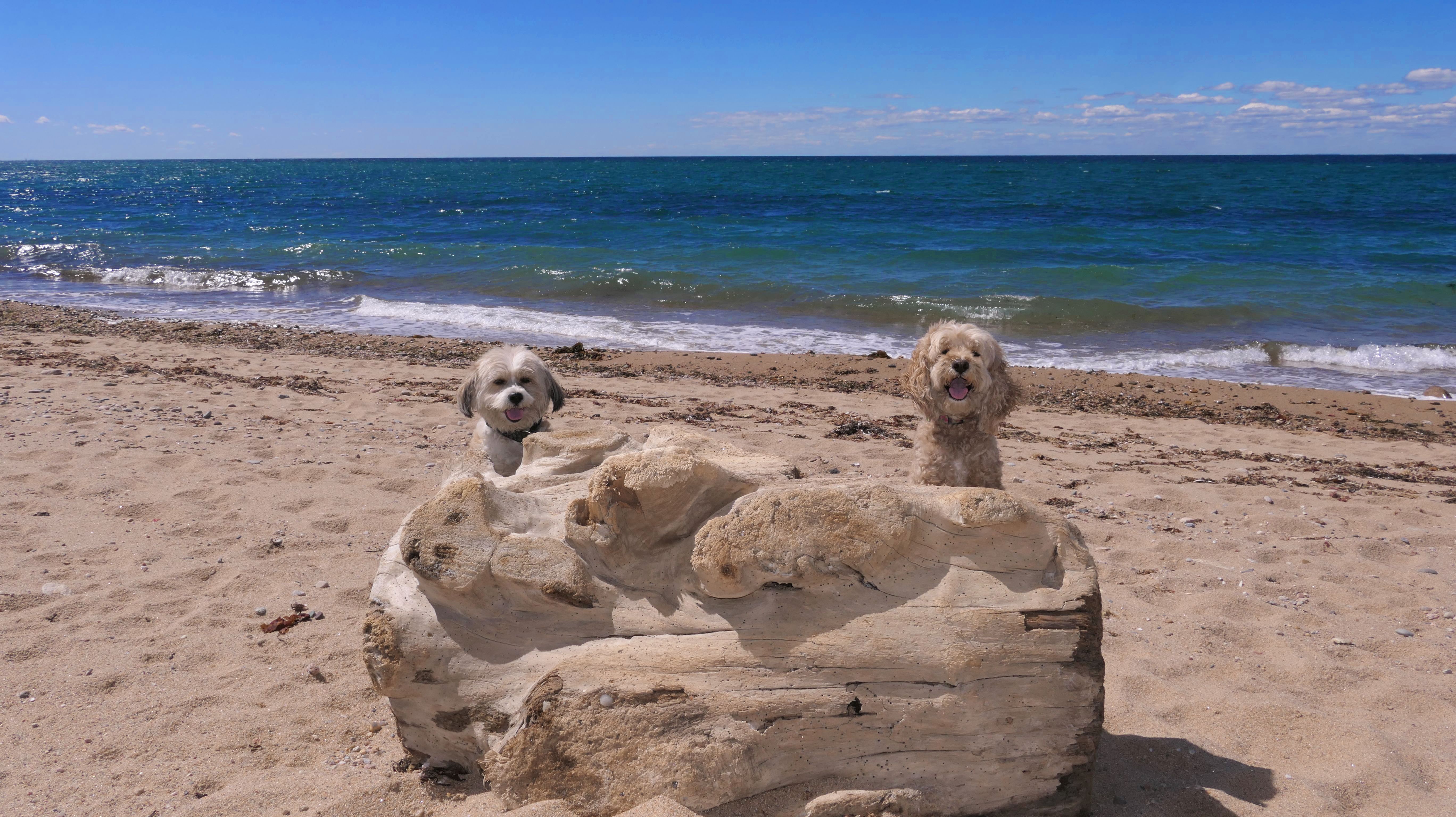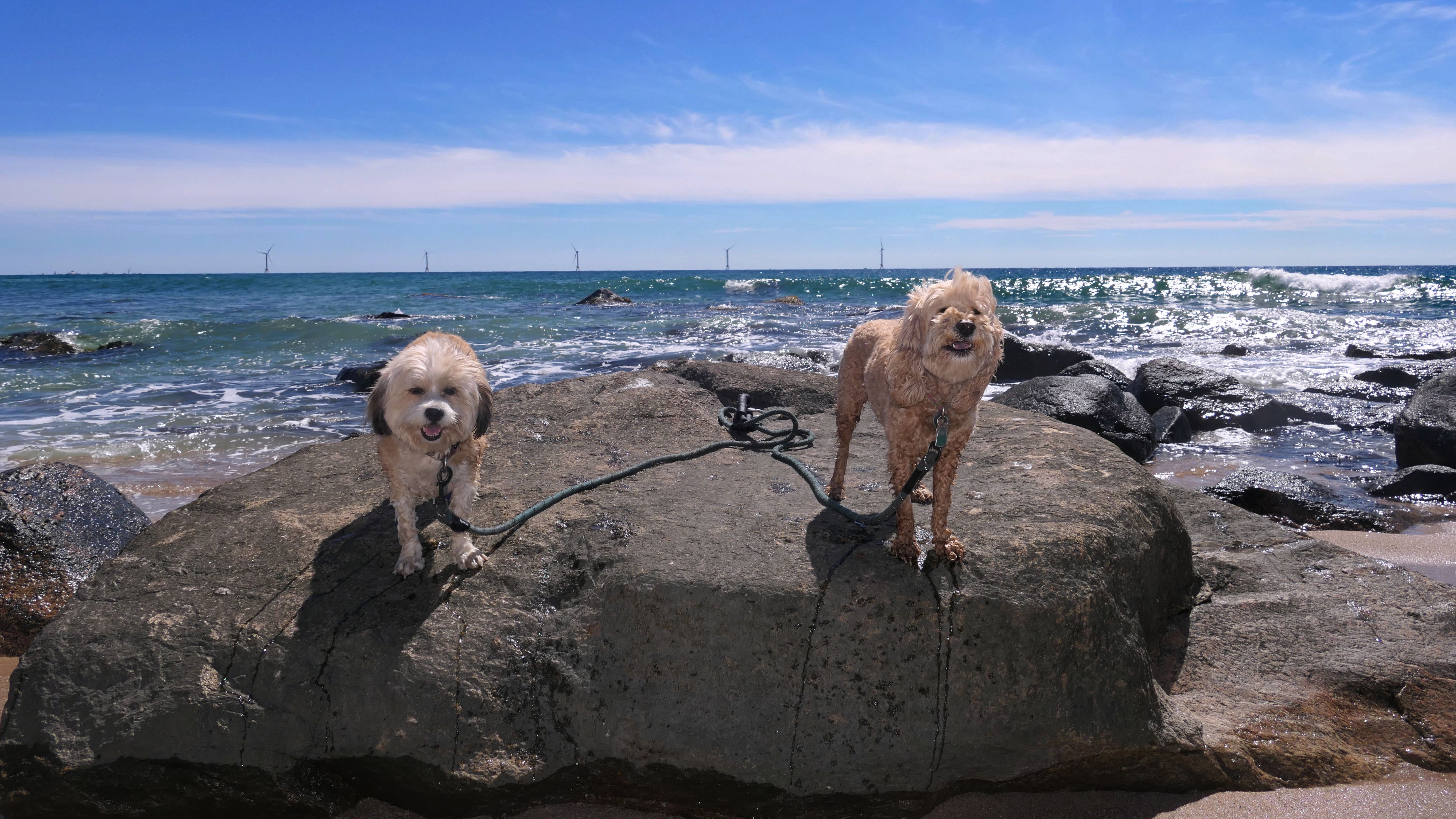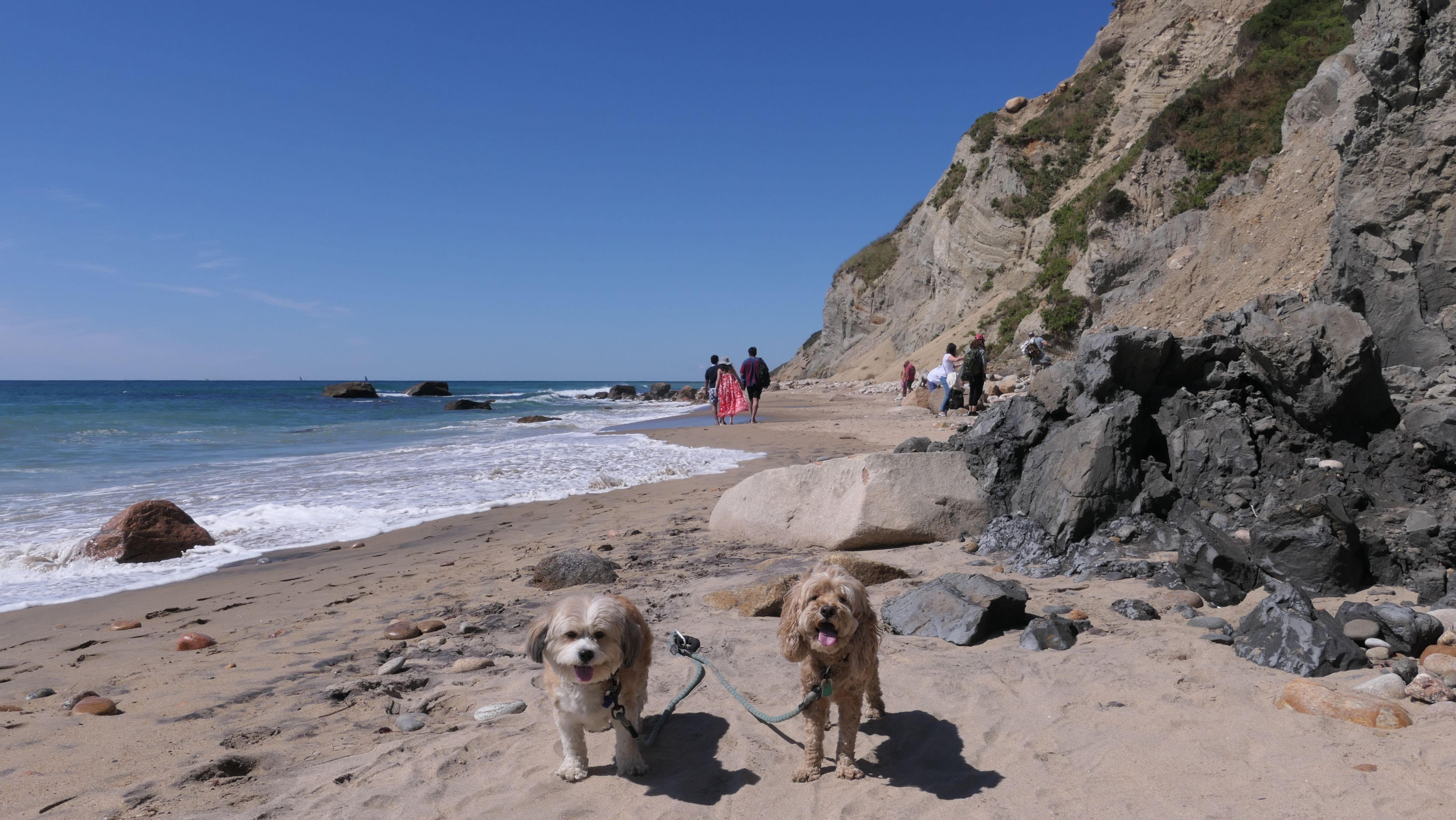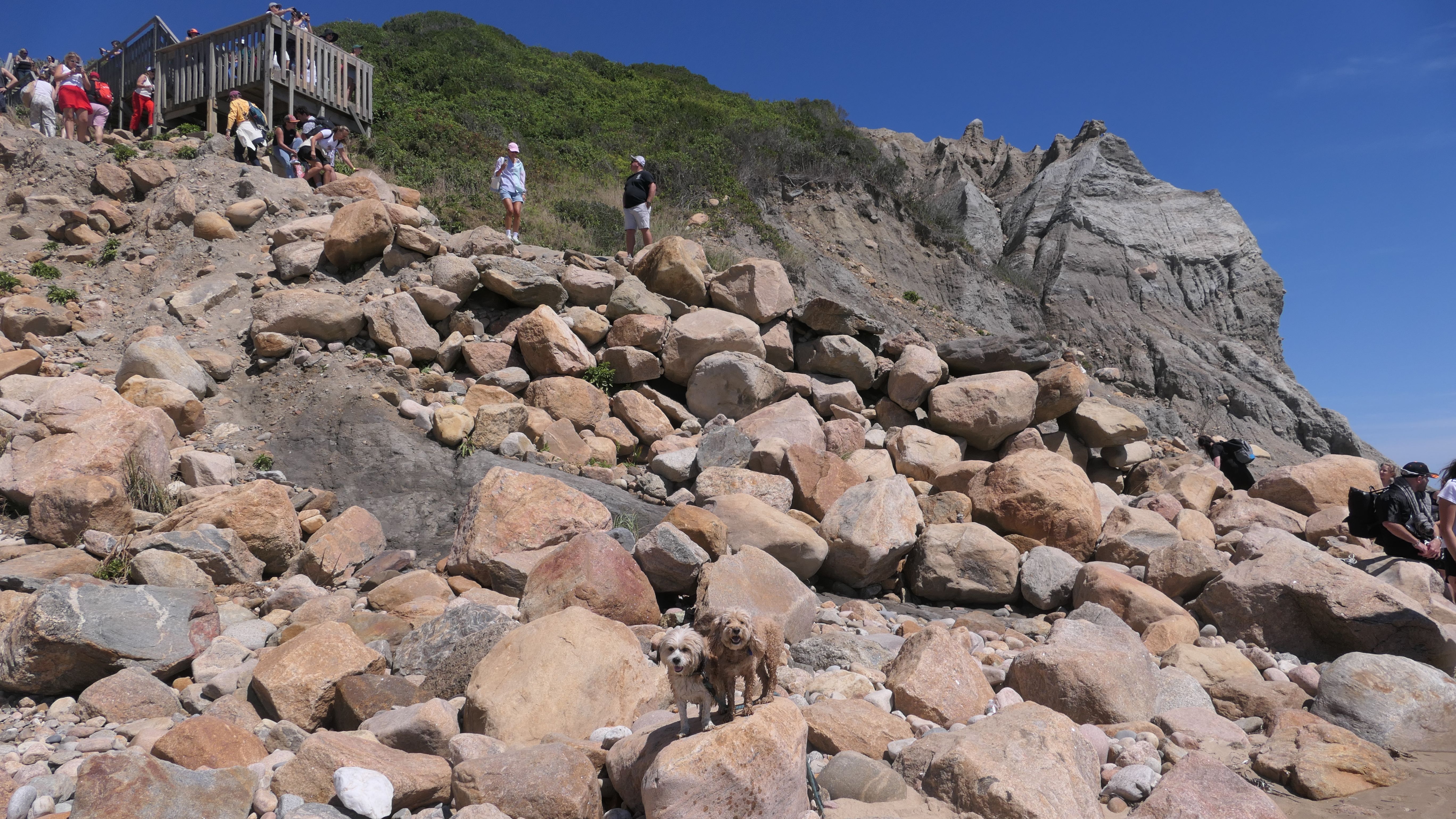 This was the highlight of this trip to Block Island. A couple months earlier we visited the Edward S Payne Overlook, and walked part way down the 141 steps, but did not go all the way down to the beach. This time, we were bound and determined to make it to the beach, so we went all the way down. At the bottom of the stairs is actually a series of rocks that have to be traversed carefully to get to the beach. Once at the bottom, we walked about a mile and a half along the beautiful shore, over to Vaill Beach before turning around and heading back. The views were gorgeous. The beach is a mix of sandy and rocky areas, with plenty of spots for great photos. One thing to be aware of, a section of the beach about a quarter mile from the stairs around the first bend, appears to be unofficially clothing optional. We encountered one nearly naked man sun bathing with his wife (he was wearing only a hat). His wife was wearing a bathing suit. Just something to be aware of. While we were walking back, I let the dogs off-leash to run around a bit. They always enjoy running free on the beach! We made it up the 141 steps on our way back with no issue. The hardest part was climbing over the rocks leading to the staircase. The area had gotten real busy, and there were people just sort of mulling around the rocks, making it difficult to get by. Once we got past that, the walk up wasn't too bad. I'm definitely glad we made it to this beach this time around. It was definitely worth the climb!