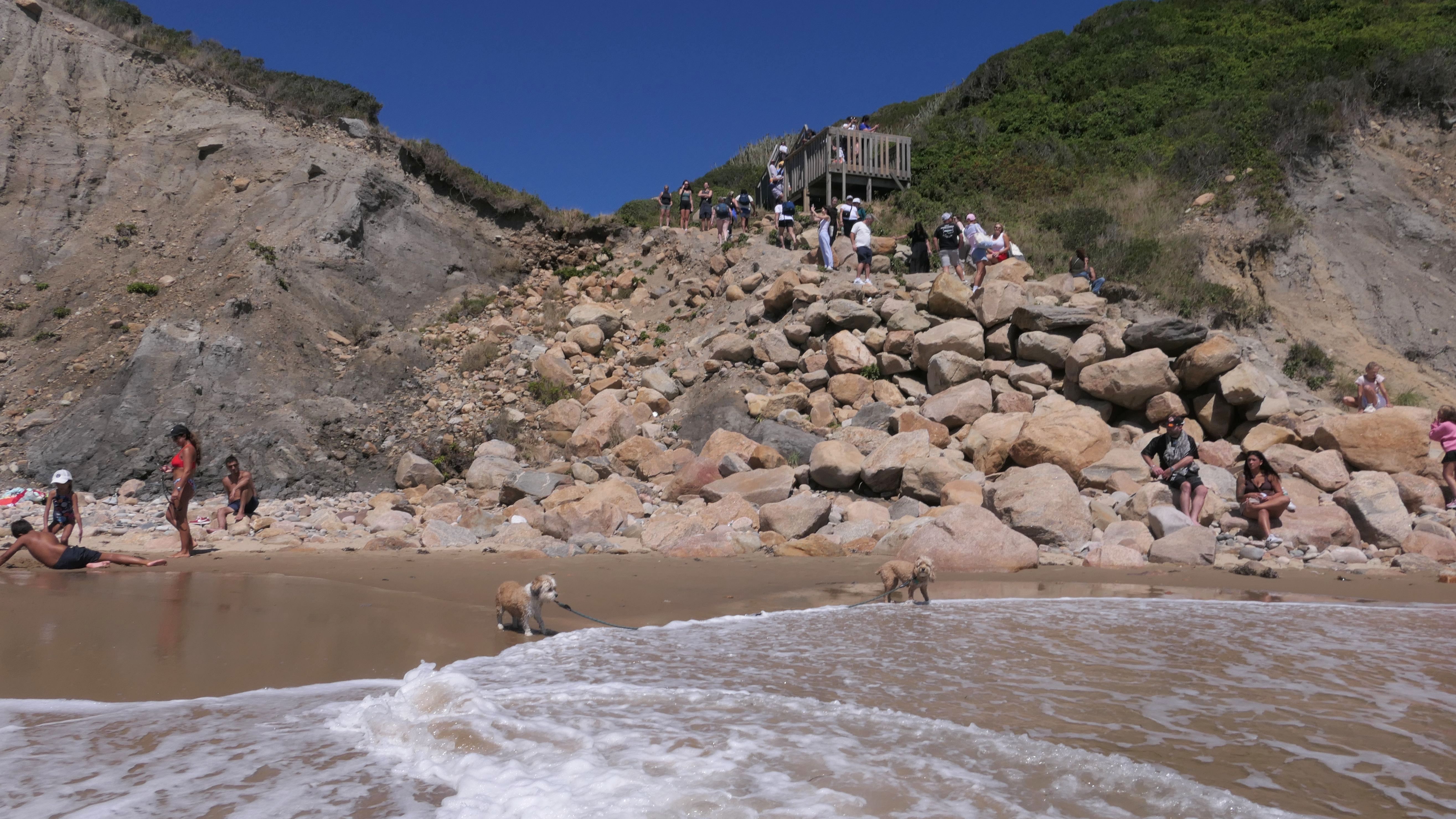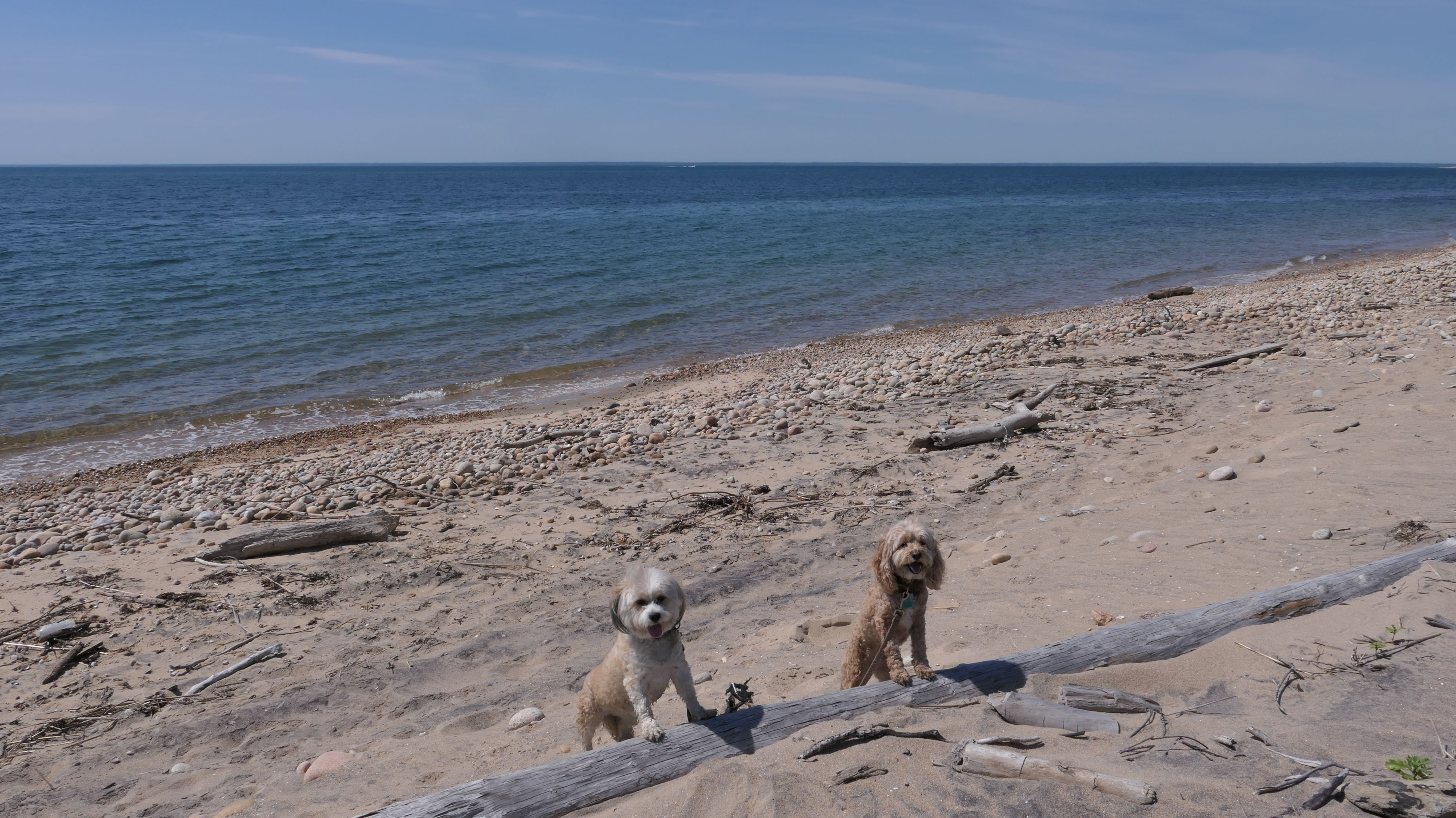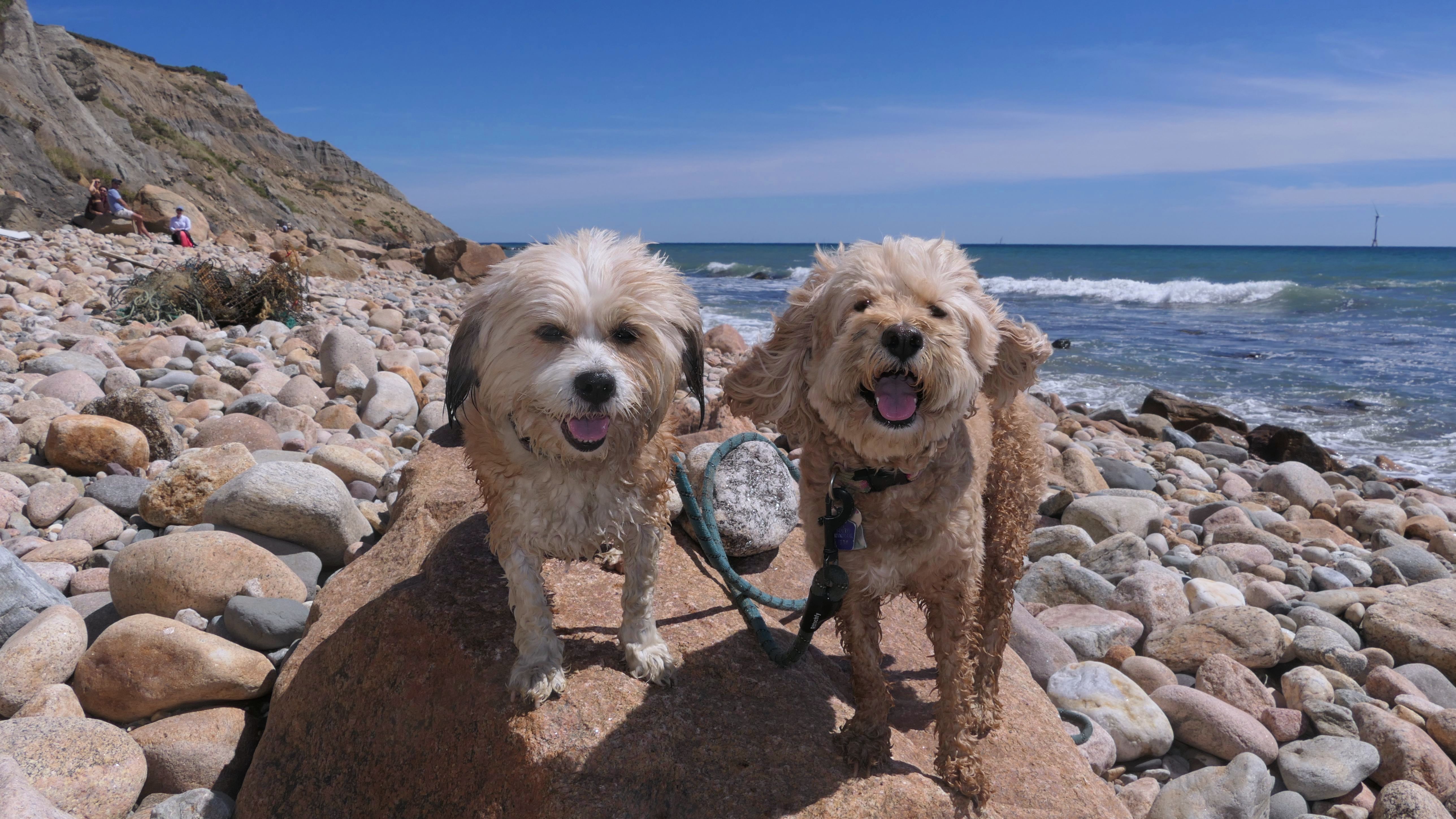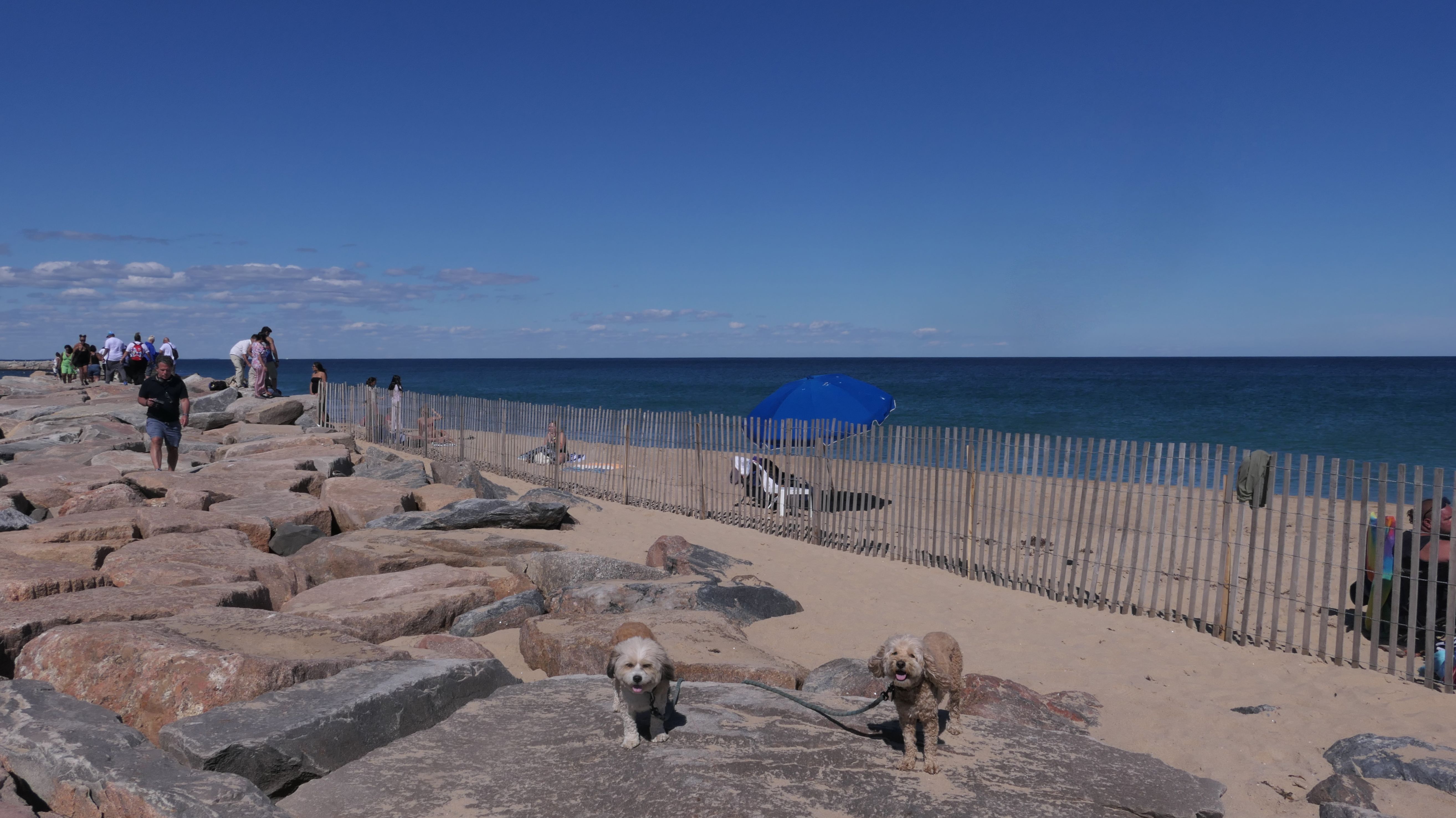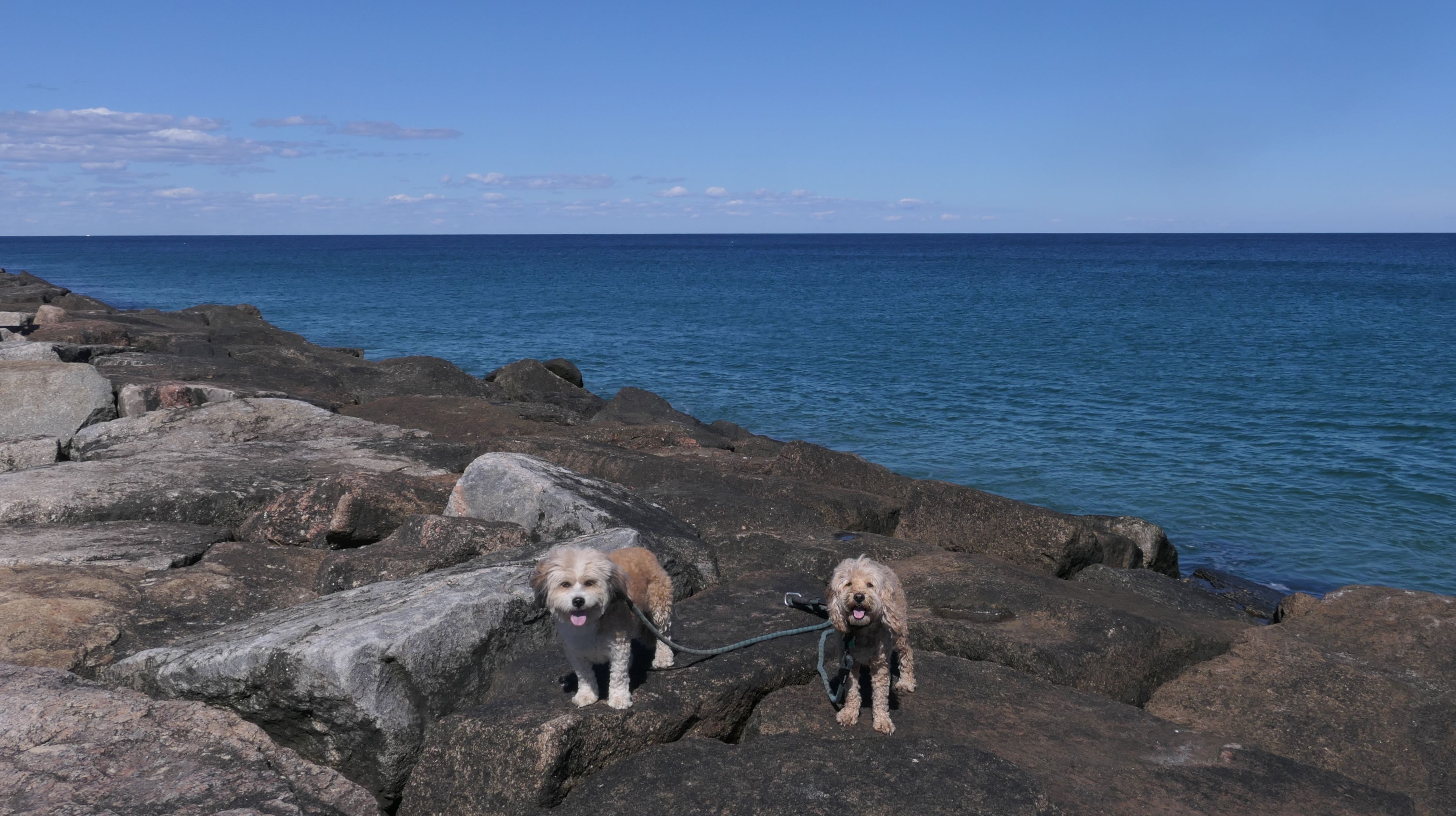 This was the highlight of this trip to Block Island. A couple months earlier we visited the Edward S Payne Overlook, and walked part way down the 141 steps, but did not go all the way down to the beach. This time, we were bound and determined to make it to the beach, so we went all the way down. At the bottom of the stairs is actually a series of rocks that have to be traversed carefully to get to the beach. Once at the bottom, we walked about a mile and a half along the beautiful shore, over to Vaill Beach before turning around and heading back. The views were gorgeous. The beach is a mix of sandy and rocky areas, with plenty of spots for great photos. One thing to be aware of, a section of the beach about a quarter mile from the stairs around the first bend, appears to be unofficially clothing optional. We encountered one nearly naked man sun bathing with his wife (he was wearing only a hat). His wife was wearing a bathing suit. Just something to be aware of. While we were walking back, I let the dogs off-leash to run around a bit. They always enjoy running free on the beach! We made it up the 141 steps on our way back with no issue. The hardest part was climbing over the rocks leading to the staircase. The area had gotten real busy, and there were people just sort of mulling around the rocks, making it difficult to get by. Once we got past that, the walk up wasn't too bad. I'm definitely glad we made it to this beach this time around. It was definitely worth the climb!
