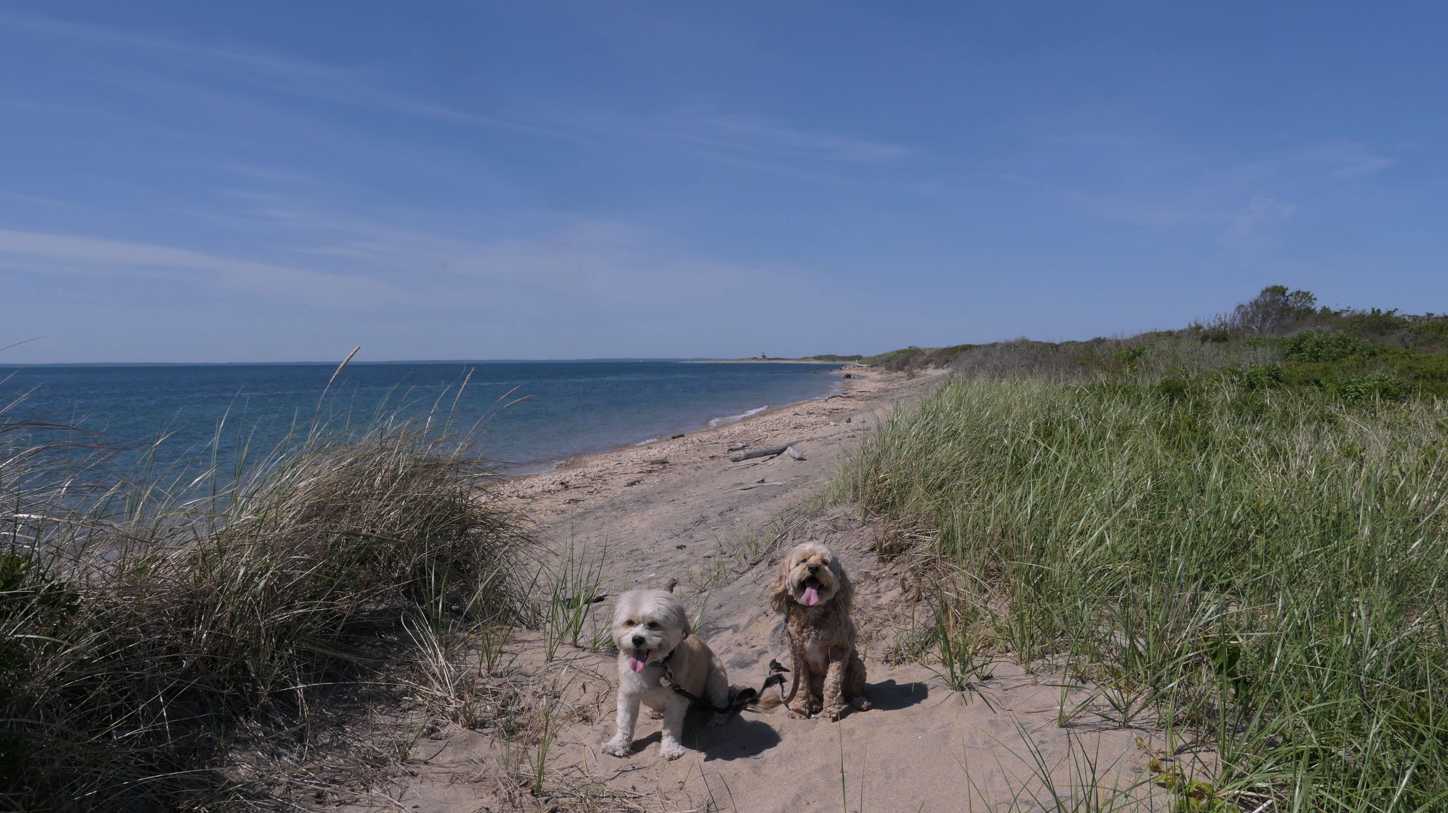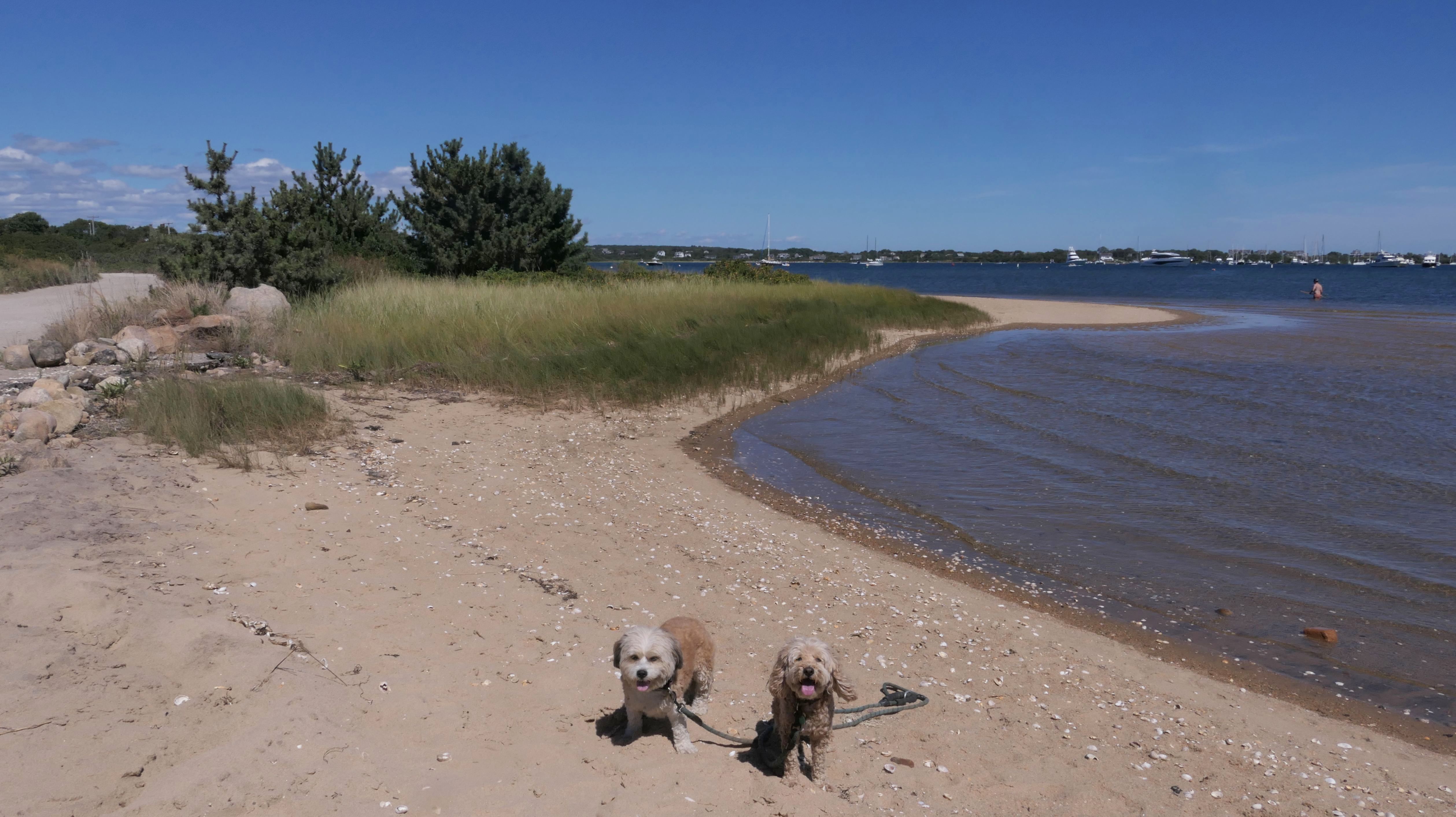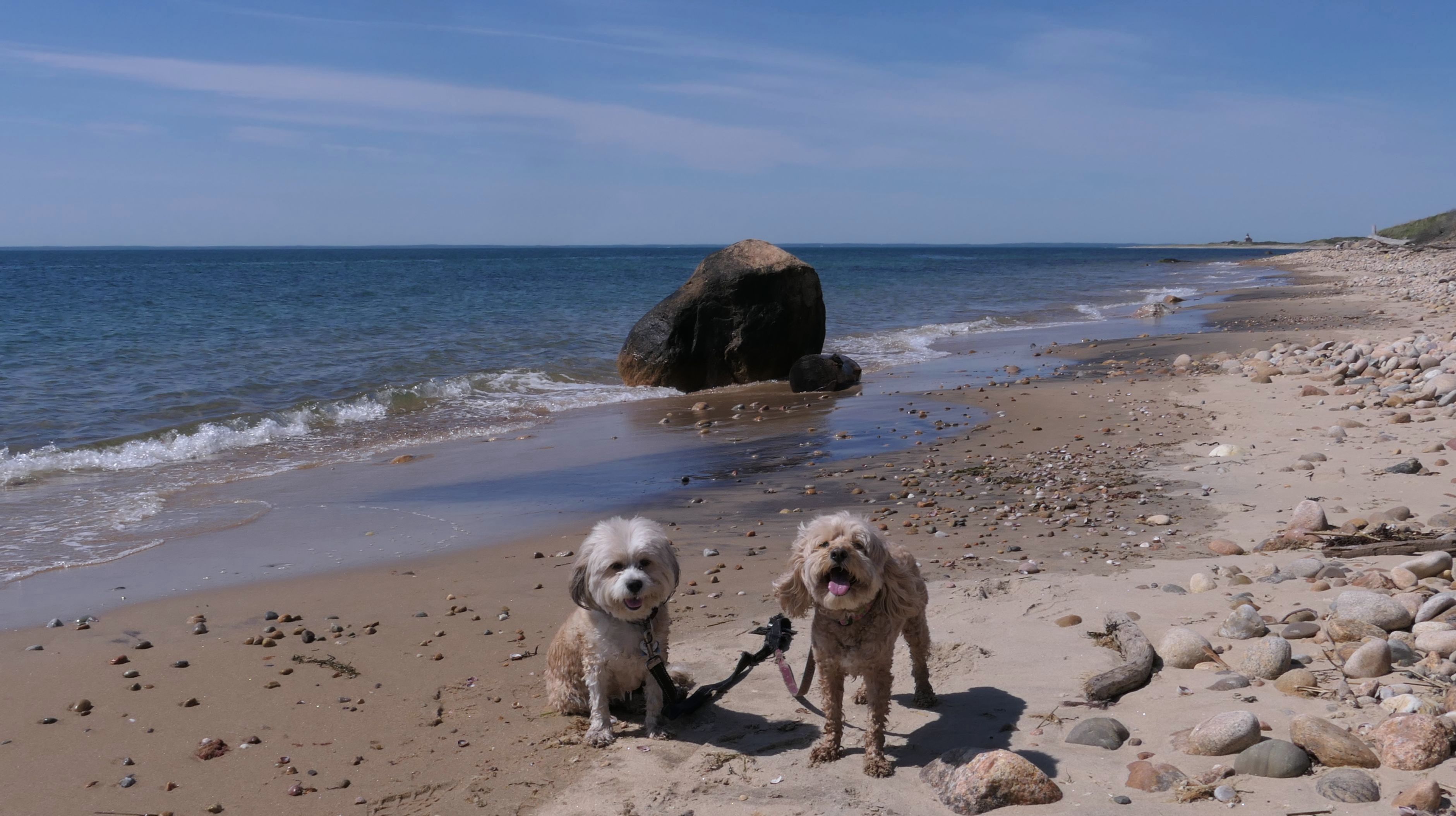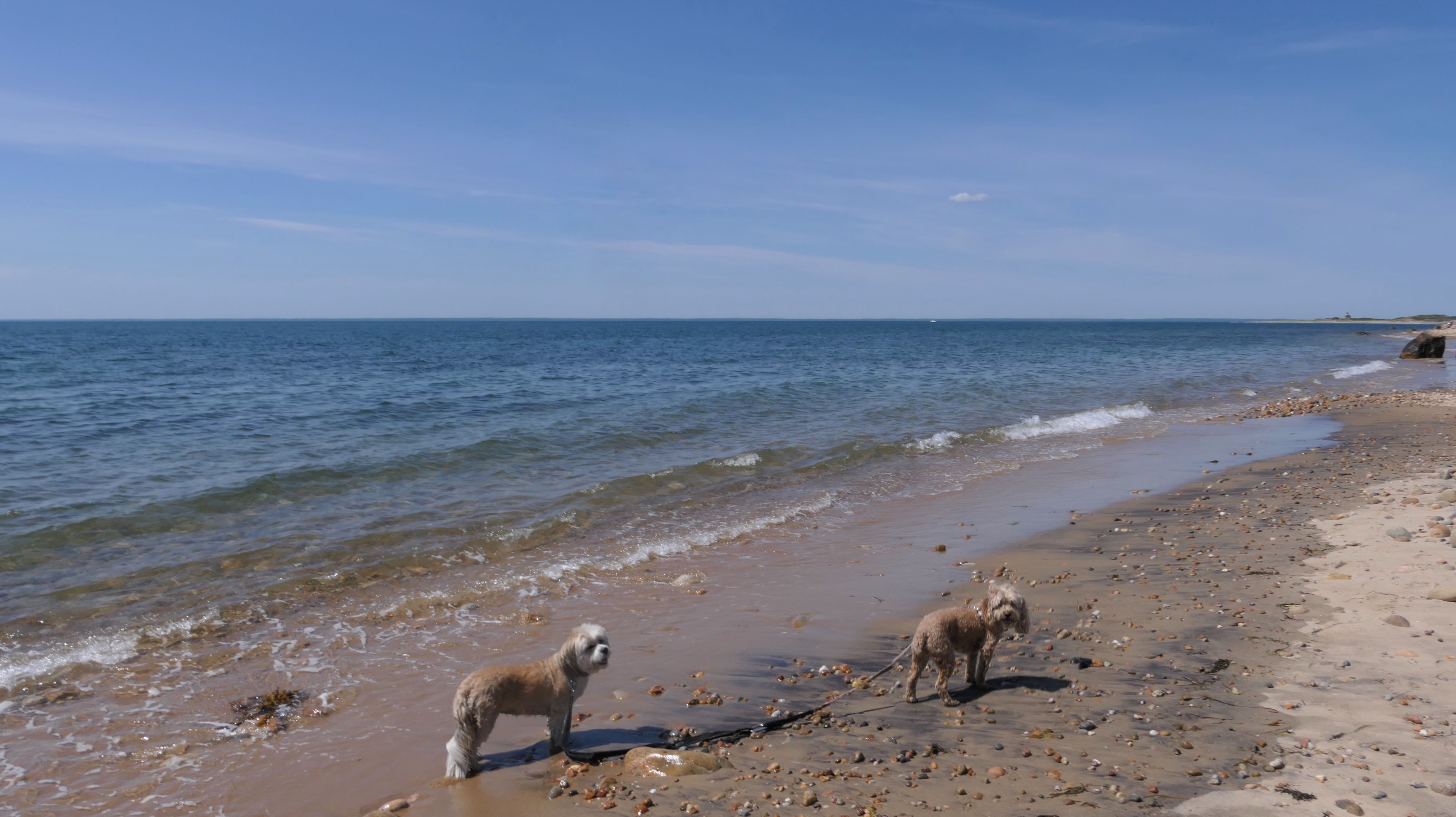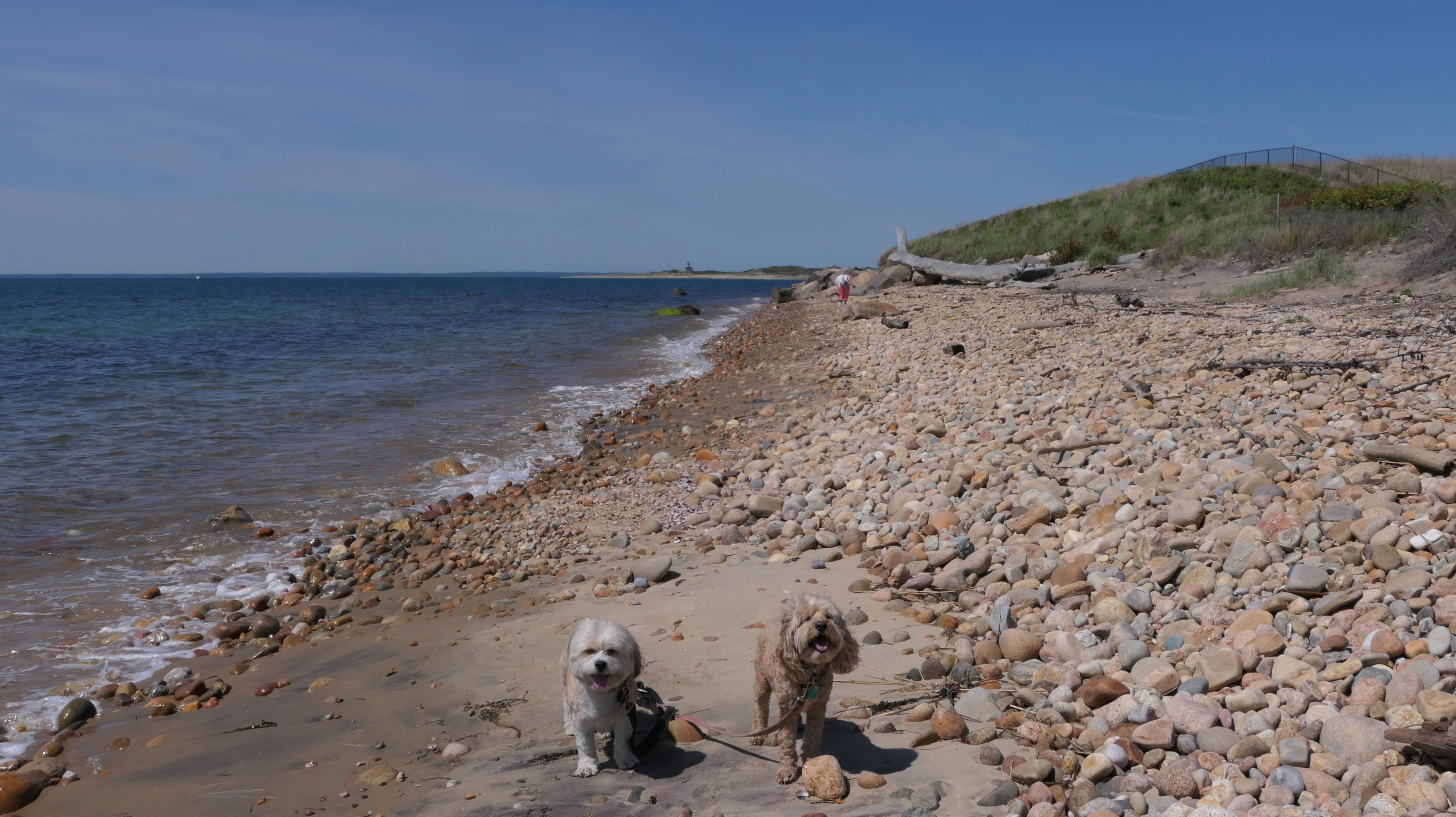 Since we rented a car for the day, I wanted to go to a beach that we couldn't get to on our previous trips. Some of the nicer beaches along the southern coast of the island require long climbs down steep dunes, so we settled for this beach along the northwest side of the island. It's remote and out of the way. We were the only ones there. It's rocky, with milder waves, which is the way the dogs like it! The informational sign near the ferry landing says this is a good spot to find beach glass, but all we found was broken glass from bottles near the entrance to the beach at the end of West Beach Road. Be careful with the dogs at the entrance! We found a trail that leads out toward the Great Salt Pond. We walked down that trail a short distance before turning around and heading back. This was a different experience from the tourist beaches along the northeast side of the island, but I didn't think it was quite as nice. Mandy and Lexi loved the water though, and in the end, isn't that all that counts!