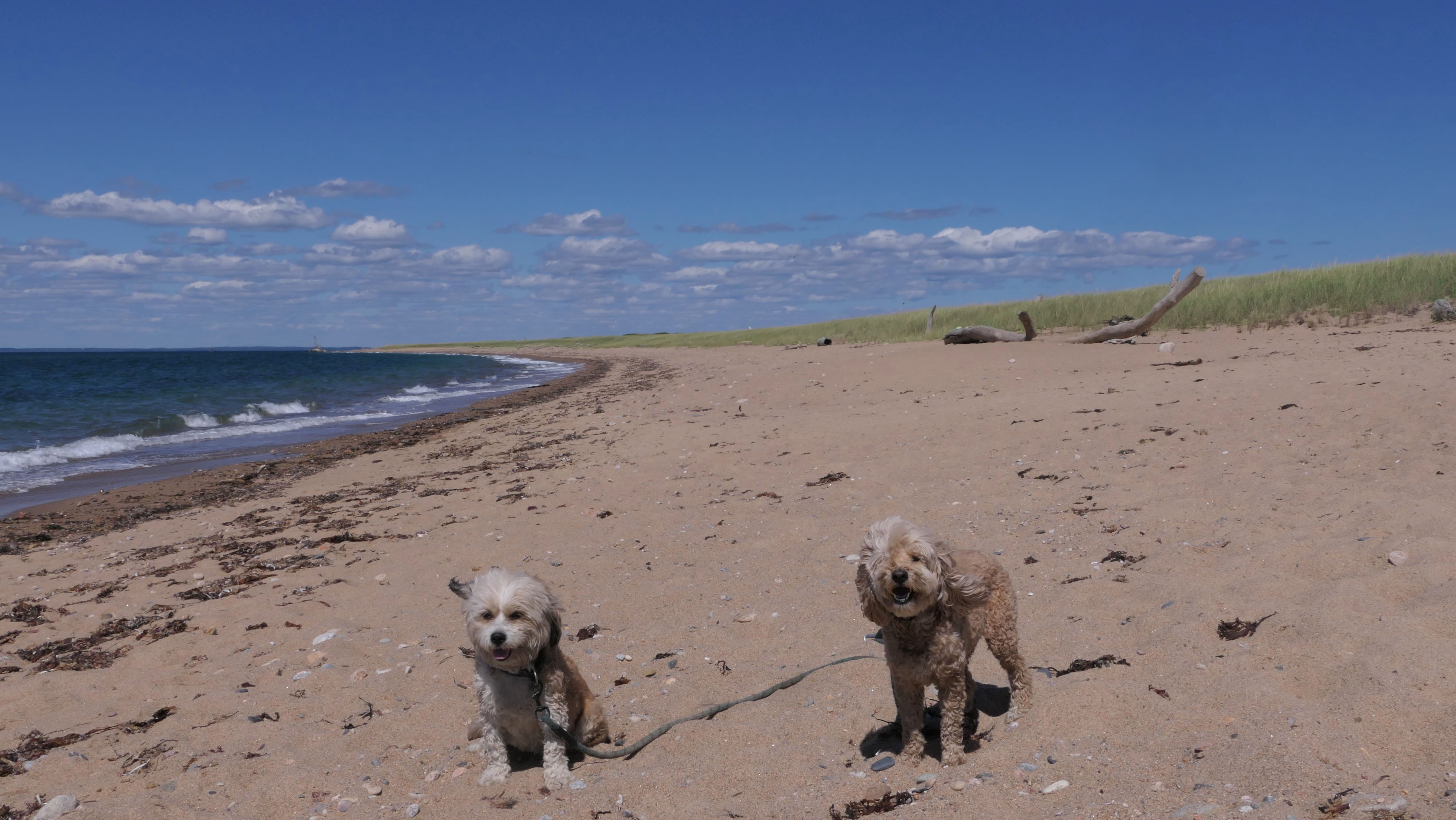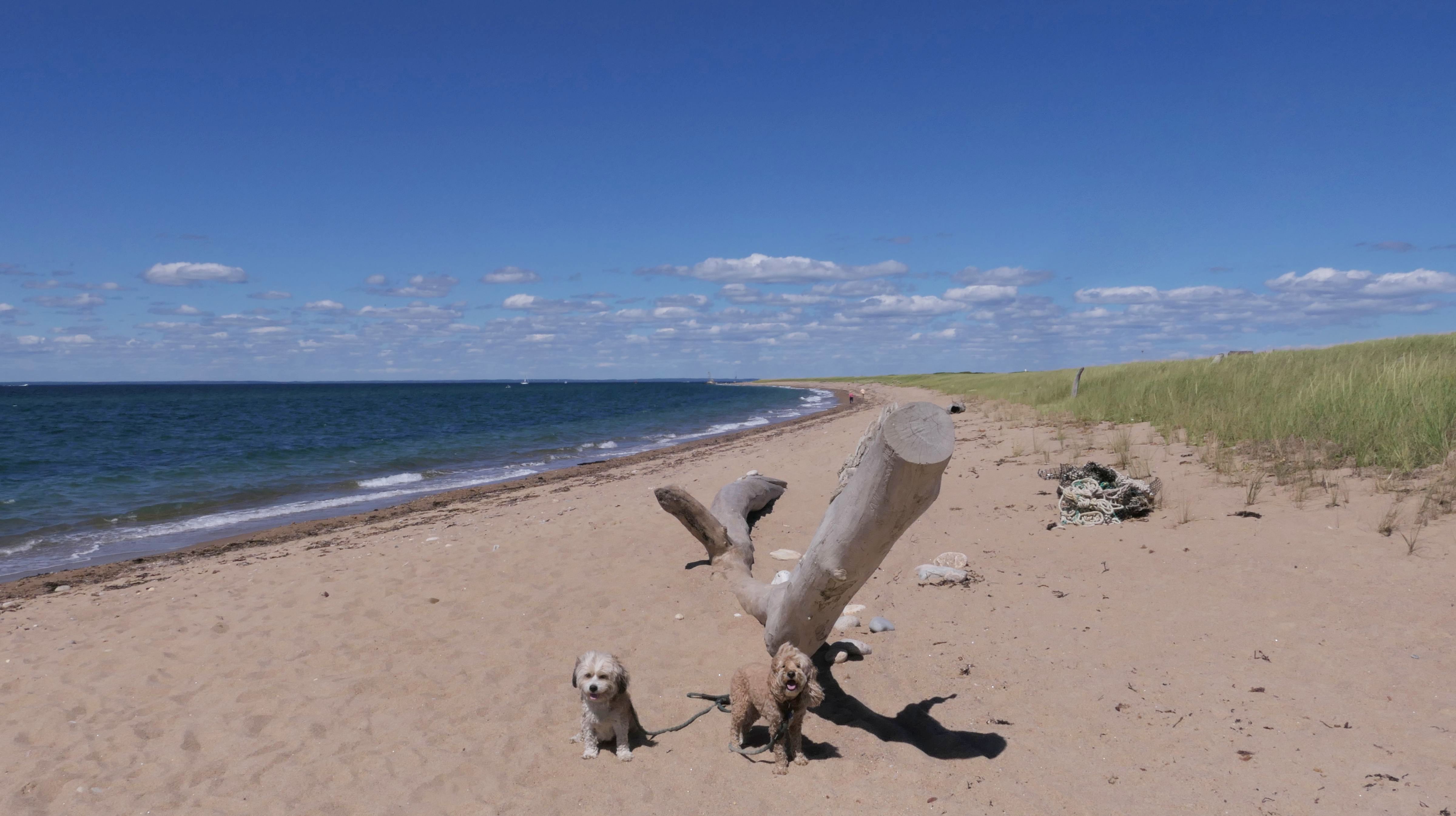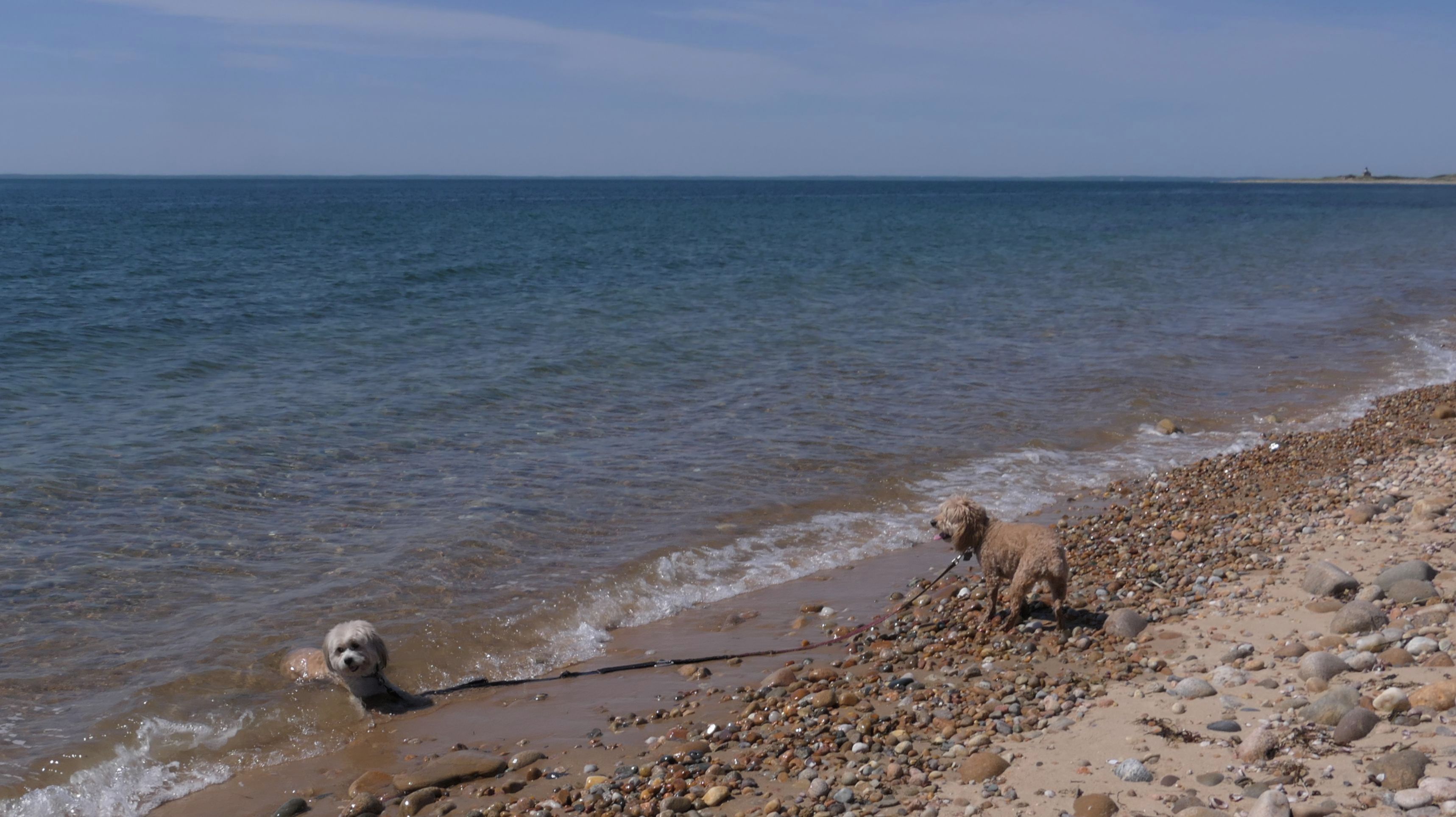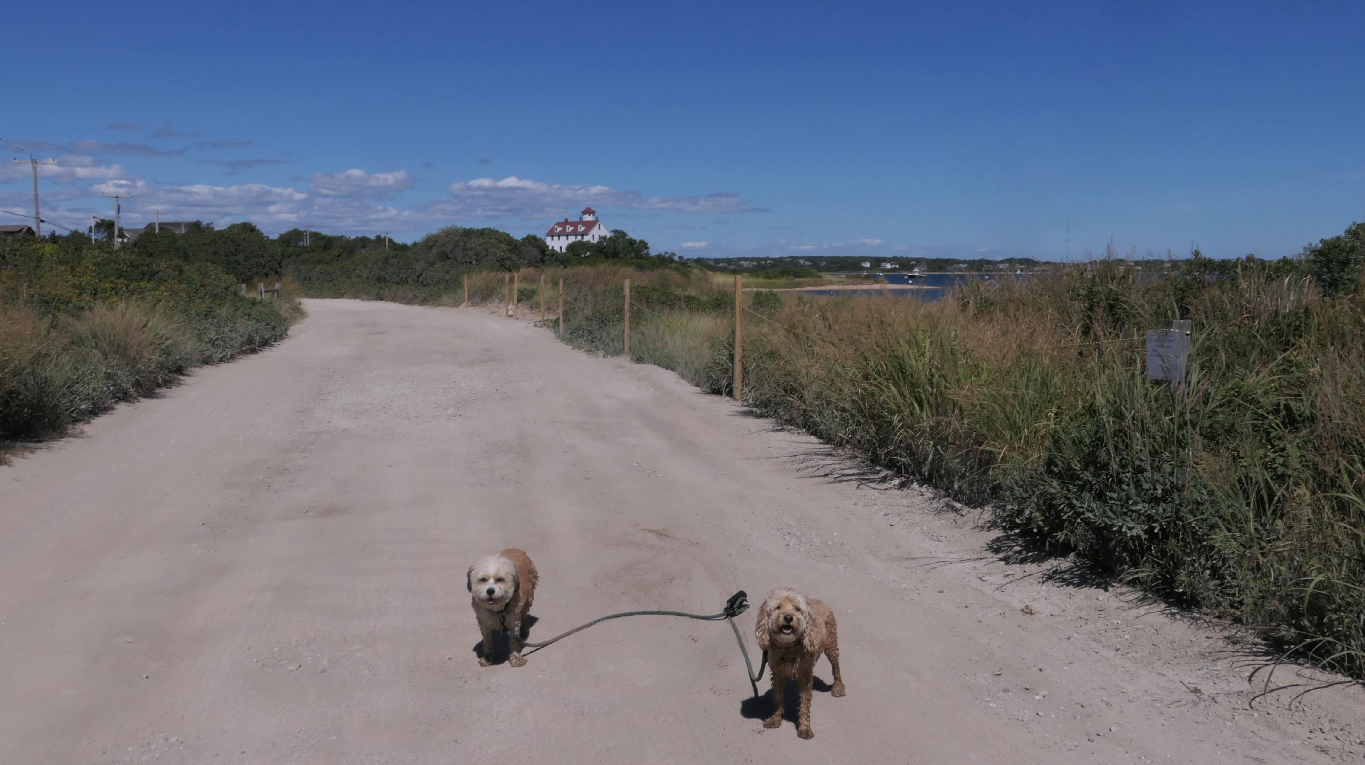 Since we rented a car for the day, I wanted to go to a beach that we couldn't get to on our previous trips. Some of the nicer beaches along the southern coast of the island require long climbs down steep dunes, so we settled for this beach along the northwest side of the island. It's remote and out of the way. We were the only ones there. It's rocky, with milder waves, which is the way the dogs like it! The informational sign near the ferry landing says this is a good spot to find beach glass, but all we found was broken glass from bottles near the entrance to the beach at the end of West Beach Road. Be careful with the dogs at the entrance! We found a trail that leads out toward the Great Salt Pond. We walked down that trail a short distance before turning around and heading back. This was a different experience from the tourist beaches along the northeast side of the island, but I didn't think it was quite as nice. Mandy and Lexi loved the water though, and in the end, isn't that all that counts!
