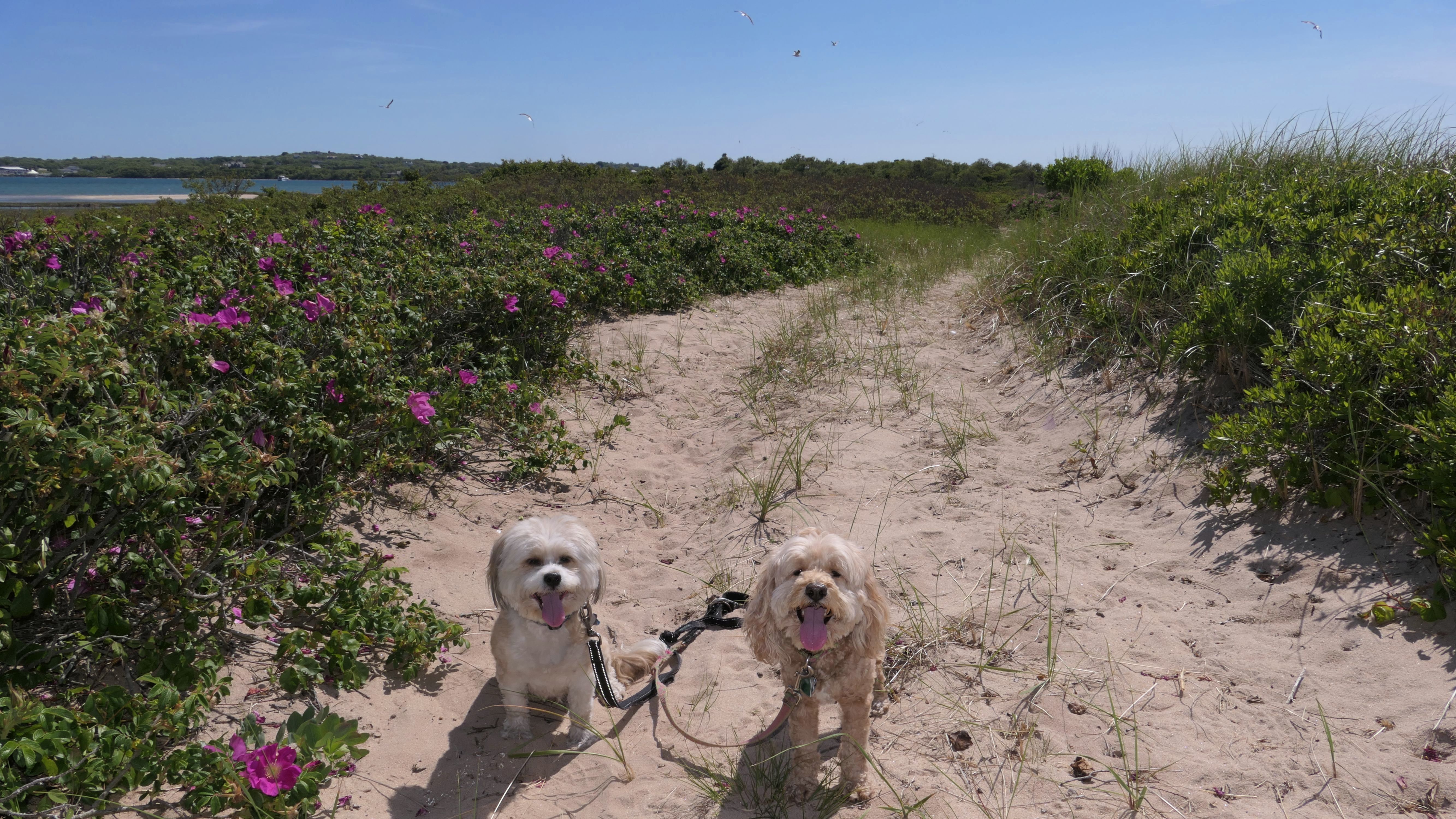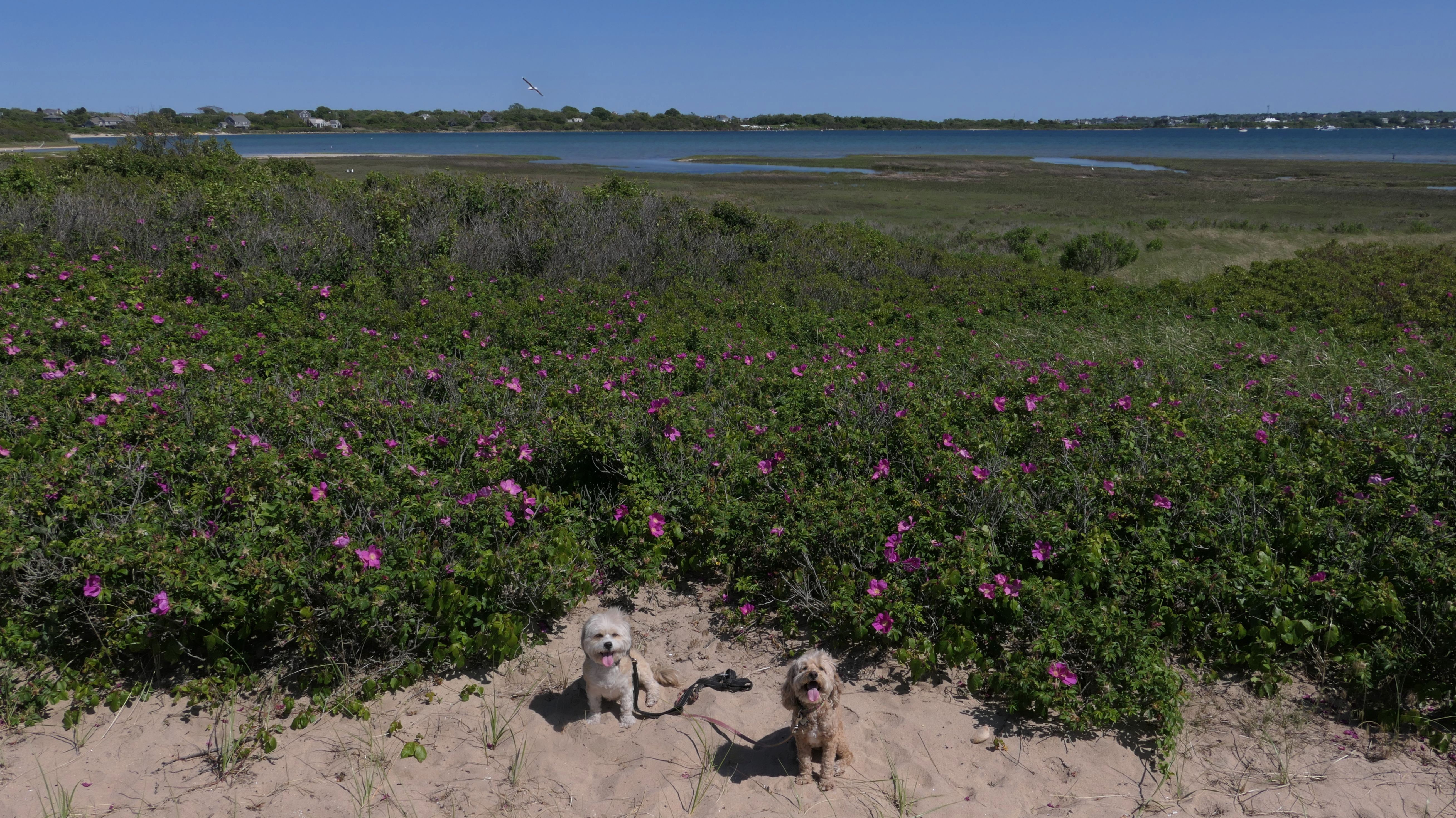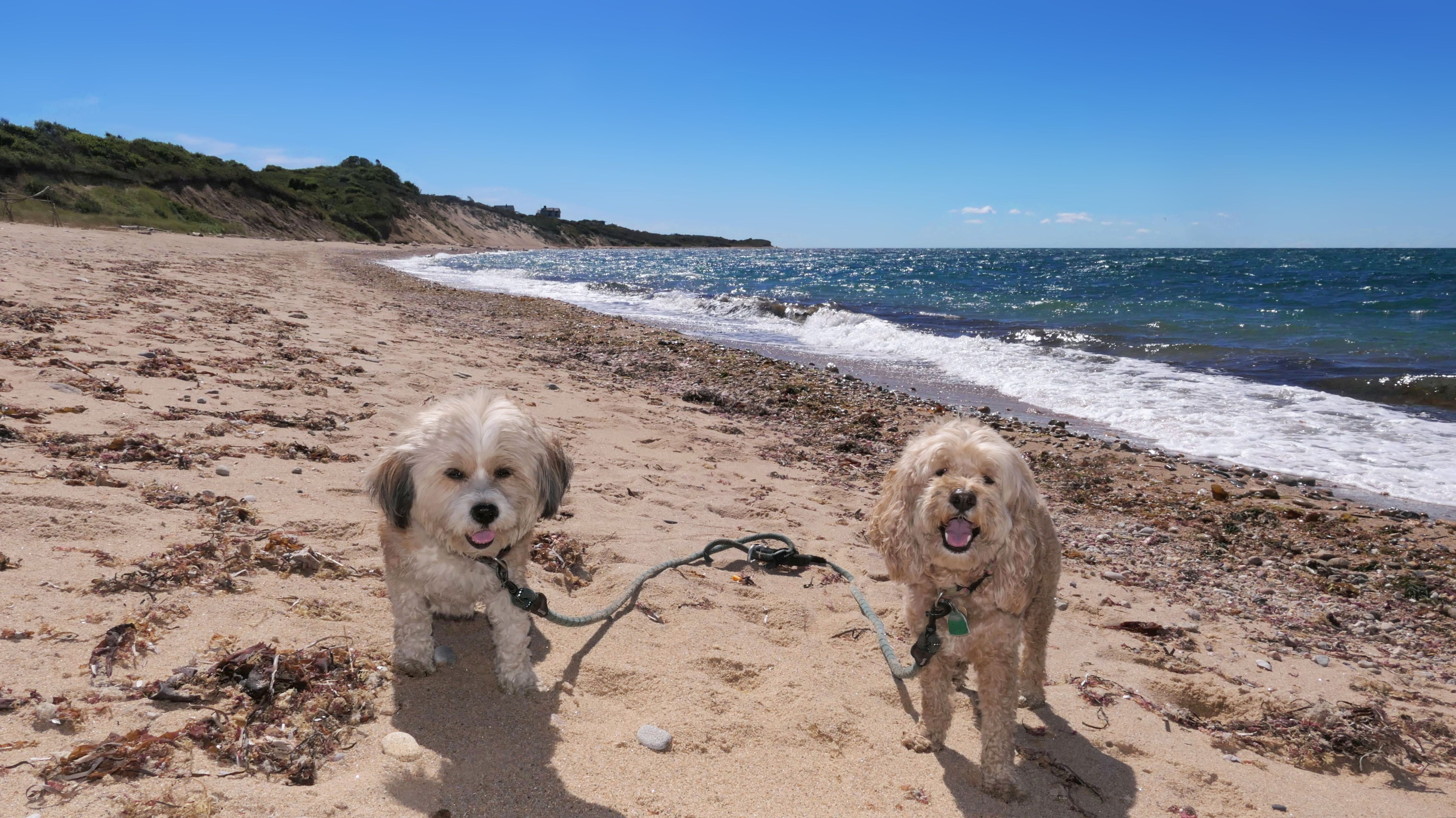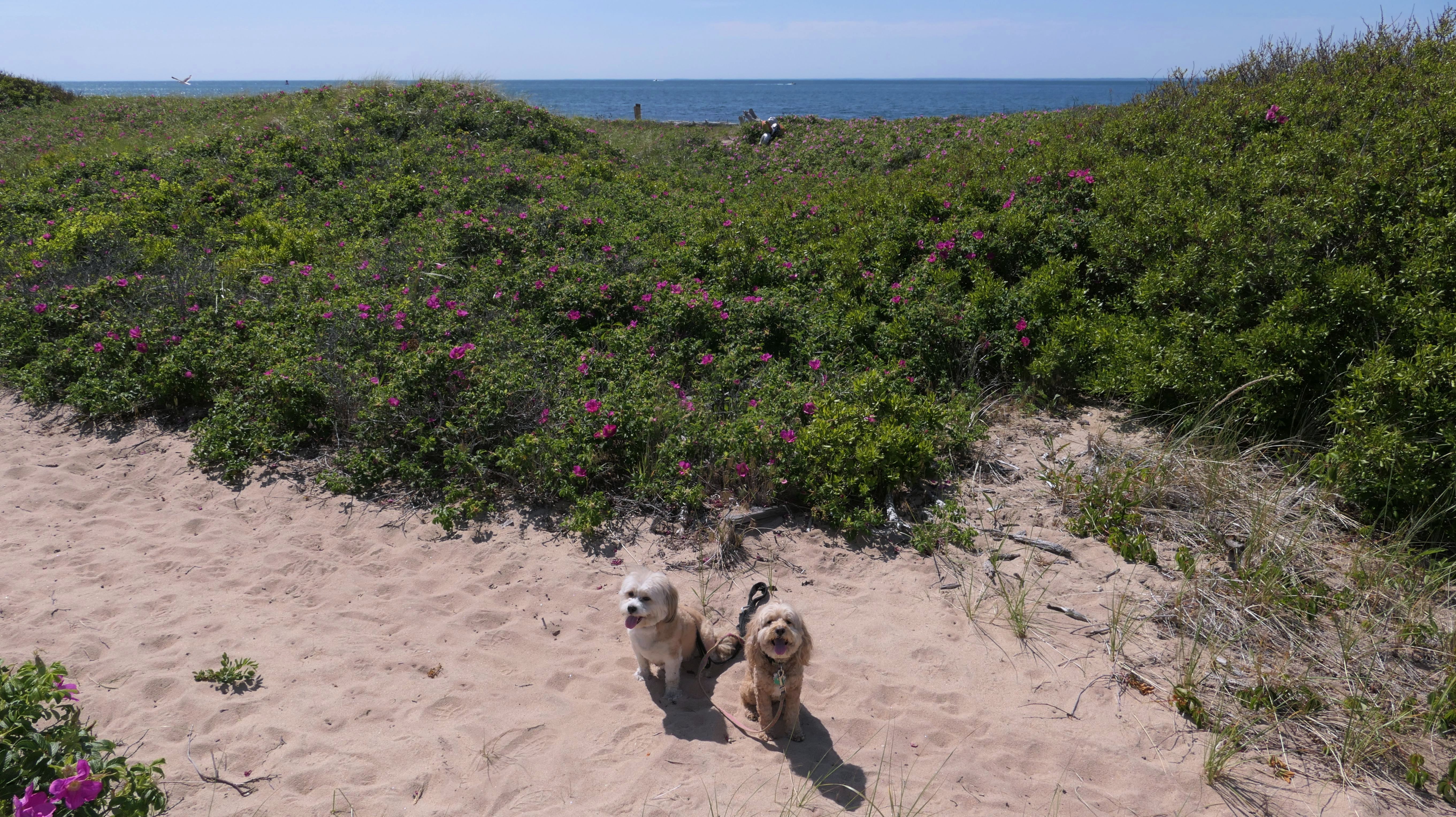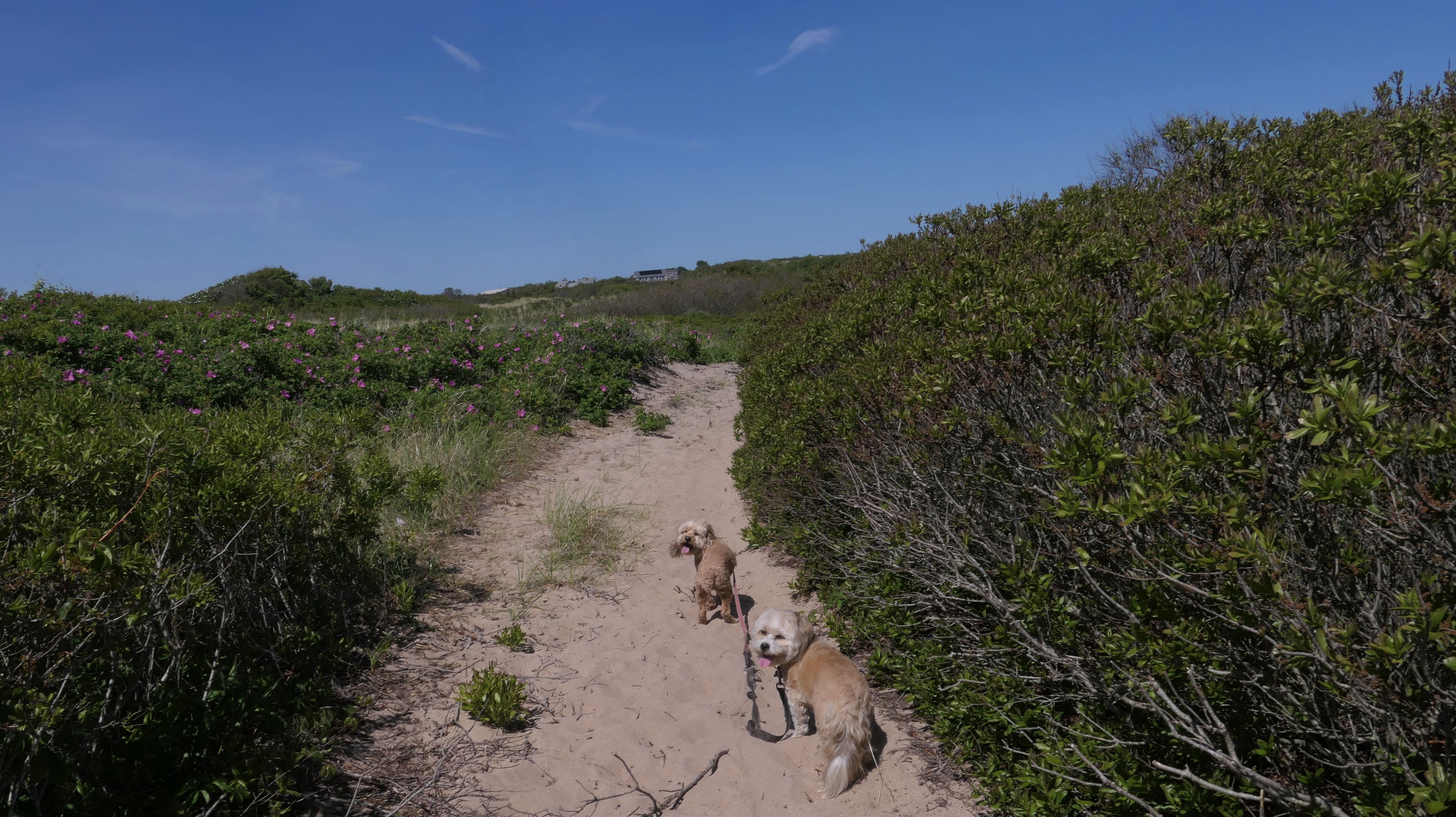 Since we rented a car for the day, I wanted to go to a beach that we couldn't get to on our previous trips. Some of the nicer beaches along the southern coast of the island require long climbs down steep dunes, so we settled for this beach along the northwest side of the island. It's remote and out of the way. We were the only ones there. It's rocky, with milder waves, which is the way the dogs like it! The informational sign near the ferry landing says this is a good spot to find beach glass, but all we found was broken glass from bottles near the entrance to the beach at the end of West Beach Road. Be careful with the dogs at the entrance! We found a trail that leads out toward the Great Salt Pond. We walked down that trail a short distance before turning around and heading back. This was a different experience from the tourist beaches along the northeast side of the island, but I didn't think it was quite as nice. Mandy and Lexi loved the water though, and in the end, isn't that all that counts!