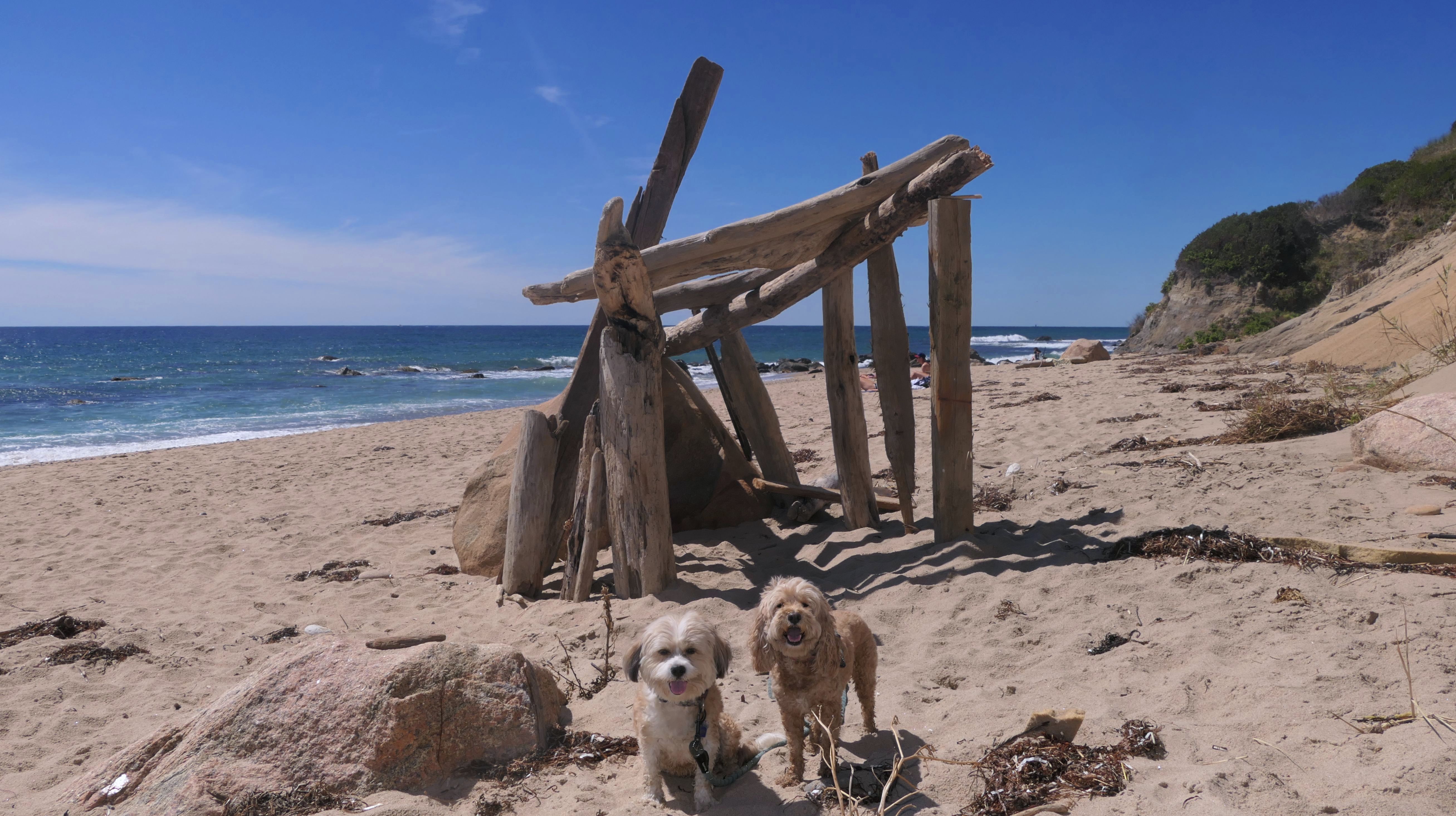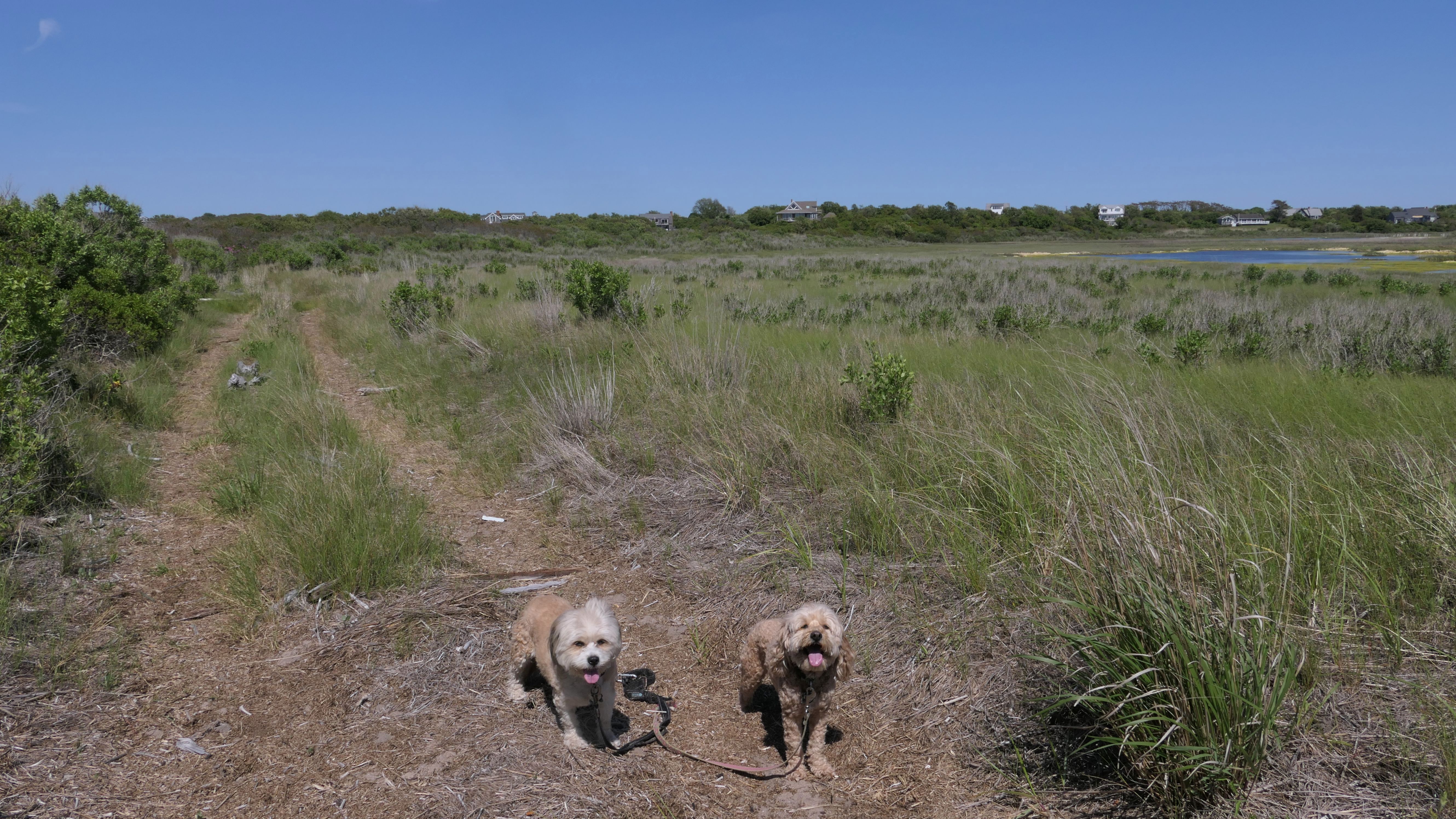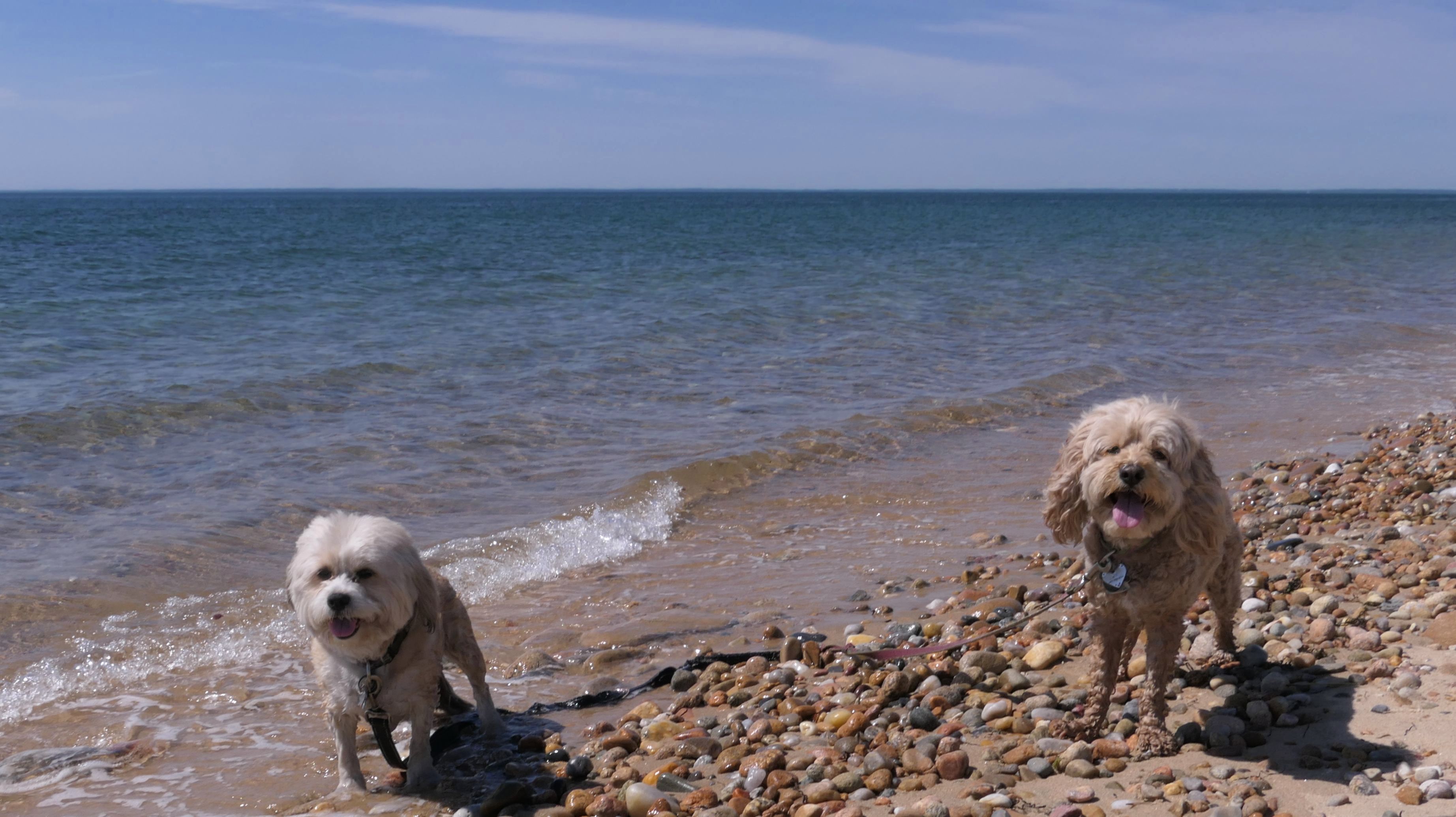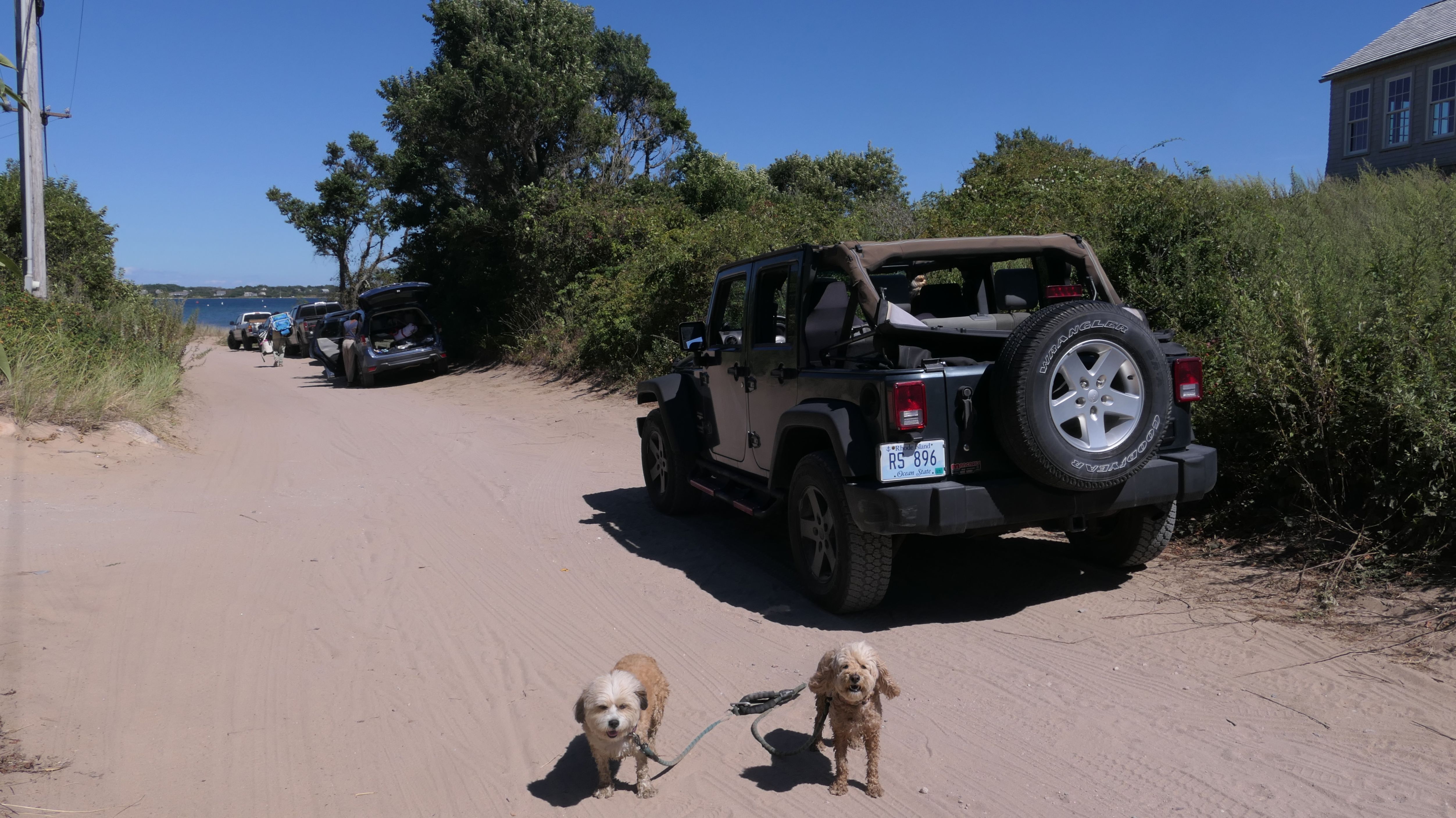 Since we rented a car for the day, I wanted to go to a beach that we couldn't get to on our previous trips. Some of the nicer beaches along the southern coast of the island require long climbs down steep dunes, so we settled for this beach along the northwest side of the island. It's remote and out of the way. We were the only ones there. It's rocky, with milder waves, which is the way the dogs like it! The informational sign near the ferry landing says this is a good spot to find beach glass, but all we found was broken glass from bottles near the entrance to the beach at the end of West Beach Road. Be careful with the dogs at the entrance! We found a trail that leads out toward the Great Salt Pond. We walked down that trail a short distance before turning around and heading back. This was a different experience from the tourist beaches along the northeast side of the island, but I didn't think it was quite as nice. Mandy and Lexi loved the water though, and in the end, isn't that all that counts!
