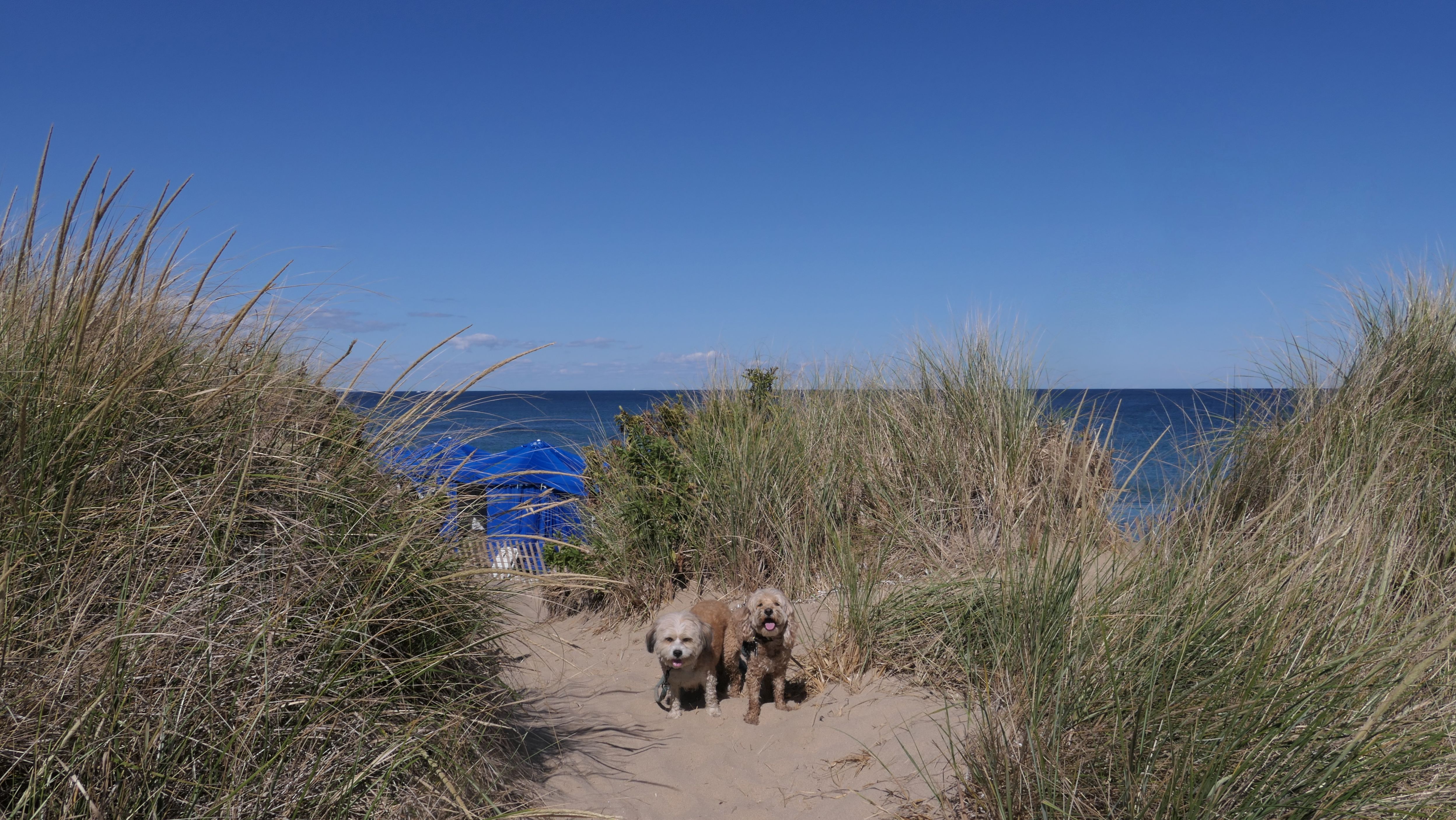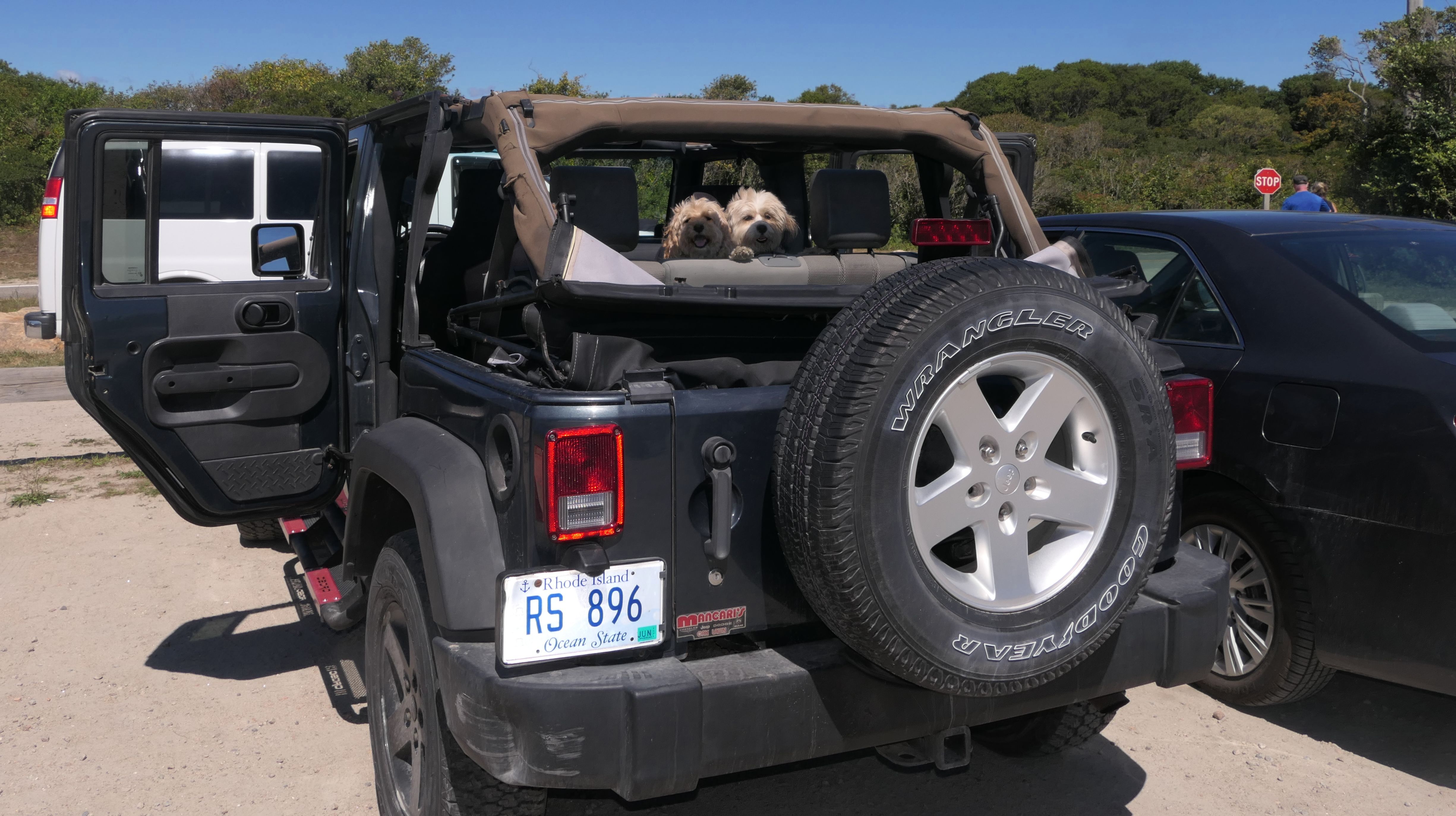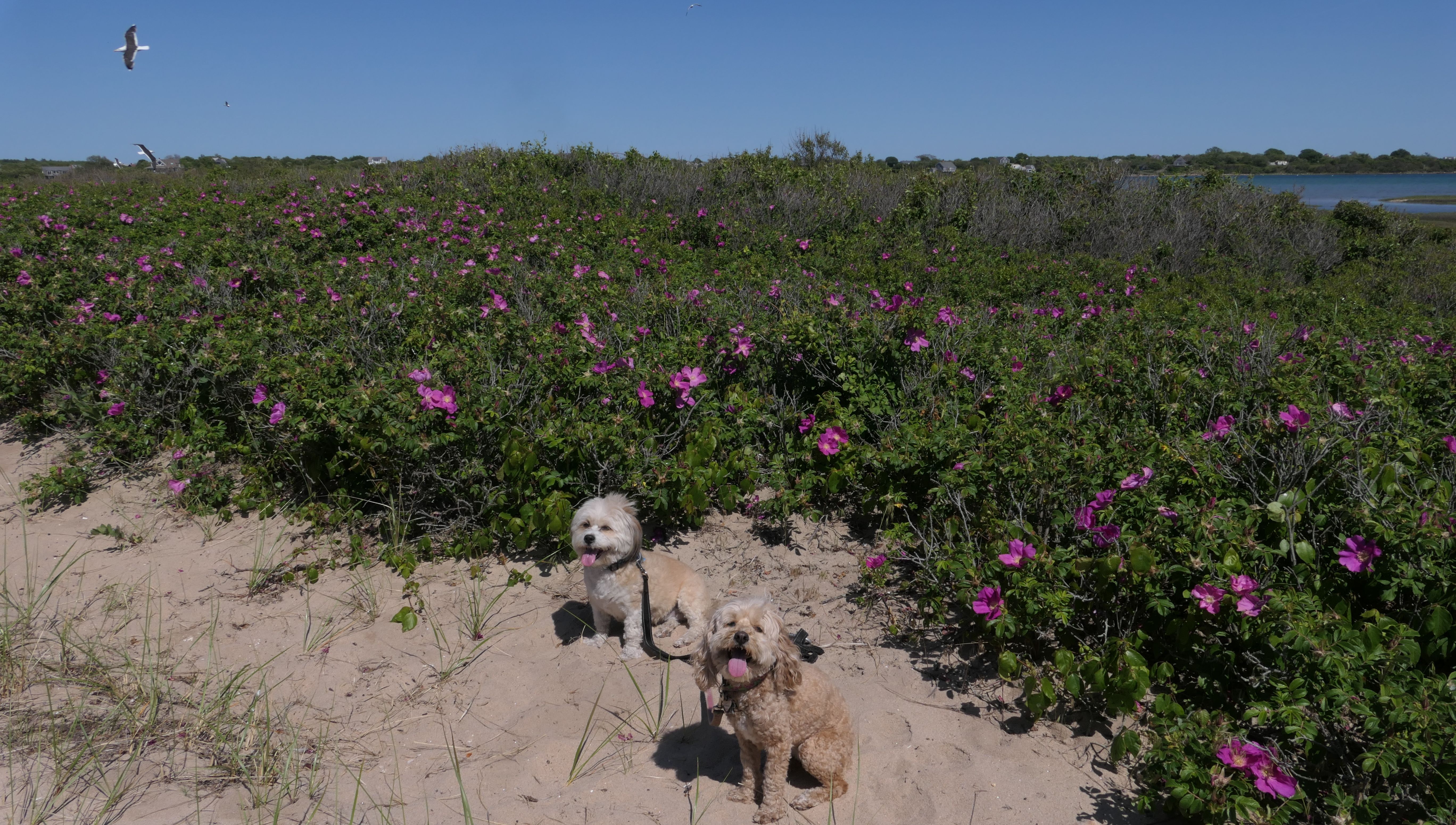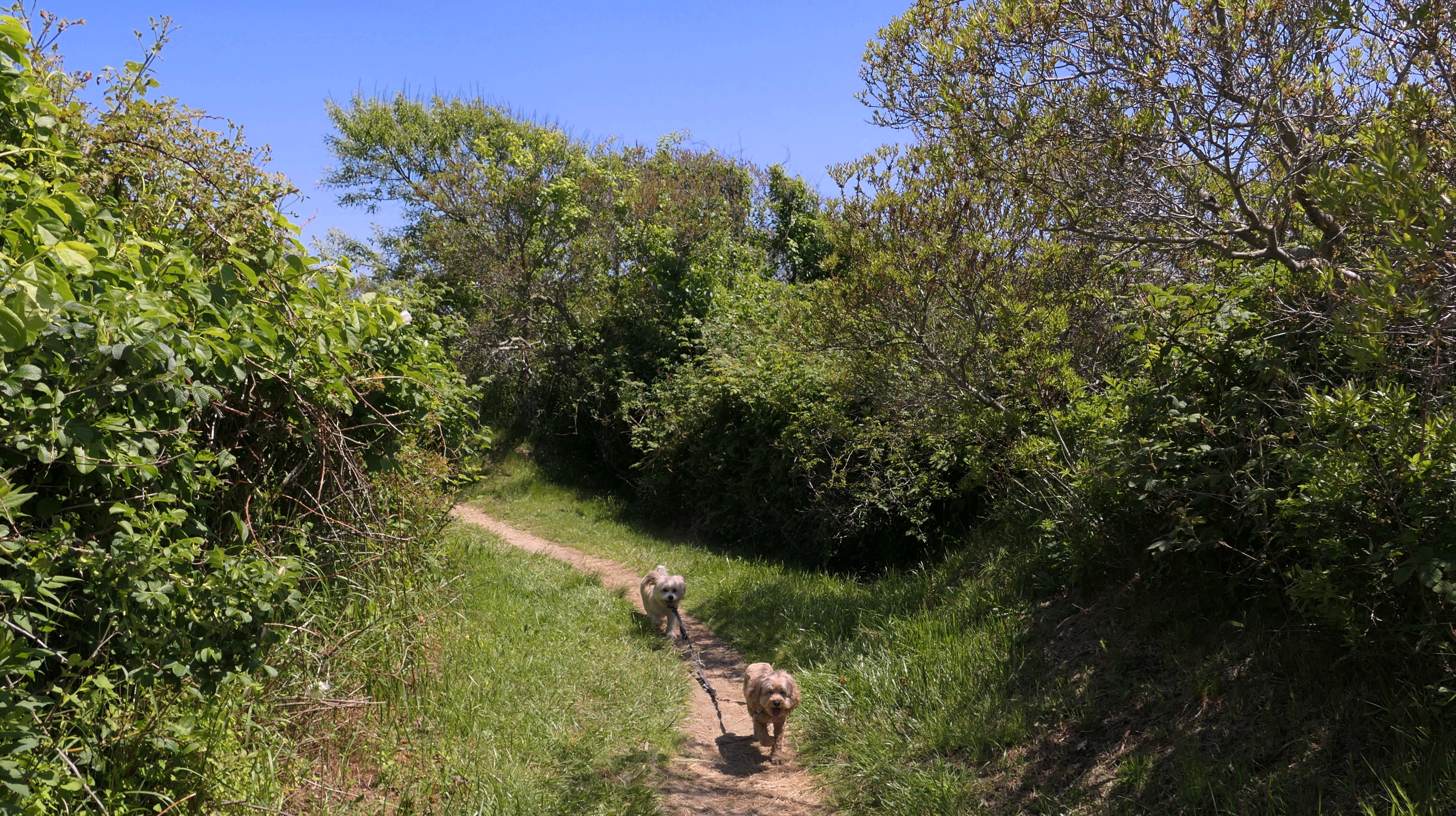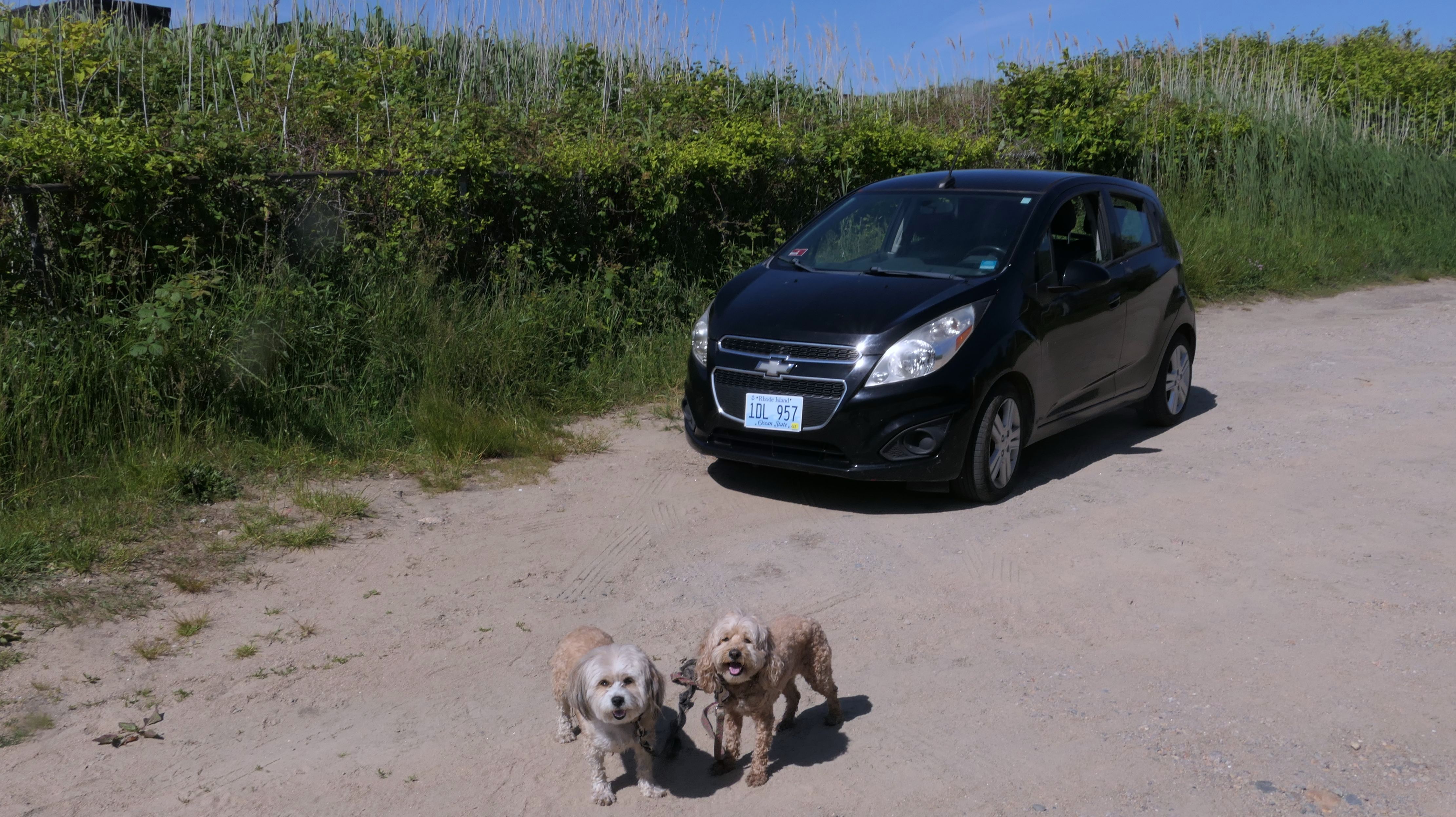 Since we rented a car for the day, I wanted to go to a beach that we couldn't get to on our previous trips. Some of the nicer beaches along the southern coast of the island require long climbs down steep dunes, so we settled for this beach along the northwest side of the island. It's remote and out of the way. We were the only ones there. It's rocky, with milder waves, which is the way the dogs like it! The informational sign near the ferry landing says this is a good spot to find beach glass, but all we found was broken glass from bottles near the entrance to the beach at the end of West Beach Road. Be careful with the dogs at the entrance! We found a trail that leads out toward the Great Salt Pond. We walked down that trail a short distance before turning around and heading back. This was a different experience from the tourist beaches along the northeast side of the island, but I didn't think it was quite as nice. Mandy and Lexi loved the water though, and in the end, isn't that all that counts!