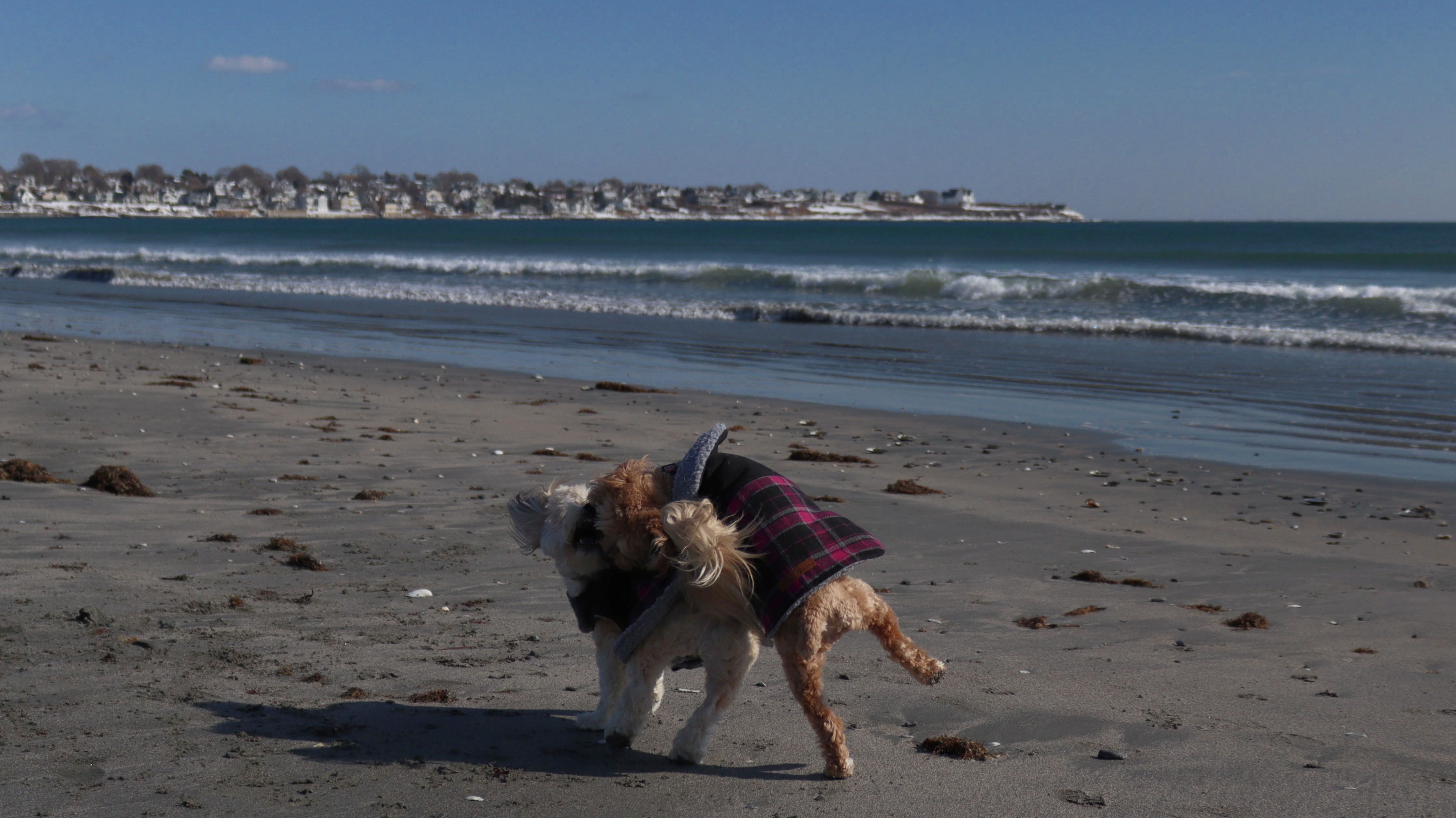 It had been so cold of late that when the temps got up to the 40's, it felt tropical...so we went to the beach. I picked this one since we haven't been here for a while, but it's not the best beach in Rhode Island. It's only about a half mile long, so we didn't get much of a walk here, but Mandy and Lexi got to play a little bit. They love rough-housing on the beach! We actually did walk another couple miles through downtown Newport, but I didn't create an entry for it since we've done it all before...and with nicer weather too! This was a good way to enjoy some milder temperatures as we anxiously await spring to arrive!